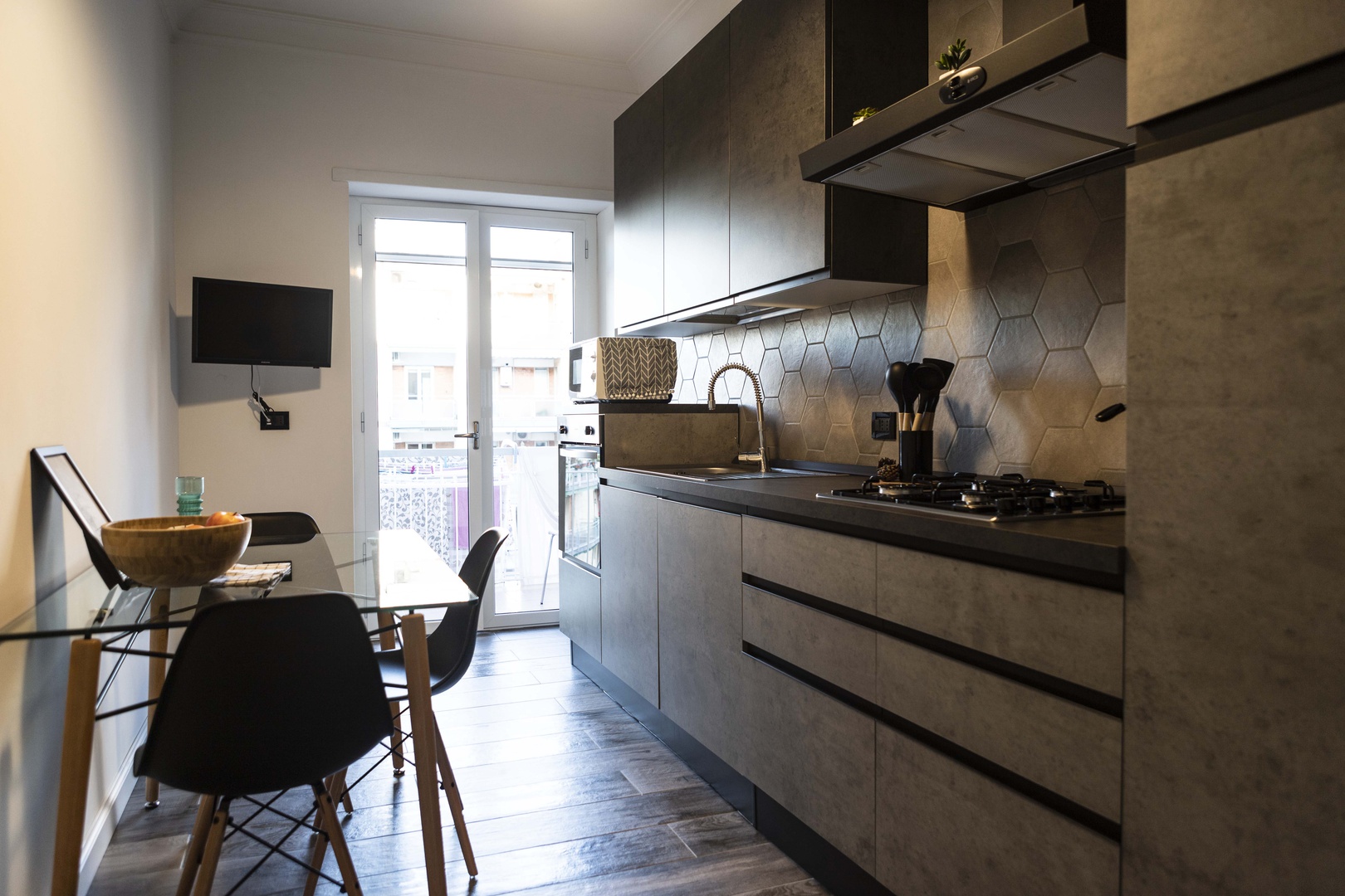 N ed E sono una giovane coppia con una bimba di tre anni bellissima ed una cagnolina vivace.Erano in procinto di trasferirsi e mi hanno contattata per un restyling della loro prossima casa presa in affitto.La sfida del progetto è stata arredare una casa che non aveva molta personalità e cercare di renderla perfetta per i prossimi abitanti, attraverso i vincoli di impianti e pareti che non sono stati cambiati e con un budget ben preciso da investire.Le parole chiave del progetto: colori audaci e scuri, tema della savana e carta da parati.La casa in affitto in cui si sarebbero trasferiti era anonima e aveva bisogno di un restyling, non andava stravolta completamente, per cui molti elementi sono stati conservati, ad esempio la boiserie nel corridoio e le controsoffittature modanate e sono diventati il punto di partenza del progetto. Le dimensione delle camere era già adeguata ai vari ambienti della casa, che da questo punto di vista risultava sin da subito funzionale, per questo il mio contributo è stato molto mirato.Il progetto ha previsto la nuova distribuzione degli arredi, assecondando gli impianti già esistenti, nelle varie camere, eccetto il bagno, per ora rimasto invariato.Attraverso l’introduzione di nuovi colori, l’uso della carta da parati in nicchie e altre pareti strategiche e grazie ad un nuovo pavimento, ho guidato questa giovane famiglia nella scelta delle nuove componenti della loro casa.La famiglia ha trovato la giusta combinazione tra arredi e decorazioni, lasciando ampio spazio per il loro gusto e personalità.Tra le richieste la possibilità di gestire il loro e-commerce da casa, quindi di indossare e fotografare i prodotti, per questo nella zona living si è prevista una parete composta da due grandi specchi, mentre la parete opposta ospita una carta da parati verde che fa da sfondo alle foto da scattare.La casa ha assunto toni scuri, alternati ai tratti romantici ed ai colori più armonici, mixati a texture che richiamano la savana.