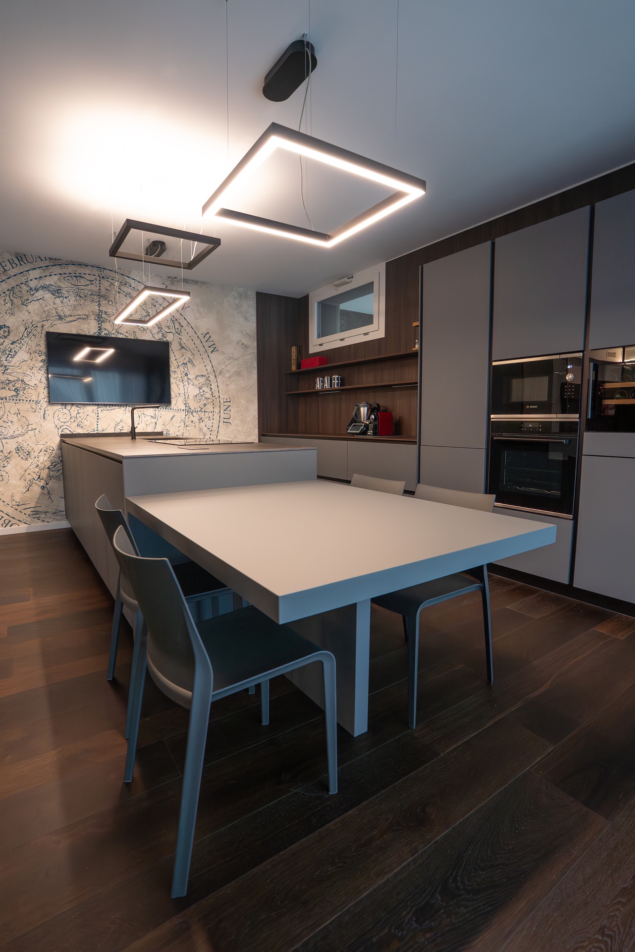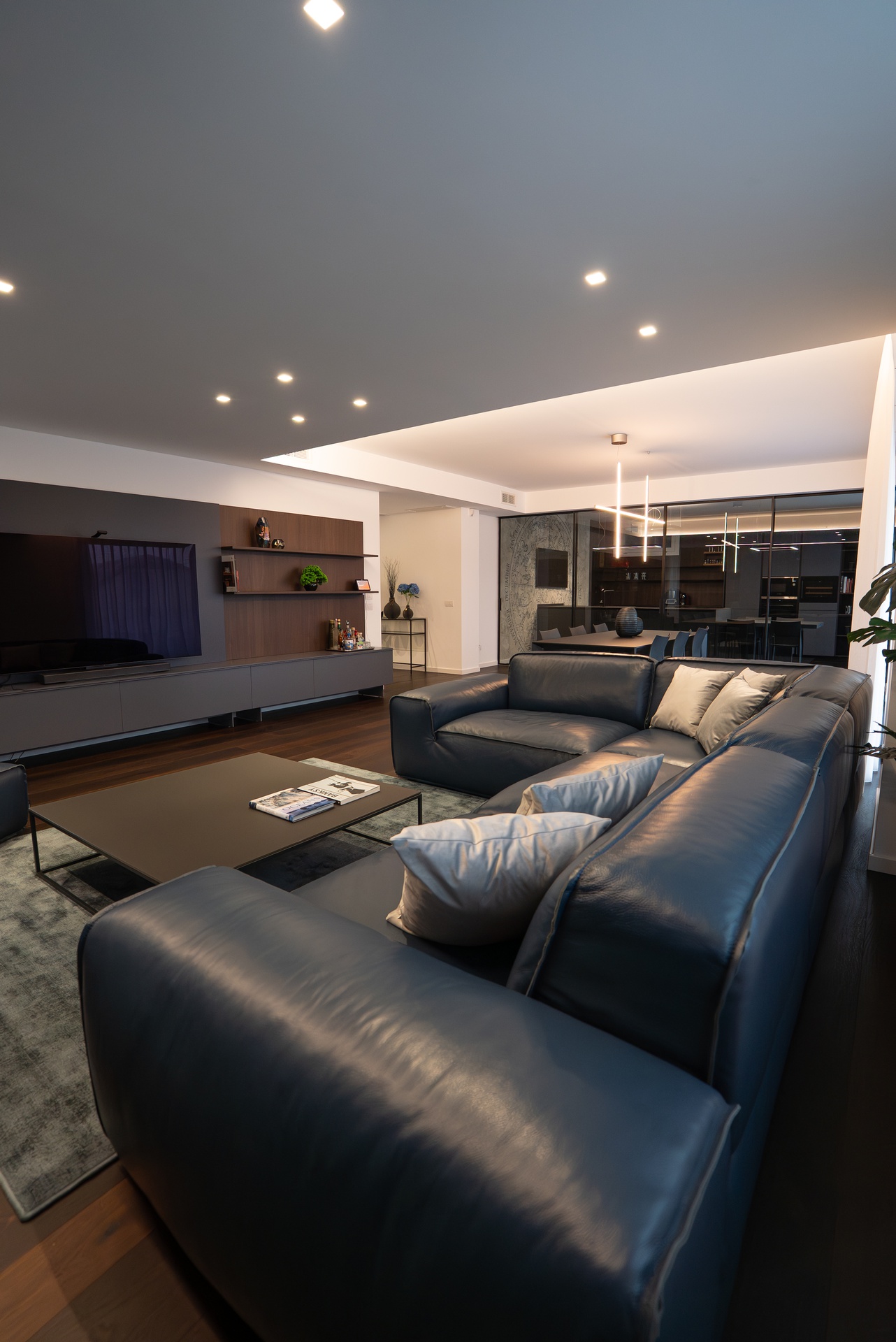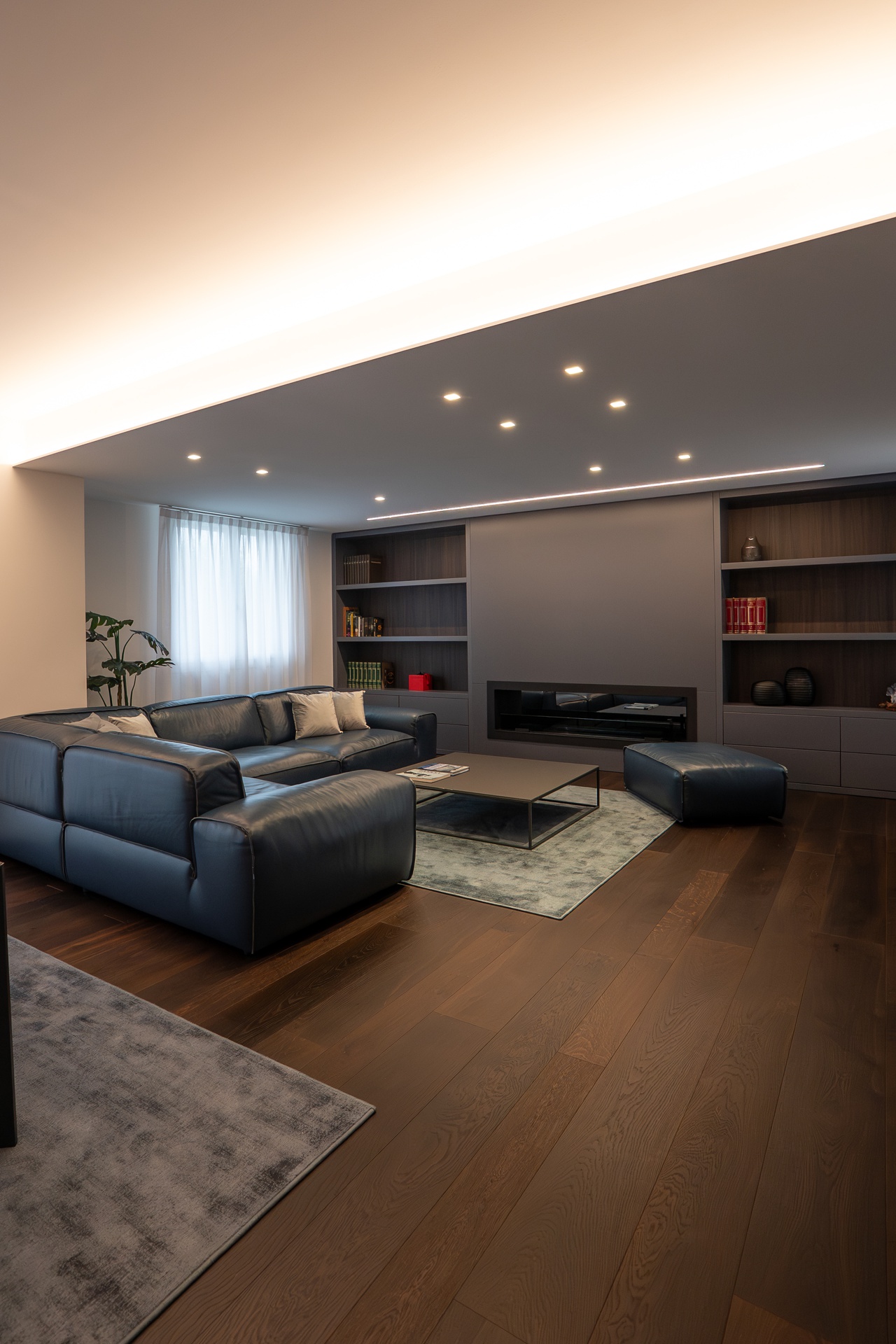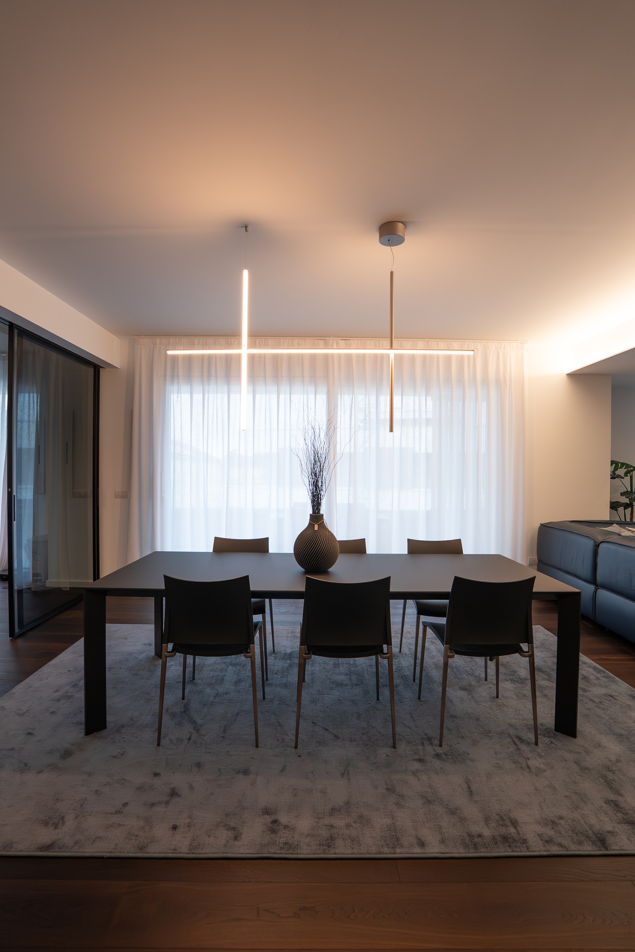 L'attico si presenta moderno ed elegante, in perfetta linea con il proprietario.Dallo stile pulito e armonioso entrando si apre la vista su living open space con una vista focale su un grand tavolo da pranzo. L'open space accoglie un'ampia cucina con un'isola centrale per la preparazione e un piano di lavoro generoso completato lateralmente da un piano altezza tavolo che lo rendono perfetto per colazioni e pranzi veloci.Il soggiorno si configura in una zona conviviale con un ampio divano ad angolo che si raccoglie insieme ad una parete libreria con integrato un camino.Le zone di passaggio, corridoi e scale, sono stati valorizzati con eleganti giochi di luce e uno stile molto pulito e luminoso. Per la zona notte, la camera risulta minimalista con un ampio letto e una testata retroilluminata, l'elegante cabina armadio con vetro fume e struttura in metallo, è stata studiata esattamente sulle esigenze del cliente, perfetta!Ambiente distintivo è il bagno in total black, elegante e lussuoso grazie anche al gioco di luci e materiali lucidi.La perla di questo attico? la vasca idromassaggio da libera installazione sul terrazzo! Studiata anch'essa con una zona prendisole è perfetta per le feste e il relax in totale tranquillità