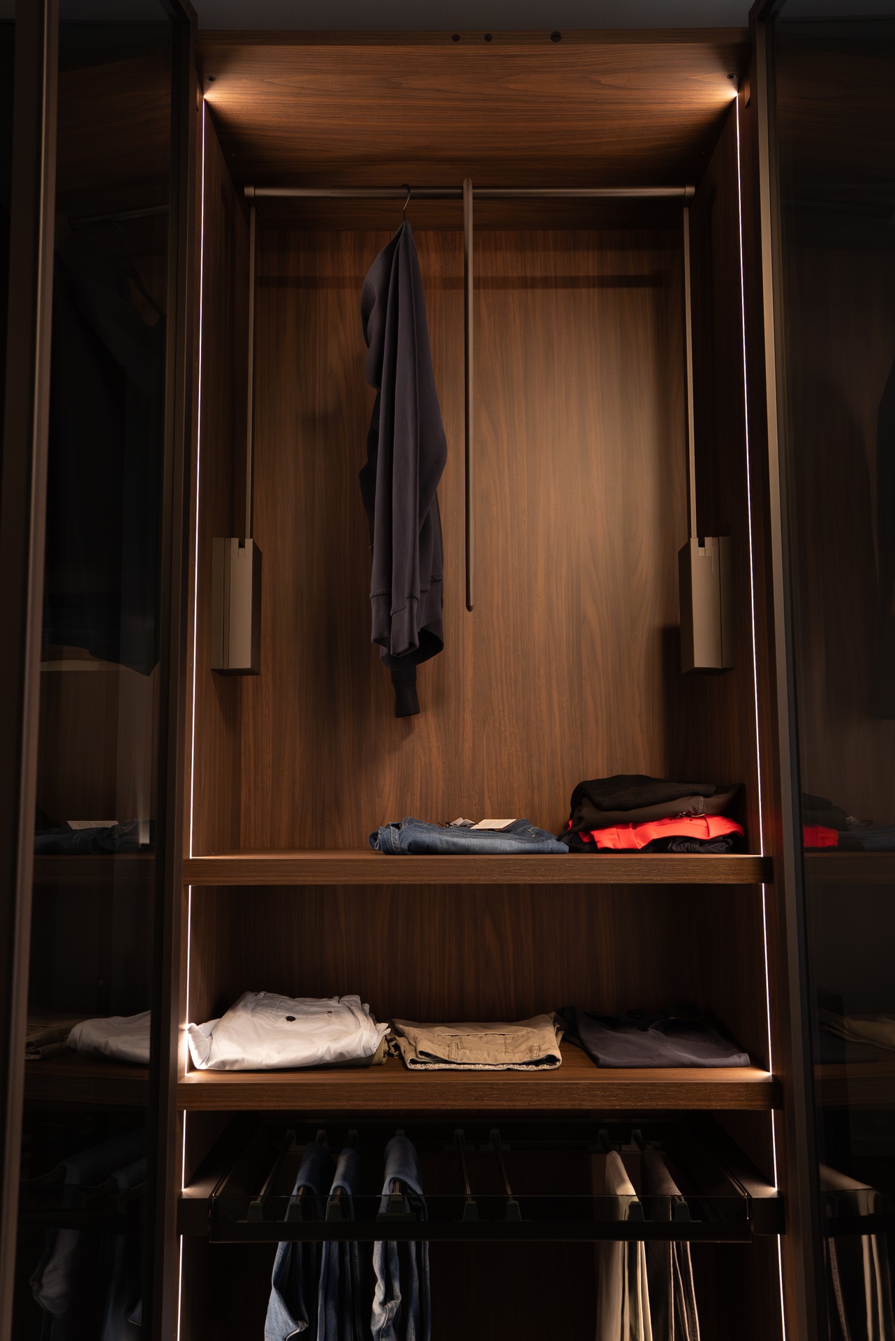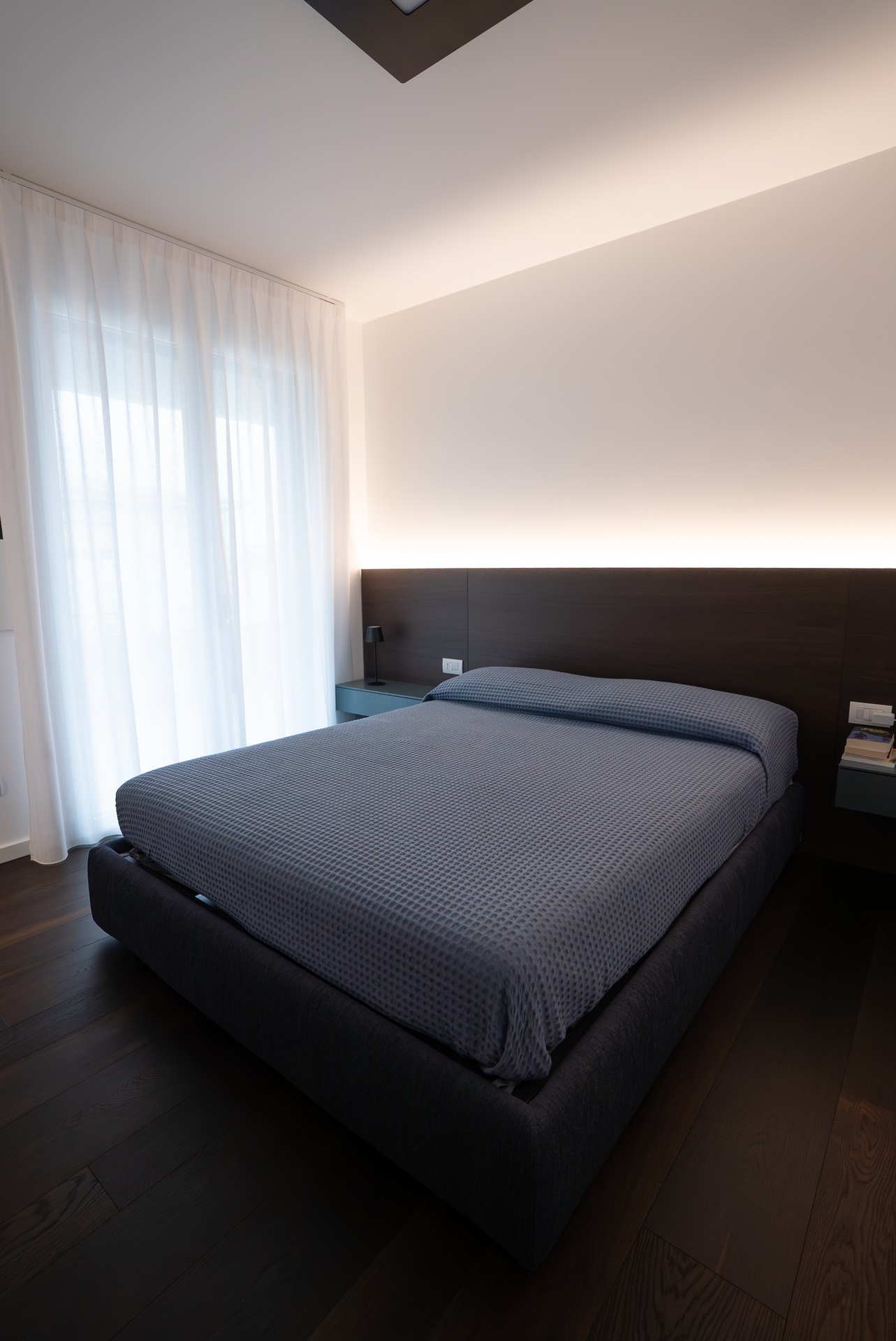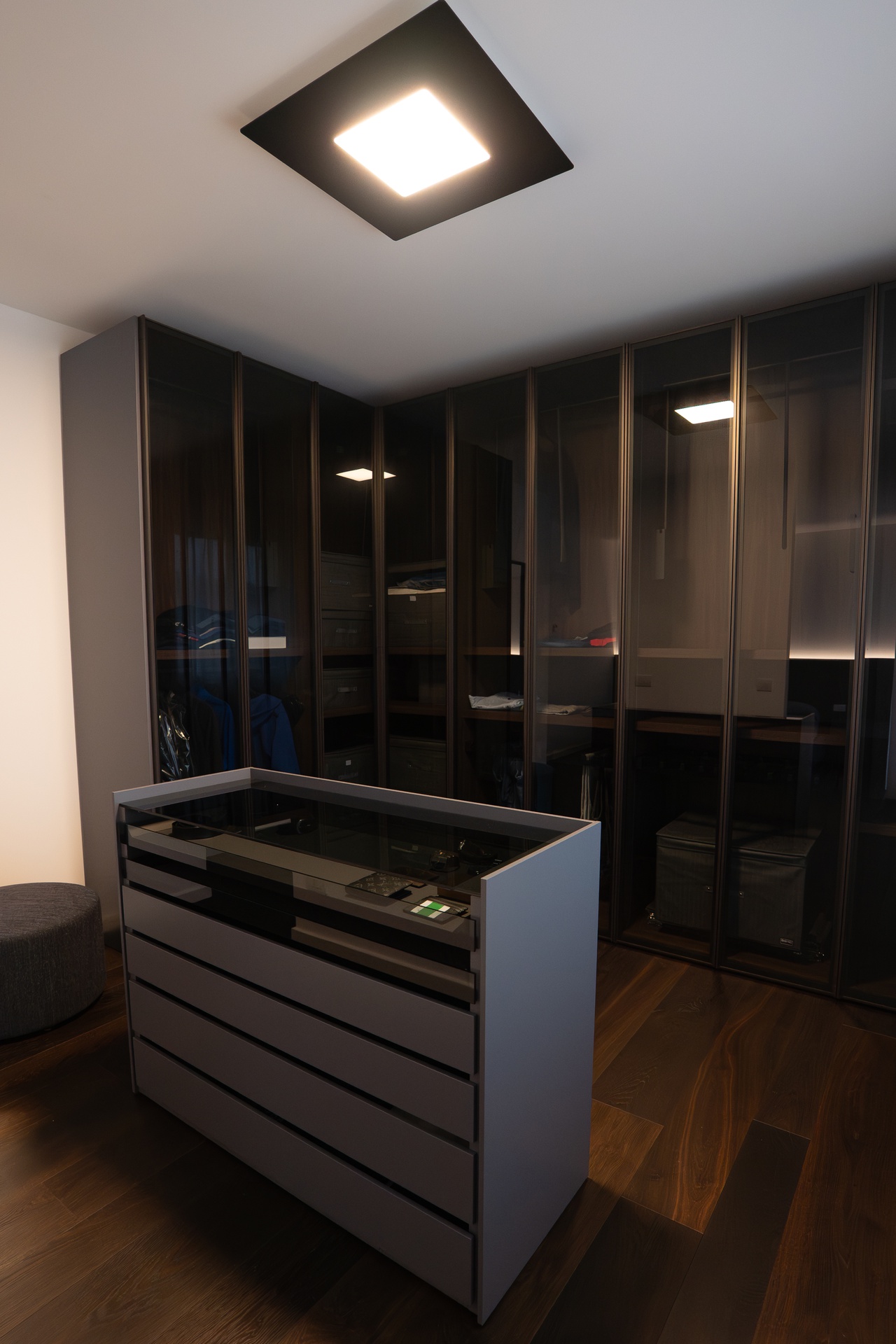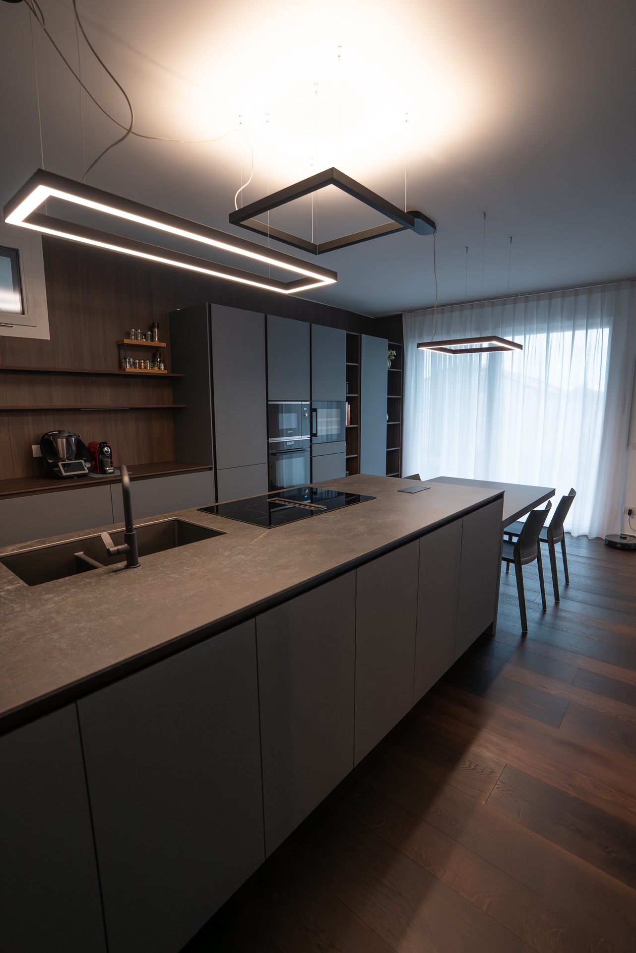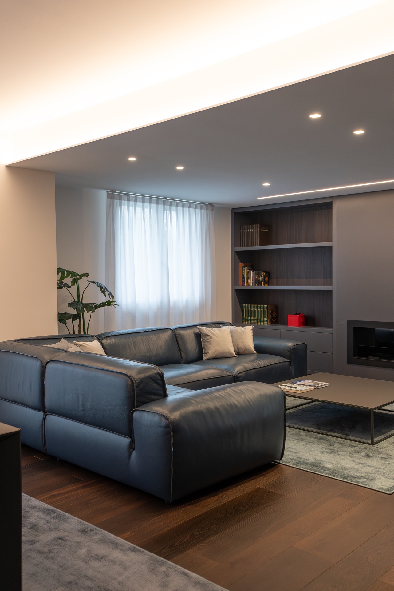L'attico si presenta moderno ed elegante, in perfetta linea con il proprietario.Dallo stile pulito e armonioso entrando si apre la vista su living open space con una vista focale su un grand tavolo da pranzo. L'open space accoglie un'ampia cucina con un'isola centrale per la preparazione e un piano di lavoro generoso completato lateralmente da un piano altezza tavolo che lo rendono perfetto per colazioni e pranzi veloci.Il soggiorno si configura in una zona conviviale con un ampio divano ad angolo che si raccoglie insieme ad una parete libreria con integrato un camino.Le zone di passaggio, corridoi e scale, sono stati valorizzati con eleganti giochi di luce e uno stile molto pulito e luminoso. Per la zona notte, la camera risulta minimalista con un ampio letto e una testata retroilluminata, l'elegante cabina armadio con vetro fume e struttura in metallo, è stata studiata esattamente sulle esigenze del cliente, perfetta!Ambiente distintivo è il bagno in total black, elegante e lussuoso grazie anche al gioco di luci e materiali lucidi.La perla di questo attico? la vasca idromassaggio da libera installazione sul terrazzo! Studiata anch'essa con una zona prendisole è perfetta per le feste e il relax in totale tranquillità