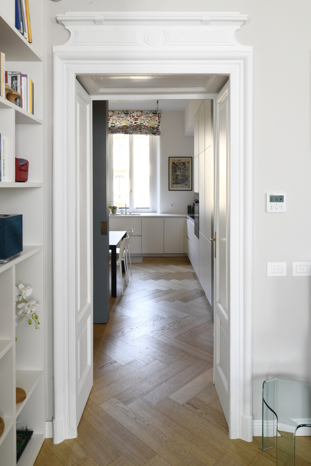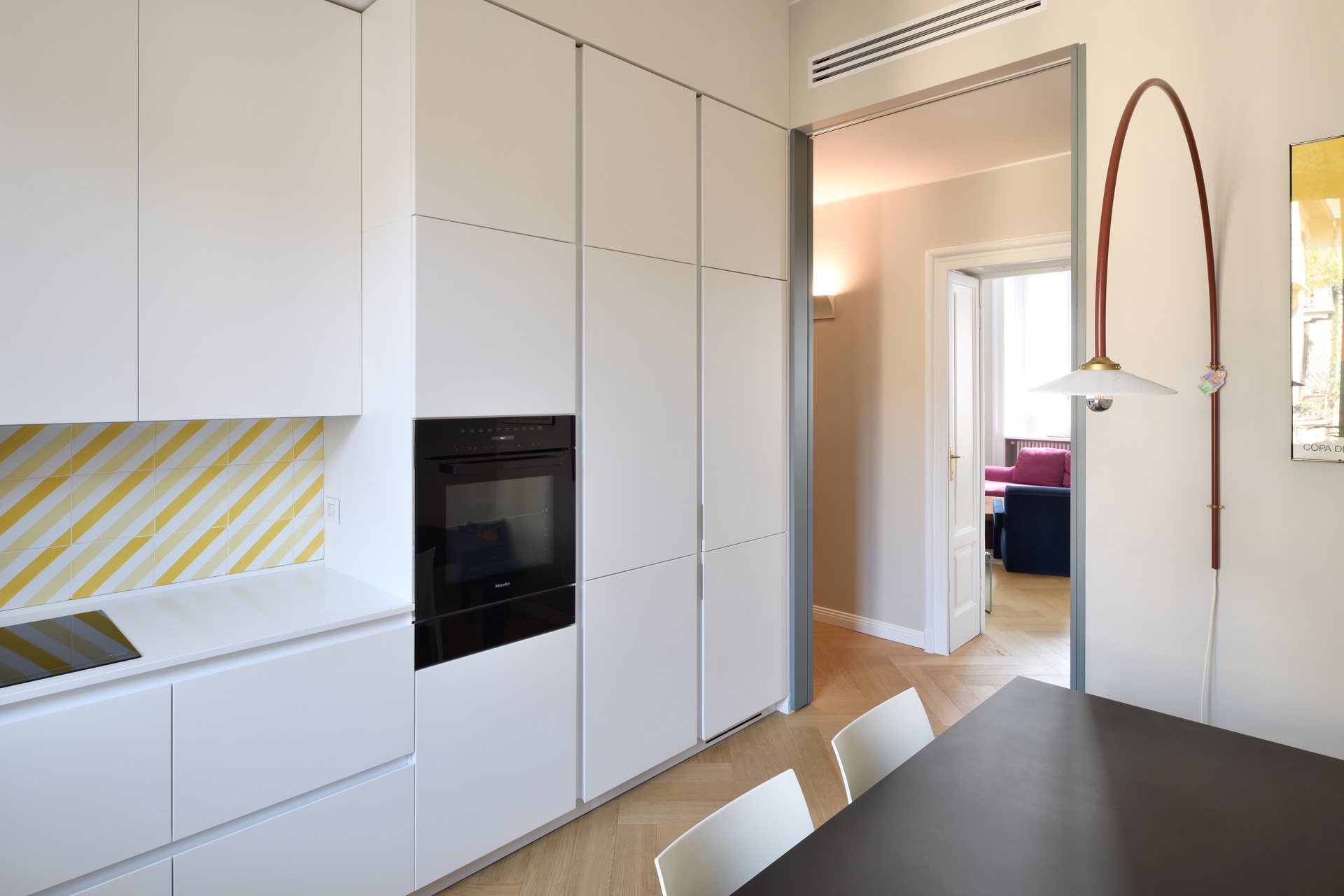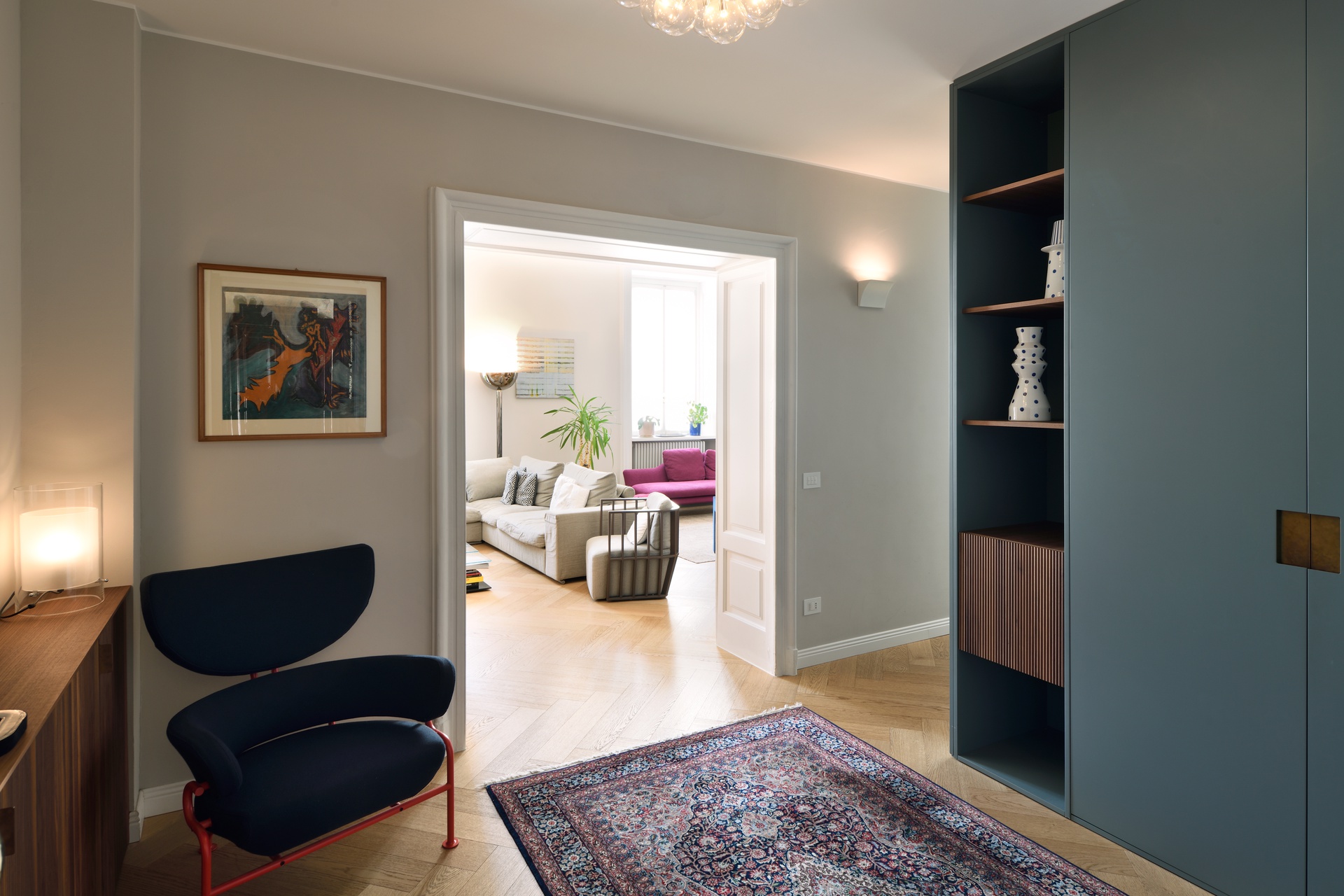 L’appartamento si trova un storico edificio Liberty nel centro di Milano.Il progetto nasce con l’obiettivo di scardinare la rigorosa simmetria del corridoio centrale. Una boiserie color blu ardesia avvolge un lato del passaggio e la parete d’ingresso, creando un volume unitario in dialogo con il fronte opposto, dove spicca la sequenza delle porte originali degli anni ’20. Questo nucleo architettonico racchiude la zona dell’appartamento interamente rimodellata sulle esigenze della committenza, integrando armadiature su misura e le grandi ante scorrevoli della cucina.Particolare cura è stata dedicata alla selezione di rivestimenti e pavimenti: l'intento è conferire un’impronta decisamente contemporanea agli spazi, garantendo al contempo un confronto armonioso con i decori originali, preservati grazie a un sapiente intervento di restauro.