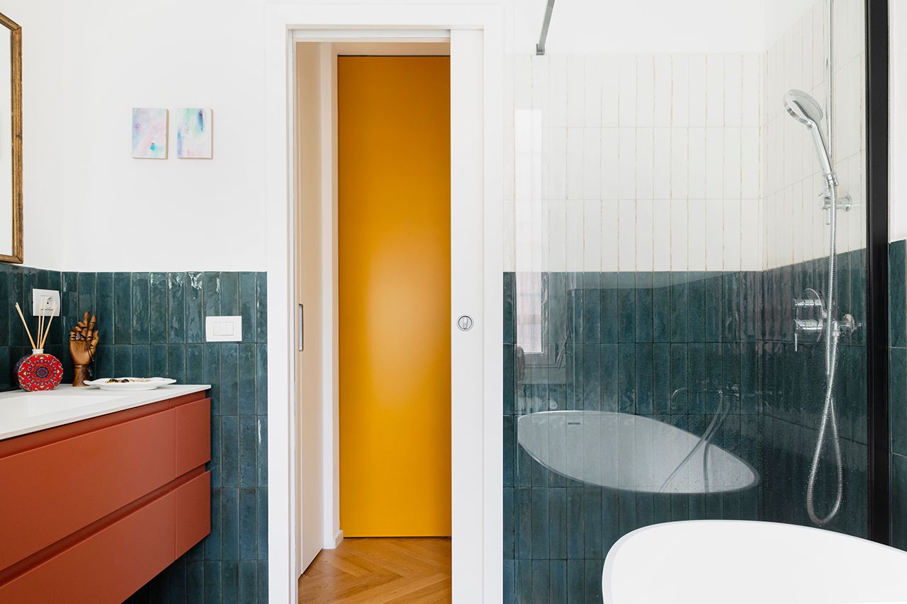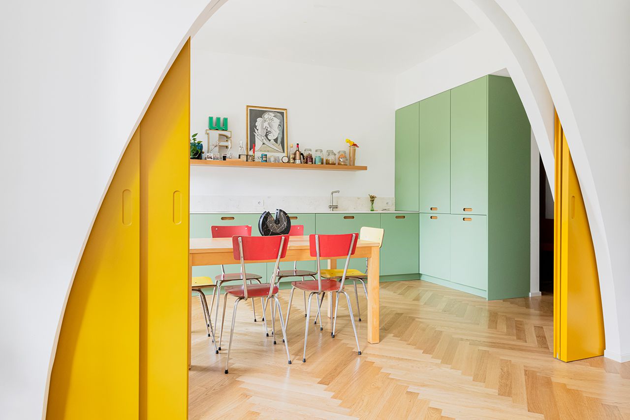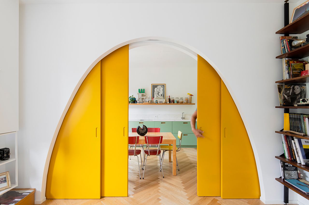 Il progetto riguarda la ristrutturazione di un immobile situato all'estremità nord del quartiere di NoLo, a Milano, in un contesto la cui densità edilizia contenuta garantisce affacci liberi ed ampie vedute sui parchi privati e pubblici sistemati a verde urbano.La richiesta dei Committenti era quindi quella di valorizzare le peculiarità del contesto in un rapporto diretto con il nuovo layout distributivo caratterizzato da un unico ambiente dedicato alla cucina, al pranzo, al relax ed al lavoro da casa, che fosse all'occorrenza suddiviso in due ambienti dalle metrature simili.La prima azione progettuale ha riguardato l'eliminazione di tutti le tramezzature divisorie, che suddvidevano spazi angusti disimpegnati da un corridoio centrale.Assecondando gli affacci abbiamo ritenuto opportuno attestare tutta la zona living lungo la via pubblica, mentre la camera ed il bagno insistono sul cortile interno.La pianta dell'appartamento risulta così suddivisa in due parti nette: due metà; anche nel rispetto degli elementi strutturali esistenti.Dal punto di vista planimetrico abbiamo lavorato sull'ottimizzazione di ogni aspetto con l'intenzione di sfruttare al massimo lo spazio a disposizione, per questo tanto le nuove tramezzature quanto gli arredi definiscono gli ambienti: le colonne contenitive della cucina marcano il passaggio tra l'ingresso e la zona living, mentre il disimpegno del bagno, nascosto da una porta scorrevole a tutt'altezza, è dimensionato per allestire una piccola lavanderia.L'elemento fortemente caratteristico della zona living è l'arco: un aneddoto? Un passaggio? O una chiusura?Potrebbe sembrare una forzatura ma in realtà è la formalizzazione della richiesta dei Committenti di avere un unico ambiente da suddividere in due all'occorrenza e la scelta figurativa è dovuta al fatto che quest'arco a tre centri conserva la sua fisionomia quando è aperto e quando è chiuso.L'arco in realtà sono due archi distanziati tra loro della misura strettamente necessaria a creare un intercapedine nella quale si nascondo le ante in legno laccato che scorrono lungo due binari installati a soffitto; per realizzare gli archi è stata preparata una centina sagomata sulla base del disegno cad, tagliata al laser.Il bagno marca un netto cambio di mood: piastrelle di piccolo formato in ceramica smaltata colore verde acquamarina delineano una mezz'altezza continua lungo tutto il perimetro dell'ambiente nel quale trovano posto, oltre ai sanitari, la doccia, la vasca da bagno freestanding ed un mobile color rosso corallo con lavello incassato.L'intera ristrutturazione è stata realizzata adottando sistemi costruttivi “a secco” così da ottimizzare le tempistiche di realizzazione e l'approvvigionamento del cantiere: le tramezzature sono in cartongesso con l'impiego di soluzioni volte a garantire un elevato comfort acustico all'interno degli ambienti e con la scelta di lastre particolarmente performanti dal punto di vista della resistenza meccanica.