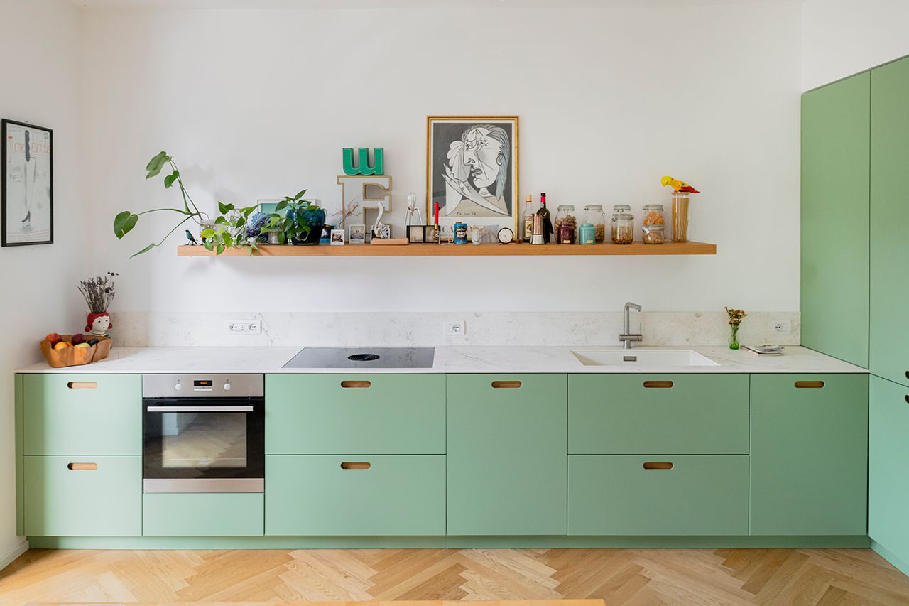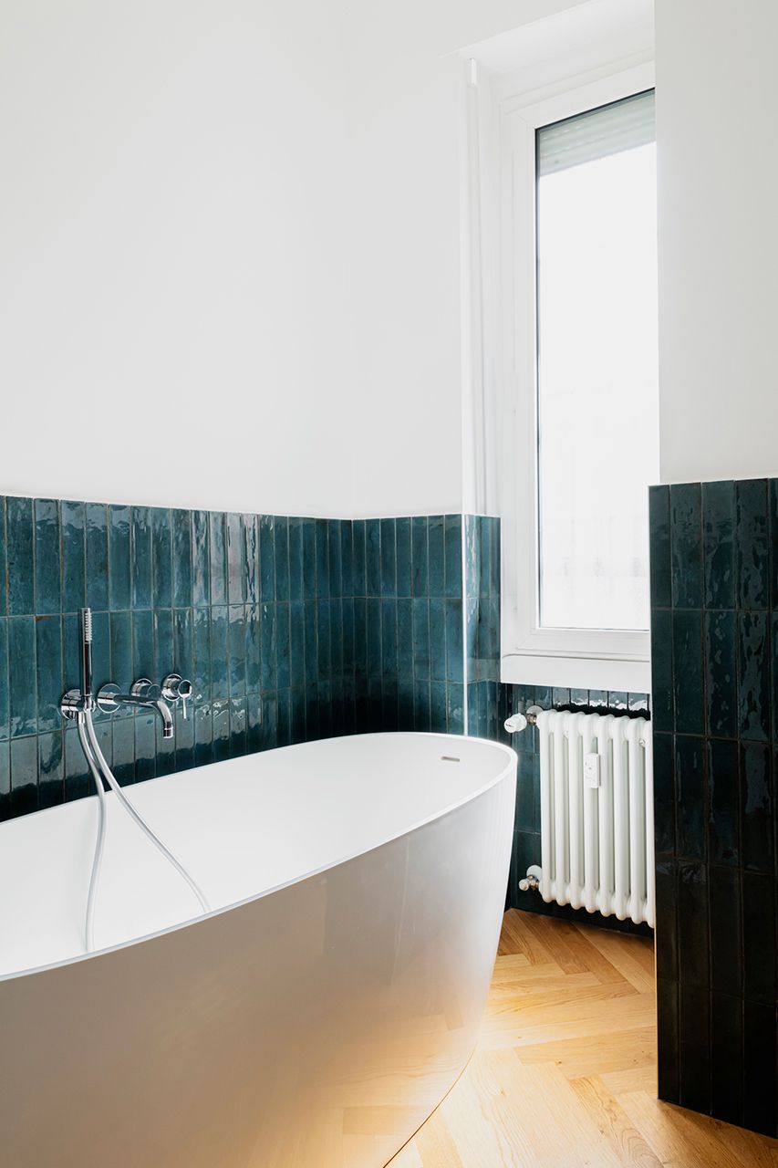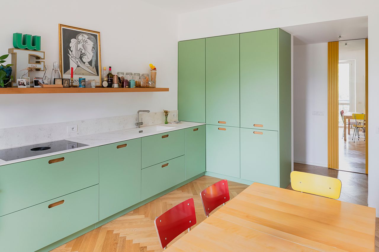 Il progetto riguarda la ristrutturazione di un immobile situato all'estremità nord del quartiere di NoLo, a Milano, in un contesto la cui densità edilizia contenuta garantisce affacci liberi ed ampie vedute sui parchi privati e pubblici sistemati a verde urbano.La richiesta dei Committenti era quindi quella di valorizzare le peculiarità del contesto in un rapporto diretto con il nuovo layout distributivo caratterizzato da un unico ambiente dedicato alla cucina, al pranzo, al relax ed al lavoro da casa, che fosse all'occorrenza suddiviso in due ambienti dalle metrature simili.La prima azione progettuale ha riguardato l'eliminazione di tutti le tramezzature divisorie, che suddvidevano spazi angusti disimpegnati da un corridoio centrale.Assecondando gli affacci abbiamo ritenuto opportuno attestare tutta la zona living lungo la via pubblica, mentre la camera ed il bagno insistono sul cortile interno.La pianta dell'appartamento risulta così suddivisa in due parti nette: due metà; anche nel rispetto degli elementi strutturali esistenti.Dal punto di vista planimetrico abbiamo lavorato sull'ottimizzazione di ogni aspetto con l'intenzione di sfruttare al massimo lo spazio a disposizione, per questo tanto le nuove tramezzature quanto gli arredi definiscono gli ambienti: le colonne contenitive della cucina marcano il passaggio tra l'ingresso e la zona living, mentre il disimpegno del bagno, nascosto da una porta scorrevole a tutt'altezza, è dimensionato per allestire una piccola lavanderia.L'elemento fortemente caratteristico della zona living è l'arco: un aneddoto? Un passaggio? O una chiusura?Potrebbe sembrare una forzatura ma in realtà è la formalizzazione della richiesta dei Committenti di avere un unico ambiente da suddividere in due all'occorrenza e la scelta figurativa è dovuta al fatto che quest'arco a tre centri conserva la sua fisionomia quando è aperto e quando è chiuso.L'arco in realtà sono due archi distanziati tra loro della misura strettamente necessaria a creare un intercapedine nella quale si nascondo le ante in legno laccato che scorrono lungo due binari installati a soffitto; per realizzare gli archi è stata preparata una centina sagomata sulla base del disegno cad, tagliata al laser.Il bagno marca un netto cambio di mood: piastrelle di piccolo formato in ceramica smaltata colore verde acquamarina delineano una mezz'altezza continua lungo tutto il perimetro dell'ambiente nel quale trovano posto, oltre ai sanitari, la doccia, la vasca da bagno freestanding ed un mobile color rosso corallo con lavello incassato.L'intera ristrutturazione è stata realizzata adottando sistemi costruttivi “a secco” così da ottimizzare le tempistiche di realizzazione e l'approvvigionamento del cantiere: le tramezzature sono in cartongesso con l'impiego di soluzioni volte a garantire un elevato comfort acustico all'interno degli ambienti e con la scelta di lastre particolarmente performanti dal punto di vista della resistenza meccanica.