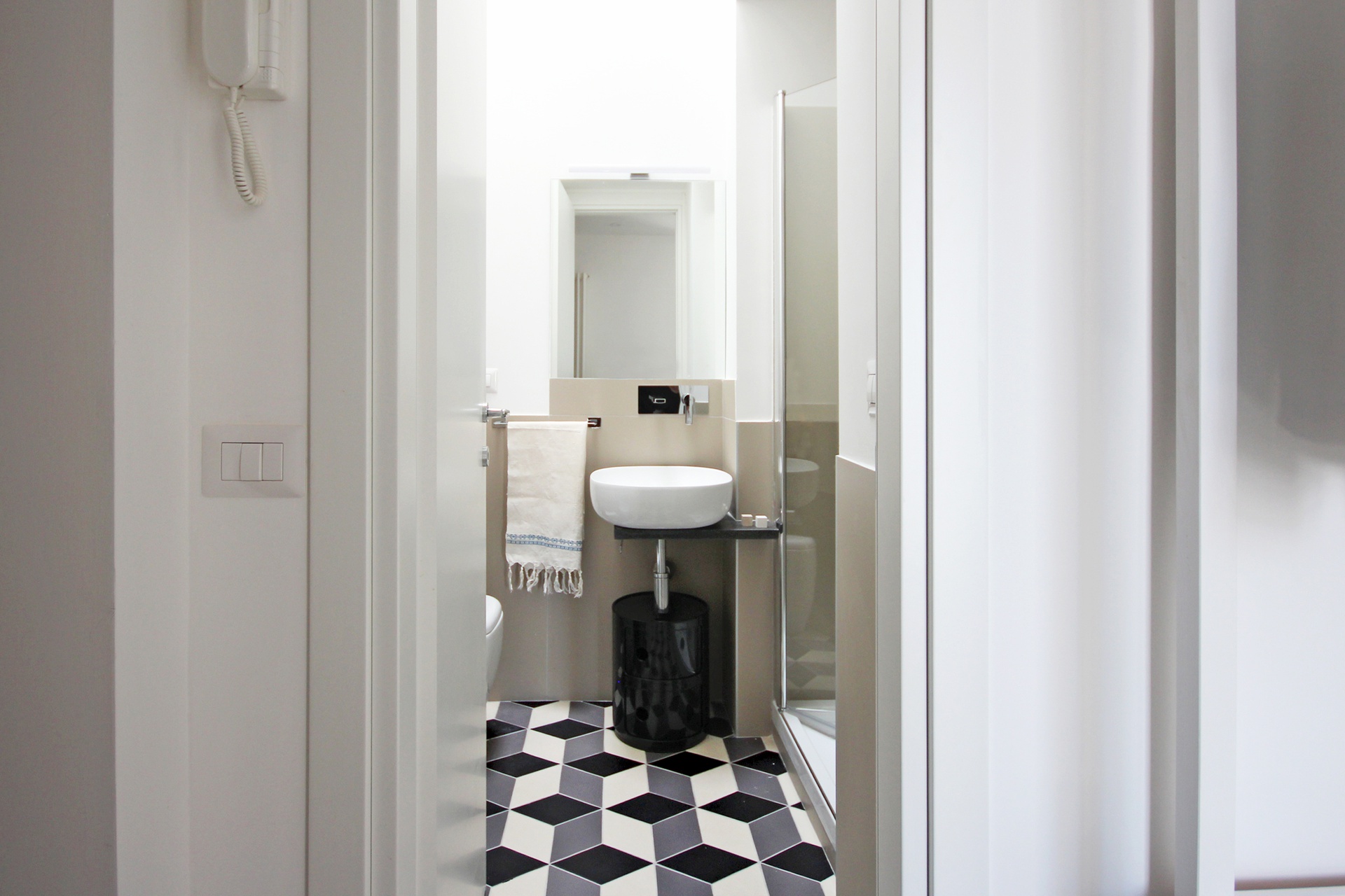 Un mini appartamento a pochi passi dalla Riviera di Chiaia, al quarto piano senza ascensore, per veri sportivi! Concepito e progettato per valorizzarne la luce, reso unico inserendo le geometrie della tradizione napoletana in una fascia di pavimento, che crea un effetto ottico particolare, distinguendo idealmente la parte di casa che prevede il movimento da quella che invita al riposo.