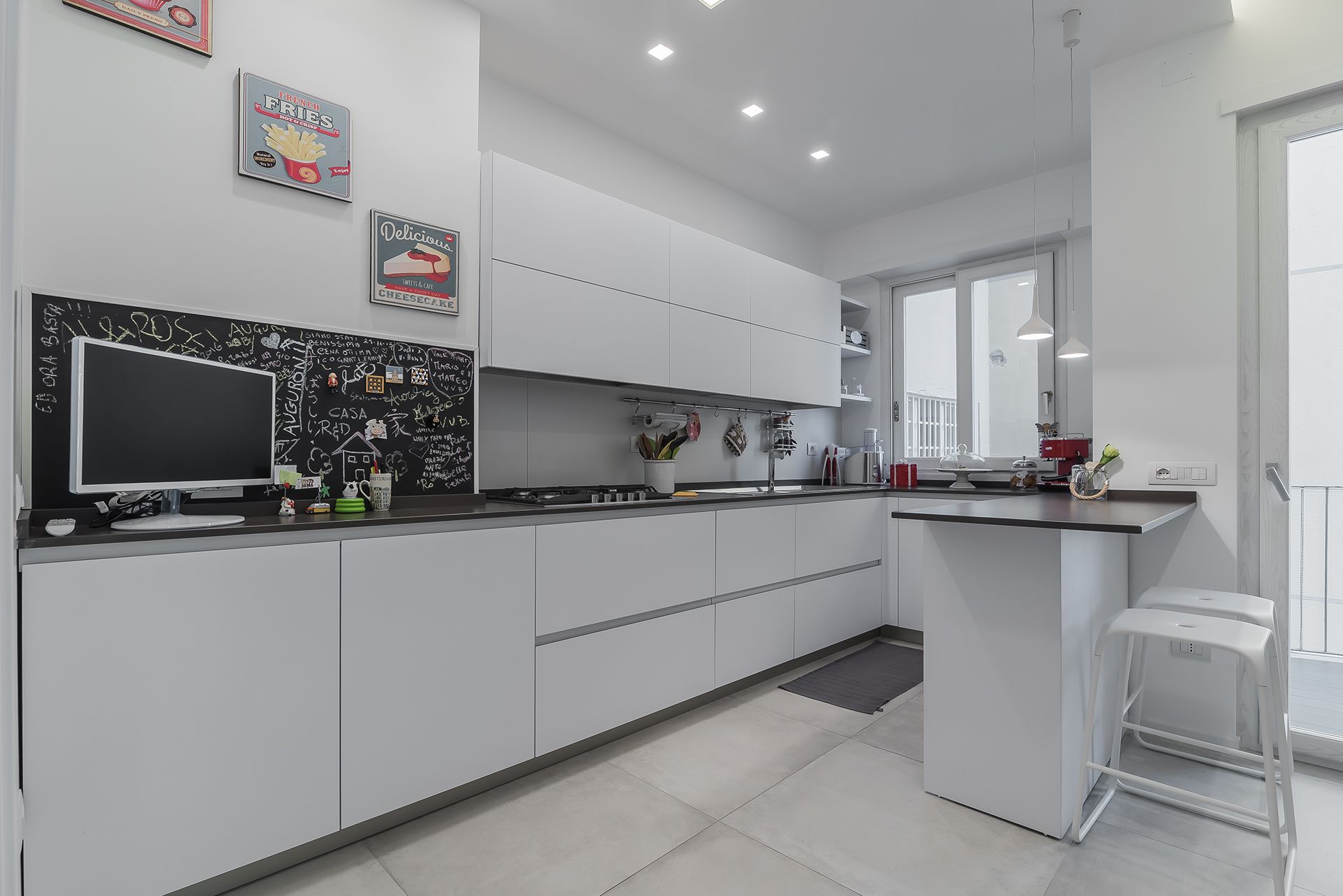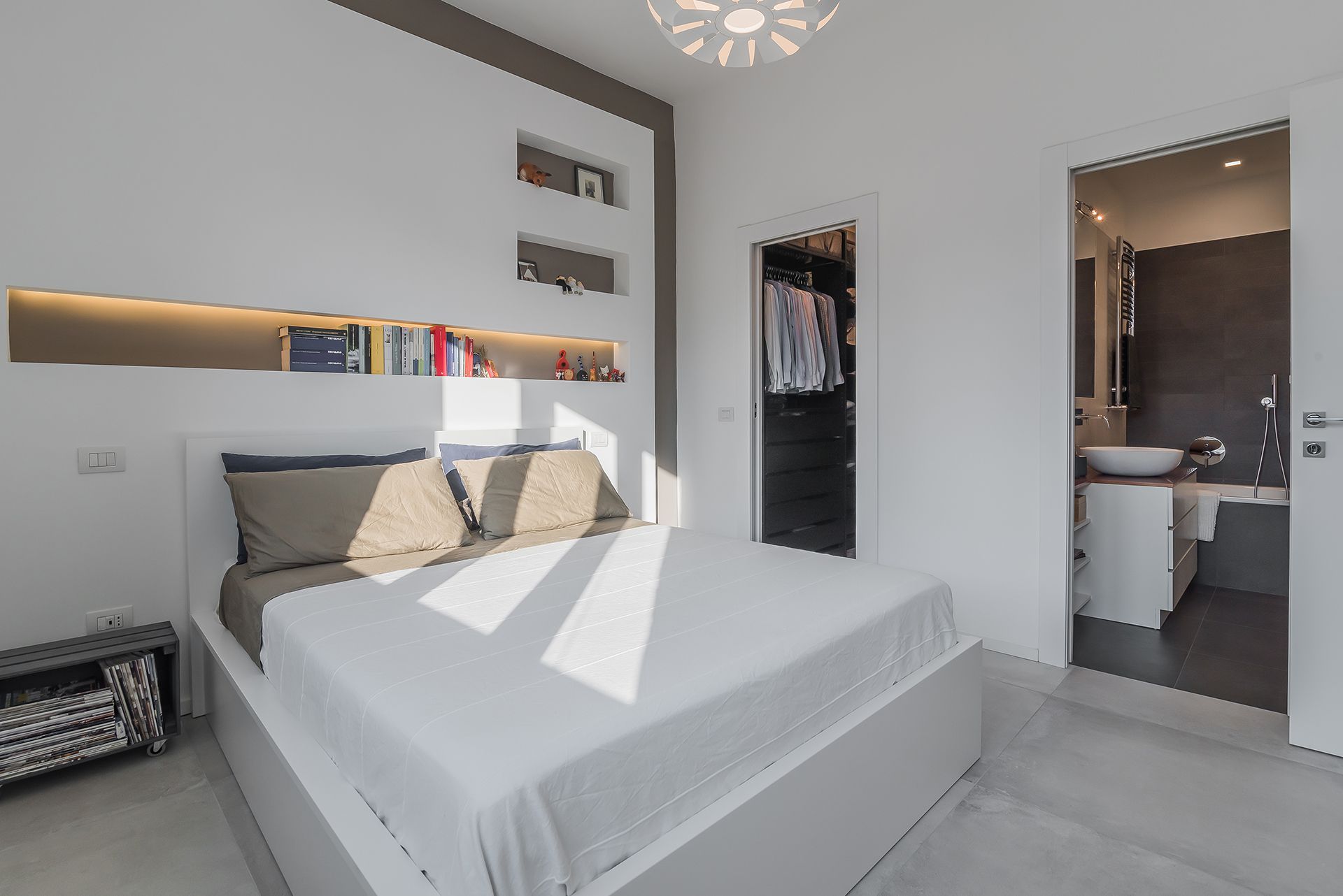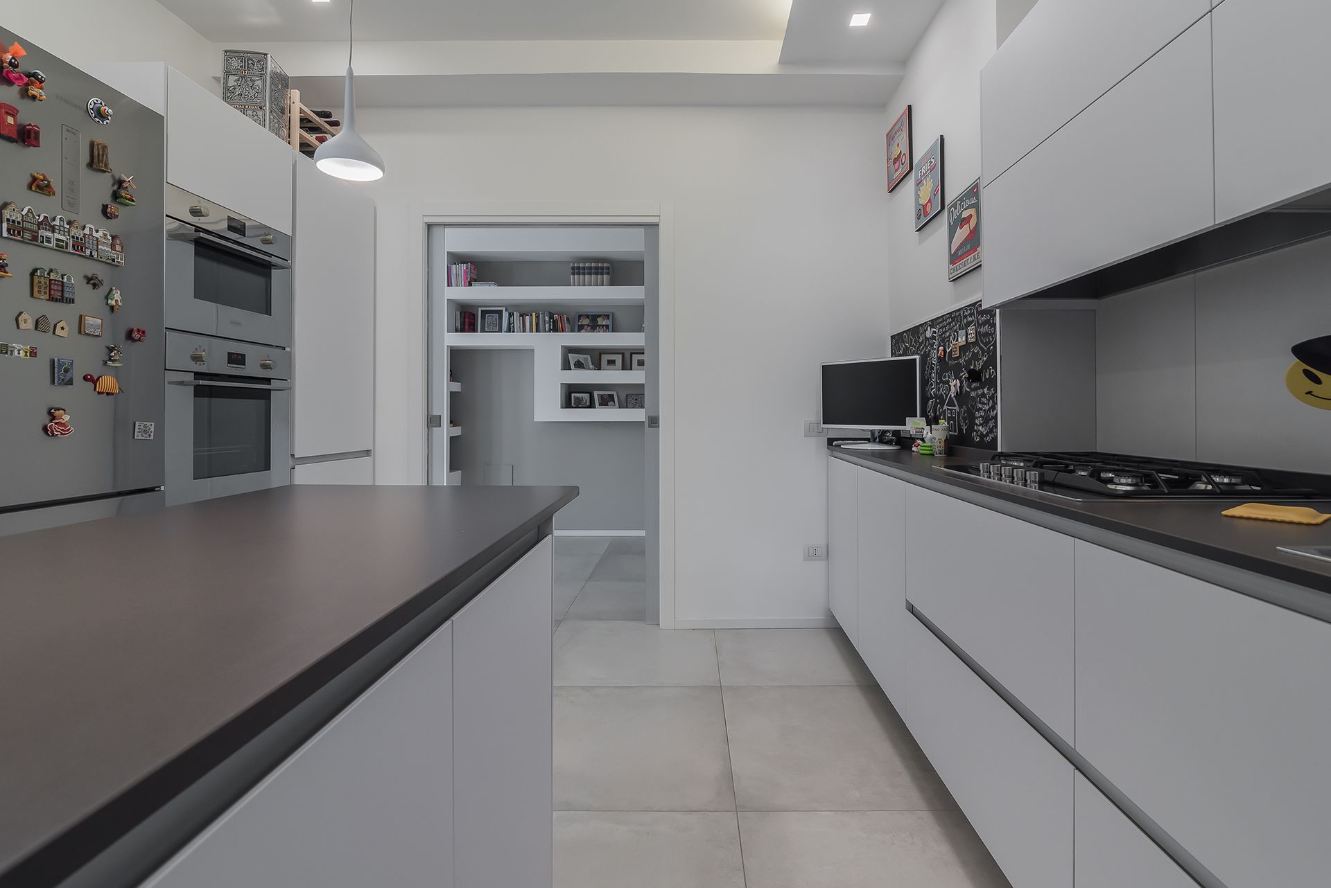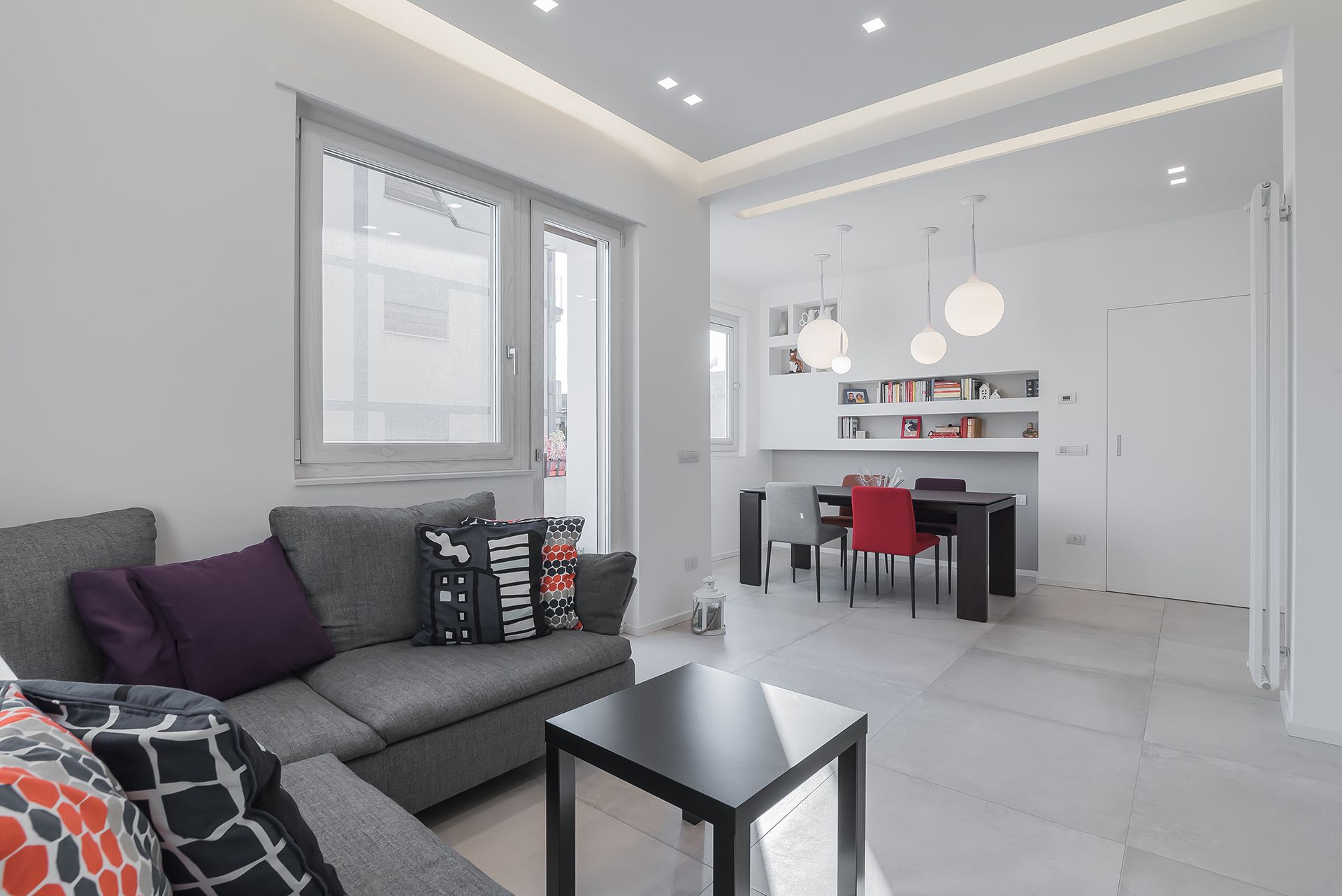 Questa ristrutturazione prevede una completa trasformazione di un appartamento di 90 mq calpestabile.I clienti hanno chiesto ambienti luminosi e colori chiari, quindi la scelta è andata su una mattonella effetto cemento 80x80, pareti bianche e giochi di controsoffitti con faretti da incasso e inserimento di fasce luminose a led.Caratteristica la conotroparete attrezzata all'ingresso che funge da libreria e nasconde la porta invisibile che separa la zona giorno dalla zona notte.