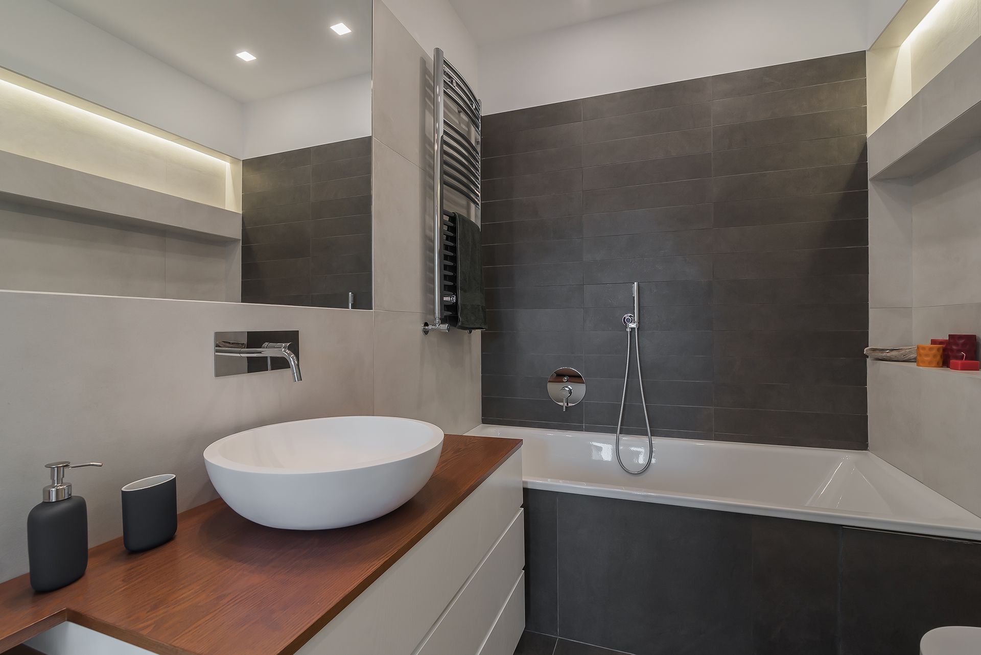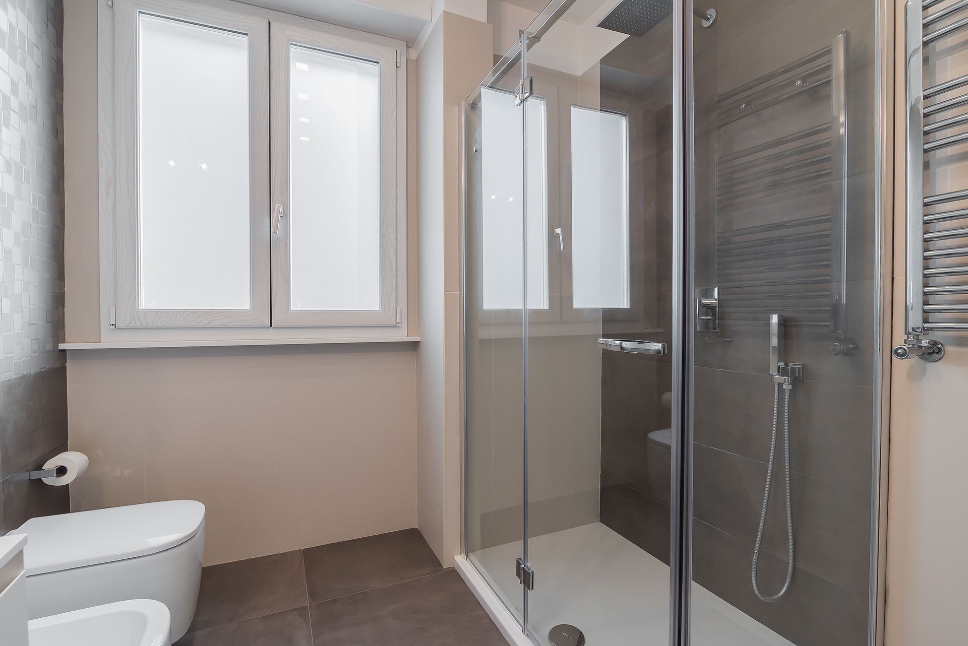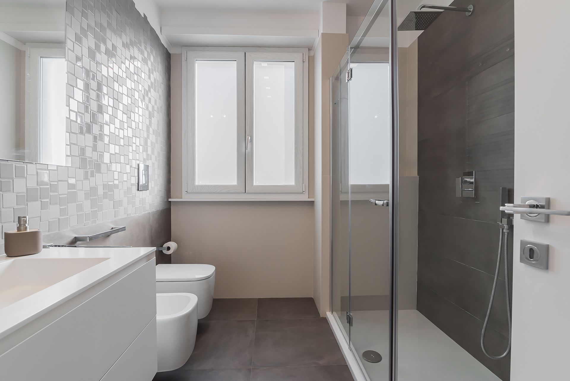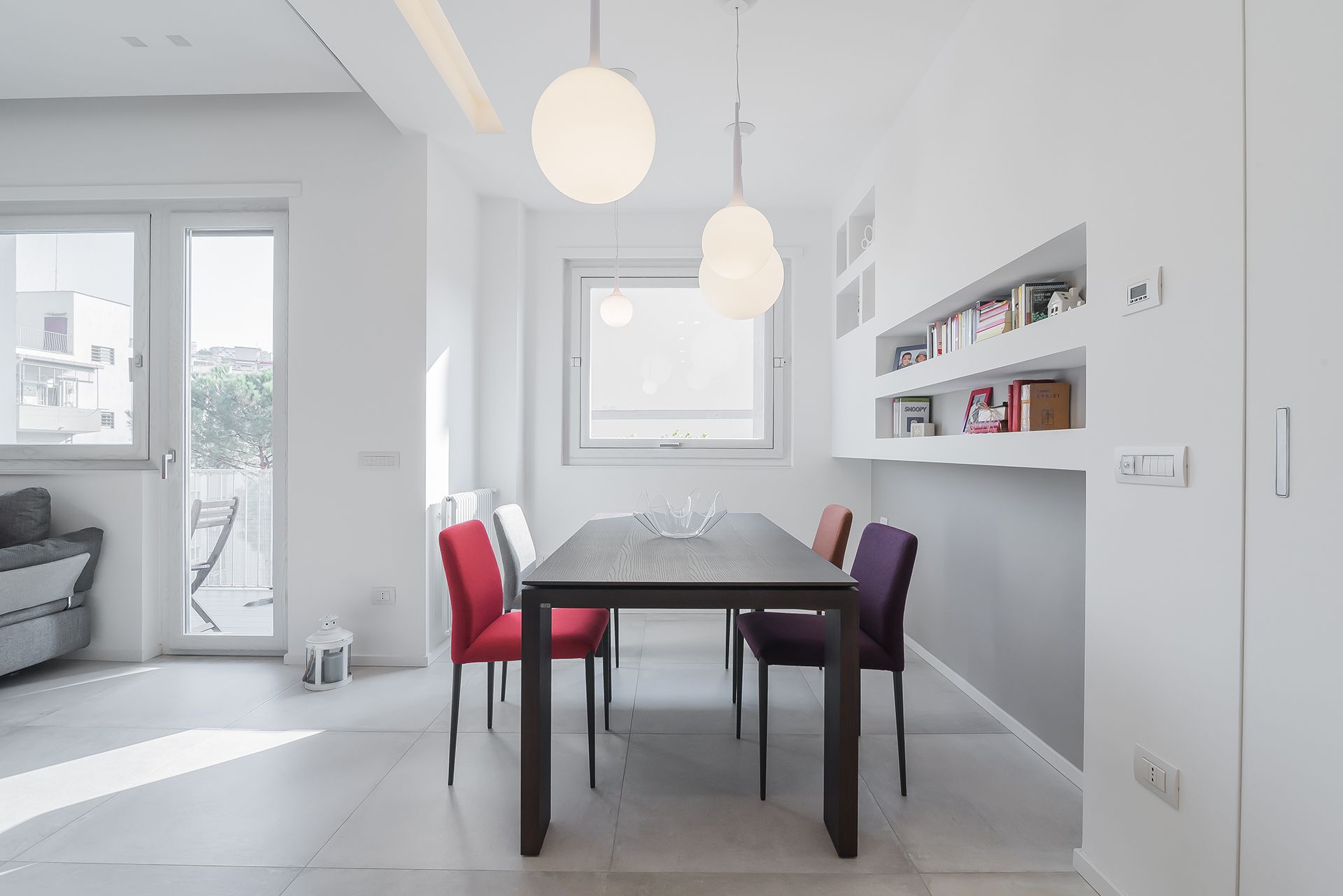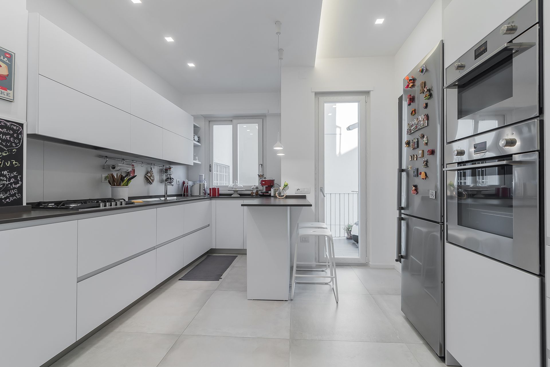 Questa ristrutturazione prevede una completa trasformazione di un appartamento di 90 mq calpestabile.I clienti hanno chiesto ambienti luminosi e colori chiari, quindi la scelta è andata su una mattonella effetto cemento 80x80, pareti bianche e giochi di controsoffitti con faretti da incasso e inserimento di fasce luminose a led.Caratteristica la conotroparete attrezzata all'ingresso che funge da libreria e nasconde la porta invisibile che separa la zona giorno dalla zona notte.
