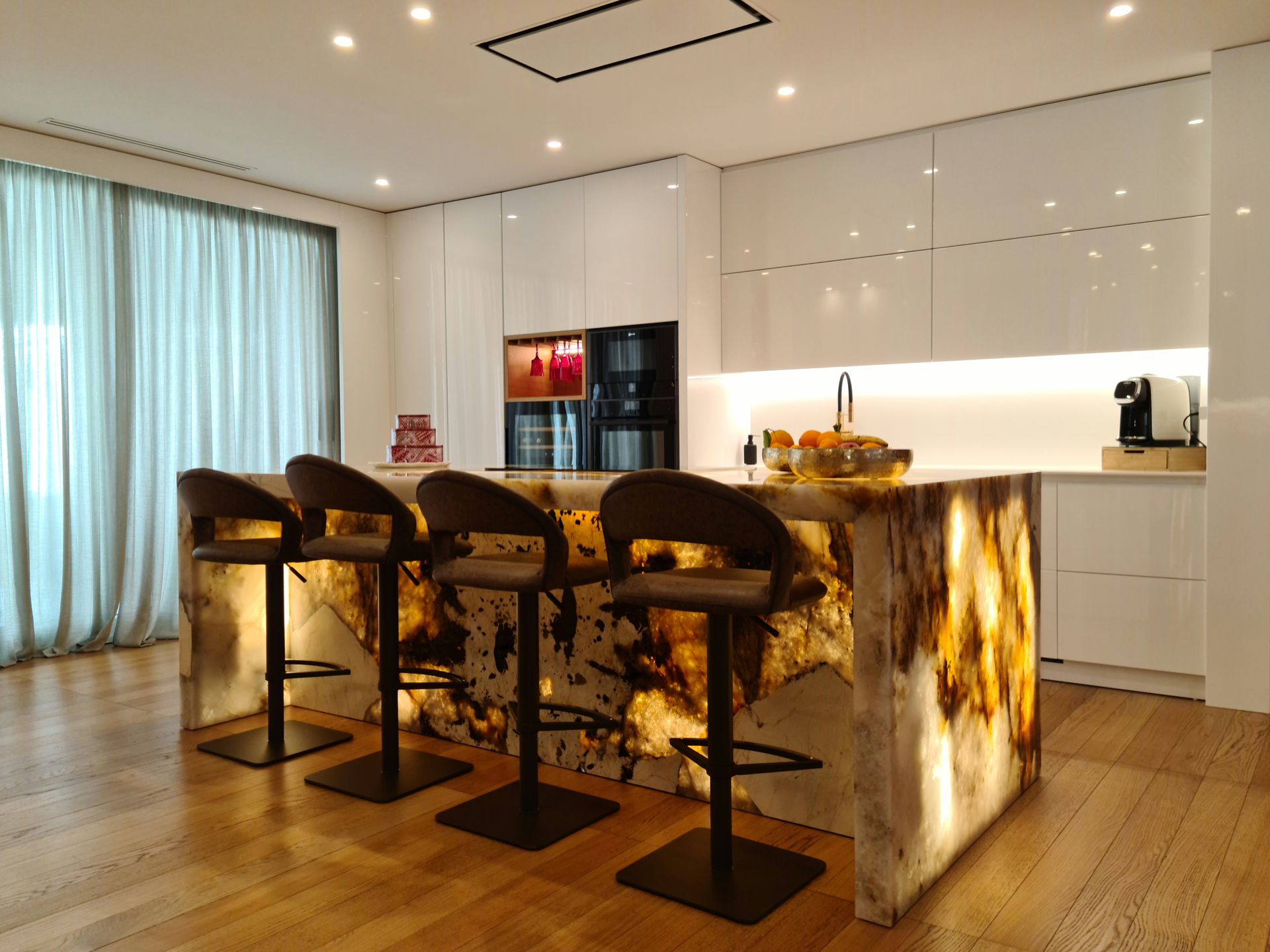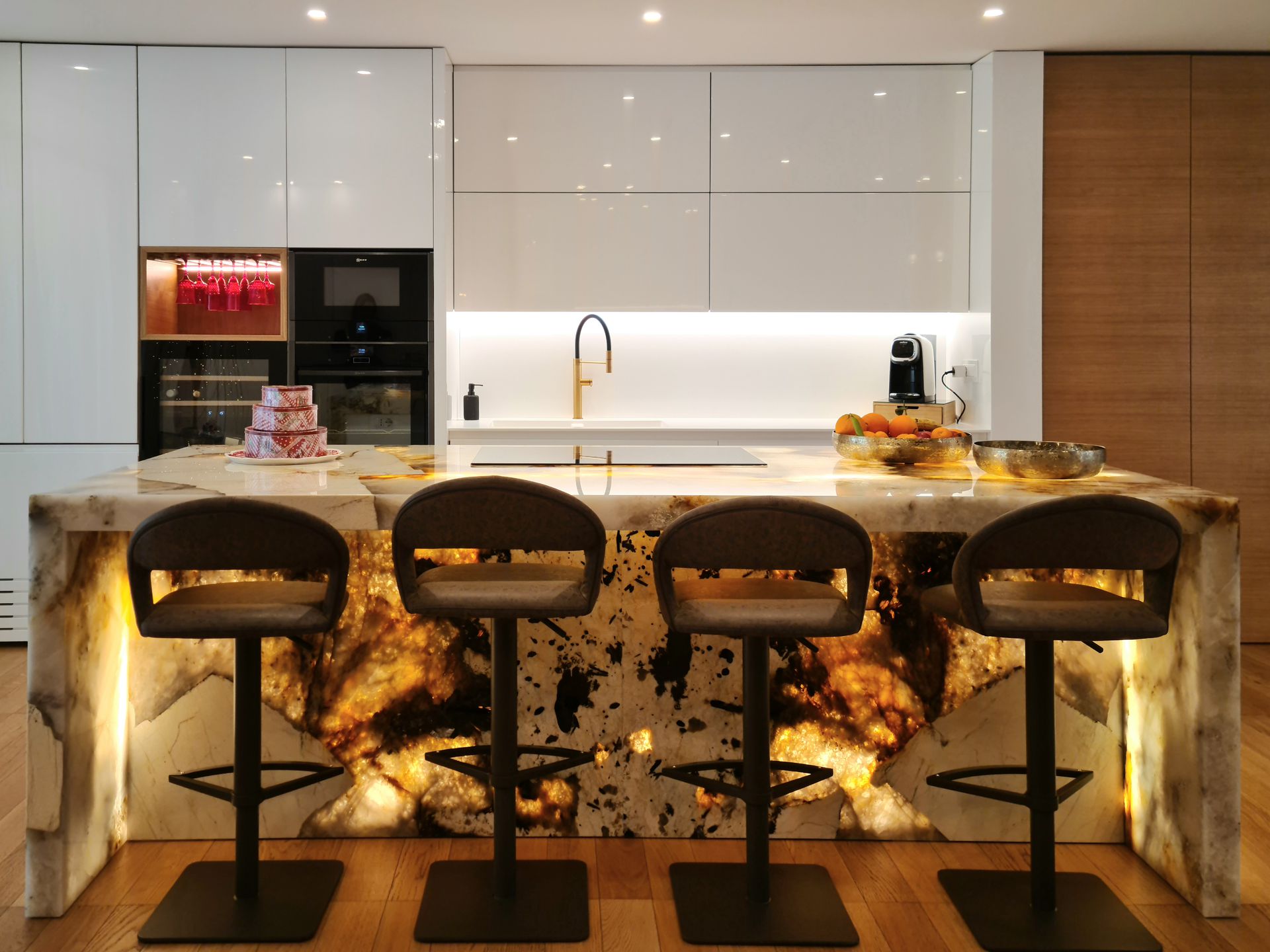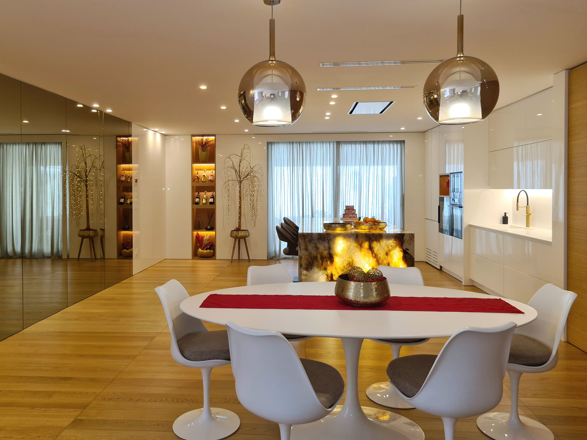 Questo progetto di interior design realizzato ad Andria nel 2022 si sviluppa attorno a una zona giorno ampia e contemporanea, definita da arredi su misura e materiali di forte impatto estetico. Il pavimento in parquet naturale accompagna gli ambienti creando continuità visiva e valorizzando la luminosità dello spazio.Elemento centrale del progetto è la cucina con isola realizzata in Patagonia naturale retroilluminato di Antolini, che diventa protagonista scenografica dell’intero ambiente. La composizione è caratterizzata da superfici bianche laccate lucide alternate a colonne in rovere, creando un equilibrio tra matericità e pulizia formale.A definire lo spazio, una boiserie continua con porte a scomparsa rivestite in specchio bronzo amplifica la percezione dell’ambiente e contribuisce a creare un effetto di continuità visiva. Il progetto è stato inoltre condiviso sulle pagine social ufficiali di Antolini , a testimonianza del valore materico e compositivo della soluzione adottata.