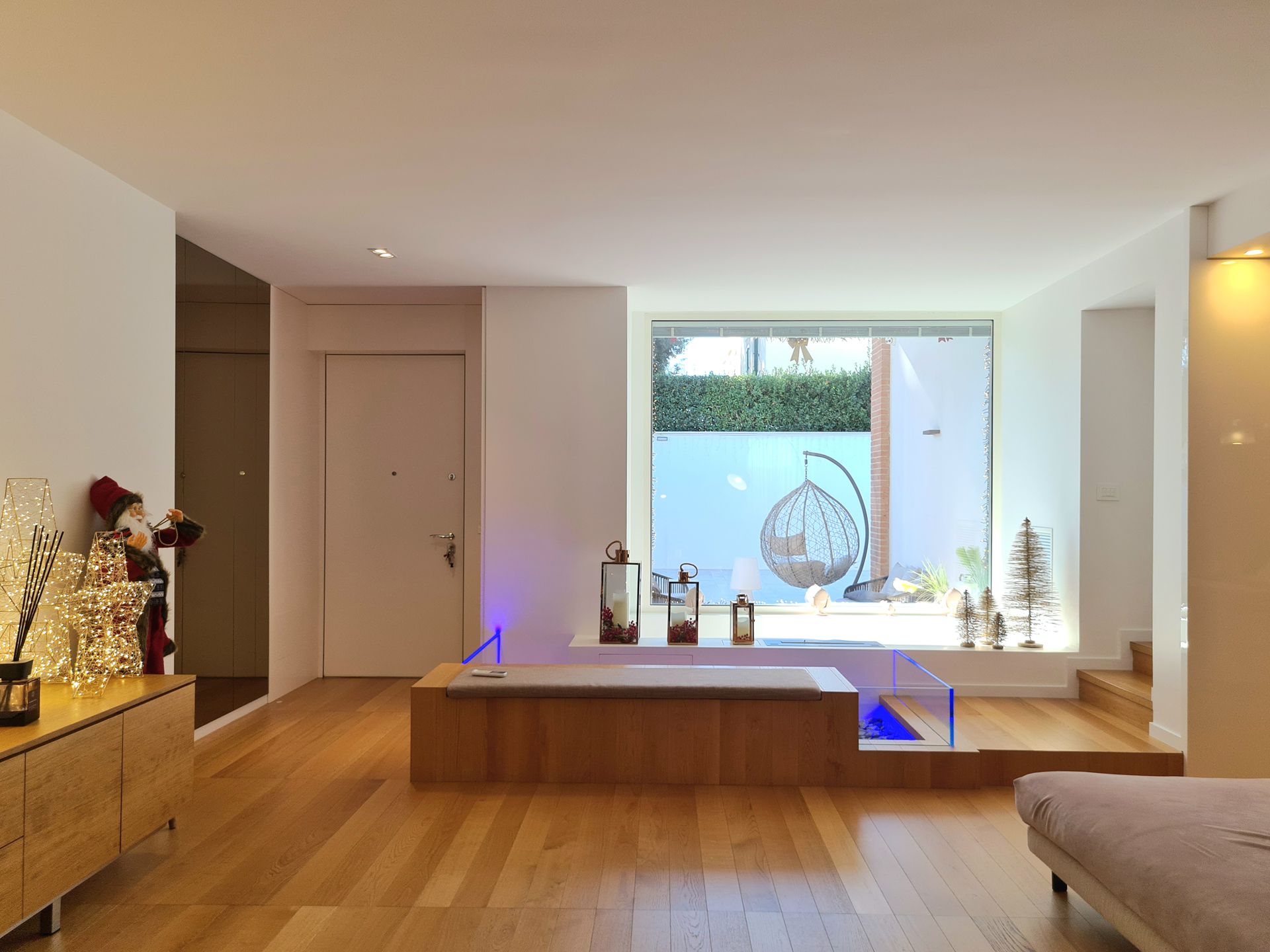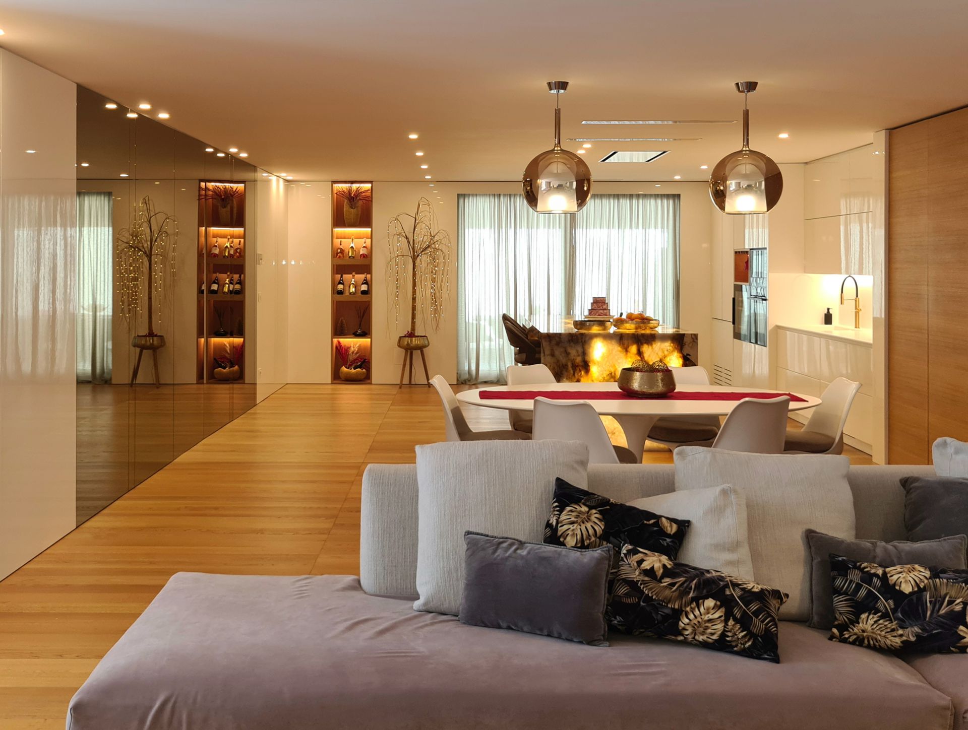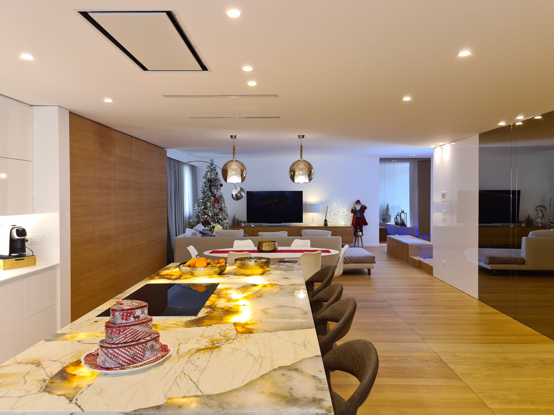 Questo progetto di interior design realizzato ad Andria nel 2022 si sviluppa attorno a una zona giorno ampia e contemporanea, definita da arredi su misura e materiali di forte impatto estetico. Il pavimento in parquet naturale accompagna gli ambienti creando continuità visiva e valorizzando la luminosità dello spazio.Elemento centrale del progetto è la cucina con isola realizzata in Patagonia naturale retroilluminato di Antolini, che diventa protagonista scenografica dell’intero ambiente. La composizione è caratterizzata da superfici bianche laccate lucide alternate a colonne in rovere, creando un equilibrio tra matericità e pulizia formale.A definire lo spazio, una boiserie continua con porte a scomparsa rivestite in specchio bronzo amplifica la percezione dell’ambiente e contribuisce a creare un effetto di continuità visiva. Il progetto è stato inoltre condiviso sulle pagine social ufficiali di Antolini , a testimonianza del valore materico e compositivo della soluzione adottata.