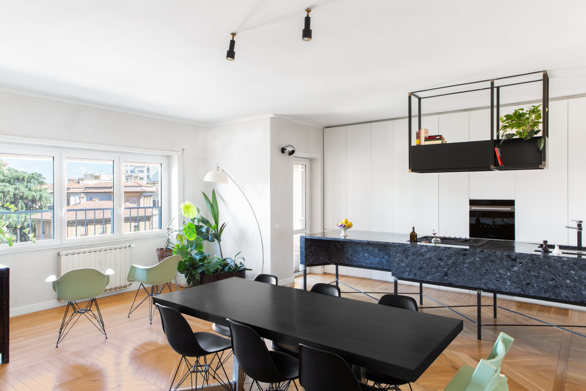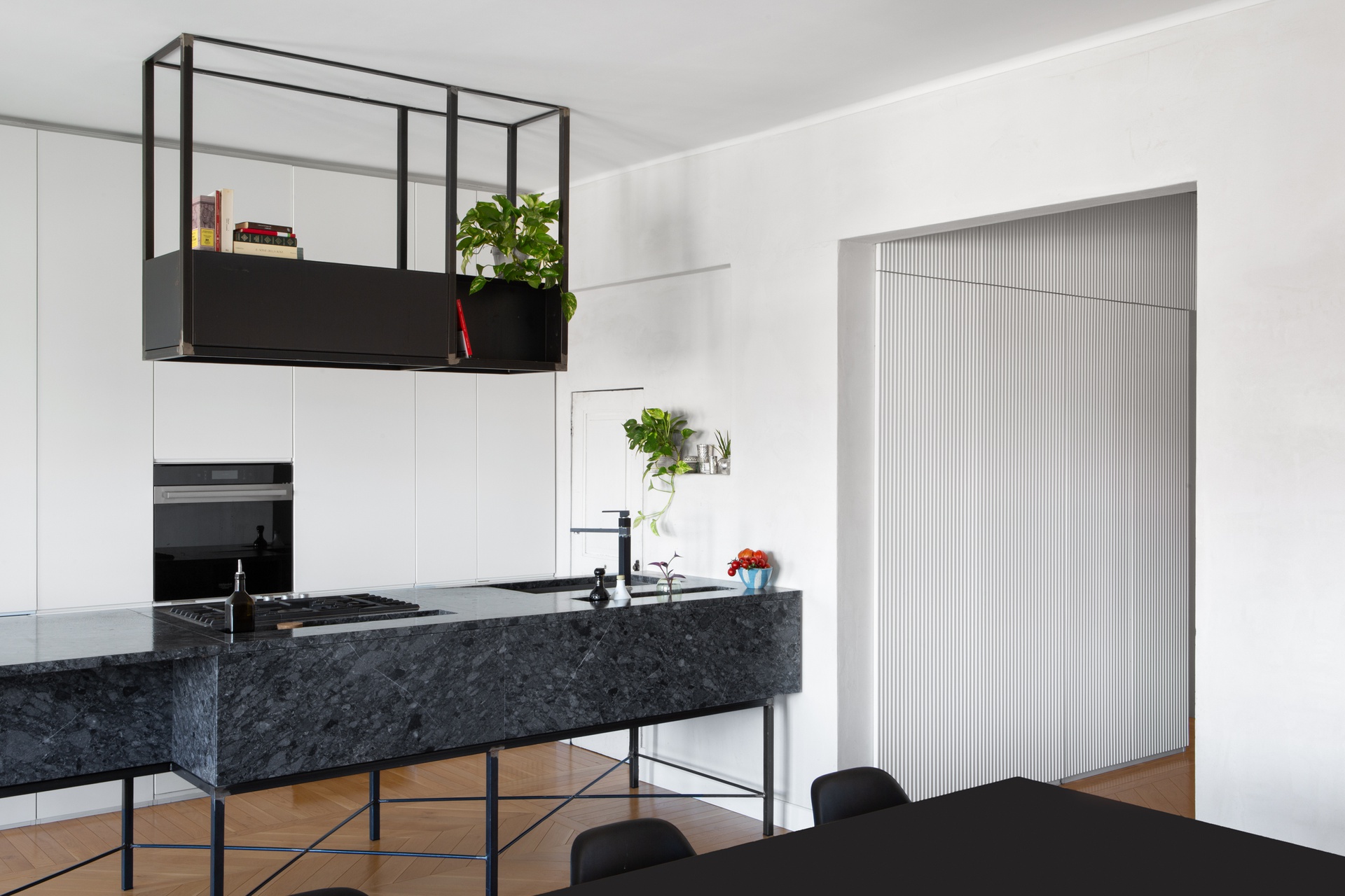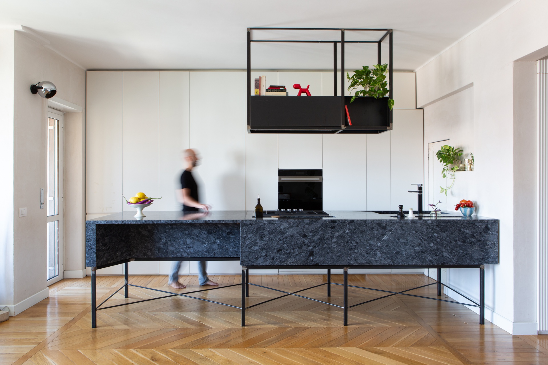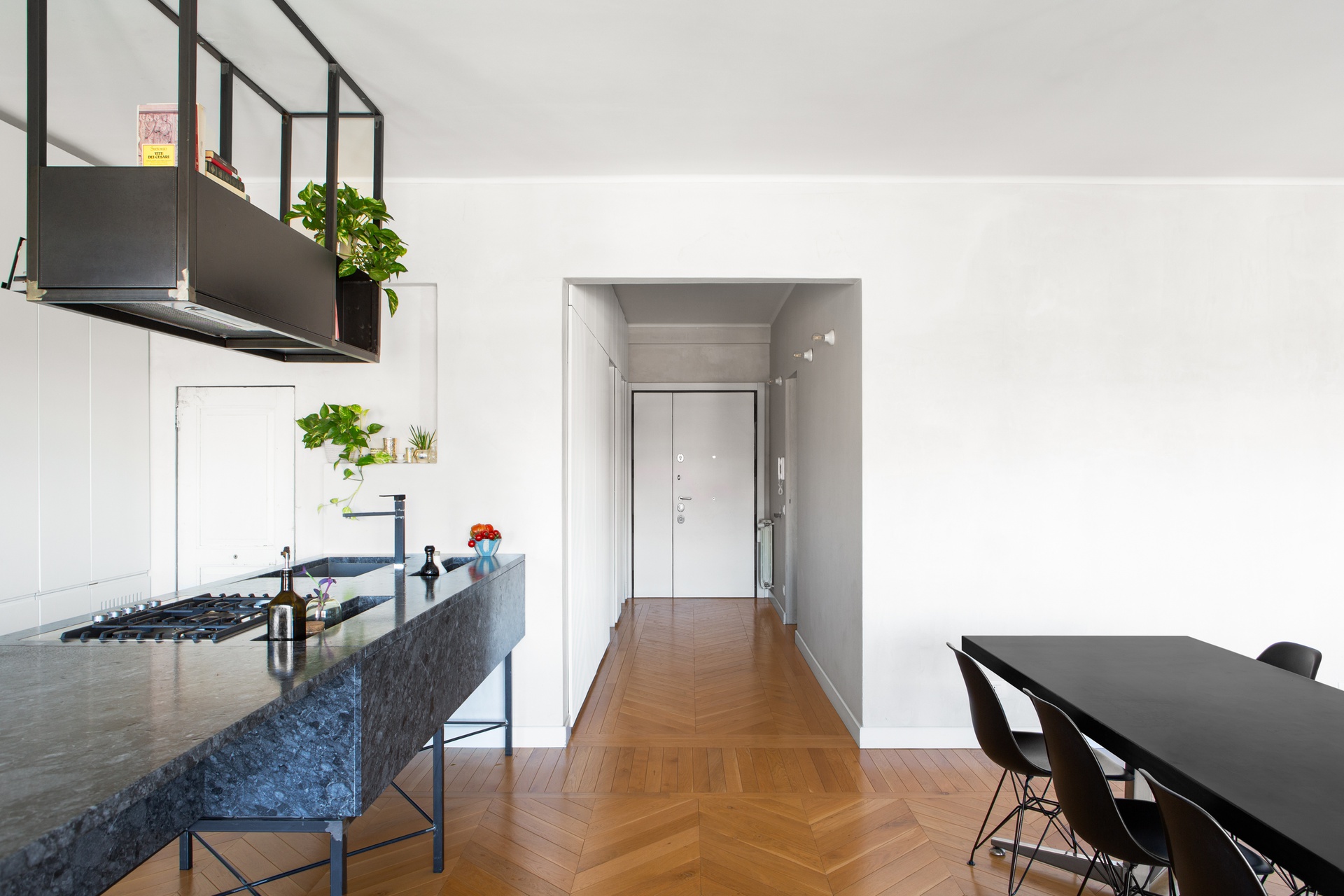 L’intervento riguarda un appartamento di 130 mq situato a Roma. Il concept progettuale si fonda sull’idea di trasformare la cucina in un elemento centrale dello spazio abitativo, concepito come un grande tavolo capace di favorire la convivialità e lo scambio tra le persone.Il tema guida dell’intero progetto è l’artigianalità. Per valorizzare le radici calabresi della committenza, è stato scelto di utilizzare la pietra di Grisolia, un materiale calcareo tipico lavorato esclusivamente a Cetraro (CS), finora mai impiegato nella realizzazione di elementi di design.La cucina è stata interamente costruita su misura, con una struttura in legno, rivestimenti in pietra di Grisolia e supporti in ferro. L’elemento non poggia direttamente a terra, ma è sollevato da gambe in ferro battuto, richiamando così la forma e la leggerezza di un grande tavolo da convivio.L’intero volume si inserisce su una pavimentazione in parquet di quercia di Borgogna, accostato a una porta d’epoca recuperata proveniente dalla casa della nonna della proprietaria, a sottolineare il legame affettivo e materico con la tradizione.L’identità del progetto si definisce quindi attraverso un duplice registro: da un lato un design contemporaneo e sperimentale, dall’altro un profondo richiamo alla manualità e alla memoria artigianale.