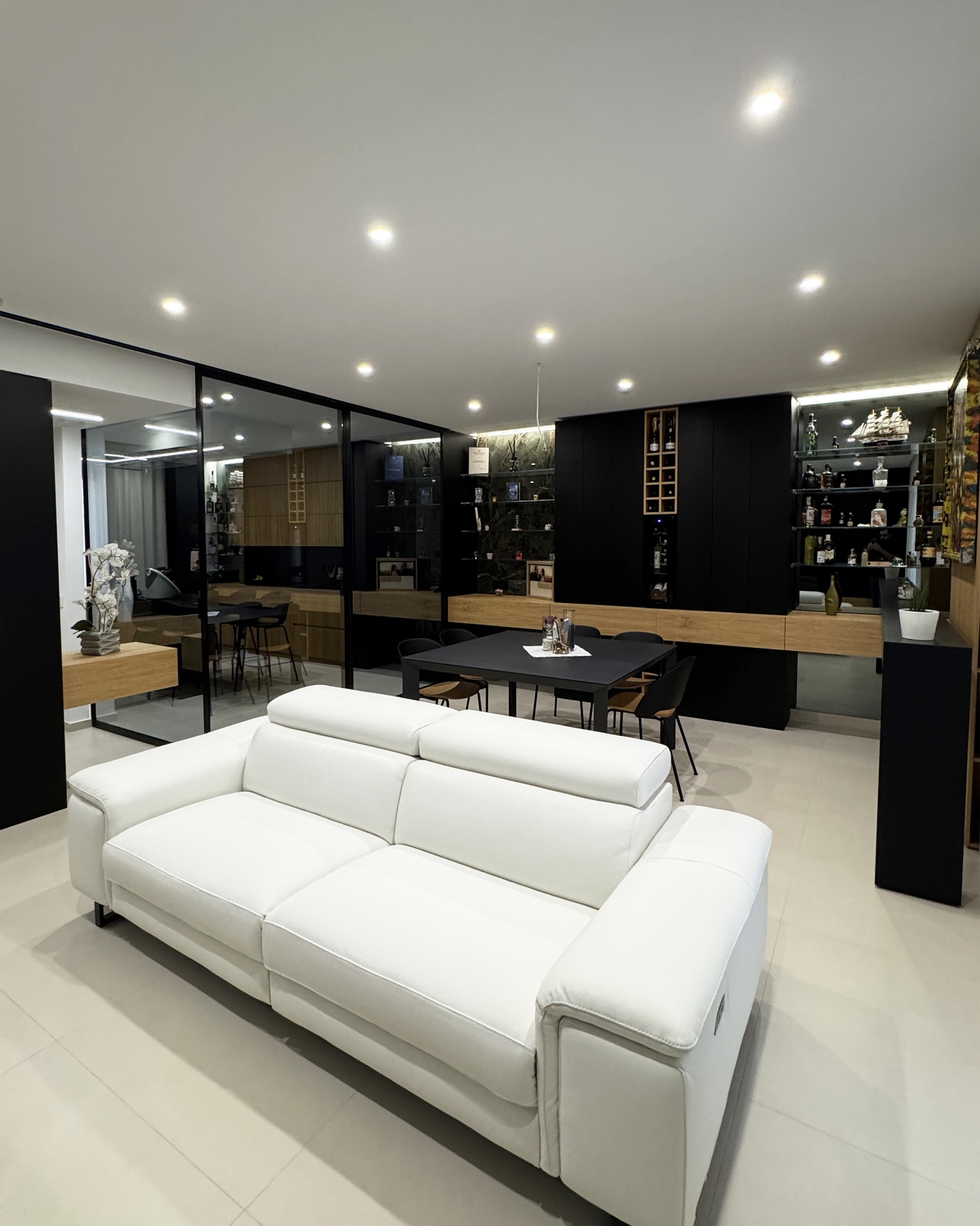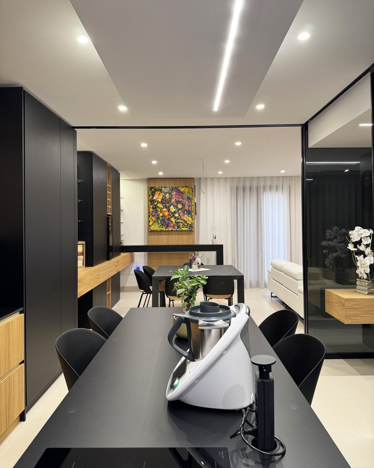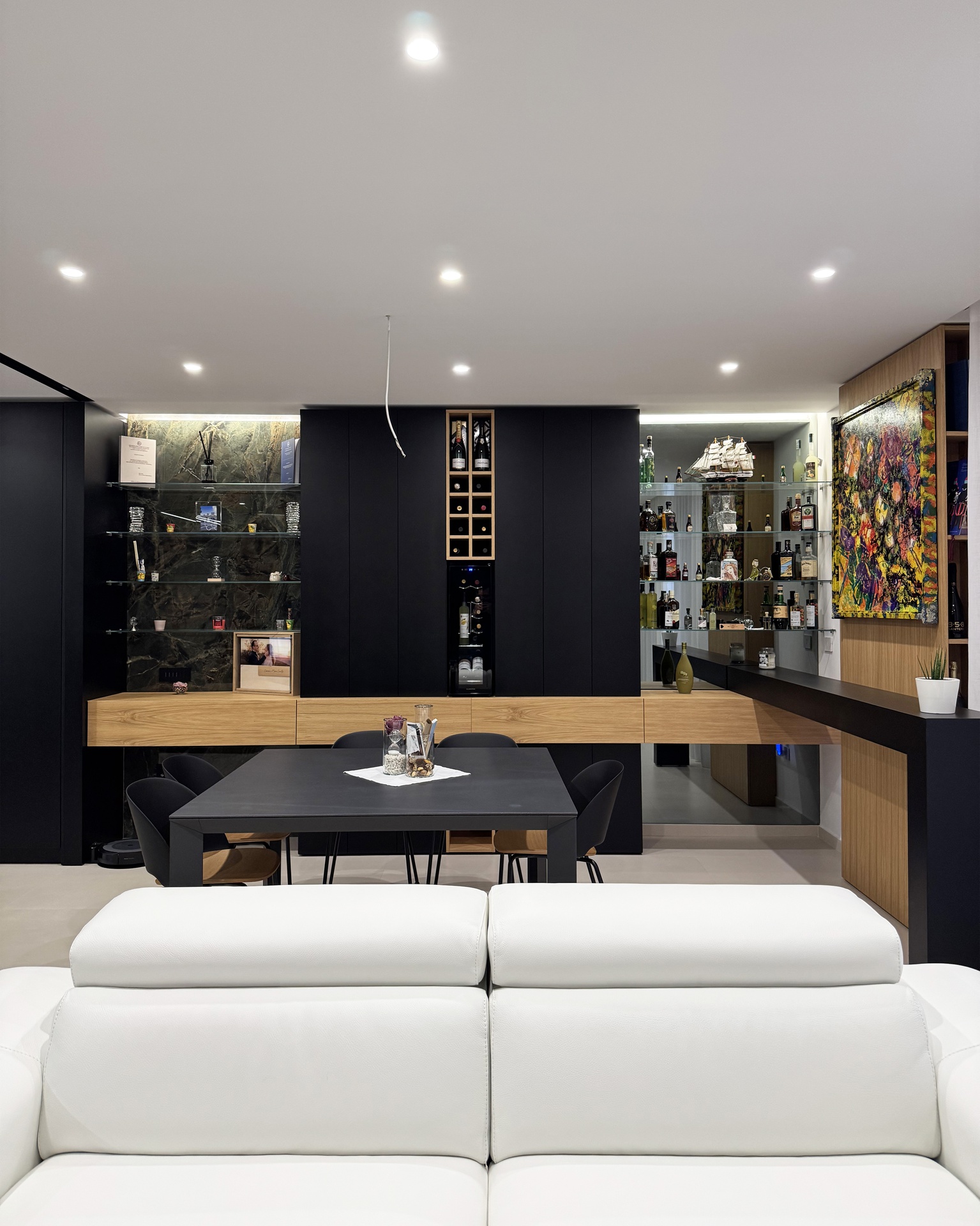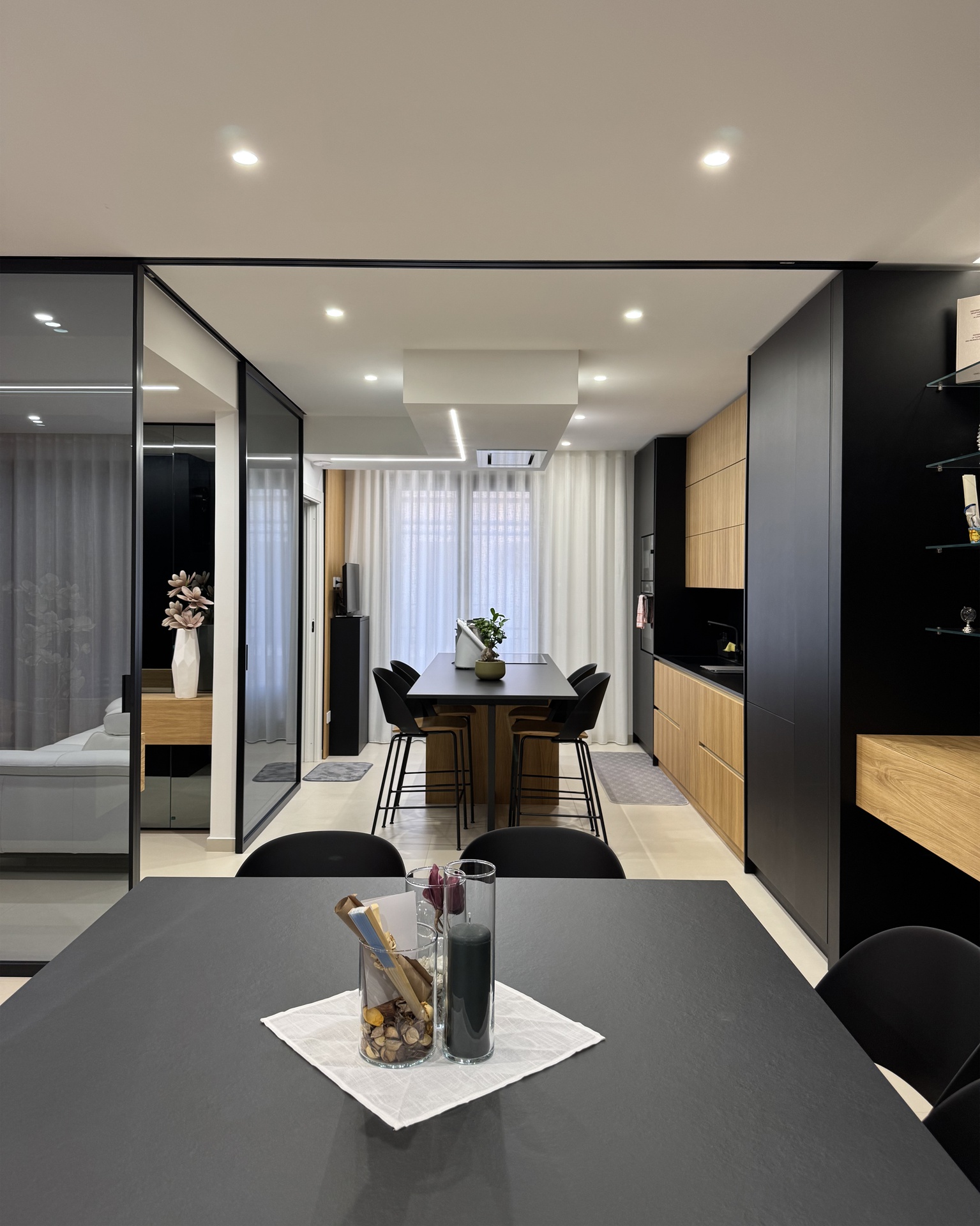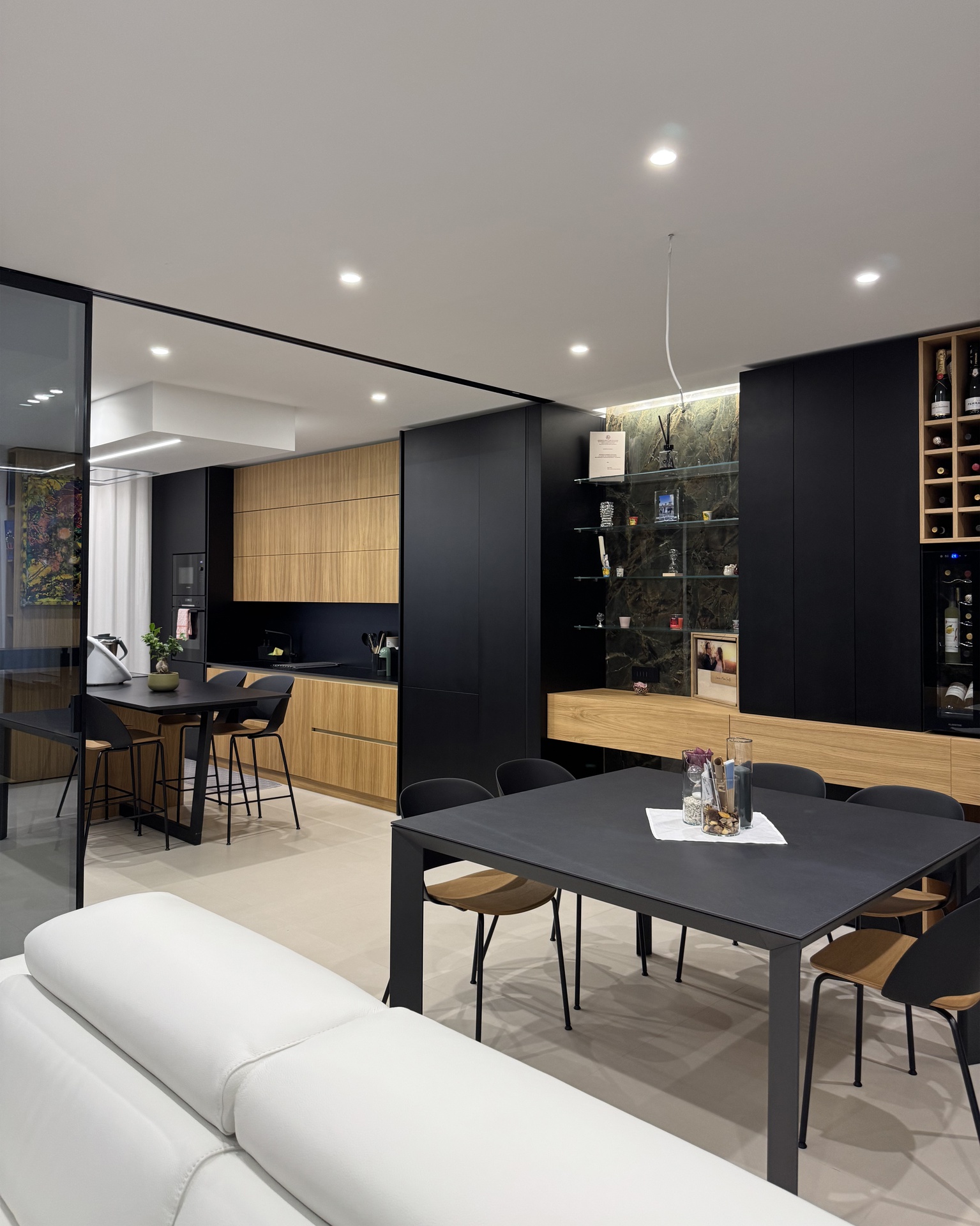 Ristrutturazione di appartamento | 120 mqIl progetto riguarda la ristrutturazione di un appartamento di circa 120 mq, situato al primo piano di una villetta a schiera di nuova costruzione. L’intervento nasce dall’esigenza dei committenti di ottenere una zona giorno ampia e flessibile, capace di trasformarsi grazie alla possibilità di separare la cucina dal living.La nuova distribuzione distingue in modo chiaro zona giorno e zona notte, separate da una porta a tutta altezza che segna il passaggio tra la dimensione pubblica e quella privata dell’abitazione.L’ingresso conduce direttamente alla zona living, concepita come un grande open space in cui convivono area relax, zona pranzo e angolo bar, affiancati da un bagno/lavanderia. La cucina, caratterizzata da un’isola centrale, è separata dalla zona giorno da porte scorrevoli in vetro fumé a tutta altezza, che garantiscono continuità visiva e, allo stesso tempo, maggiore riservatezza alla zona operativa.Tutti gli arredi sono stati progettati su misura. Elemento centrale del progetto è il mobile che ingloba il pilastro strutturale: un volume multifunzionale che funge da filtro, da mobile d’ingresso e da elemento di connessione tra gli spazi. L’angolo bar si sviluppa in continuità con la cucina; il bancone mobile consente un utilizzo flessibile dell’ambiente e integra una cantinetta per i vini.I materiali scelti comprendono rovere naturale, laccato nero opaco e rivestimenti in gres porcellanato di grande formato, utilizzati per conferire uniformità e carattere agli ambienti.La zona notte ospita una camera matrimoniale, due camerette e un bagno padronale dotato di lavabo, ampia doccia e vasca centro stanza. Nella camera matrimoniale, il letto è posizionato al centro dello spazio e integrato con il sistema di arredi, creando un ambiente raccolto e coerente.L’abitazione è dotata di impianto di riscaldamento e raffrescamento a pavimento e di un sistema elettrico domotizzato, che rende l’intero appartamento smart.