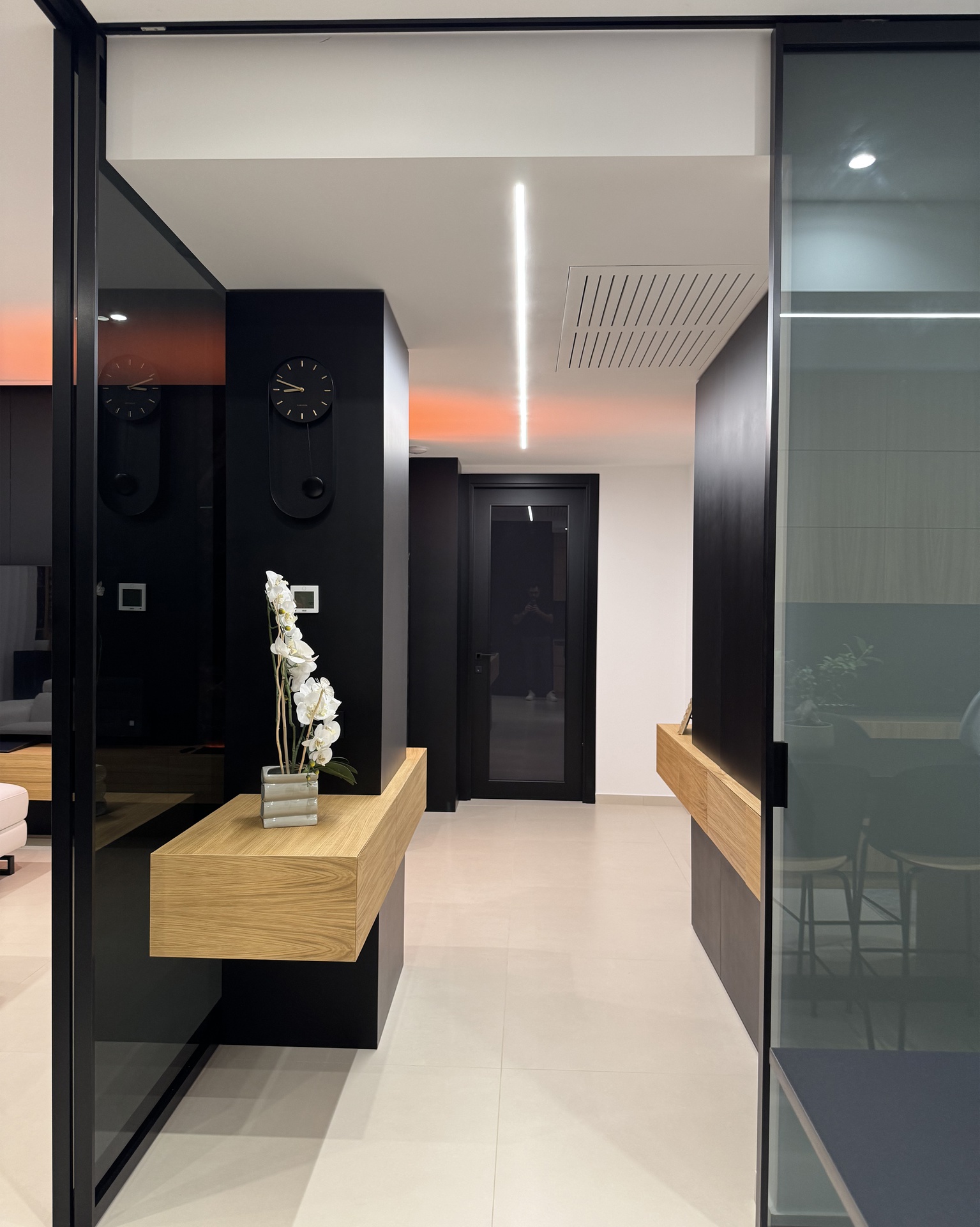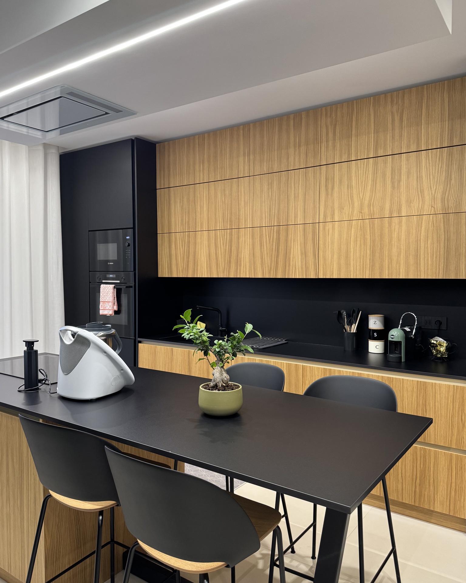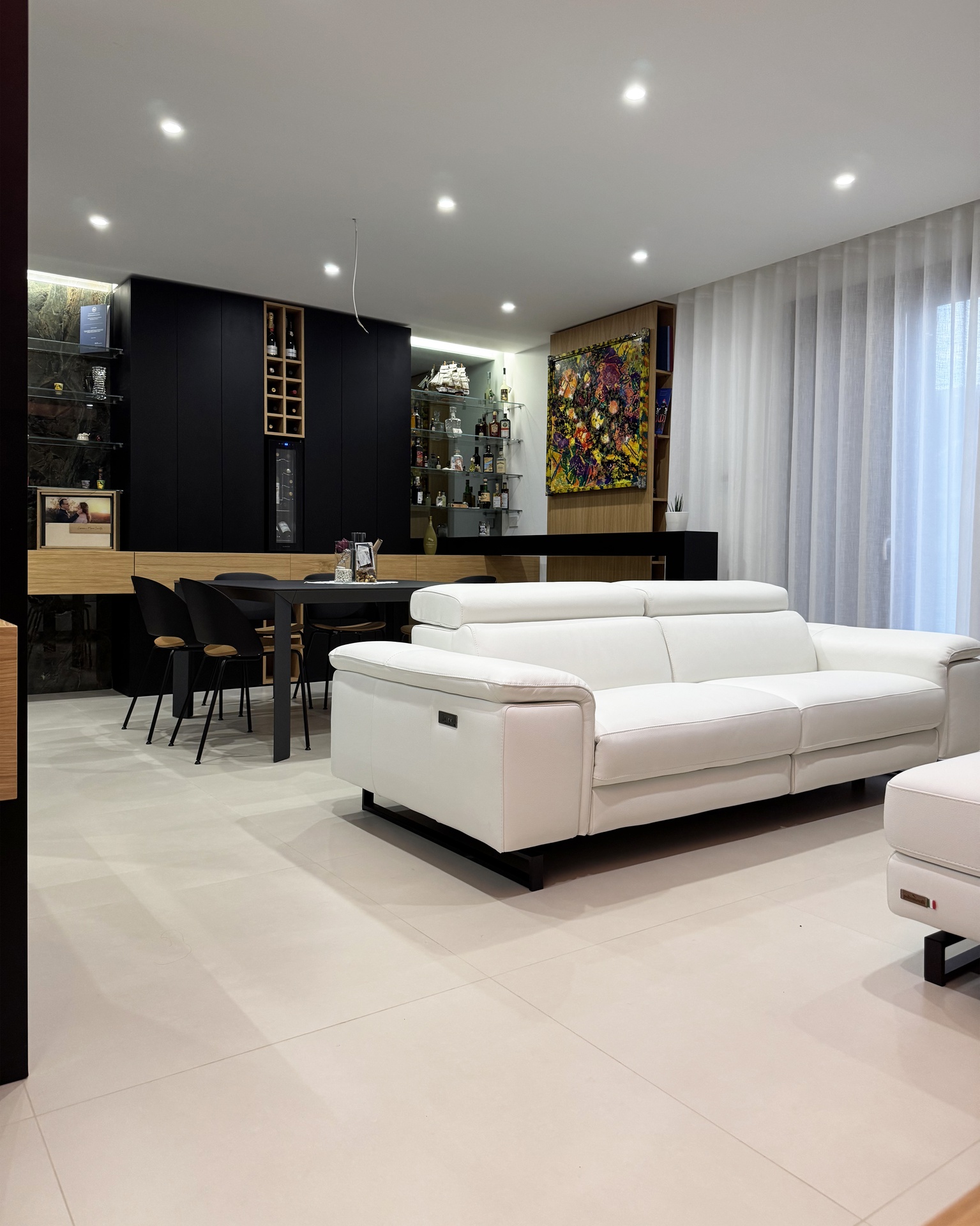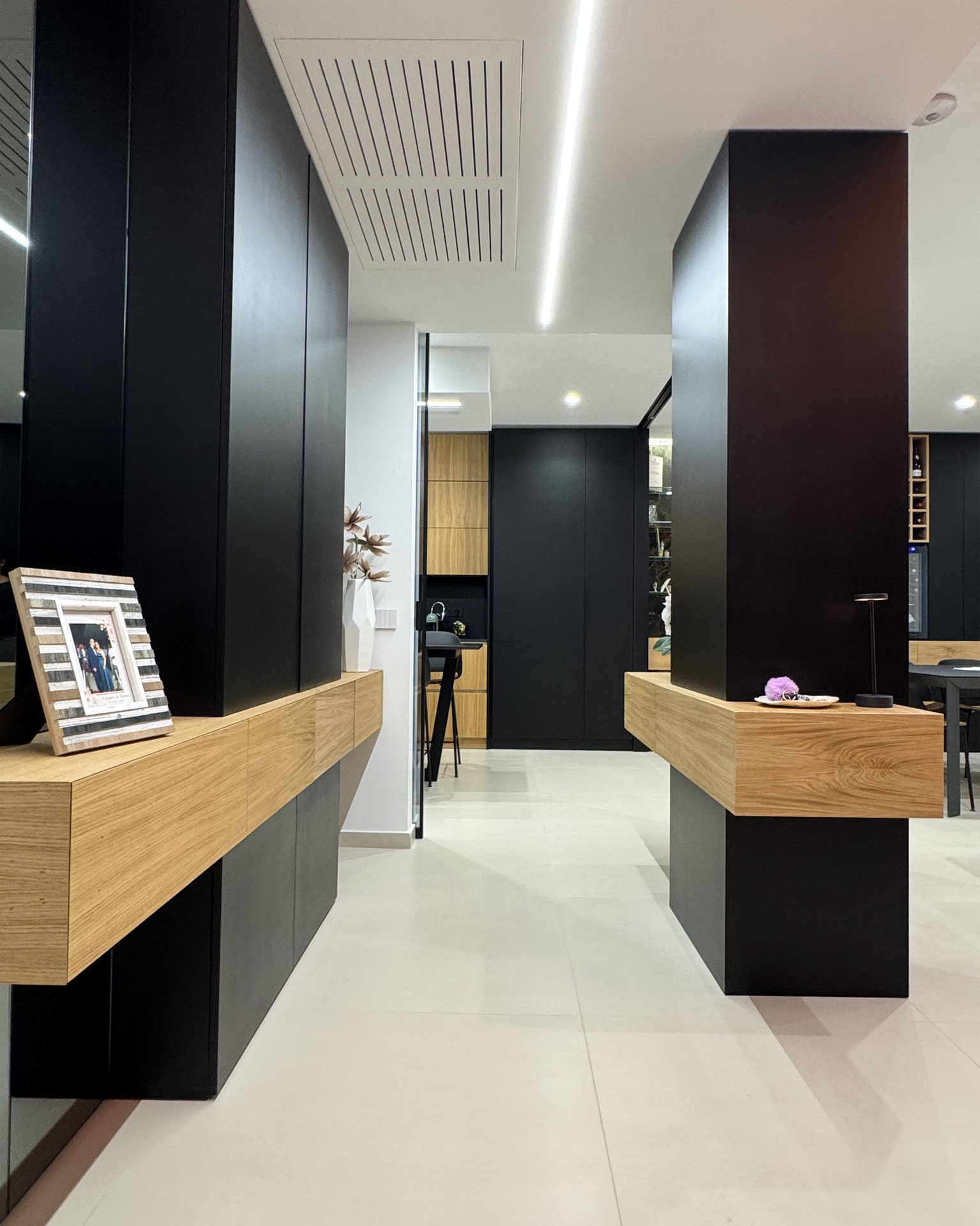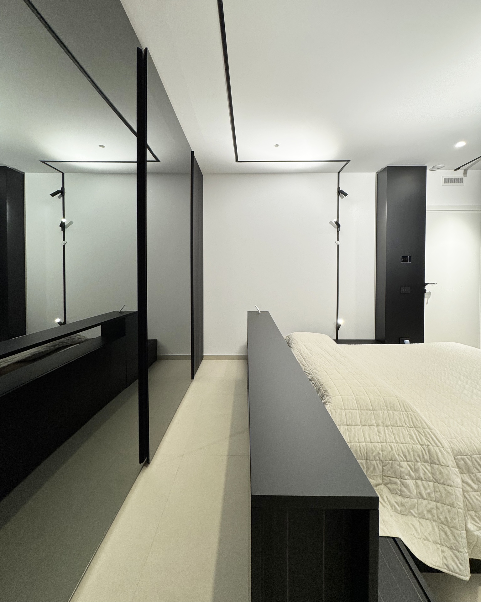 Ristrutturazione di appartamento | 120 mqIl progetto riguarda la ristrutturazione di un appartamento di circa 120 mq, situato al primo piano di una villetta a schiera di nuova costruzione. L’intervento nasce dall’esigenza dei committenti di ottenere una zona giorno ampia e flessibile, capace di trasformarsi grazie alla possibilità di separare la cucina dal living.La nuova distribuzione distingue in modo chiaro zona giorno e zona notte, separate da una porta a tutta altezza che segna il passaggio tra la dimensione pubblica e quella privata dell’abitazione.L’ingresso conduce direttamente alla zona living, concepita come un grande open space in cui convivono area relax, zona pranzo e angolo bar, affiancati da un bagno/lavanderia. La cucina, caratterizzata da un’isola centrale, è separata dalla zona giorno da porte scorrevoli in vetro fumé a tutta altezza, che garantiscono continuità visiva e, allo stesso tempo, maggiore riservatezza alla zona operativa.Tutti gli arredi sono stati progettati su misura. Elemento centrale del progetto è il mobile che ingloba il pilastro strutturale: un volume multifunzionale che funge da filtro, da mobile d’ingresso e da elemento di connessione tra gli spazi. L’angolo bar si sviluppa in continuità con la cucina; il bancone mobile consente un utilizzo flessibile dell’ambiente e integra una cantinetta per i vini.I materiali scelti comprendono rovere naturale, laccato nero opaco e rivestimenti in gres porcellanato di grande formato, utilizzati per conferire uniformità e carattere agli ambienti.La zona notte ospita una camera matrimoniale, due camerette e un bagno padronale dotato di lavabo, ampia doccia e vasca centro stanza. Nella camera matrimoniale, il letto è posizionato al centro dello spazio e integrato con il sistema di arredi, creando un ambiente raccolto e coerente.L’abitazione è dotata di impianto di riscaldamento e raffrescamento a pavimento e di un sistema elettrico domotizzato, che rende l’intero appartamento smart.