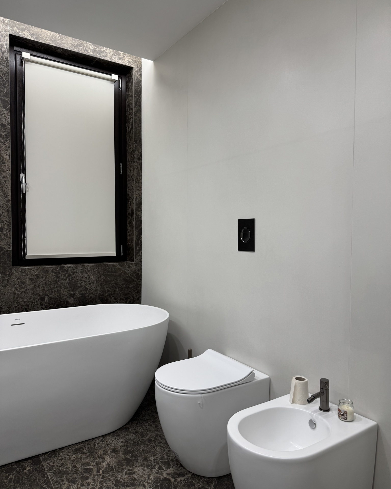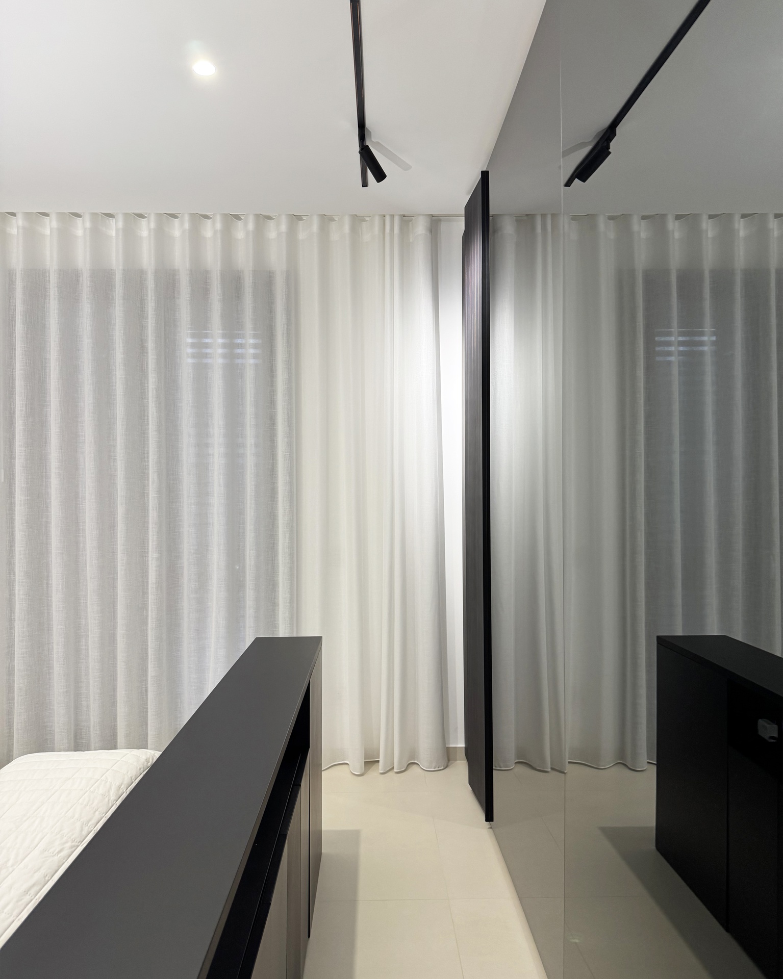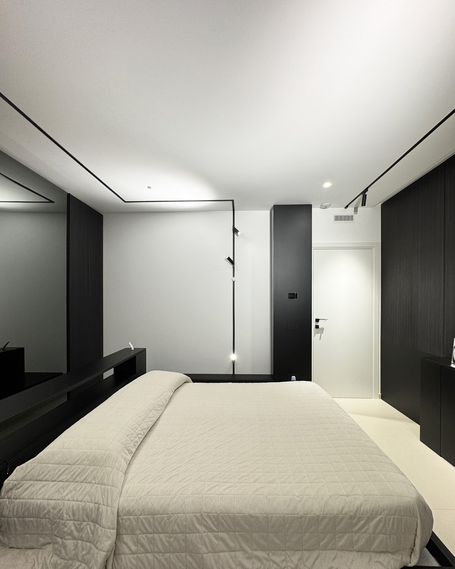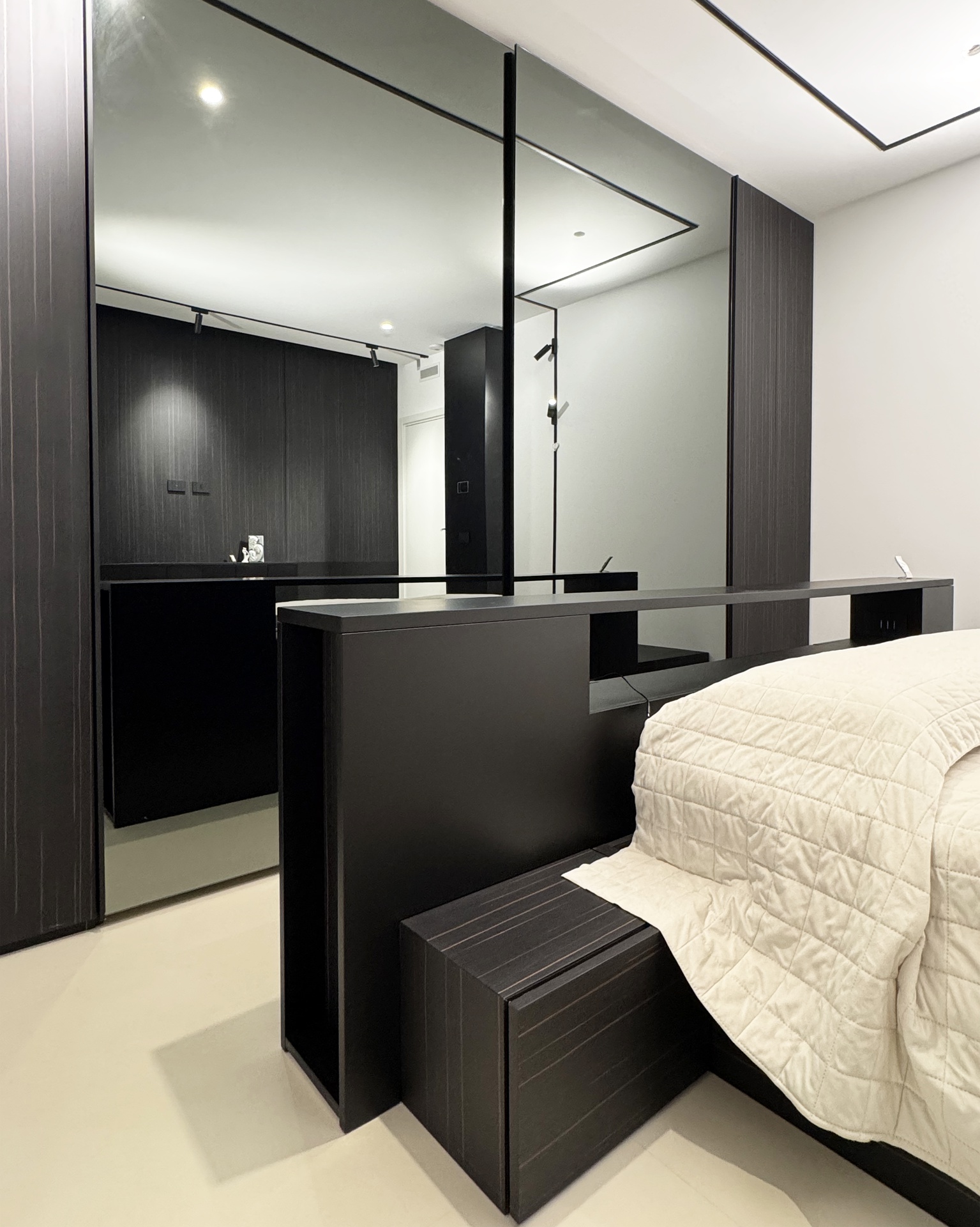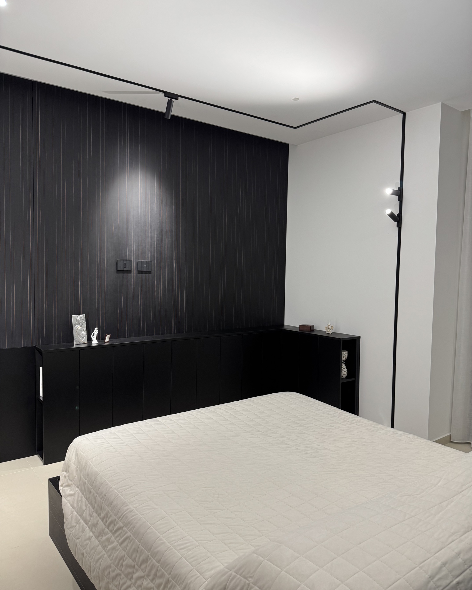 Ristrutturazione di appartamento | 120 mqIl progetto riguarda la ristrutturazione di un appartamento di circa 120 mq, situato al primo piano di una villetta a schiera di nuova costruzione. L’intervento nasce dall’esigenza dei committenti di ottenere una zona giorno ampia e flessibile, capace di trasformarsi grazie alla possibilità di separare la cucina dal living.La nuova distribuzione distingue in modo chiaro zona giorno e zona notte, separate da una porta a tutta altezza che segna il passaggio tra la dimensione pubblica e quella privata dell’abitazione.L’ingresso conduce direttamente alla zona living, concepita come un grande open space in cui convivono area relax, zona pranzo e angolo bar, affiancati da un bagno/lavanderia. La cucina, caratterizzata da un’isola centrale, è separata dalla zona giorno da porte scorrevoli in vetro fumé a tutta altezza, che garantiscono continuità visiva e, allo stesso tempo, maggiore riservatezza alla zona operativa.Tutti gli arredi sono stati progettati su misura. Elemento centrale del progetto è il mobile che ingloba il pilastro strutturale: un volume multifunzionale che funge da filtro, da mobile d’ingresso e da elemento di connessione tra gli spazi. L’angolo bar si sviluppa in continuità con la cucina; il bancone mobile consente un utilizzo flessibile dell’ambiente e integra una cantinetta per i vini.I materiali scelti comprendono rovere naturale, laccato nero opaco e rivestimenti in gres porcellanato di grande formato, utilizzati per conferire uniformità e carattere agli ambienti.La zona notte ospita una camera matrimoniale, due camerette e un bagno padronale dotato di lavabo, ampia doccia e vasca centro stanza. Nella camera matrimoniale, il letto è posizionato al centro dello spazio e integrato con il sistema di arredi, creando un ambiente raccolto e coerente.L’abitazione è dotata di impianto di riscaldamento e raffrescamento a pavimento e di un sistema elettrico domotizzato, che rende l’intero appartamento smart.