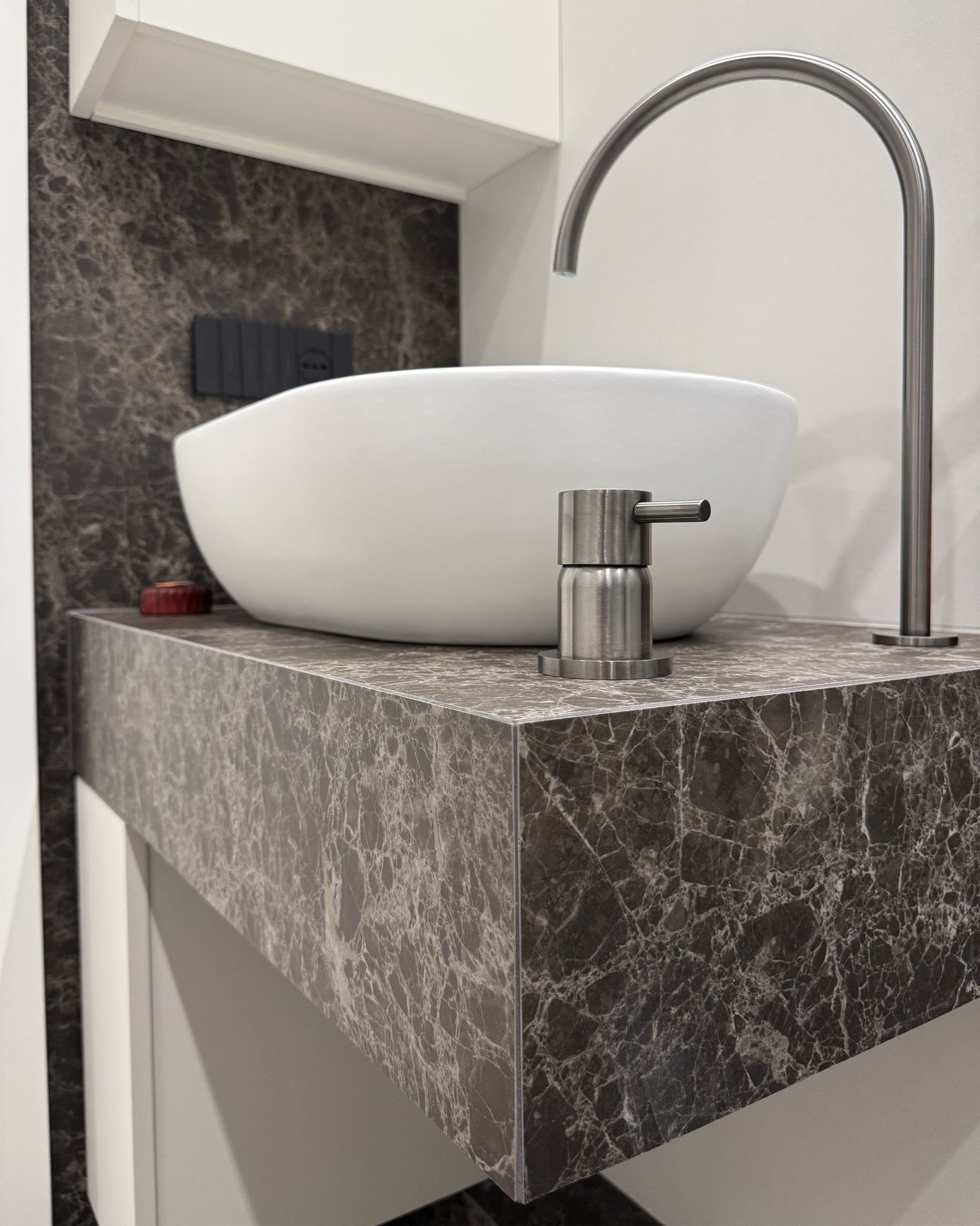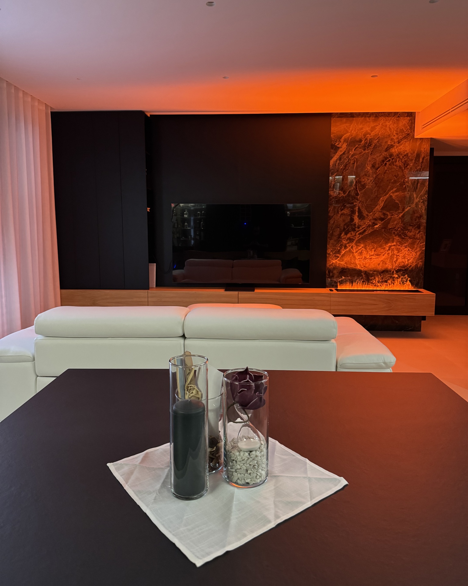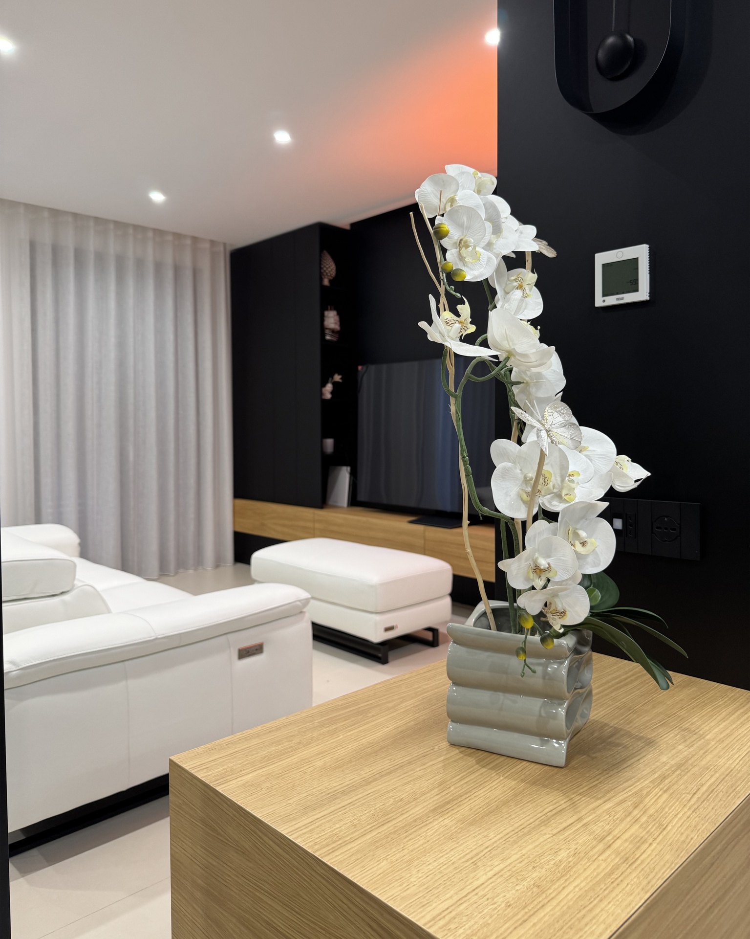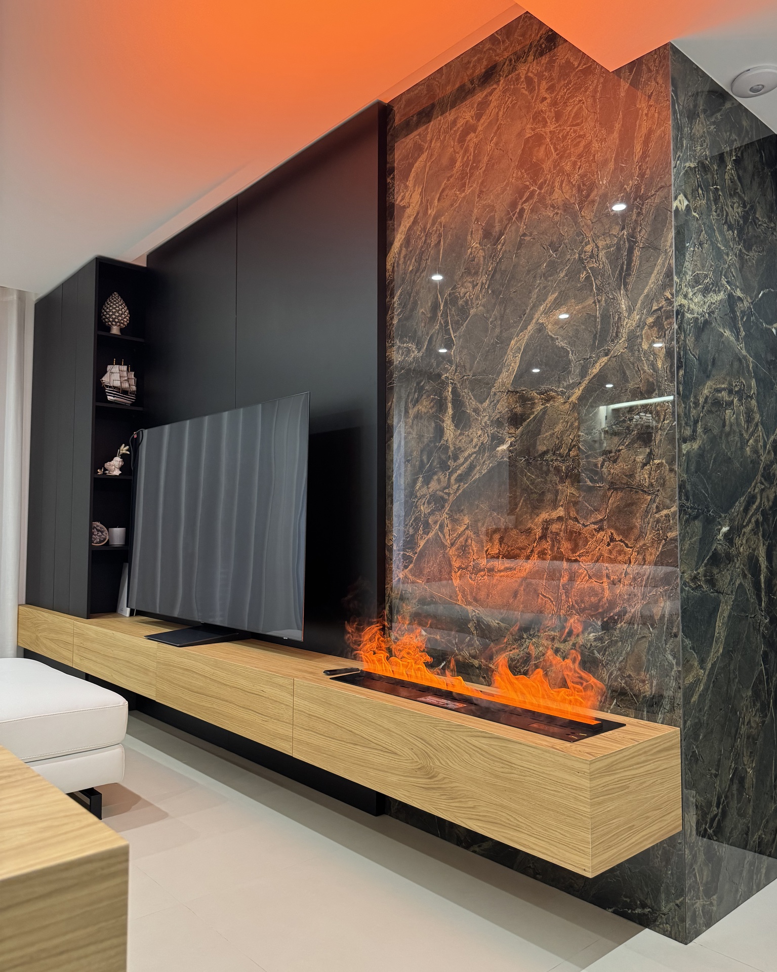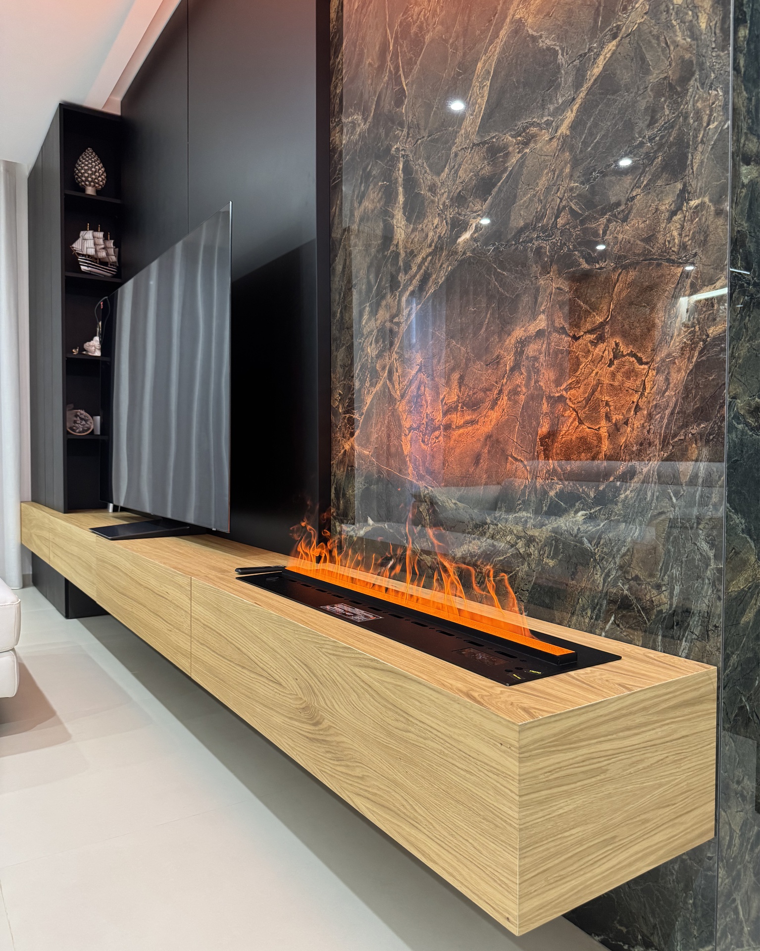 Ristrutturazione di appartamento | 120 mqIl progetto riguarda la ristrutturazione di un appartamento di circa 120 mq, situato al primo piano di una villetta a schiera di nuova costruzione. L’intervento nasce dall’esigenza dei committenti di ottenere una zona giorno ampia e flessibile, capace di trasformarsi grazie alla possibilità di separare la cucina dal living.La nuova distribuzione distingue in modo chiaro zona giorno e zona notte, separate da una porta a tutta altezza che segna il passaggio tra la dimensione pubblica e quella privata dell’abitazione.L’ingresso conduce direttamente alla zona living, concepita come un grande open space in cui convivono area relax, zona pranzo e angolo bar, affiancati da un bagno/lavanderia. La cucina, caratterizzata da un’isola centrale, è separata dalla zona giorno da porte scorrevoli in vetro fumé a tutta altezza, che garantiscono continuità visiva e, allo stesso tempo, maggiore riservatezza alla zona operativa.Tutti gli arredi sono stati progettati su misura. Elemento centrale del progetto è il mobile che ingloba il pilastro strutturale: un volume multifunzionale che funge da filtro, da mobile d’ingresso e da elemento di connessione tra gli spazi. L’angolo bar si sviluppa in continuità con la cucina; il bancone mobile consente un utilizzo flessibile dell’ambiente e integra una cantinetta per i vini.I materiali scelti comprendono rovere naturale, laccato nero opaco e rivestimenti in gres porcellanato di grande formato, utilizzati per conferire uniformità e carattere agli ambienti.La zona notte ospita una camera matrimoniale, due camerette e un bagno padronale dotato di lavabo, ampia doccia e vasca centro stanza. Nella camera matrimoniale, il letto è posizionato al centro dello spazio e integrato con il sistema di arredi, creando un ambiente raccolto e coerente.L’abitazione è dotata di impianto di riscaldamento e raffrescamento a pavimento e di un sistema elettrico domotizzato, che rende l’intero appartamento smart.