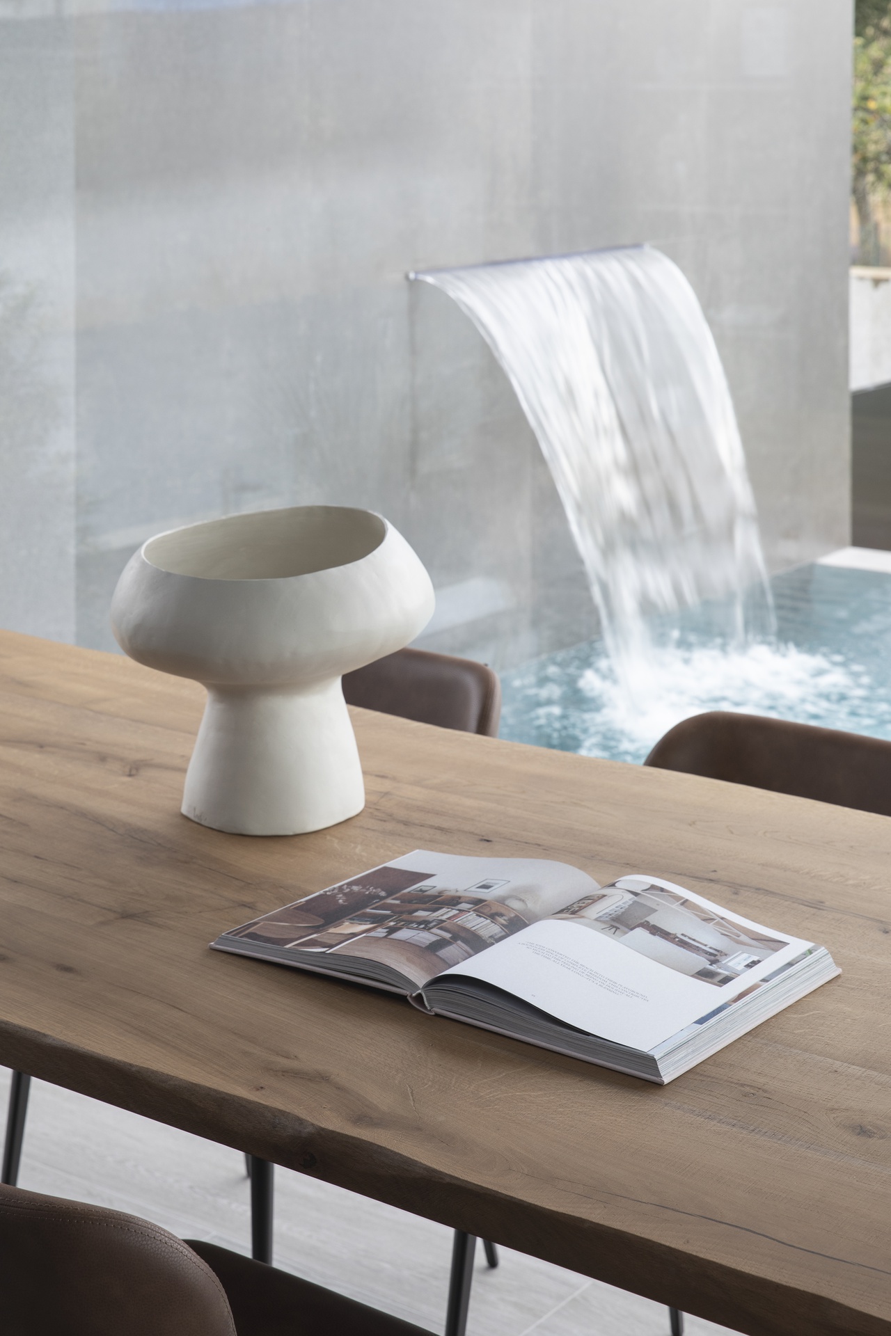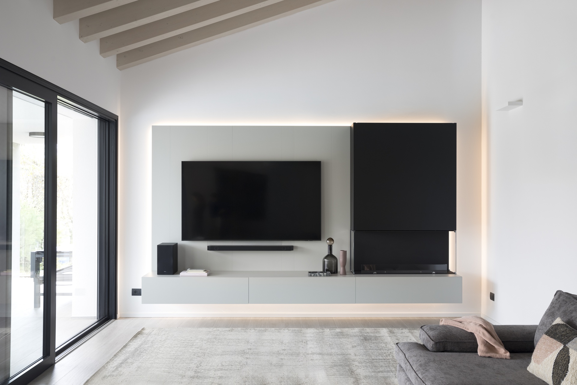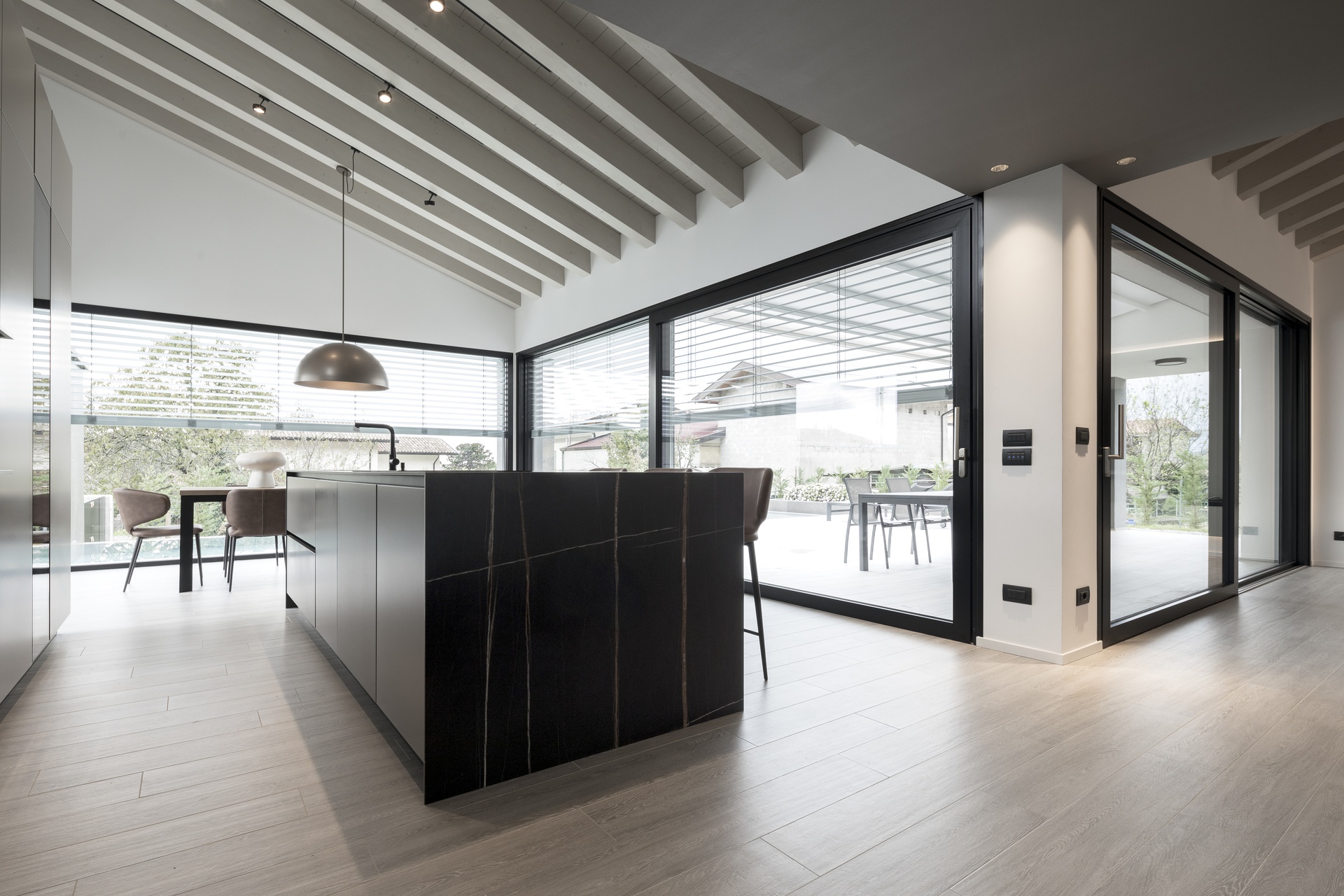 Casa SDB è caratterizzata da linee moderne e ben scandite, un gioco di volumi che contraddistingue le due zone abitative, la zona giorno con copertura inclinata metallica e la zona notte con copertura piana.Questi i tratti che caratterizzano la nuova abitazione unifamiliare disposta su un unico piano e incastrata in un terreno in pendio nelle prealpi del Friuli Venezia Giulia in provincia di Pordenone.L'intervento è costituito da una zona giorno composta da ingresso, ampia cucina, soggiorno, un unico ampio open-space completamente vetrato che si affaccia sull’ampio terrazzo esterno copribile parzialmente all’occorrenza e la lunga piscina a sfioro in testa all'edificio; il camino monolitico esterno che svetta sulla copertura crea una quinta tra l’ampio solarium e l’abitazione stessa.La zona notte è composta dal disimpegno che separa la zona padronale costituita da cabina armadio, camera e bagno, dalle camere secondarie servite da un secondo bagno; due ampi e vetrate si affacciano in una corte interna che funge da elemento di snodo fra i vari ambienti; completano il tutto un locale lavanderia, una centrale termica ed un ampio porticato sul retro dell’abitazione ad uso autorimessa.L’edificio è stato realizzato in struttura in cemento armato, con elementi verticali quali setti e orizzontamenti in soletta monolitica. Le pareti divisorie sono in struttura metallica finita con pannelli di cartongesso, mentre perimetralmente è stata realizzata una controparete interna con strato isolante e completato esternamente con cappotto. I serramenti esterni sono in alluminio con vetrocamera dotati di tapparelle elettrificate. La copertura lignea decapata della zona giorno lascia percepire la maestosità dei volumi illuminati naturalmente dal riflesso dei raggi solari che si riflettono sullo specchio d’acqua; la finitura esterna è realizzata con manto in lamiera aggraffata sulla parte inclinata e ghiaino sulle parti piane; le grondaie e i pluvali sono in lamiera preverniciata colore antracite.