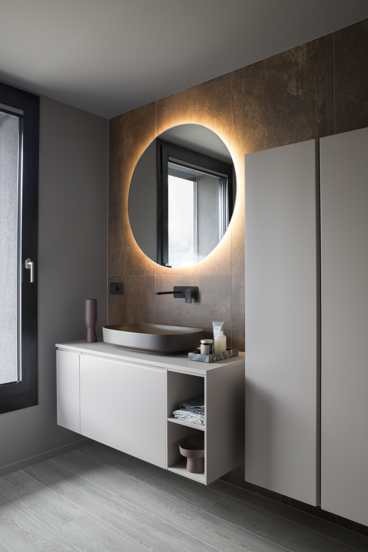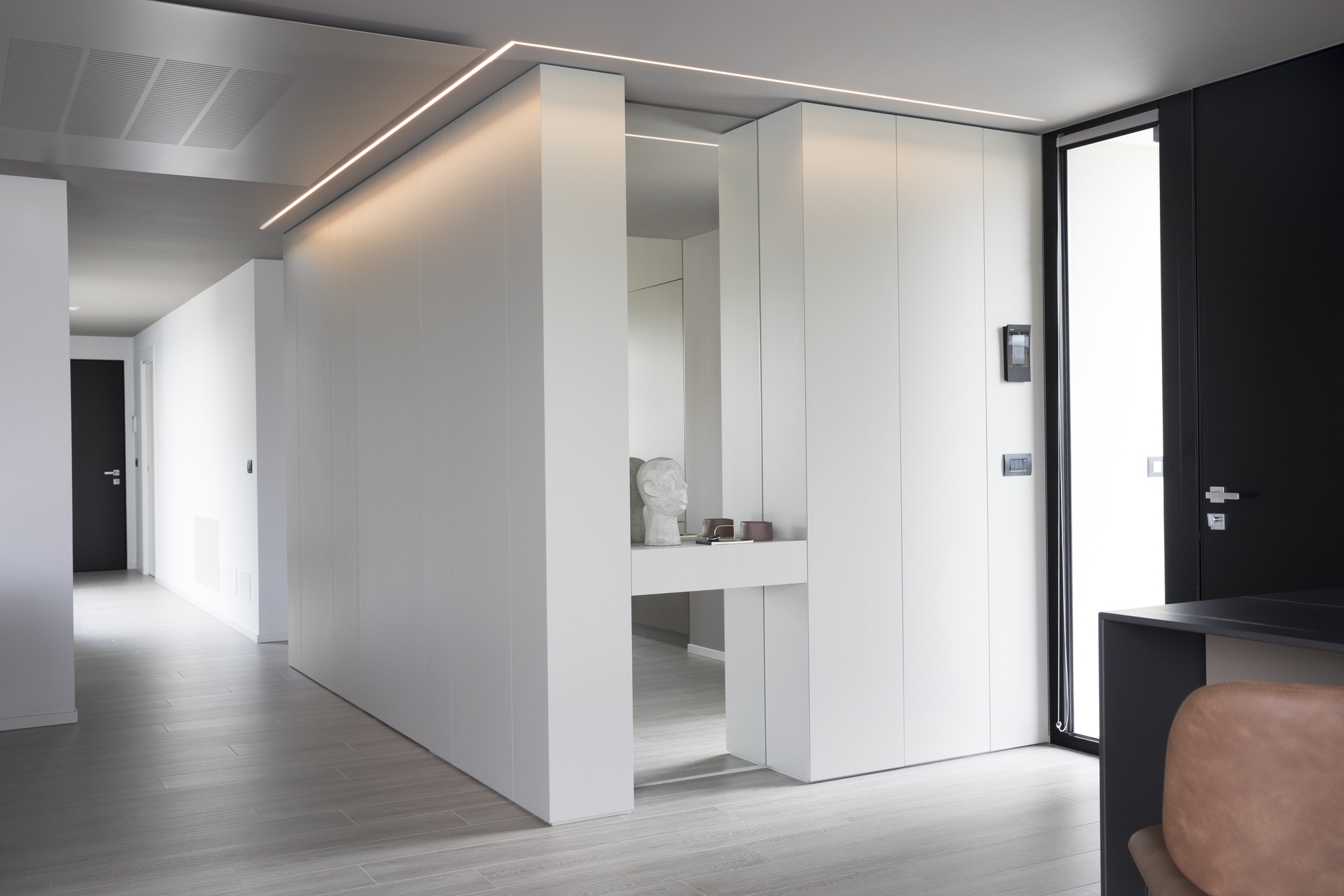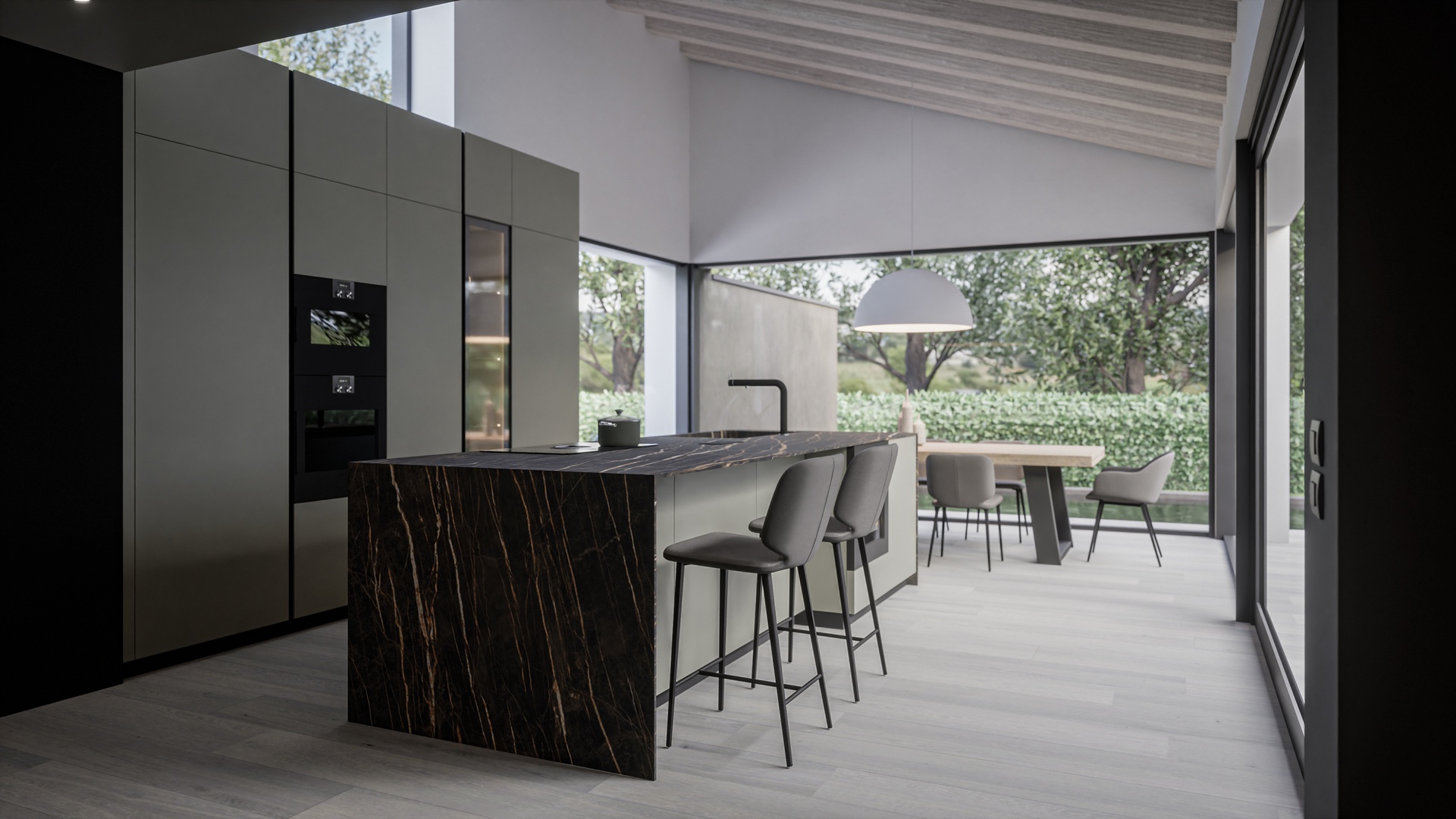 Casa SDB è caratterizzata da linee moderne e ben scandite, un gioco di volumi che contraddistingue le due zone abitative, la zona giorno con copertura inclinata metallica e la zona notte con copertura piana.Questi i tratti che caratterizzano la nuova abitazione unifamiliare disposta su un unico piano e incastrata in un terreno in pendio nelle prealpi del Friuli Venezia Giulia in provincia di Pordenone.L'intervento è costituito da una zona giorno composta da ingresso, ampia cucina, soggiorno, un unico ampio open-space completamente vetrato che si affaccia sull’ampio terrazzo esterno copribile parzialmente all’occorrenza e la lunga piscina a sfioro in testa all'edificio; il camino monolitico esterno che svetta sulla copertura crea una quinta tra l’ampio solarium e l’abitazione stessa.La zona notte è composta dal disimpegno che separa la zona padronale costituita da cabina armadio, camera e bagno, dalle camere secondarie servite da un secondo bagno; due ampi e vetrate si affacciano in una corte interna che funge da elemento di snodo fra i vari ambienti; completano il tutto un locale lavanderia, una centrale termica ed un ampio porticato sul retro dell’abitazione ad uso autorimessa.L’edificio è stato realizzato in struttura in cemento armato, con elementi verticali quali setti e orizzontamenti in soletta monolitica. Le pareti divisorie sono in struttura metallica finita con pannelli di cartongesso, mentre perimetralmente è stata realizzata una controparete interna con strato isolante e completato esternamente con cappotto. I serramenti esterni sono in alluminio con vetrocamera dotati di tapparelle elettrificate. La copertura lignea decapata della zona giorno lascia percepire la maestosità dei volumi illuminati naturalmente dal riflesso dei raggi solari che si riflettono sullo specchio d’acqua; la finitura esterna è realizzata con manto in lamiera aggraffata sulla parte inclinata e ghiaino sulle parti piane; le grondaie e i pluvali sono in lamiera preverniciata colore antracite.