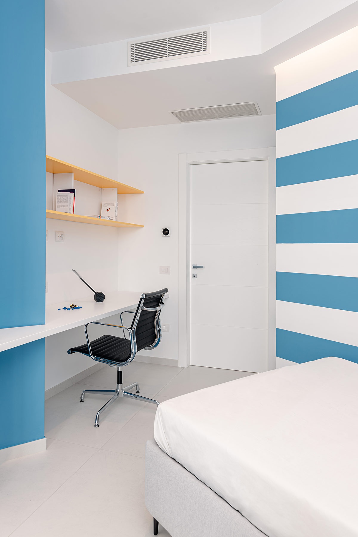 Ristrutturazione di un appartamento panoramicissimo a Monte di Procida, affacciato sulle isole del golfo e sulla Marina di Acquamorta.Appena varcata la soglia d’ingresso si apprezza tutto lo spazio giorno nella sua interezza.Luminosità e freschezza.Due grandi vetrate affacciano sullo splendido panorama delle isole di Procida e Ischia e più in basso del porto di Acquamorta.Lo spazio prevalentemente bianco viene arricchito da elementi blu, dettagli neri e legno di rovere e alcuni accenti giallo limone come le piastrelle decorative della zona cucina.Superato l’ingresso sulla destra si protende una grande penisola cucina completamente bianca con alle spalle le colonne contenitori. La cucina come tutti gli arredi fissi sono realizzati su misura su disegno esclusivo dello studio manuarino.La zona notte, costituita da camera matrimoniale con cabina armadio e camera singola, riprende la forte connotazione mediterranea nelle decorazioni a strisce orizzontali alternate, in camera master la parete verde acqua di listelli di legno diventa anche comodino, in camera singola le linee sono dipinte direttamente a muro.I due bagni sono rivestiti dello stesso Gres del pavimento ad eccezione di una parete decorativa fatta di piastrelle dal gusto quasi marocchino, lucide e dai colori sgargianti, riprendono ancora una volta colori ed atmosfere mediterranee rivisitandole in chiave contemporanea.