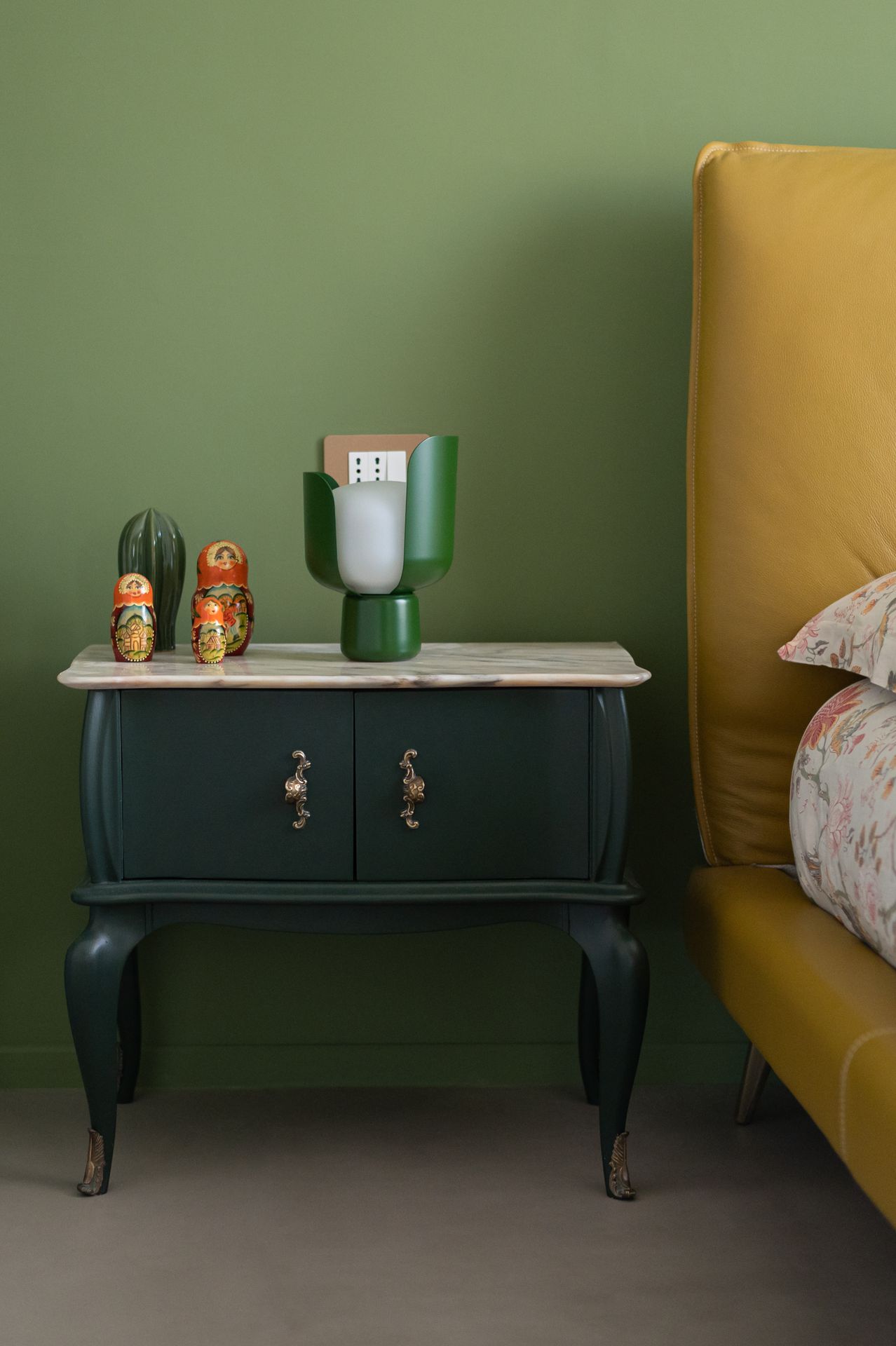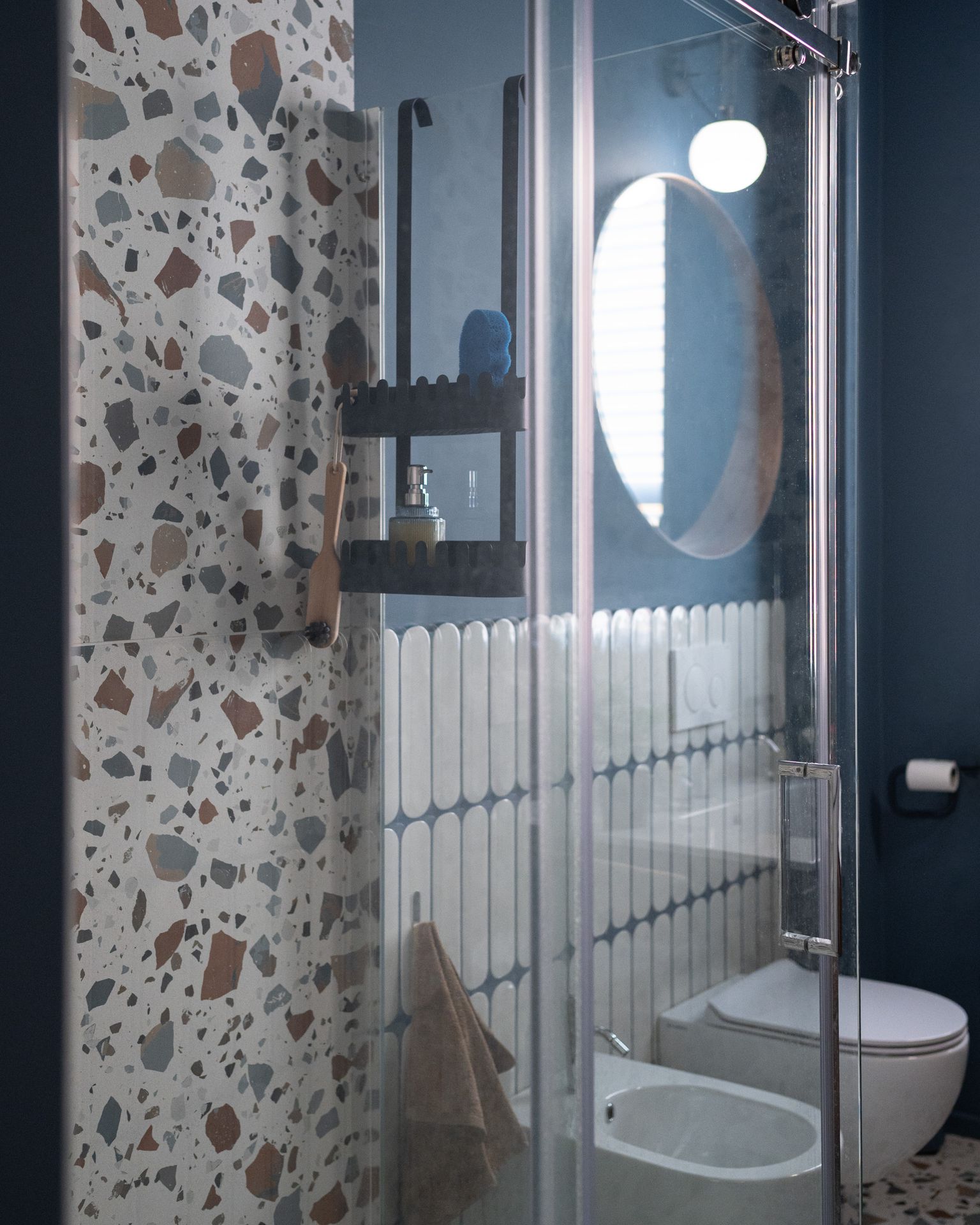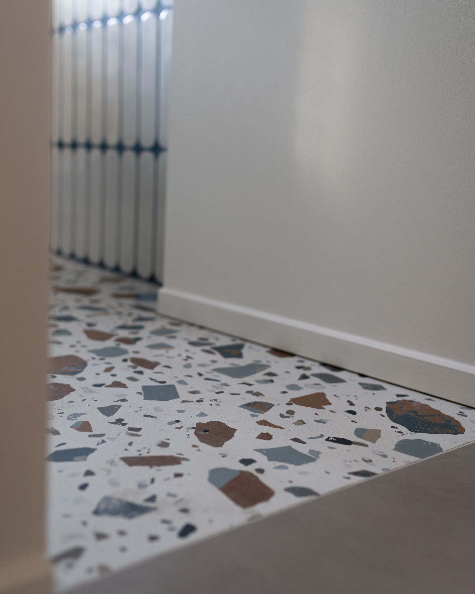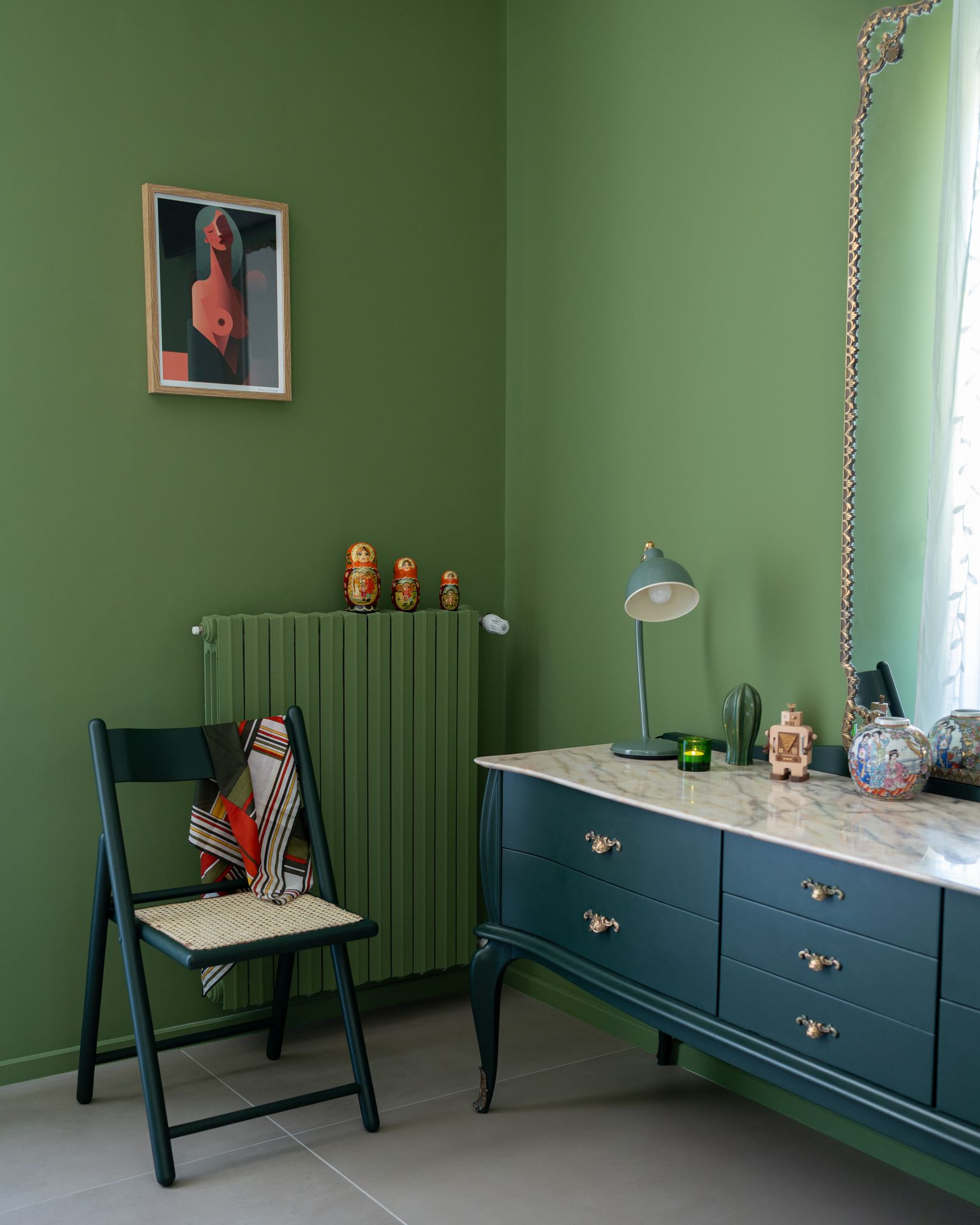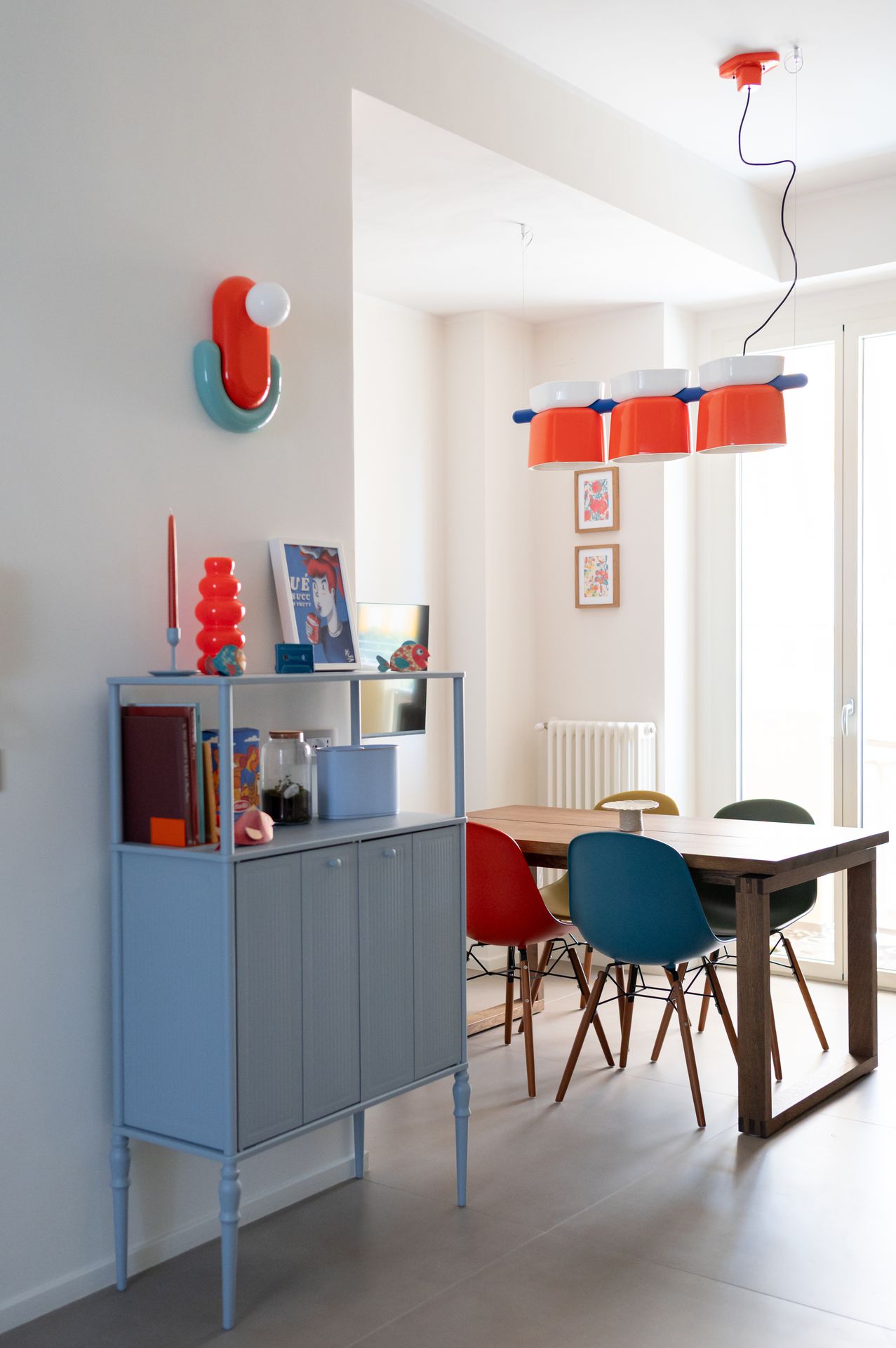 Un progetto che nasce dalla trasformazione della zona giorno in un unico spazio aperto, capace di ottimizzare gli ambienti e portare nuova luce in tutta la casa.La palette si muove in equilibrio tra tonalità neutre e cromie più vivaci: il calore del legno e delle piastrelle Mutina si mescola alle colorazioni pop delle lampade Ferroluce, mentre nella zona notte il verde diventa protagonista, facendo da sfondo a un mix armonioso di arredi d’epoca ed elementi contemporanei.In bagno, le superfici materiche del Deconcrete di Sant’Agostino, insieme alle piastrelle decorative di Wow Design e ai toni del blu, creano un’atmosfera armonica e ricercata.Una casa che rispecchia pienamente la personalità di chi la abita.