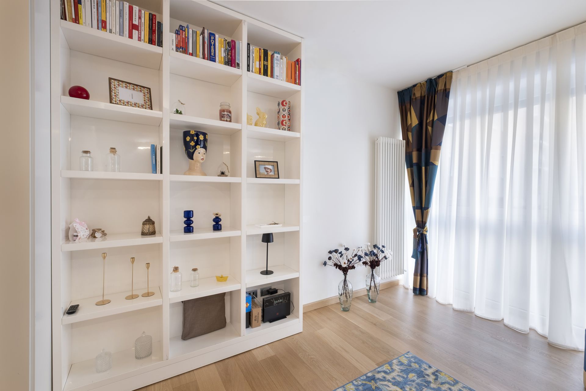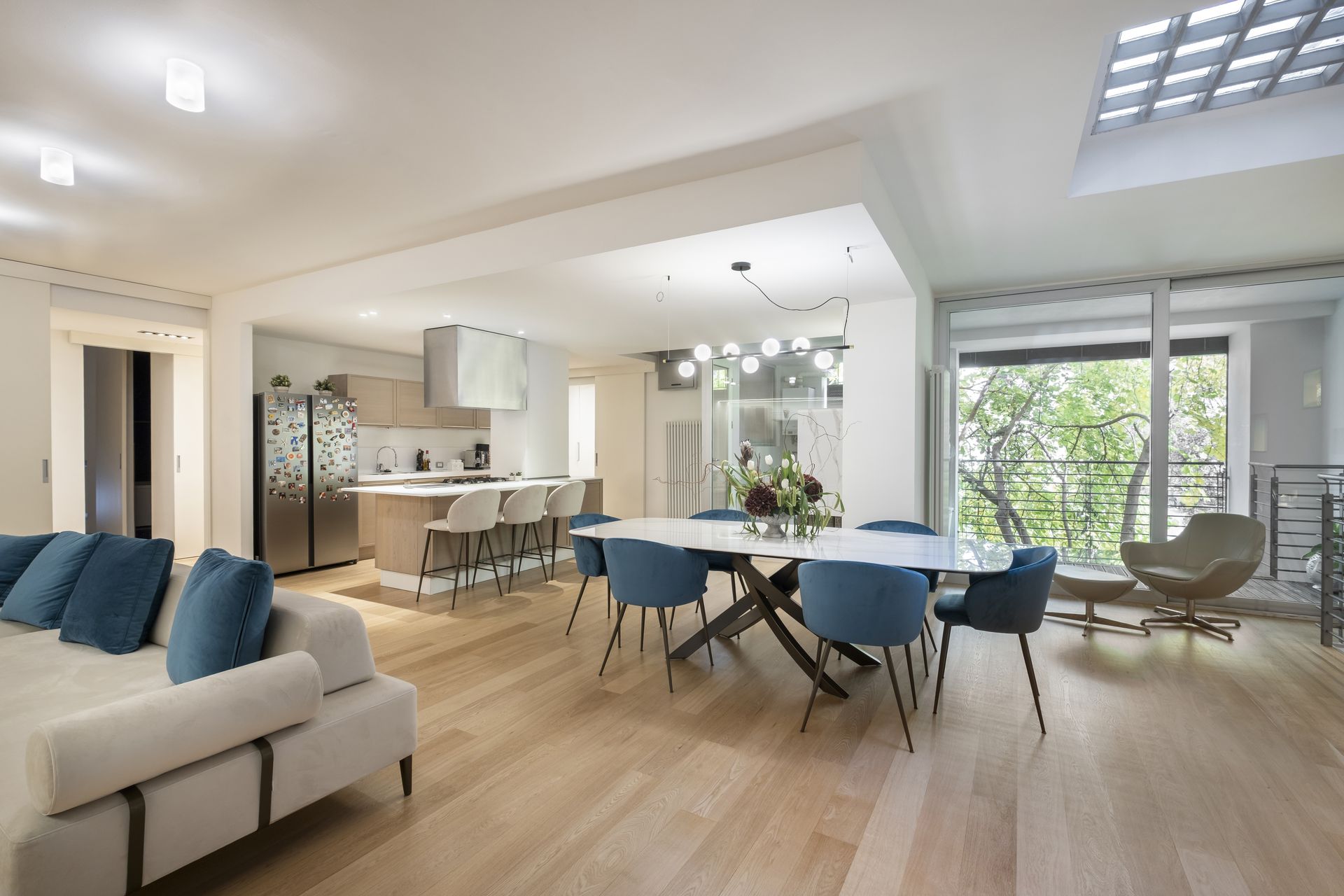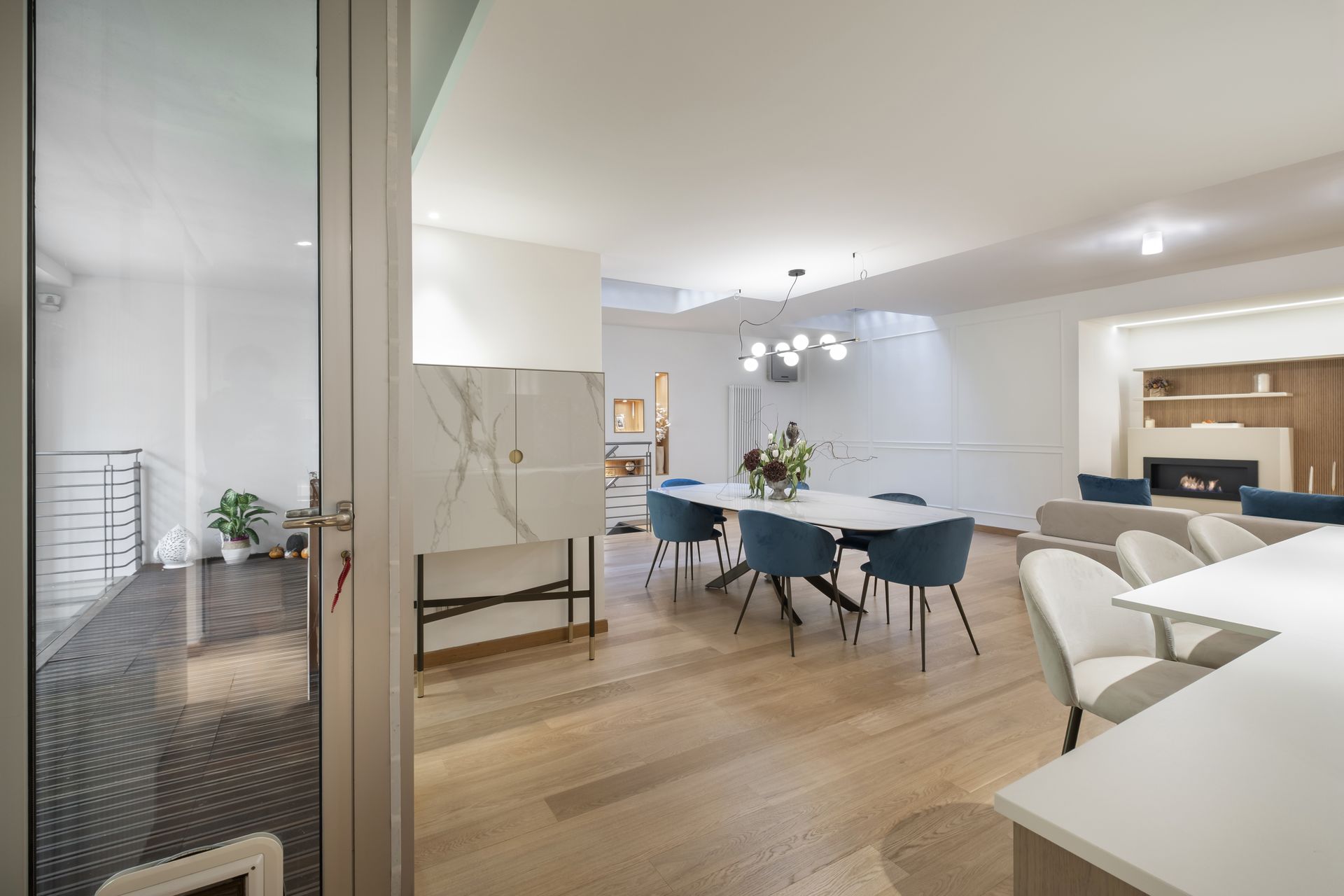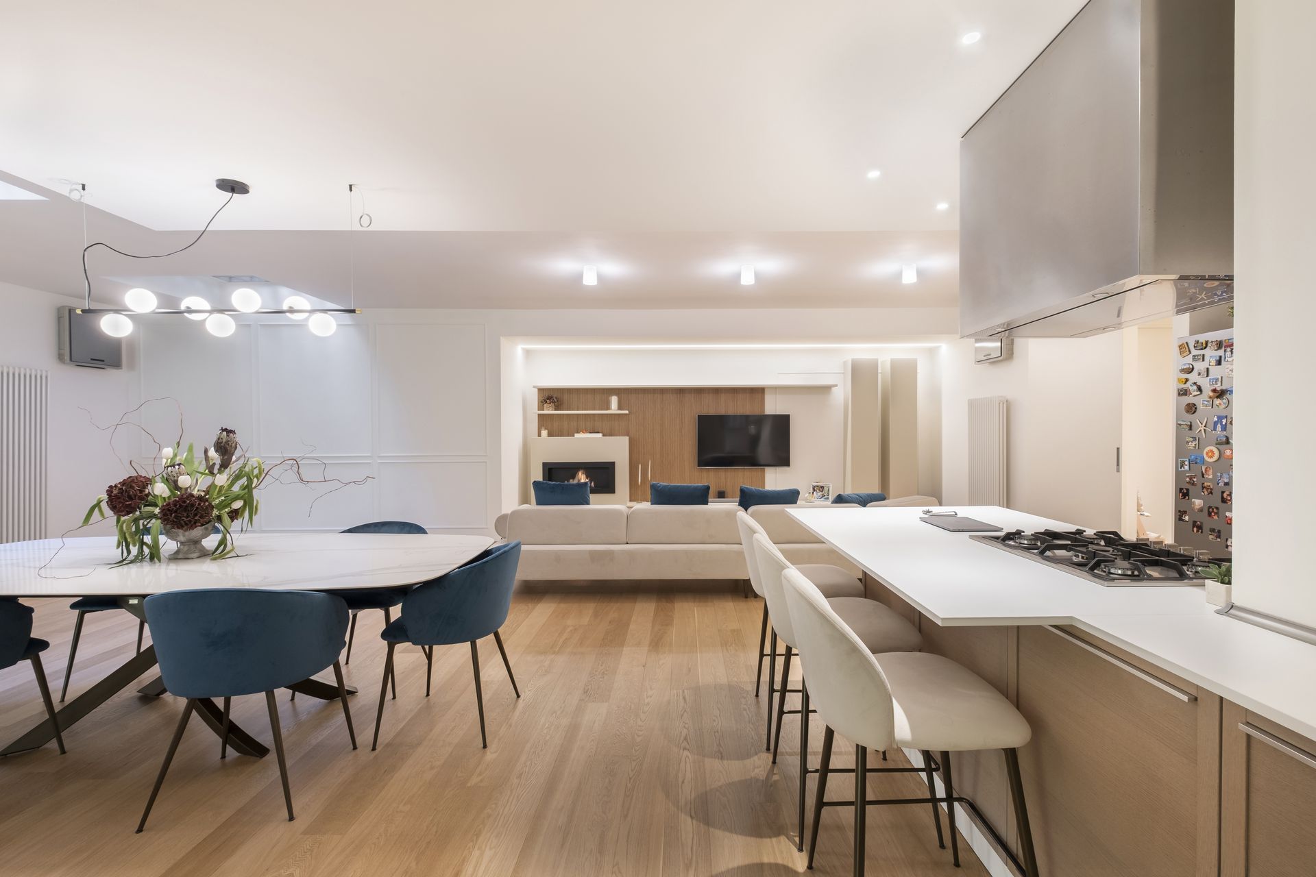 Poche ma fondamentali modifiche di layout e un restyling totale hanno dato vita ad un appartamento unico, dove il classico ed il contemporaneo si incontrano con equilibrio ed armonia. Finiture rinnovate, nuovi colori ed arredi su misura creano un "fil rouge" tra i vari ambienti, ciascuno con la sua connotazione ed eleganza.Tutti gli spazi risultano più ampi e luminosi, pronti ad accogliere la giovane famiglia.