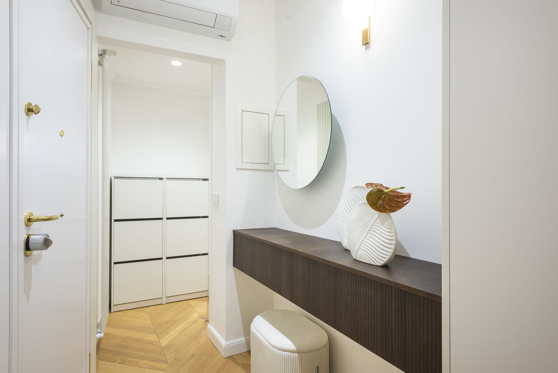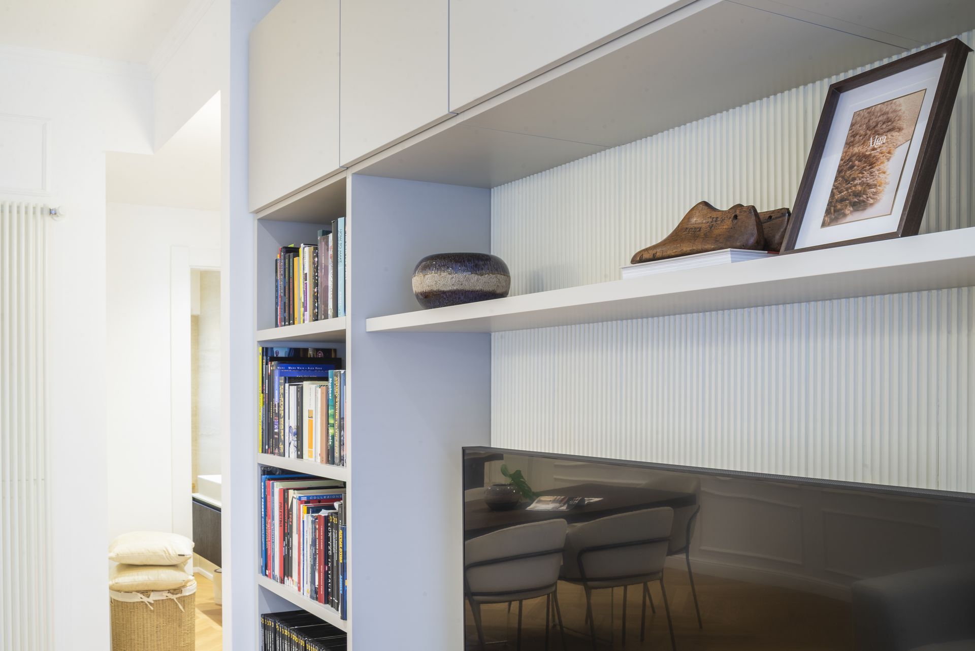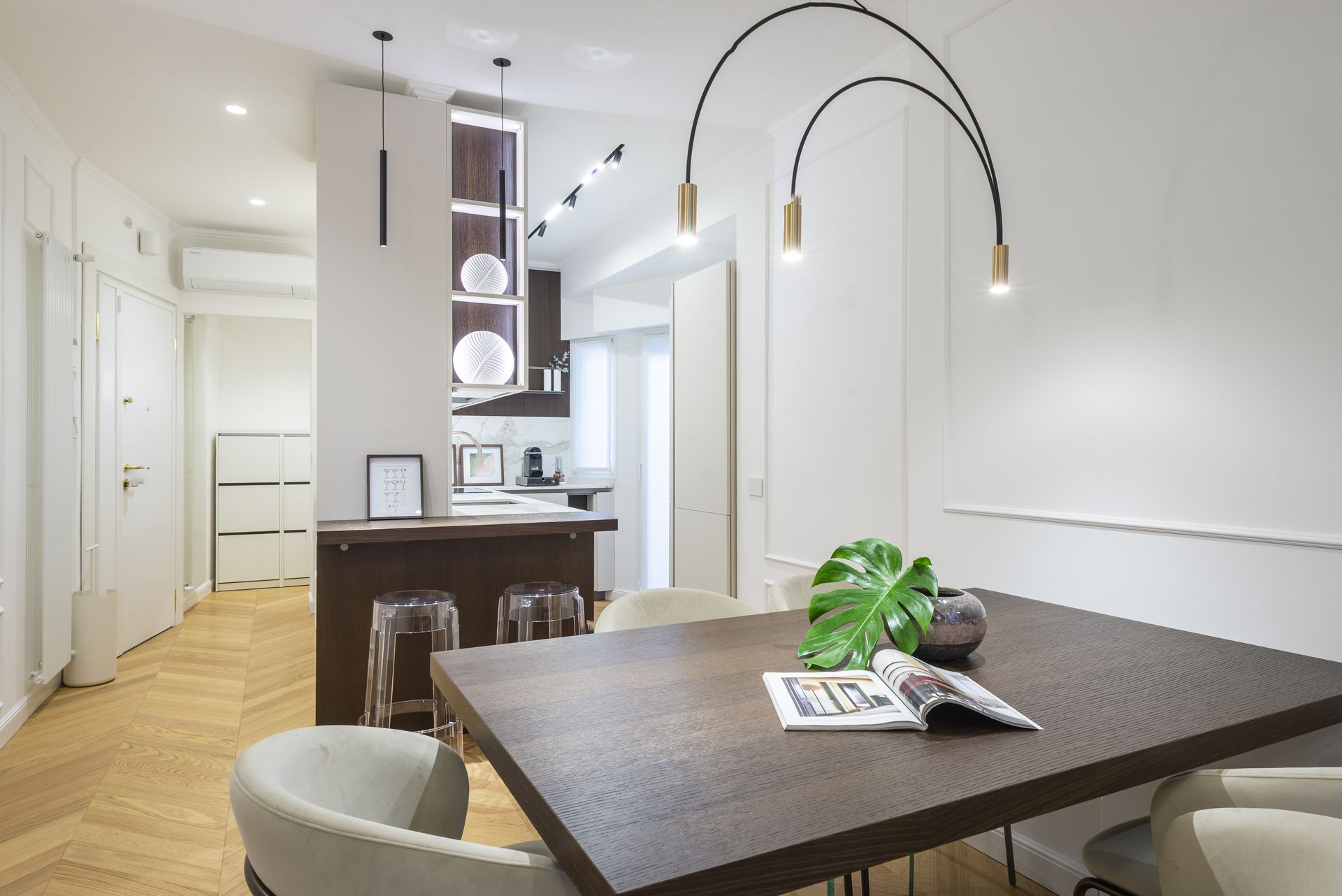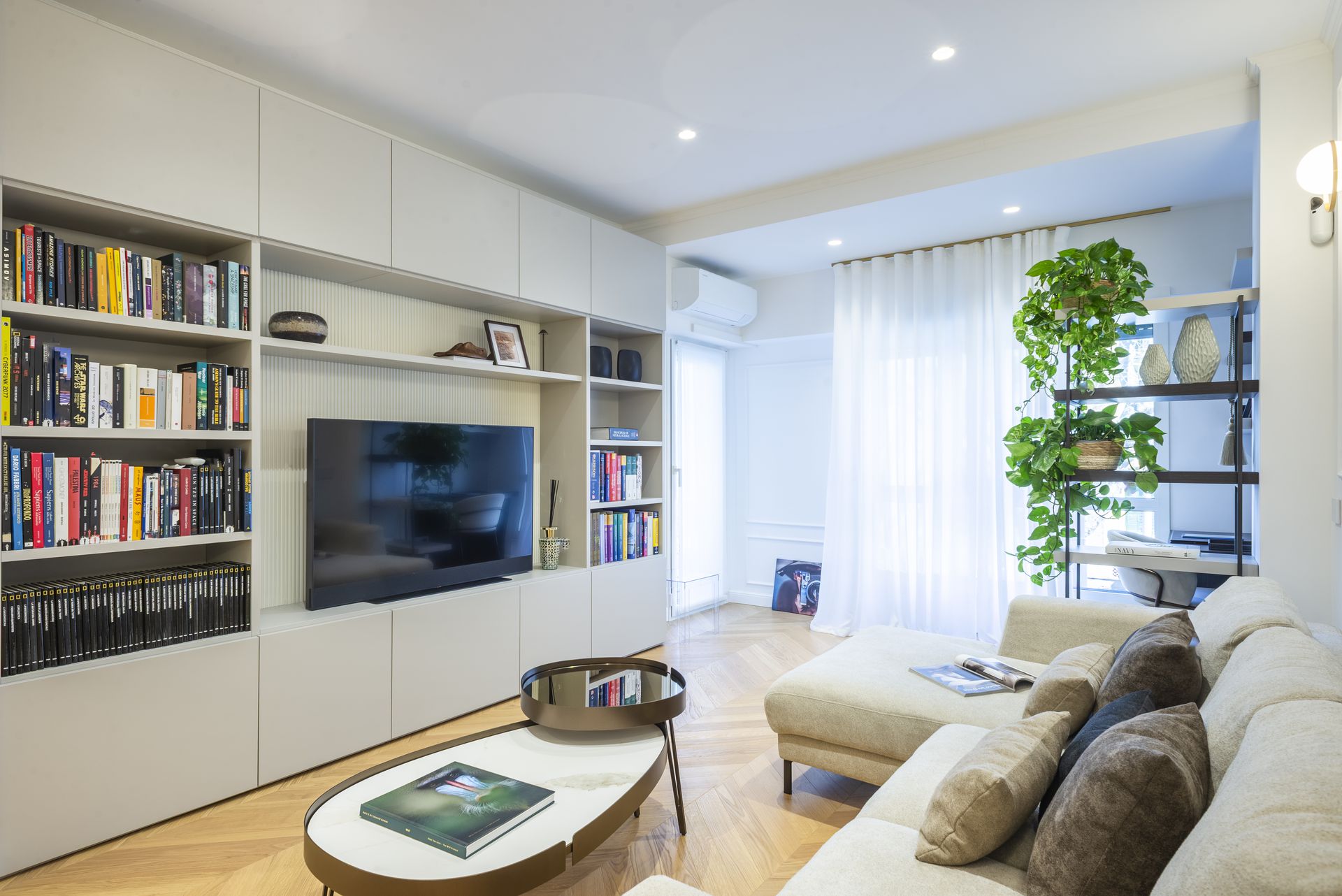 Casa Violetta è un progetto di ristrutturazione di circa 90 mq, nato con l’obiettivo di ottimizzare gli spazi e renderli fluidi, luminosi e perfettamente aderenti alle abitudini di chi vive la casa.L’ingresso è stato concepito come un corridoio attrezzato, non solo spazio di passaggio ma vero elemento funzionale dell’abitazione: una cappottiera su misura, un grande specchio e un’area svuotatasche costruiscono un ambiente ordinato, accogliente e immediatamente leggibile.Il cuore della casa è la zona giorno, progettata come uno spazio unico e continuo, in cui le diverse funzioni dialogano in modo naturale. La cucina a L, compatta ma altamente funzionale, è affiancata da un bancone snack e si relaziona direttamente con il tavolo da pranzo, dando forma a un ambiente equilibrato tra operatività e convivialità.Il living si sviluppa lungo la parete finestrata, con un divano ampio e una disposizione studiata per valorizzare al massimo la luce naturale. In questo affaccio trova posto anche uno degli elementi chiave del progetto: un angolo home office, discreto ma strategico, pensato per offrire una postazione di lavoro luminosa senza interrompere la continuità visiva della zona giorno.La distribuzione interna accompagna poi verso la zona notte, composta da una camera matrimoniale, una cameretta e due bagni. Il bagno di servizio, a ridosso della zona giorno, è compatto e funzionale; il bagno padronale, invece, è stato immaginato come uno spazio più ampio e confortevole, completo di doccia e arredi contenitivi integrati.Elemento centrale del progetto è la capacità di trasformare ogni metro quadro in spazio utile, evitando sprechi e valorizzando anche le geometrie irregolari dell’appartamento, che diventano opportunità progettuali anziché limiti.