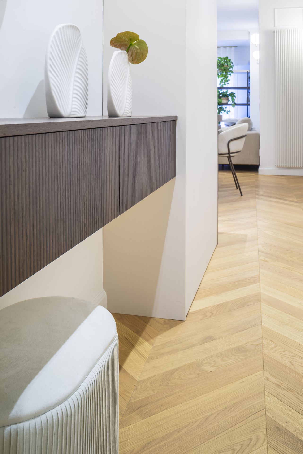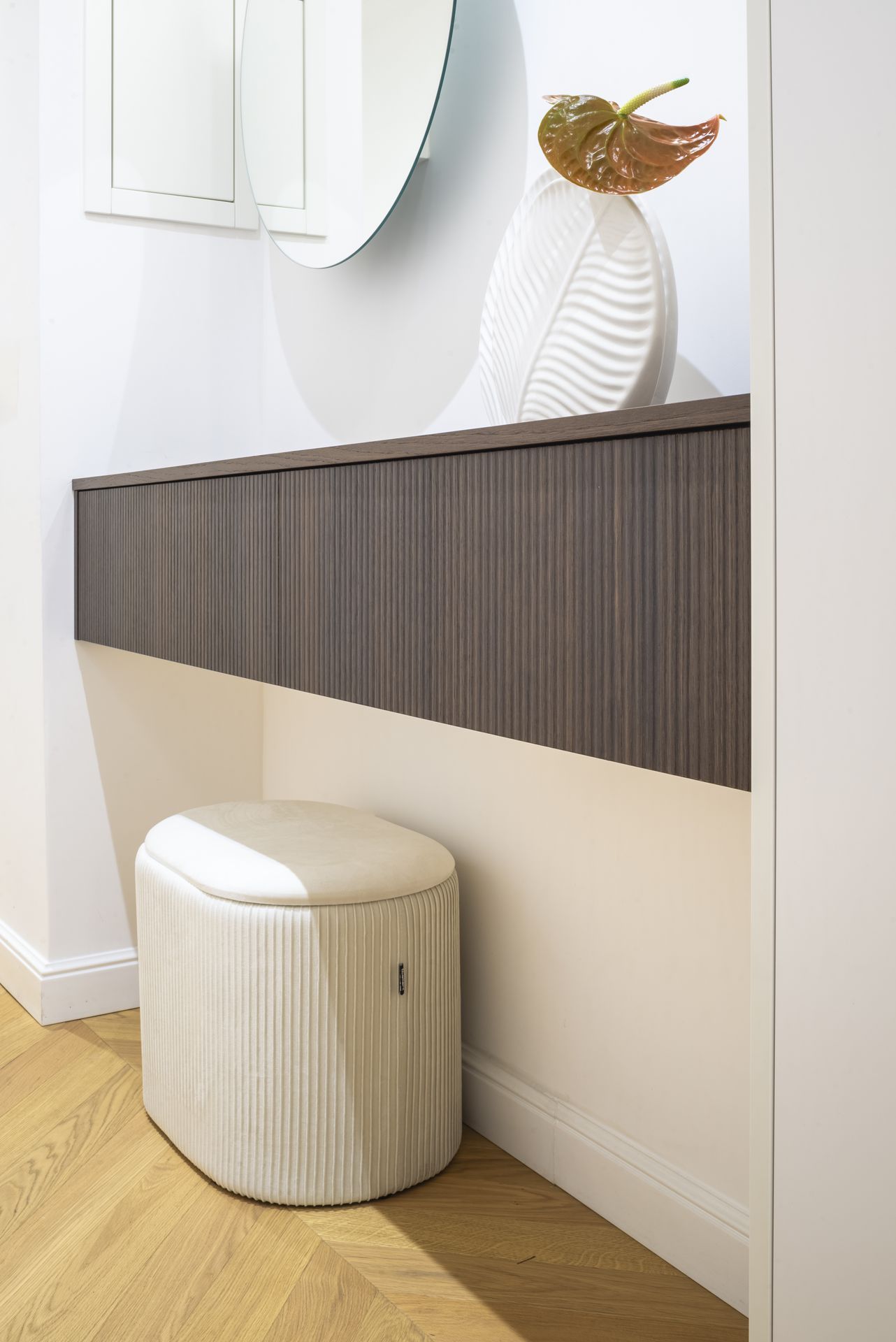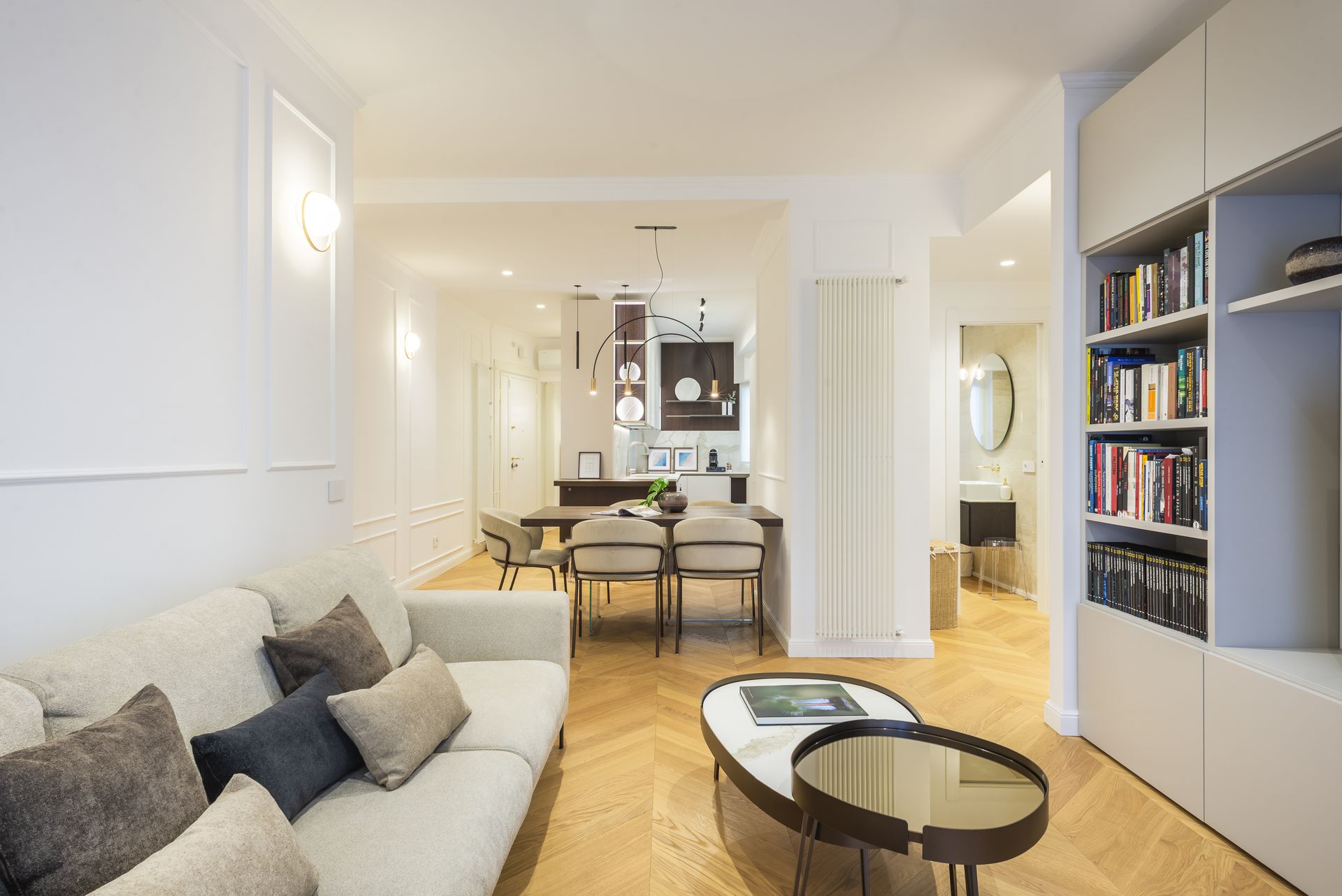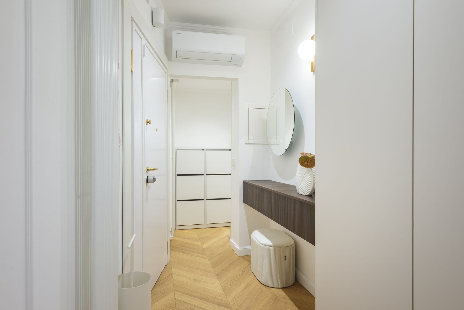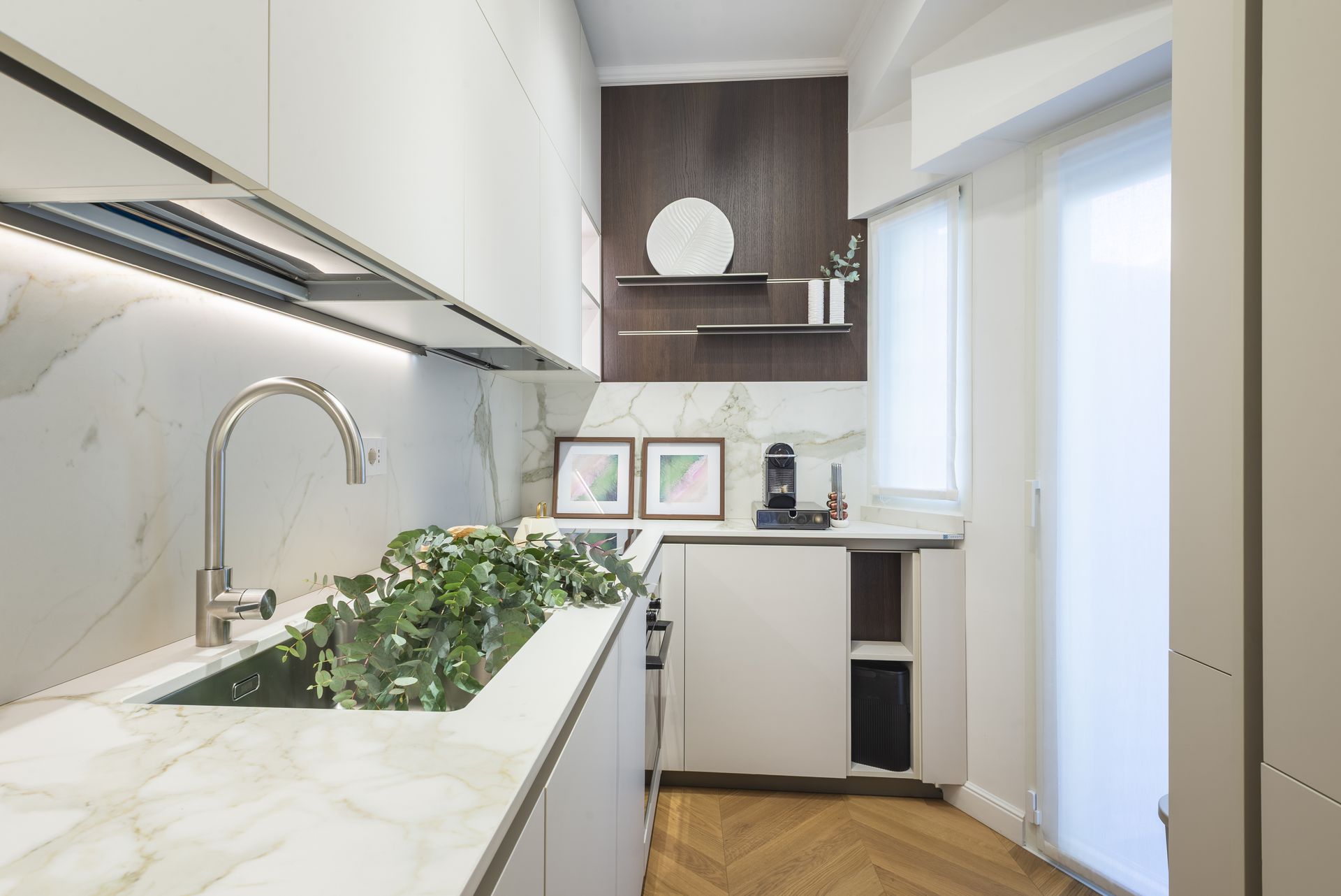Casa Violetta è un progetto di ristrutturazione di circa 90 mq, nato con l’obiettivo di ottimizzare gli spazi e renderli fluidi, luminosi e perfettamente aderenti alle abitudini di chi vive la casa.L’ingresso è stato concepito come un corridoio attrezzato, non solo spazio di passaggio ma vero elemento funzionale dell’abitazione: una cappottiera su misura, un grande specchio e un’area svuotatasche costruiscono un ambiente ordinato, accogliente e immediatamente leggibile.Il cuore della casa è la zona giorno, progettata come uno spazio unico e continuo, in cui le diverse funzioni dialogano in modo naturale. La cucina a L, compatta ma altamente funzionale, è affiancata da un bancone snack e si relaziona direttamente con il tavolo da pranzo, dando forma a un ambiente equilibrato tra operatività e convivialità.Il living si sviluppa lungo la parete finestrata, con un divano ampio e una disposizione studiata per valorizzare al massimo la luce naturale. In questo affaccio trova posto anche uno degli elementi chiave del progetto: un angolo home office, discreto ma strategico, pensato per offrire una postazione di lavoro luminosa senza interrompere la continuità visiva della zona giorno.La distribuzione interna accompagna poi verso la zona notte, composta da una camera matrimoniale, una cameretta e due bagni. Il bagno di servizio, a ridosso della zona giorno, è compatto e funzionale; il bagno padronale, invece, è stato immaginato come uno spazio più ampio e confortevole, completo di doccia e arredi contenitivi integrati.Elemento centrale del progetto è la capacità di trasformare ogni metro quadro in spazio utile, evitando sprechi e valorizzando anche le geometrie irregolari dell’appartamento, che diventano opportunità progettuali anziché limiti.
