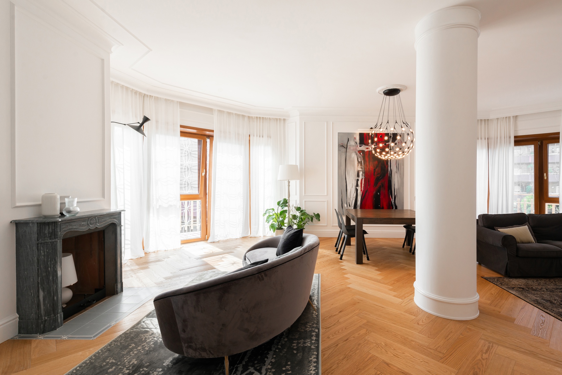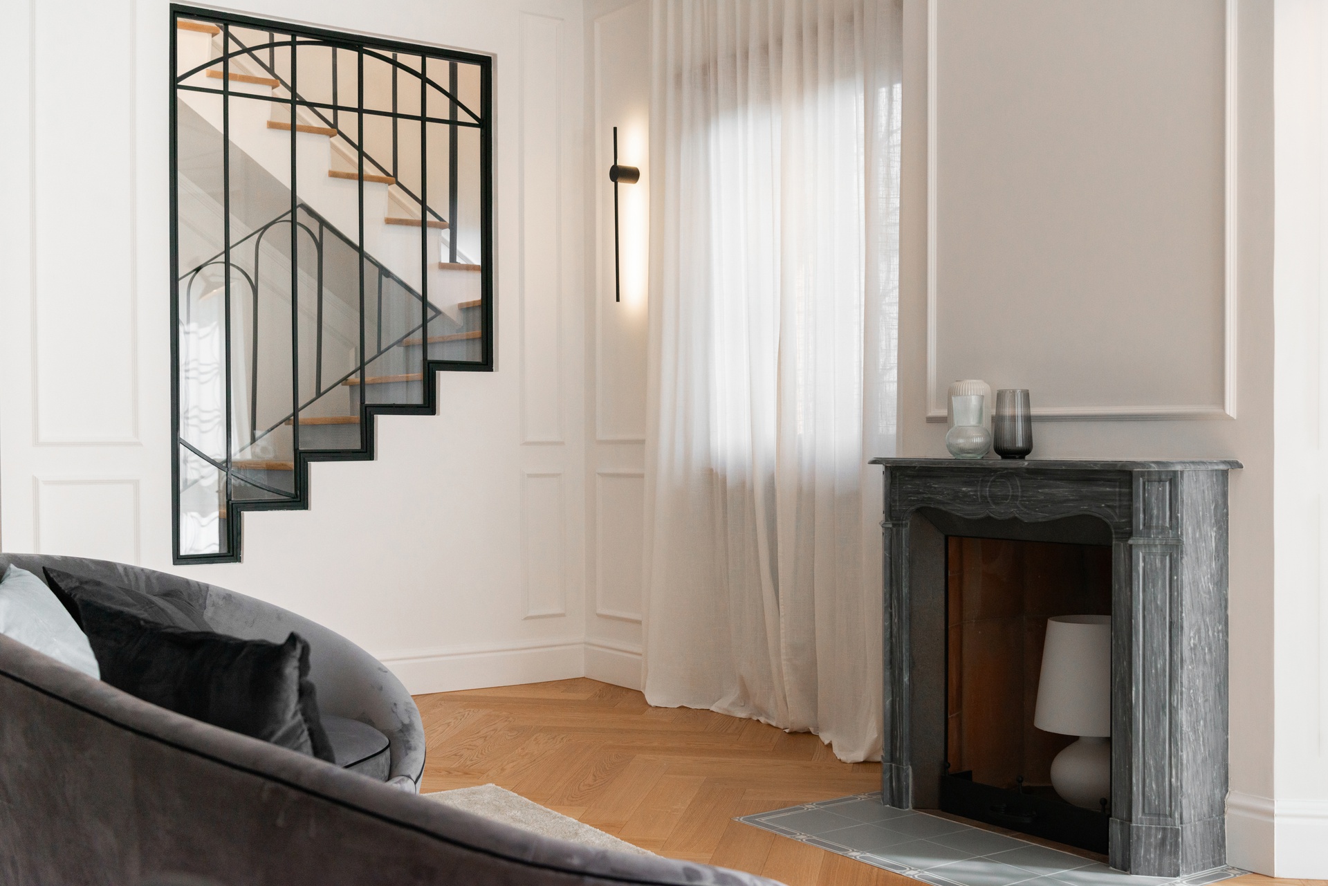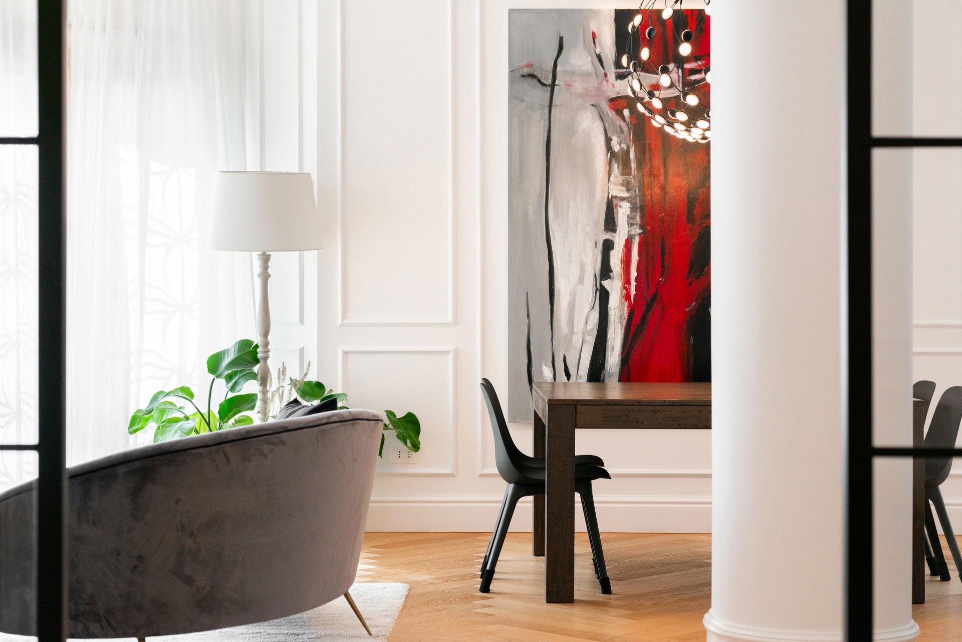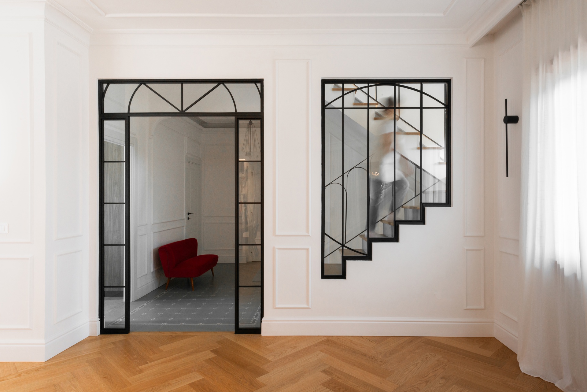 Casa Vivanti è un progetto di ristrutturazione che trasforma un appartamento triplex in un ambiente sofisticato e funzionale, dove luce naturale, materiali selezionati e spazi aperti diventano protagonisti. L’intervento unisce tradizione e innovazione, creando un equilibrio tra estetica e comfort abitativo.Elemento distintivo dell’abitazione è la scala in legno e ferro, che collega i tre livelli con un design leggero e sospeso, trasformandosi in un punto focale sia funzionale che decorativo. Gli interni si caratterizzano per una palette luminosa e accogliente, con pareti bianche e parquet in legno a spina italiana, che donano continuità e calore agli ambienti. La zona giorno, cuore della residenza, è valorizzata da una grande vetrata incorniciata in metallo nero, che amplifica la luminosità e mette in dialogo interno ed esterno. Una colonna centrale aggiunge carattere allo spazio, sottolineando il perfetto bilanciamento tra eleganza e sobrietà. Porte in ferro e vetro separano gli ambienti senza interrompere il flusso della luce, enfatizzando l’armonia tra i diversi spazi. L'uso di materiali raffinati e la scelta di un parquet chiaro contribuiscono a creare un’atmosfera calda e familiare, pur mantenendo un’estetica contemporanea.Casa Vivanti rappresenta un modello di residenza in cui la qualità del design e l’attenzione ai dettagli definiscono un’esperienza abitativa unica, dimostrando come la fusione tra tradizione e modernità possa dar vita a spazi eleganti e senza tempo.