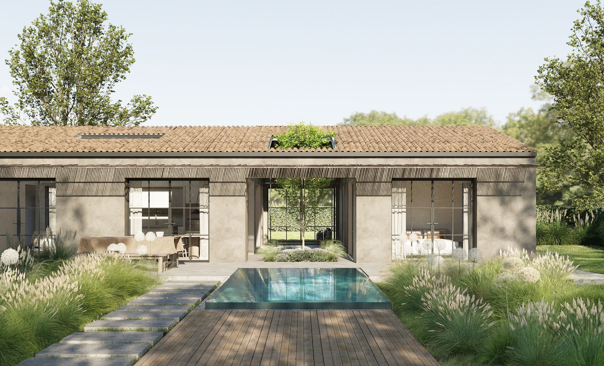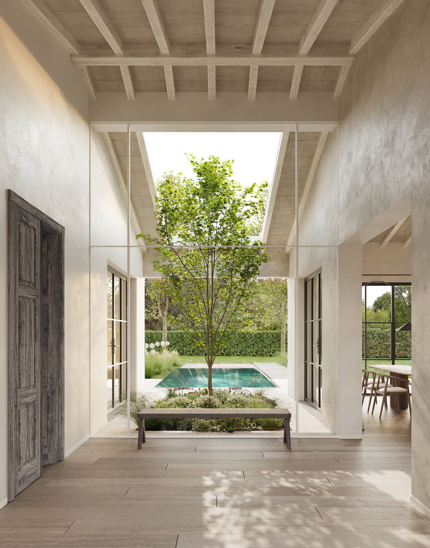 A Massa stiamo realizzando una villa di 260 m² pensata come luogo di equilibrio e bellezza, dove tradizione e modernità si incontrano e la natura diventa parte integrante dell’architettura. La casa si configura come rifugio e insieme spazio di condivisione, un progetto che intreccia memoria e contemporaneità.L’idea nasce dal desiderio di ricreare, in una residenza privata, la stessa atmosfera di luce, armonia e rigore che caratterizza i laboratori di marmo: superfici pure, altezze generose e geometrie essenziali che definiscono un’architettura accogliente e al tempo stesso rigorosa. I materiali, autentici e senza tempo, evocano solidità e calore: il marmo con la sua forza, la pietra e il legno con la loro matericità avvolgente.L’ingresso diventa il fulcro visivo e simbolico della casa: un volume centrale in vetro che dialoga con il paesaggio e accoglie con un linguaggio luminoso e contemporaneo. Qui interno ed esterno si fondono in continuità, aprendo la vista sul giardino e sulla piscina, mentre le materie – legno, pietra, vetro – si intrecciano in un equilibrio raffinato.La trasparenza delle ampie vetrate lascia fluire la luce naturale durante tutto l’arco della giornata, trasformando gli ambienti interni in spazi vivi e mutevoli, capaci di cambiare con le stagioni e con le ore. Ogni dettaglio è pensato per restituire armonia, trasparenza e accoglienza, rendendo questa villa un’esperienza abitativa unica, in cui architettura e natura si abbracciano.