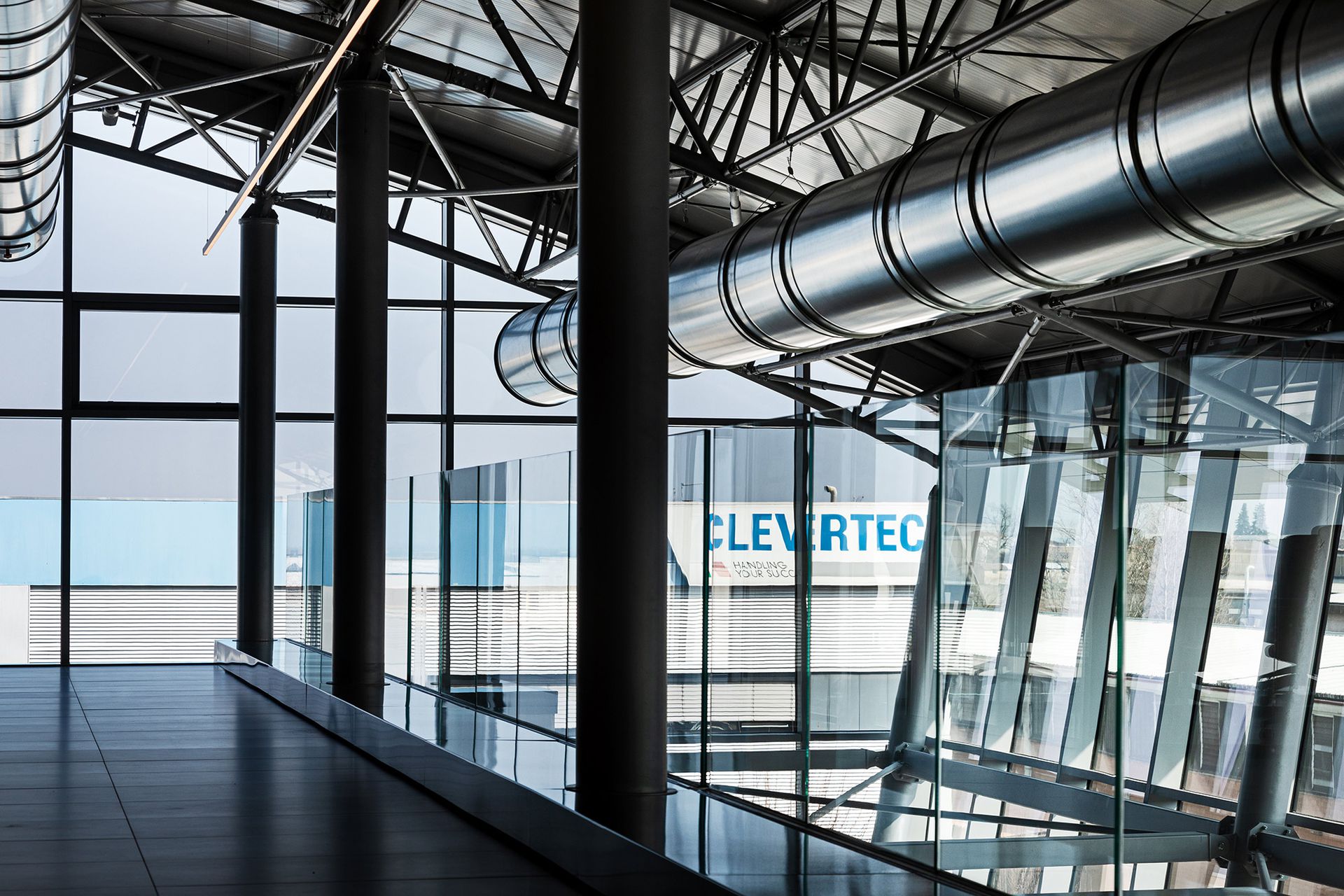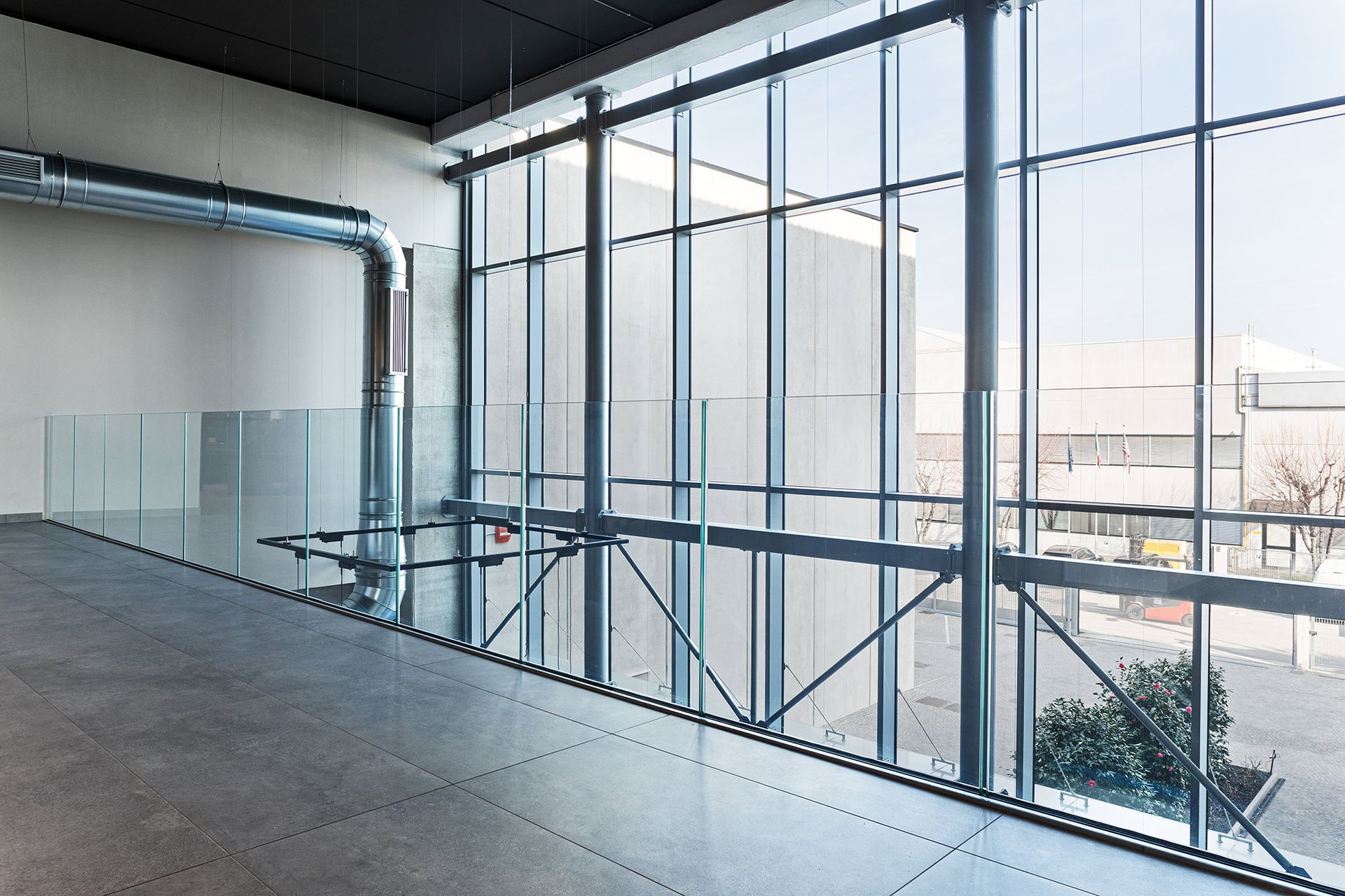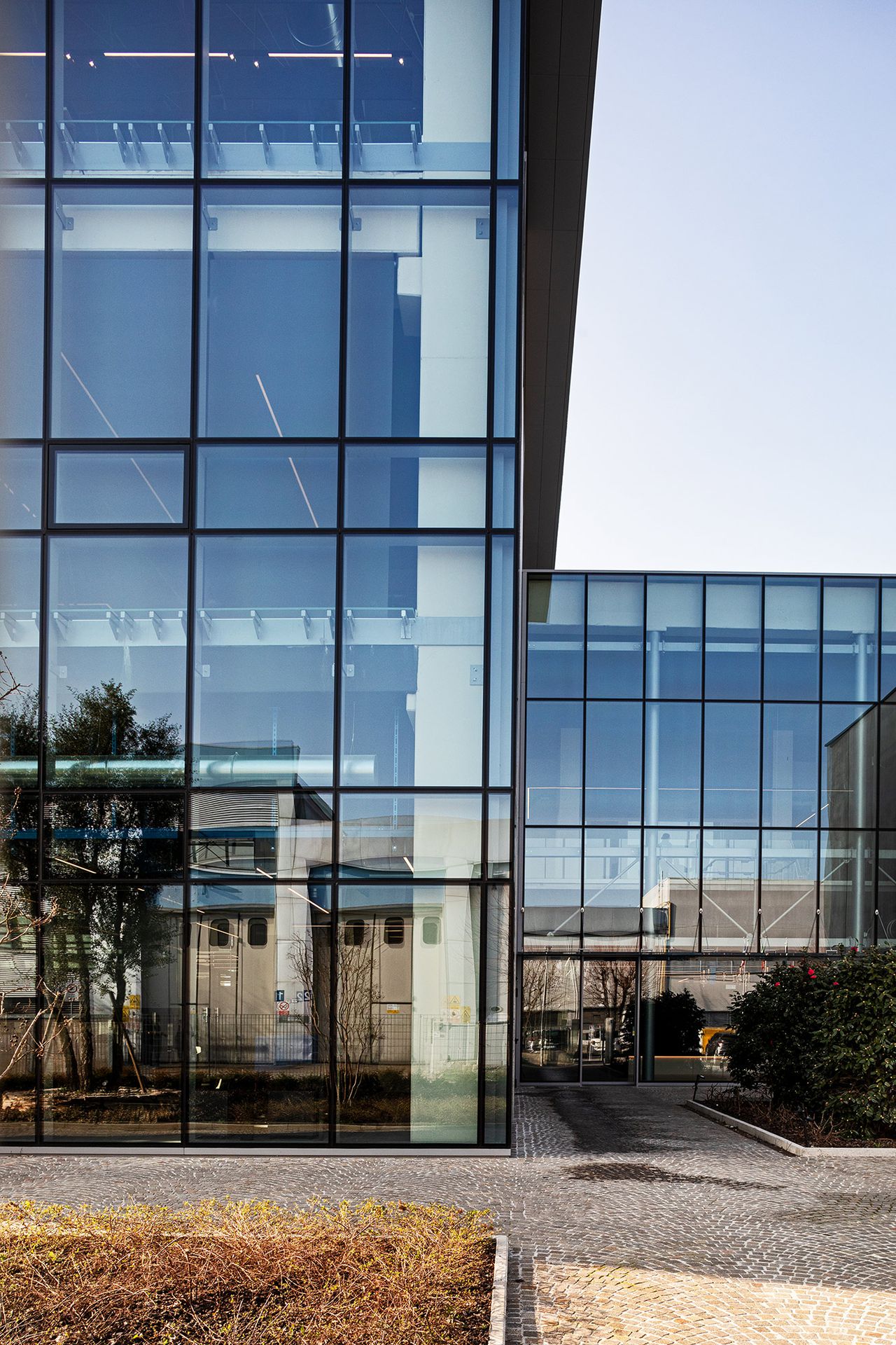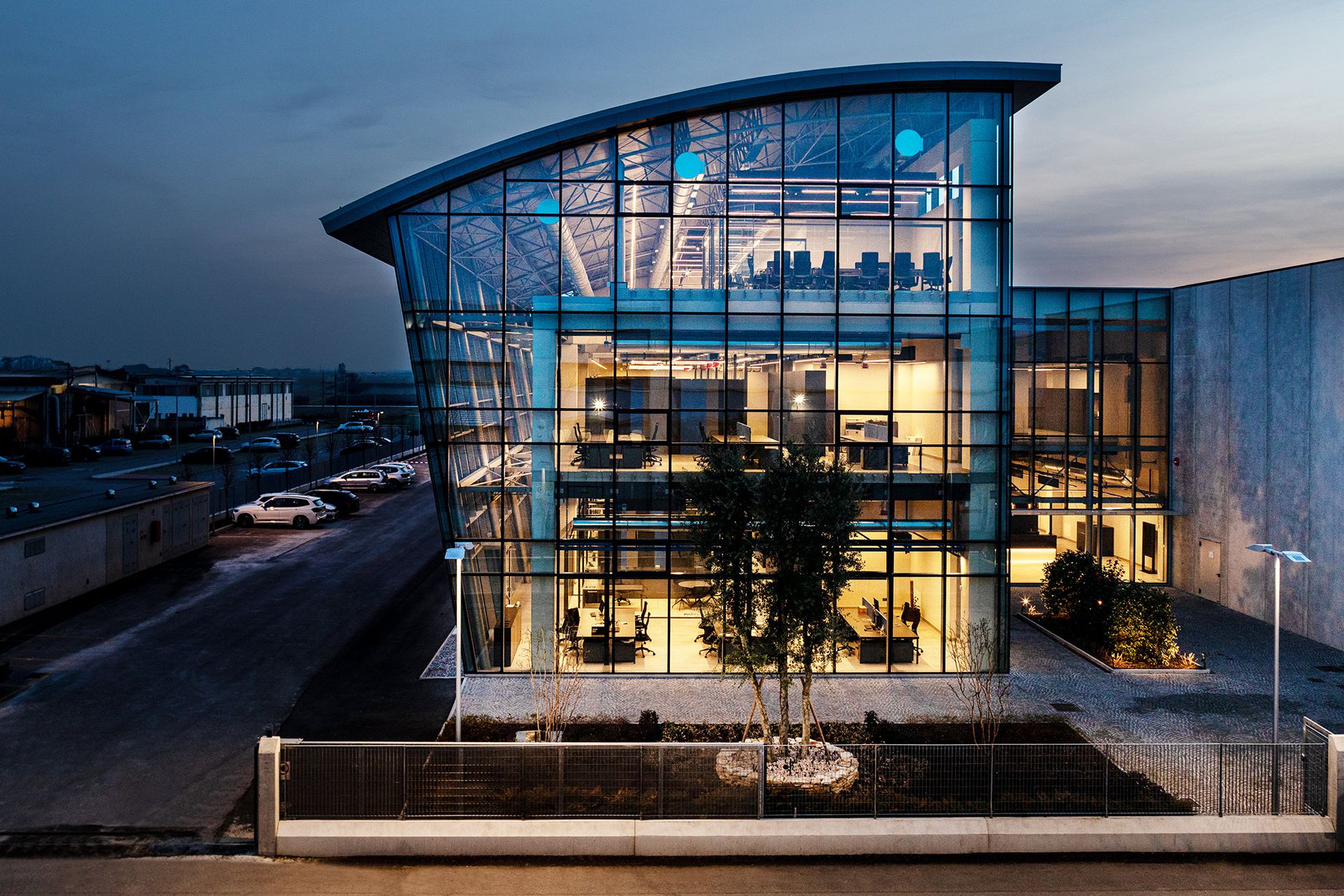 Clevertech è una realtà in forte espansione che, per la costruzione degli uffici nella sua nuova sede, ha voluto ispirarsi alla visibilità del lavoro di squadra attraverso una “grande vetrina” che accogliesse e mostrasse il lavoro dei suoi collaboratori.Per far ciò l’accurata progettazione ha previsto una struttura inclinata in carpenteria metallica che abbiamo poi tamponato con una grande facciata strutturale di circa 38x17x15 metri di altezza. Qui la presenza delle sigillature esterne al posto delle classiche copertine amplifica l’effetto vetrina, così da soddisfare le esigenze di trasparenza del cliente.La copertura dell’edificio è in pannelli metallici curvi grecati, provvisti di ogni accorgimento per la sicurezza e le performance termoacustiche. Anche i serramenti sono ad alto isolamento con vetri selettivi, mentre ingressi automatici, porte antipanico e una pensilina in vetro completano il nostro intervento che grazie al generoso uso del vetro mette in aperta relazione esterno e interno di questa architettura. Progetto Arch. Maurizio Di Mauro e Arch. Elena Reggiani