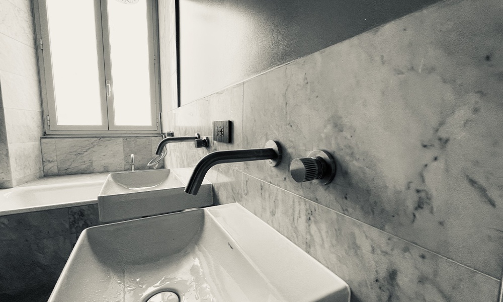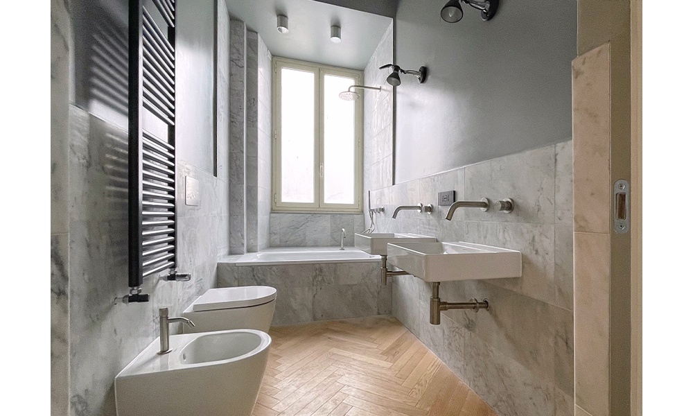 La ristrutturazione dell’immobile di circa 60 mq è stata operata all’interno di un edificio degli anni ’30, in zona San Giovanni a Roma. Mediante la modifica di poche tramezzature interne si è operata una nuova divisione di tutti gli ambienti oltre all’integrale rifacimento di tutti gli impianti tecnologici.Il corridoio, caratterizzato da uno smalto grigio tenue, così come altri ambienti della casa, si configura come un percorso che distribuisce a tutti gli spazi, da quelli più conviviali del “living” a quelli più privati della zona notte. Tutte le stanze sono caratterizzate dalla presenza di una pavimentazione in parquet di rovere massello a spina italiana che, proseguendo anche nel bagno e nella cucina, si arricchisce affiancandosi ai rivestimenti realizzati con lastre di marmo bianco di Carrara. Alcuni degli elementi originali sono stati conservati e altri riproposti in chiave contemporanea mantenendo il loro gusto classico.