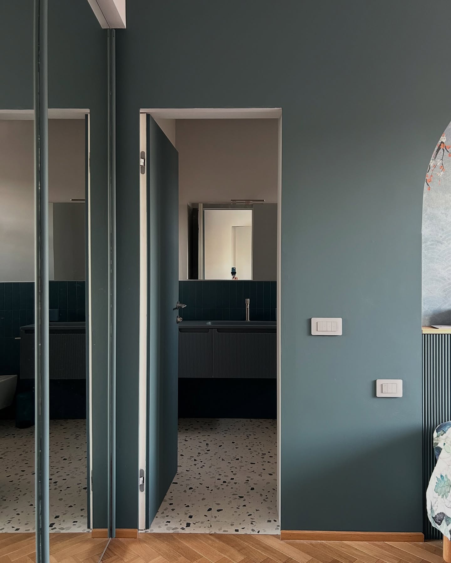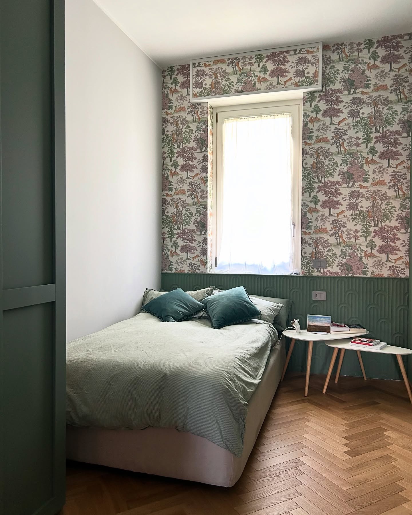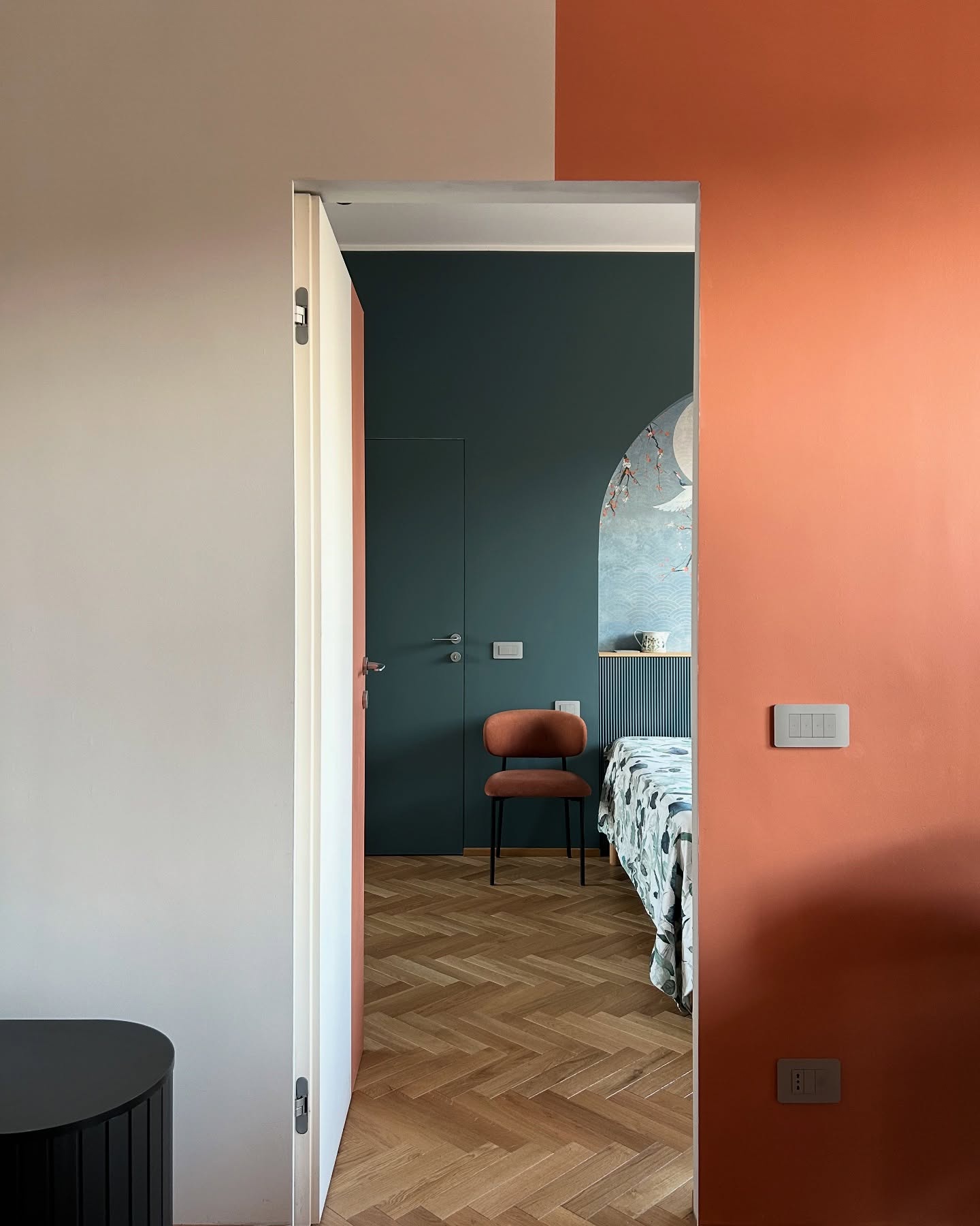 Questo appartamento nel cuore di Milano nasceva come un bilocale con un'unica camera da letto, un solo bagno, tanto spazio sprecato in ingresso e disimpegni. Il progetto ha trasformato completamente i 63mq rendendoli funzionali: 2 grandi camere da letto, 2 ampi bagni completi, un soggiorno con angolo cottura, un ripostiglio/lavanderia, il tutto arricchito da uno splendido balcone che corre lungo tutto un lato dell'appartamento. A creare unicità al progetto è l'utilizzo di materiali e colori: porte filomuro nascondono stanze nelle quali esplodono ambientazioni oniriche adornate da boiserie colorate che rendono l'ambiente accogliente ed elegante. Nella zona giorno l'area cucina/pranzo è avvolta da una fascia di colore che ne delimita i confini correndo attraverso l'elemento centrale della cucina, risalendo sul soffitto e ripiegando sulla parete opposta, sotto a questo "cielo" colorato il grande tavolo da pranzo. Nascosta per 1/3 dalla parete RAL 3012 si rivela l'apertura verso la camera da letto matrimoniale: qui il blu avvolge l'ambiente. In blu sono dipinti i dettagli dell'ampio armadio tutta altezza interamente a specchio, in blu i faretti cilindrici che lo illuminano, in blu la parete nella quale è aperta una finestra ad arco verso un paesaggio giapponese che, grazie ai suoi aironi in volo, accompagna verso un piacevole sonno chi è sdraiato sul letto sottostante. Da qui un'altra porta nasconde l'accesso al bagno in cui questa volta il blu è il tocco dato dalle piastrelline rettangolari che decorano la parete dietro ai sanitari e all'interno della doccia acquistano matericità con rilievi sempre diversi. Un grande soffione a soffitto offre una piacevole cascata d'acqua e l'ambientazione viene scaldata da una fascia di luce indiretta che corre lungo tutto il controsoffitto. La seconda camera è avvolta dalla dolcezza di un paesaggio onirico di tigri ed alberi esotici, una boiserie si offre come testata letto e l'intero ambiente è armonioso e delicato. In linea con questa, il secondo bagno, all'interno del quale la protagonista è l'ampia doccia in nicchi a semi arco rivestita in piastrelle che ricordano un hammam marocchino. Carte da parati, giochi di colore, tanta luce rendono questo appartamento un luogo davvero incredibile!