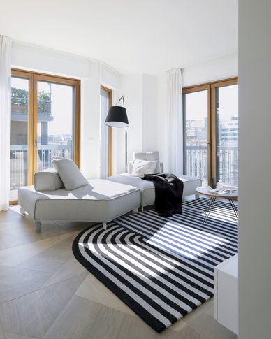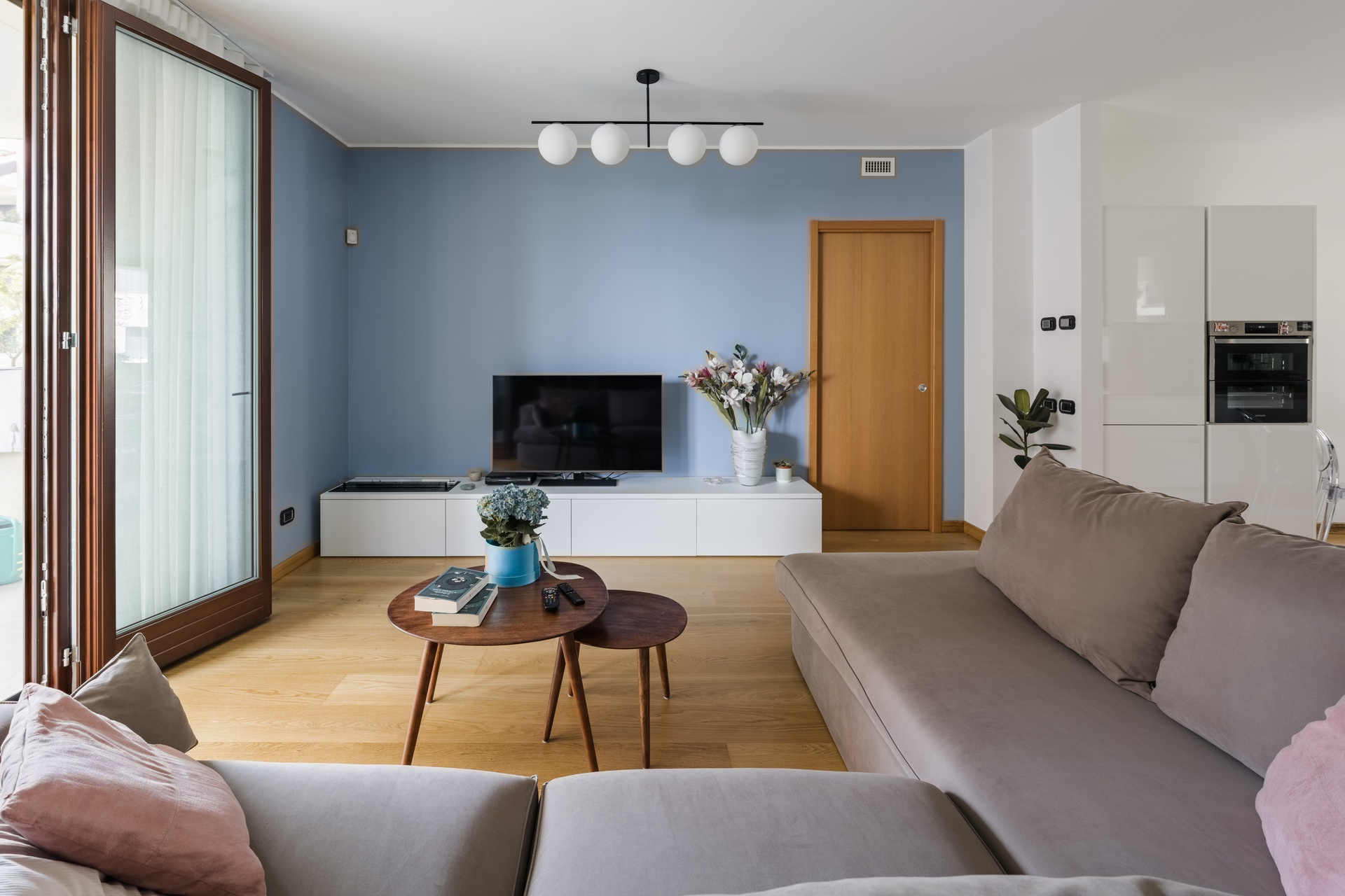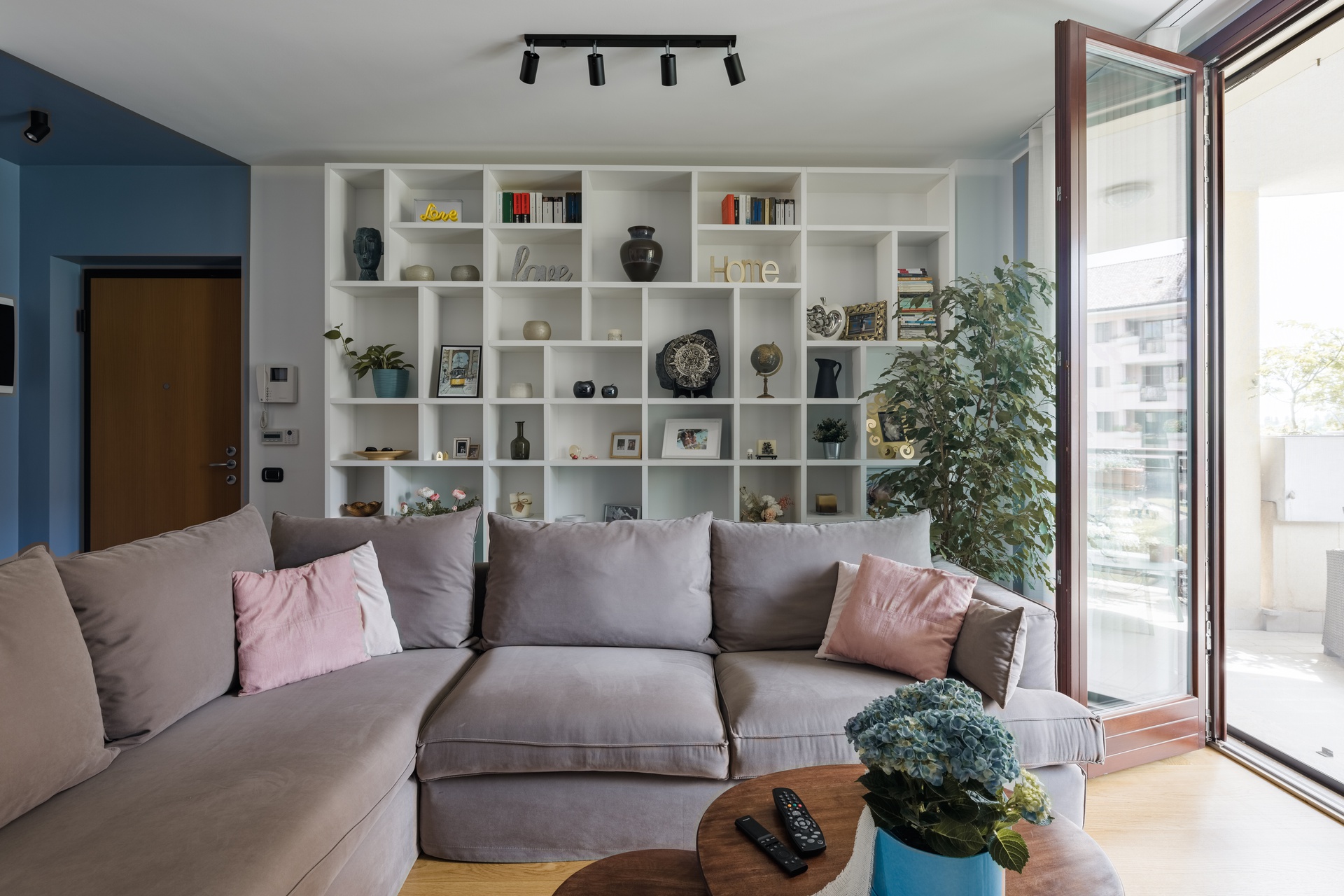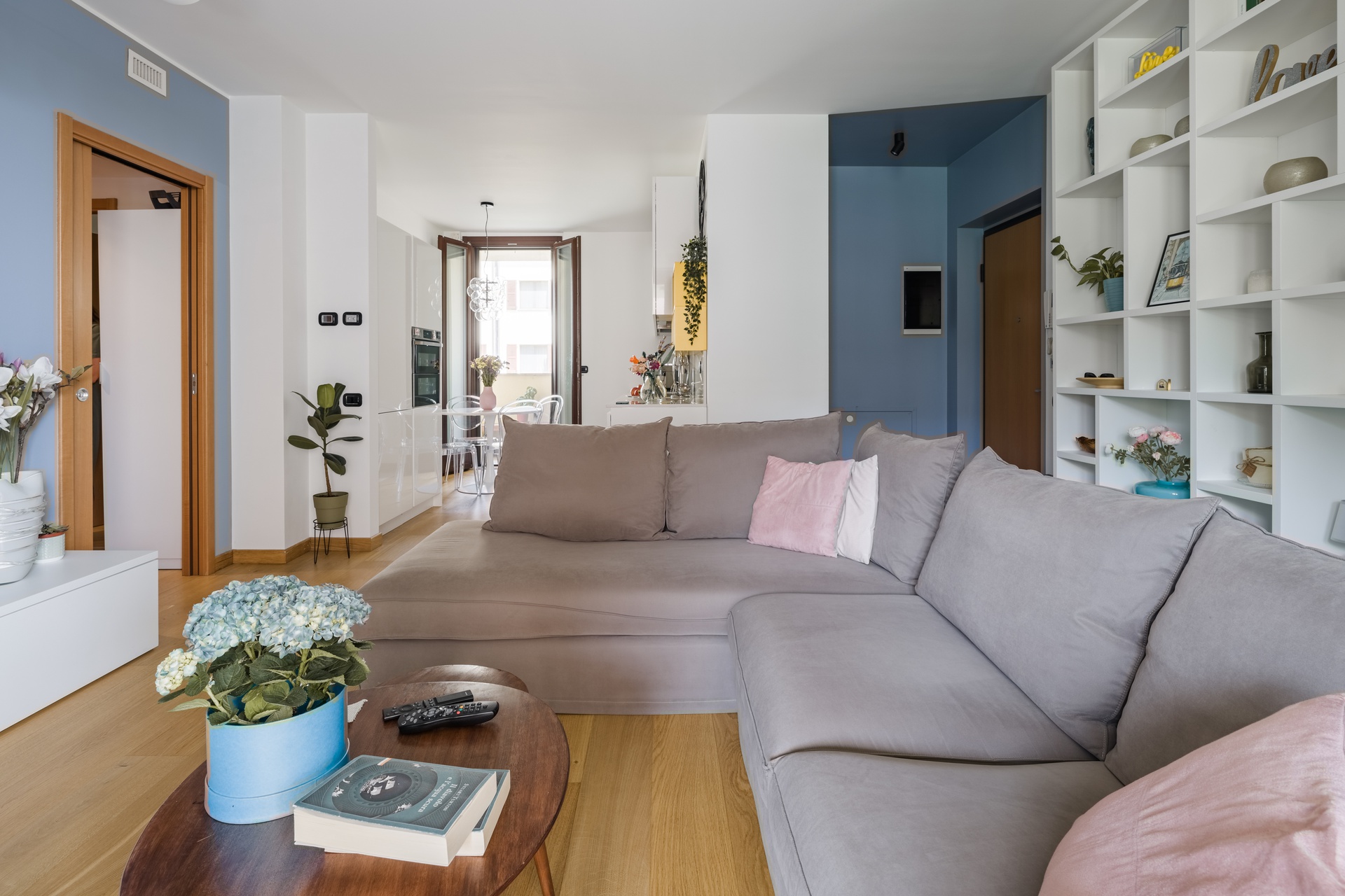 Appartamento di 100 mq circa, dove l'intervento di ristrutturazione ha interessato solo la zona giorno e un bagno. Le esigenze dei committenti erano di unire il soggiorno con la cucina, ripensare agli arredi, conservando il loro divano, rifare un bagno sostituendo la vasca con una doccia walk-in.Inoltre, la zona giorno doveva avere una grossa libreria, un camino bioetanolo, e una cappottiera all'ingresso.A flat of about 100 square metres, where the renovation work involved only the living area and one bathroom. The clients' requirements were to combine the living room with the kitchen, rethink the furniture, retaining their sofa, and redo a bathroom by replacing the bathtub with a walk-in shower.In addition, the living area was to have a large bookcase, a bioethanol fireplace, and a coat rack at the entrance.