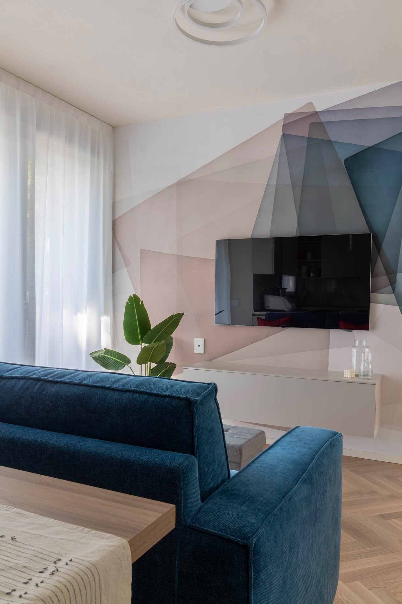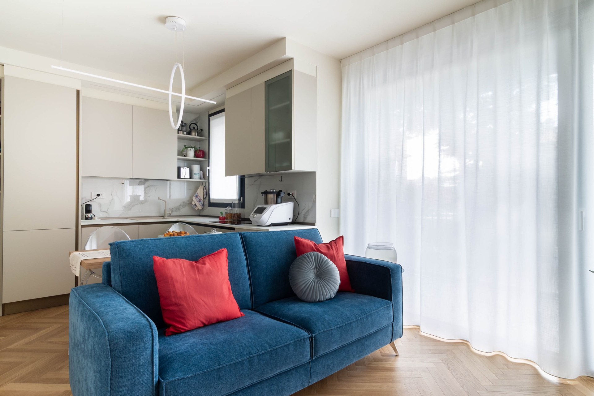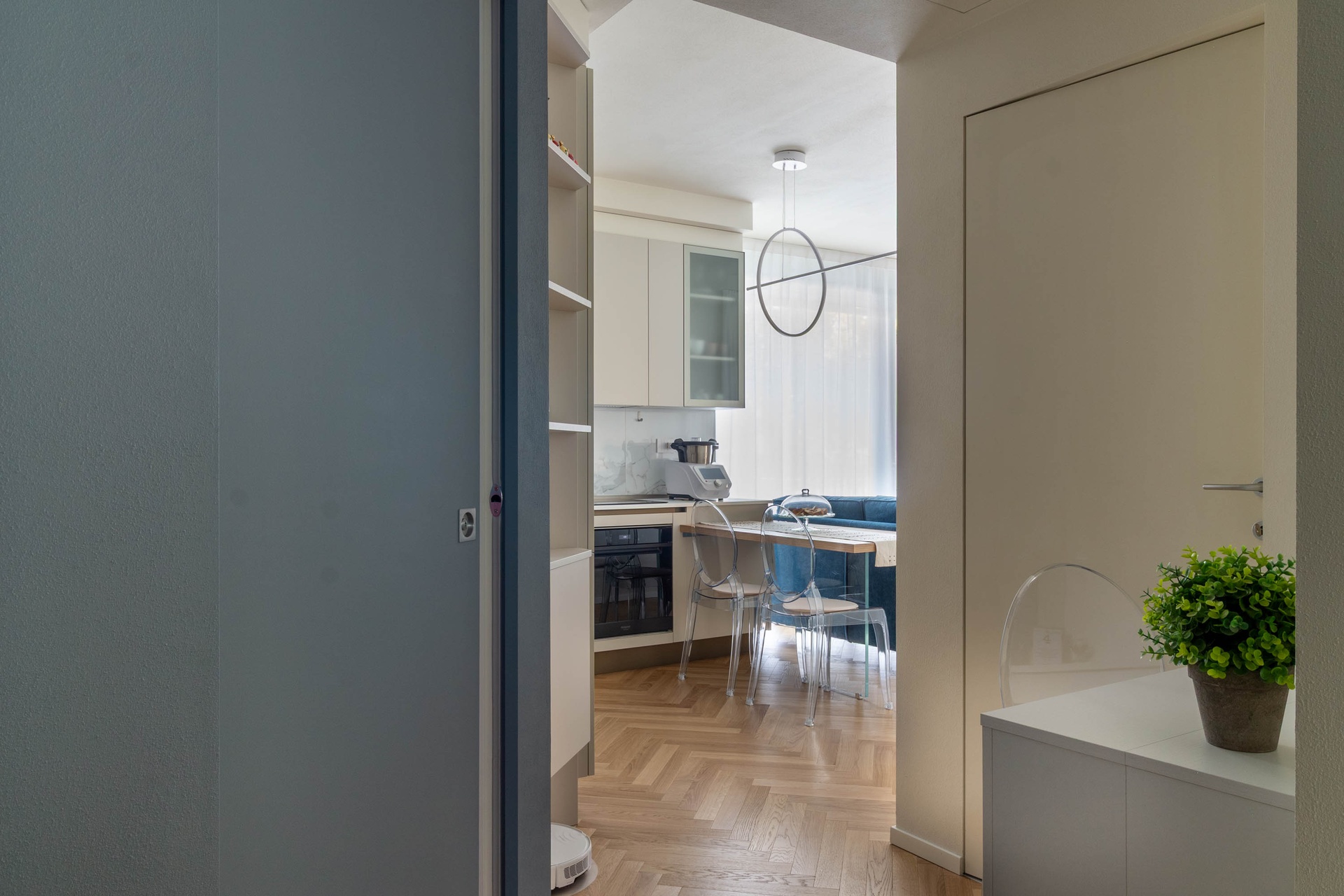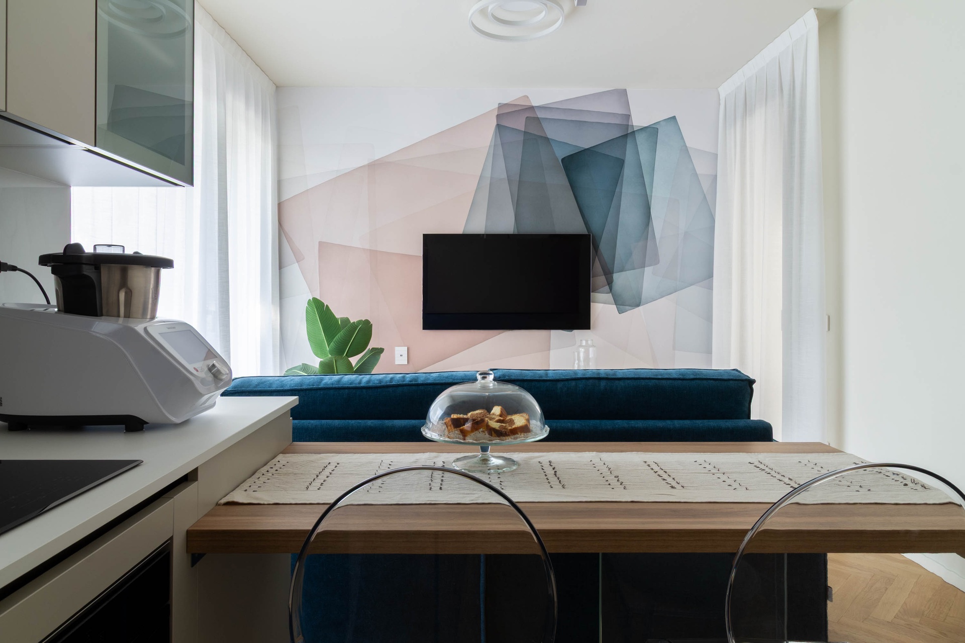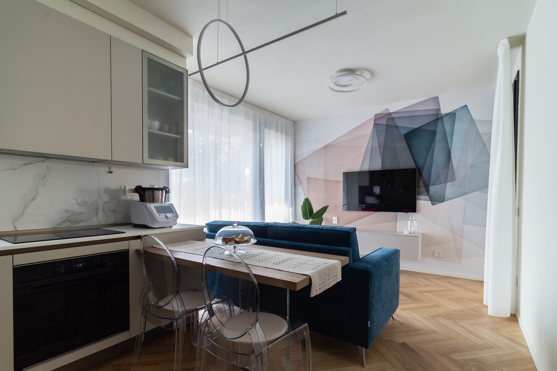 Compact CHIC è il risultato di un anno di lavoro, di cantiere e di immaginazione. Un alloggio in una palazzina di nuova costruzione, dove ho avuto il piacere di seguire ogni fase – dal progetto alla scelta delle finiture, fino all’arredo su misura.In meno di 60 mq trovano posto due camere da letto, due bagni (uno con lavanderia) e una zona giorno con cucina. A completare il tutto, uno spazio esterno trasformato da semplice terrazza in un giardino pensile con pergolato, un piccolo rifugio verde sospeso tra cielo e città.La pianta è stata studiata con estrema cura per ottimizzare ogni centimetro: ogni arredo è pensato su misura, ogni spazio dialoga con il successivo per garantire comfort e leggerezza visiva. L’obiettivo era quello di creare un ambiente che fosse al tempo stesso funzionale, accogliente e trasformabile.Gli interni giocano con il colore come elemento identitario.Le finiture, scelte tra capitolato ed extra, compongono un insieme contemporaneo e vivace, in cui la luce e i materiali dialogano armoniosamente. La carta da parati del soggiorno diventa il fulcro visivo: nasconde la TV tra i suoi riquadri e introduce una palette cromatica che si ripete con coerenza in tutti gli ambienti, legando tra loro pareti, arredi e complementi.Ogni elemento è stato pensato per moltiplicare le possibilità: il tavolo/penisola, realizzato su disegno, si estende grazie a una consolle allungabile e permette di accogliere fino a dieci persone semplicemente spostando il divano; nella camera ¾, un divano si trasforma in letto matrimoniale per gli ospiti, mantenendo intatta la pulizia formale dello spazio.Il risultato è una casa che sorprende per equilibrio e carattere: piccola nelle dimensioni, ma grande nello stile.