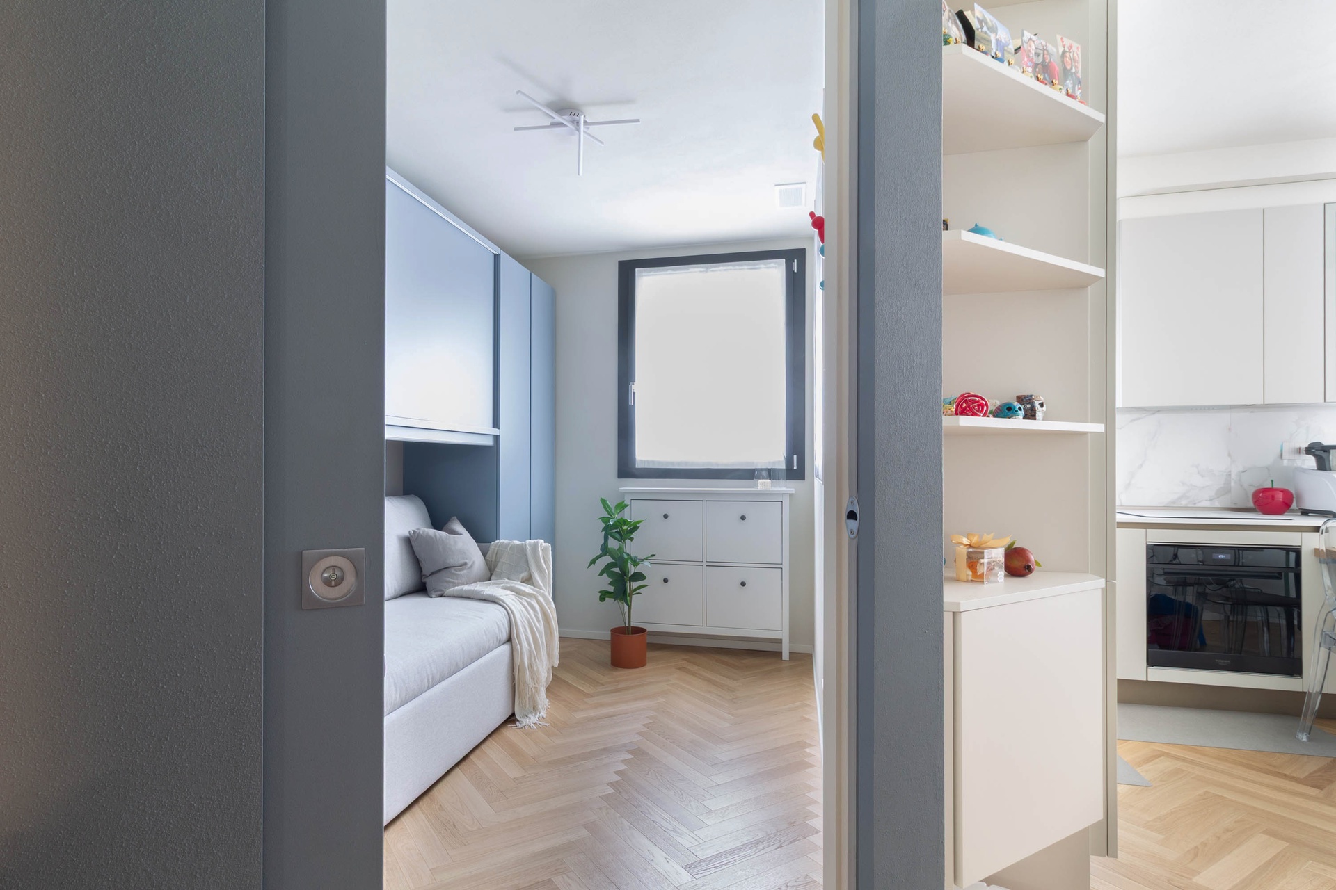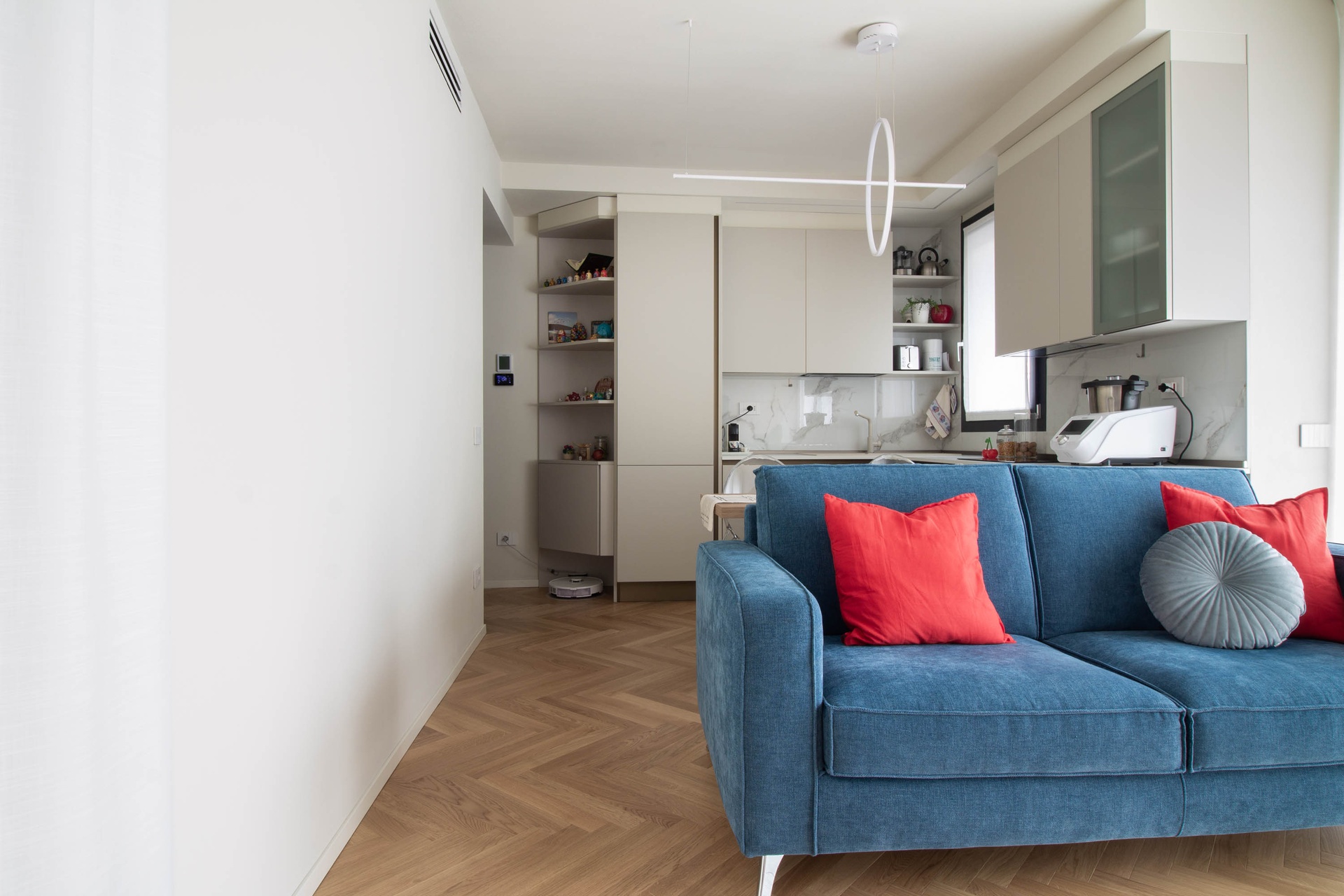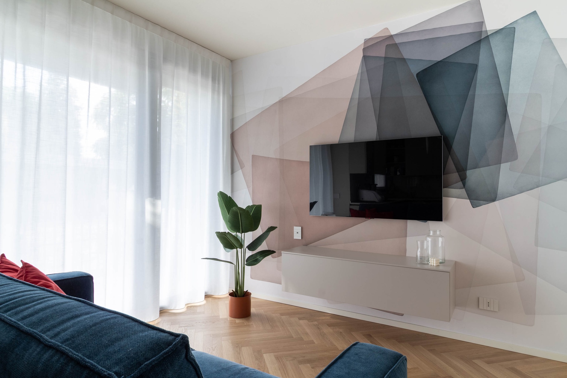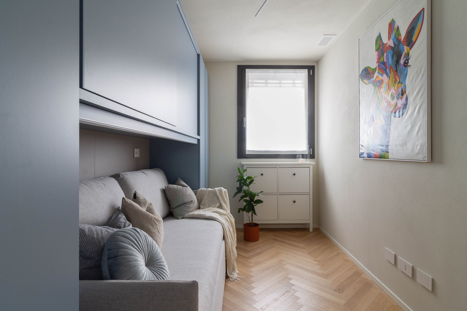 Compact CHIC è il risultato di un anno di lavoro, di cantiere e di immaginazione. Un alloggio in una palazzina di nuova costruzione, dove ho avuto il piacere di seguire ogni fase – dal progetto alla scelta delle finiture, fino all’arredo su misura.In meno di 60 mq trovano posto due camere da letto, due bagni (uno con lavanderia) e una zona giorno con cucina. A completare il tutto, uno spazio esterno trasformato da semplice terrazza in un giardino pensile con pergolato, un piccolo rifugio verde sospeso tra cielo e città.La pianta è stata studiata con estrema cura per ottimizzare ogni centimetro: ogni arredo è pensato su misura, ogni spazio dialoga con il successivo per garantire comfort e leggerezza visiva. L’obiettivo era quello di creare un ambiente che fosse al tempo stesso funzionale, accogliente e trasformabile.Gli interni giocano con il colore come elemento identitario.Le finiture, scelte tra capitolato ed extra, compongono un insieme contemporaneo e vivace, in cui la luce e i materiali dialogano armoniosamente. La carta da parati del soggiorno diventa il fulcro visivo: nasconde la TV tra i suoi riquadri e introduce una palette cromatica che si ripete con coerenza in tutti gli ambienti, legando tra loro pareti, arredi e complementi.Ogni elemento è stato pensato per moltiplicare le possibilità: il tavolo/penisola, realizzato su disegno, si estende grazie a una consolle allungabile e permette di accogliere fino a dieci persone semplicemente spostando il divano; nella camera ¾, un divano si trasforma in letto matrimoniale per gli ospiti, mantenendo intatta la pulizia formale dello spazio.Il risultato è una casa che sorprende per equilibrio e carattere: piccola nelle dimensioni, ma grande nello stile.