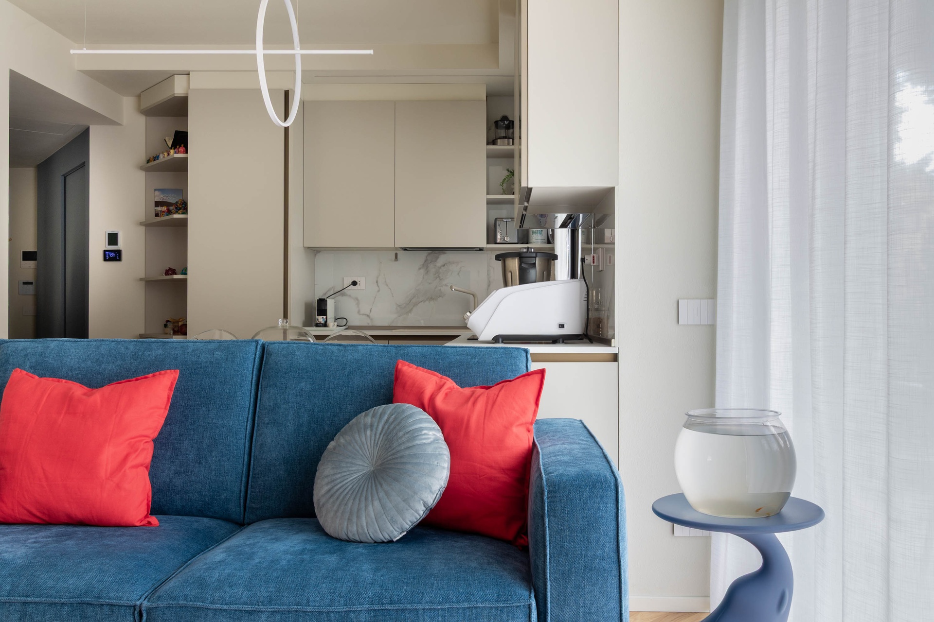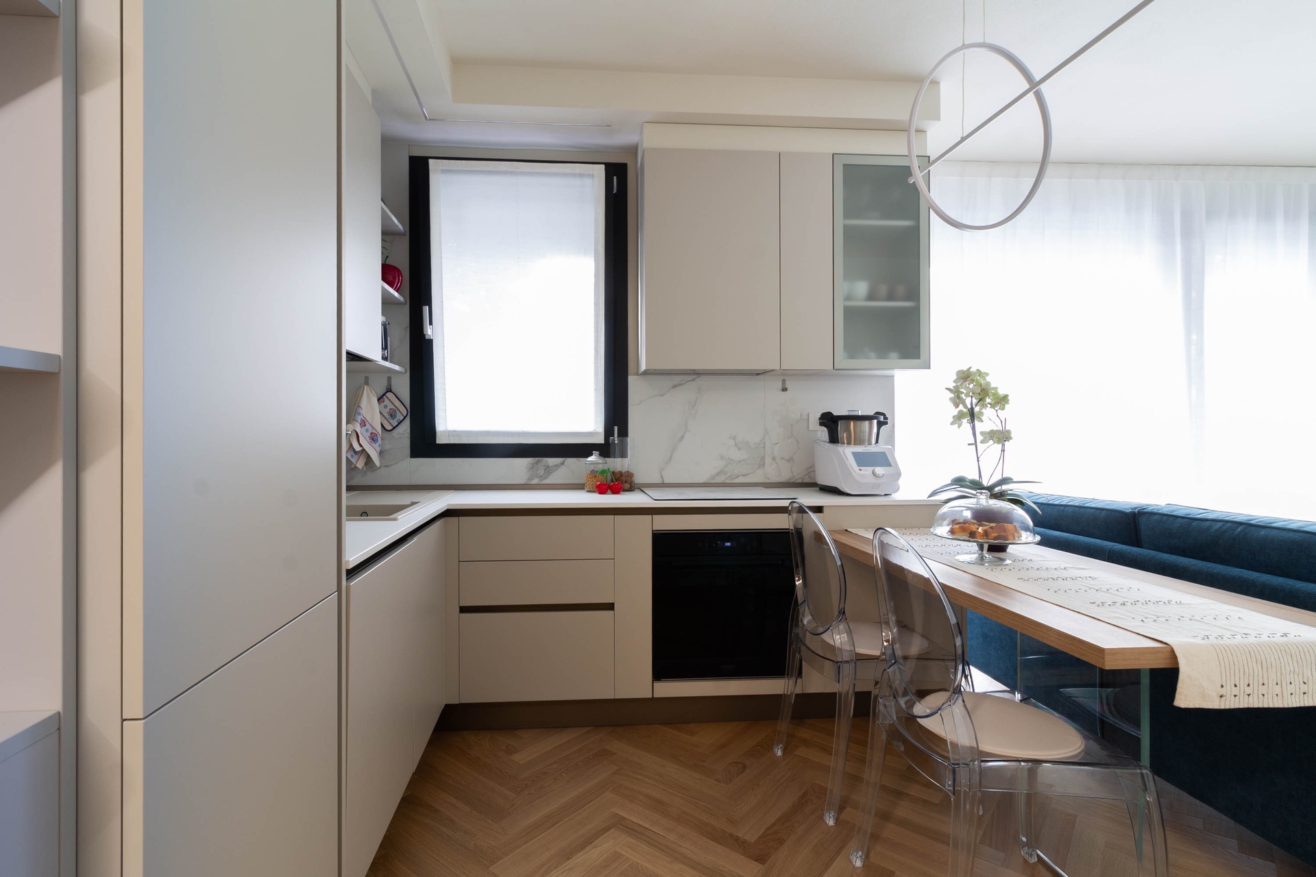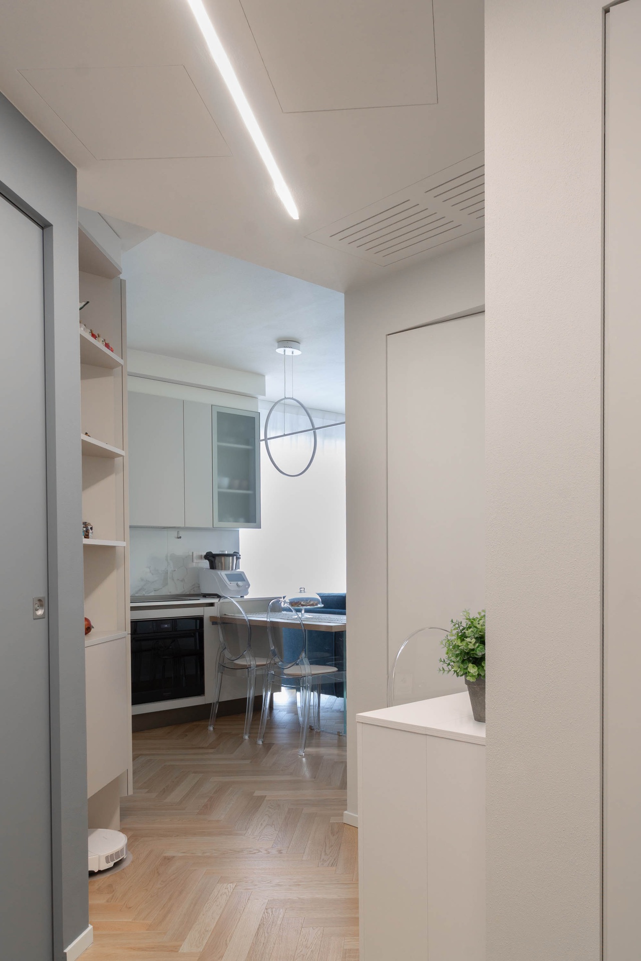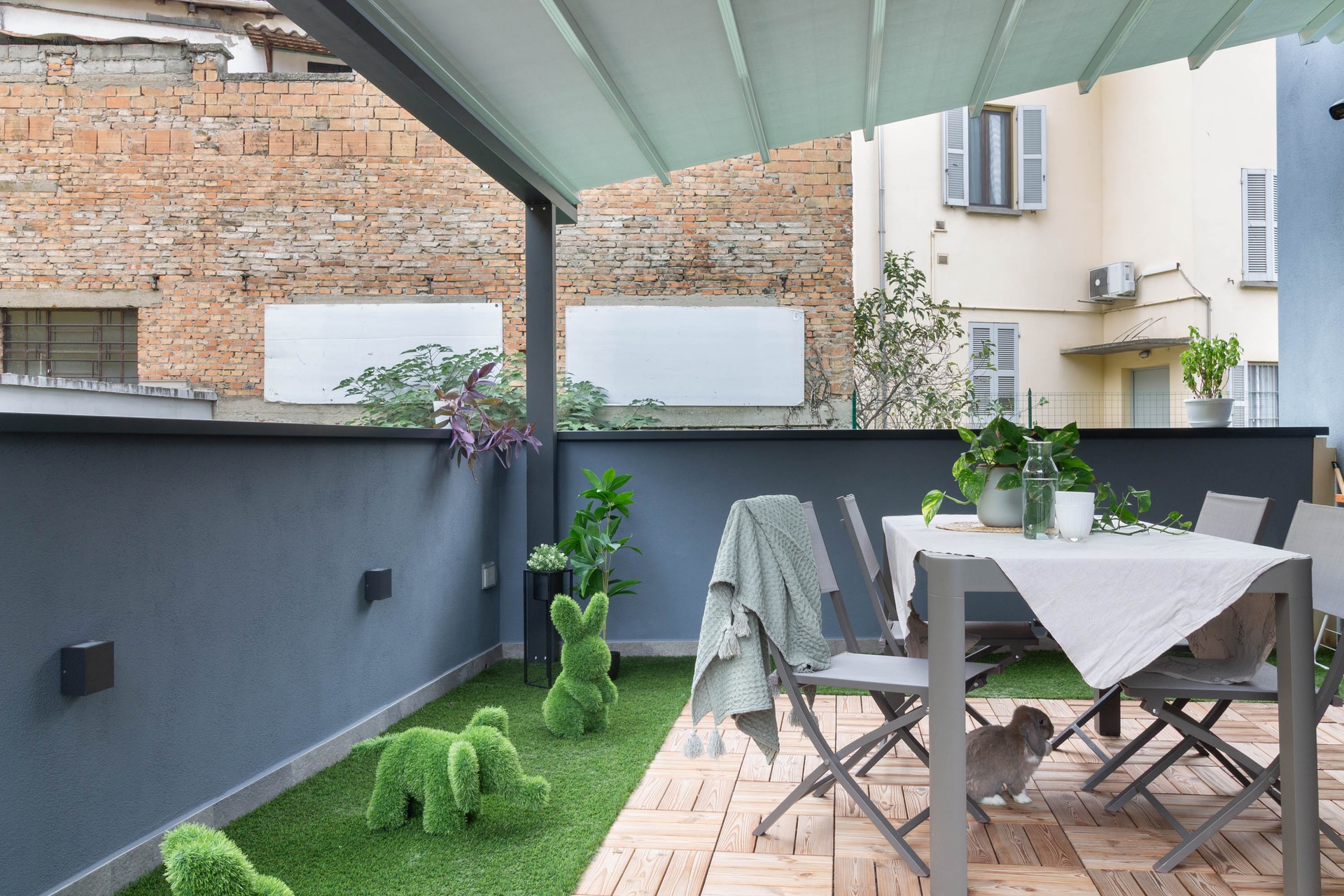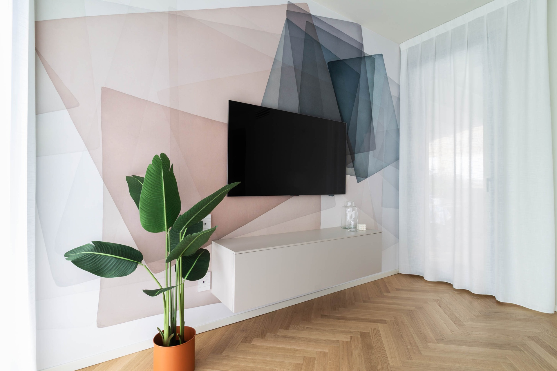 Compact CHIC è il risultato di un anno di lavoro, di cantiere e di immaginazione. Un alloggio in una palazzina di nuova costruzione, dove ho avuto il piacere di seguire ogni fase – dal progetto alla scelta delle finiture, fino all’arredo su misura.In meno di 60 mq trovano posto due camere da letto, due bagni (uno con lavanderia) e una zona giorno con cucina. A completare il tutto, uno spazio esterno trasformato da semplice terrazza in un giardino pensile con pergolato, un piccolo rifugio verde sospeso tra cielo e città.La pianta è stata studiata con estrema cura per ottimizzare ogni centimetro: ogni arredo è pensato su misura, ogni spazio dialoga con il successivo per garantire comfort e leggerezza visiva. L’obiettivo era quello di creare un ambiente che fosse al tempo stesso funzionale, accogliente e trasformabile.Gli interni giocano con il colore come elemento identitario.Le finiture, scelte tra capitolato ed extra, compongono un insieme contemporaneo e vivace, in cui la luce e i materiali dialogano armoniosamente. La carta da parati del soggiorno diventa il fulcro visivo: nasconde la TV tra i suoi riquadri e introduce una palette cromatica che si ripete con coerenza in tutti gli ambienti, legando tra loro pareti, arredi e complementi.Ogni elemento è stato pensato per moltiplicare le possibilità: il tavolo/penisola, realizzato su disegno, si estende grazie a una consolle allungabile e permette di accogliere fino a dieci persone semplicemente spostando il divano; nella camera ¾, un divano si trasforma in letto matrimoniale per gli ospiti, mantenendo intatta la pulizia formale dello spazio.Il risultato è una casa che sorprende per equilibrio e carattere: piccola nelle dimensioni, ma grande nello stile.