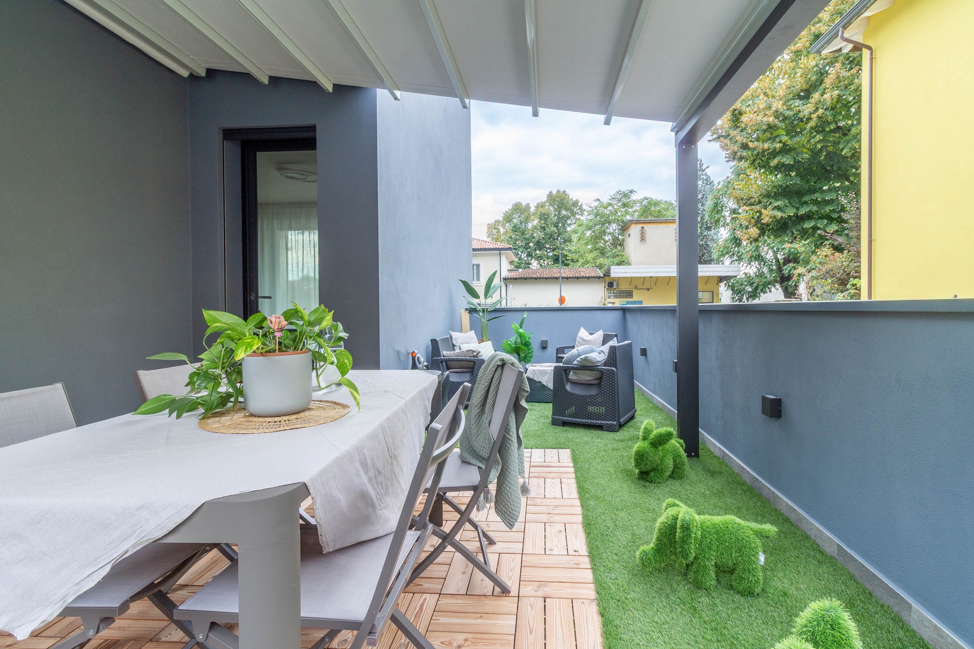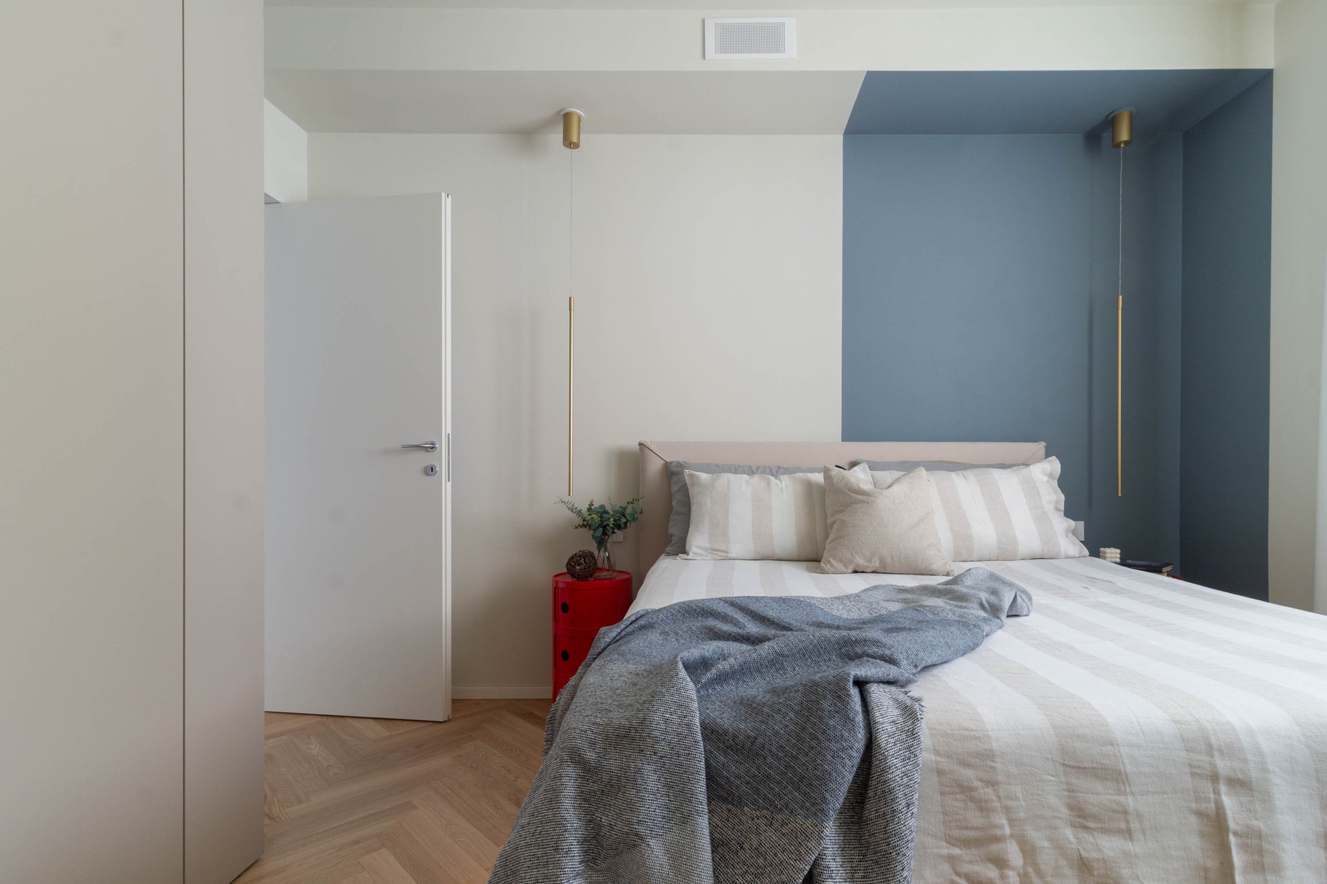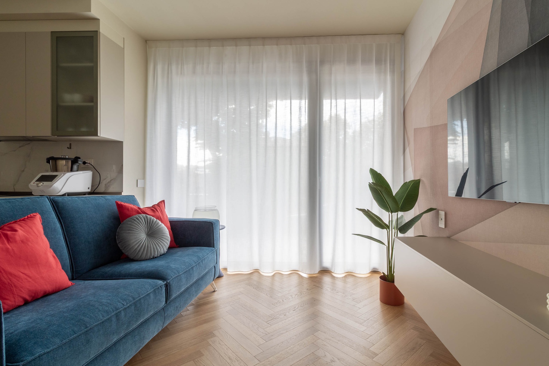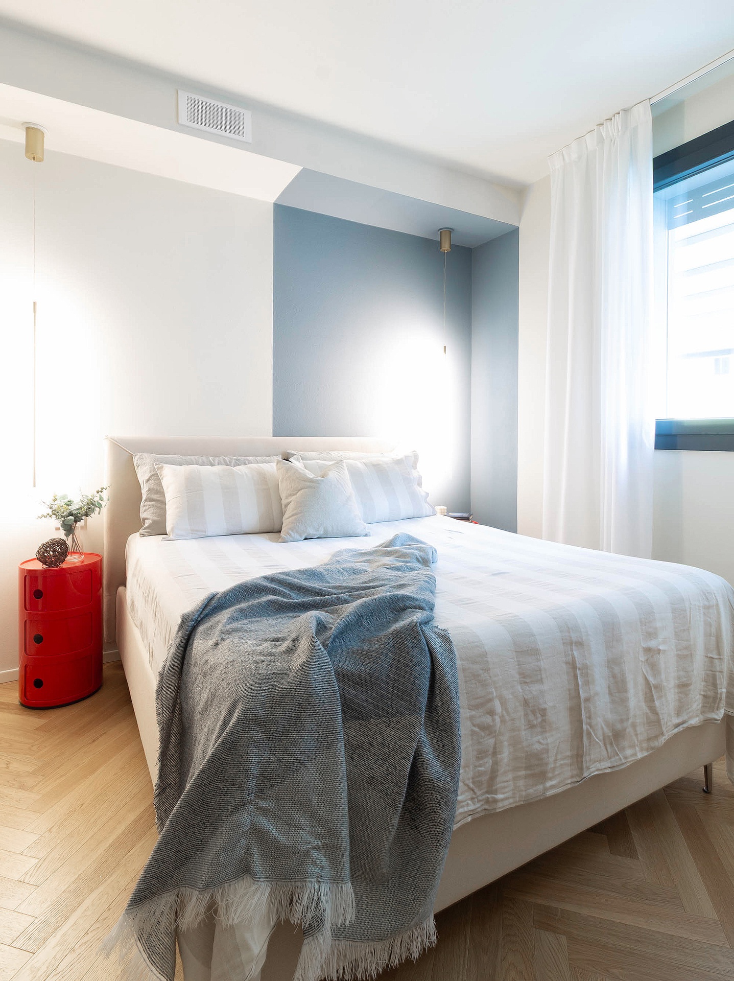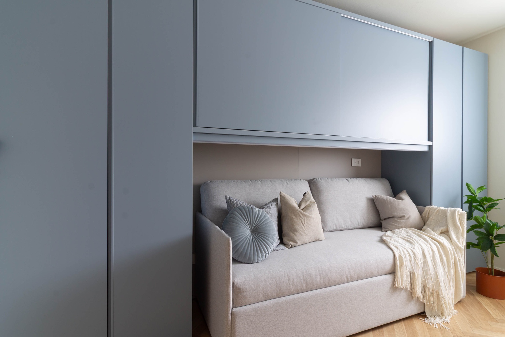 Compact CHIC è il risultato di un anno di lavoro, di cantiere e di immaginazione. Un alloggio in una palazzina di nuova costruzione, dove ho avuto il piacere di seguire ogni fase – dal progetto alla scelta delle finiture, fino all’arredo su misura.In meno di 60 mq trovano posto due camere da letto, due bagni (uno con lavanderia) e una zona giorno con cucina. A completare il tutto, uno spazio esterno trasformato da semplice terrazza in un giardino pensile con pergolato, un piccolo rifugio verde sospeso tra cielo e città.La pianta è stata studiata con estrema cura per ottimizzare ogni centimetro: ogni arredo è pensato su misura, ogni spazio dialoga con il successivo per garantire comfort e leggerezza visiva. L’obiettivo era quello di creare un ambiente che fosse al tempo stesso funzionale, accogliente e trasformabile.Gli interni giocano con il colore come elemento identitario.Le finiture, scelte tra capitolato ed extra, compongono un insieme contemporaneo e vivace, in cui la luce e i materiali dialogano armoniosamente. La carta da parati del soggiorno diventa il fulcro visivo: nasconde la TV tra i suoi riquadri e introduce una palette cromatica che si ripete con coerenza in tutti gli ambienti, legando tra loro pareti, arredi e complementi.Ogni elemento è stato pensato per moltiplicare le possibilità: il tavolo/penisola, realizzato su disegno, si estende grazie a una consolle allungabile e permette di accogliere fino a dieci persone semplicemente spostando il divano; nella camera ¾, un divano si trasforma in letto matrimoniale per gli ospiti, mantenendo intatta la pulizia formale dello spazio.Il risultato è una casa che sorprende per equilibrio e carattere: piccola nelle dimensioni, ma grande nello stile.