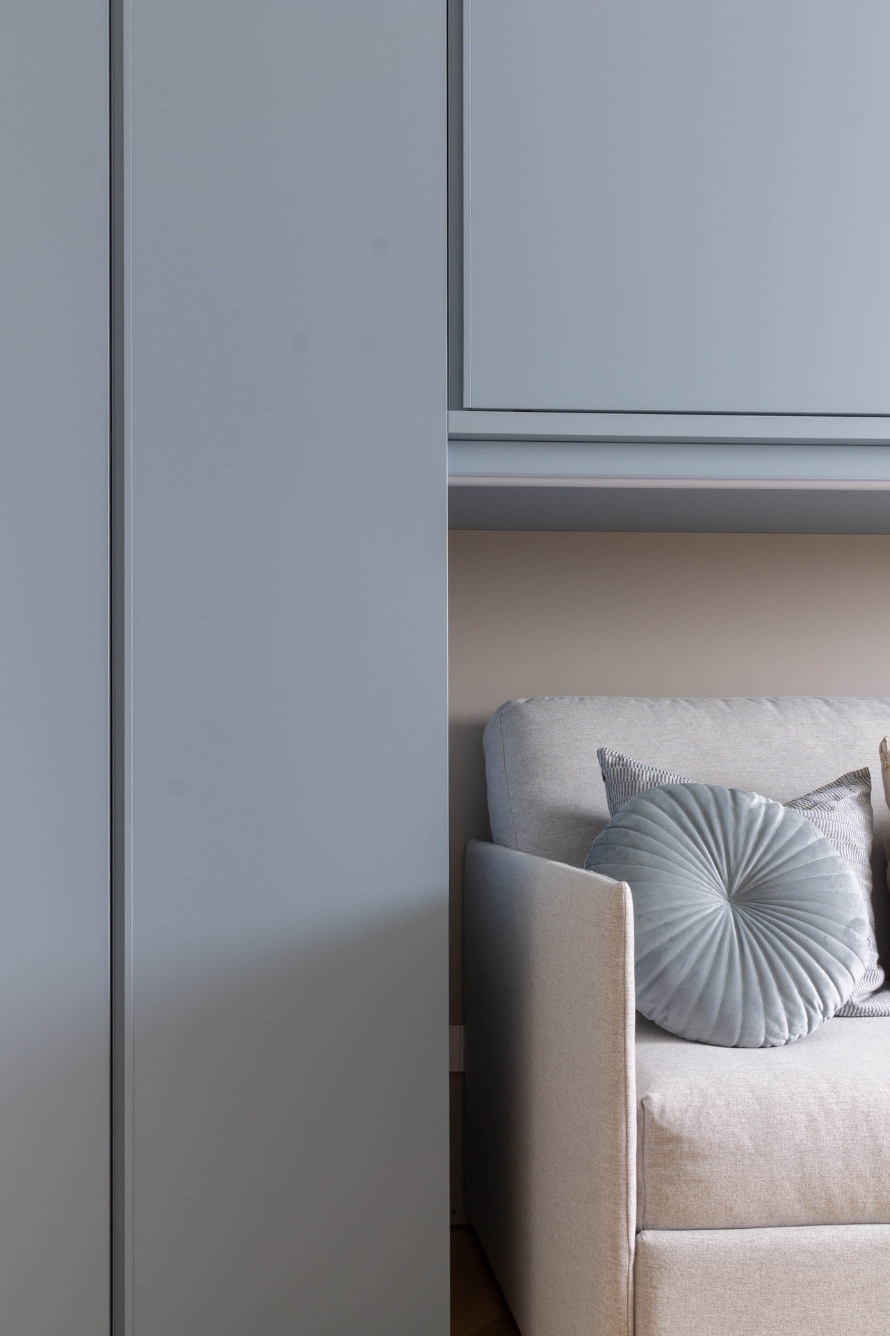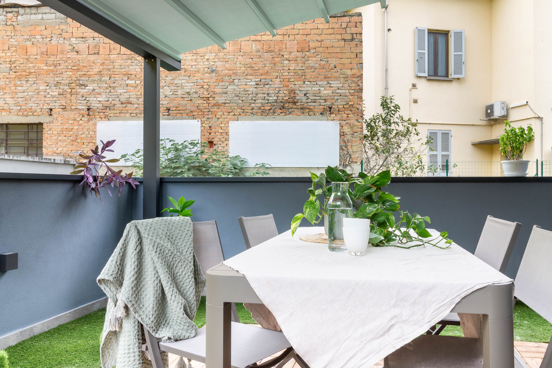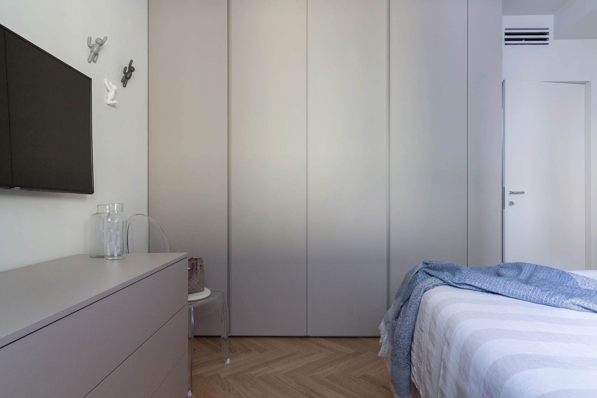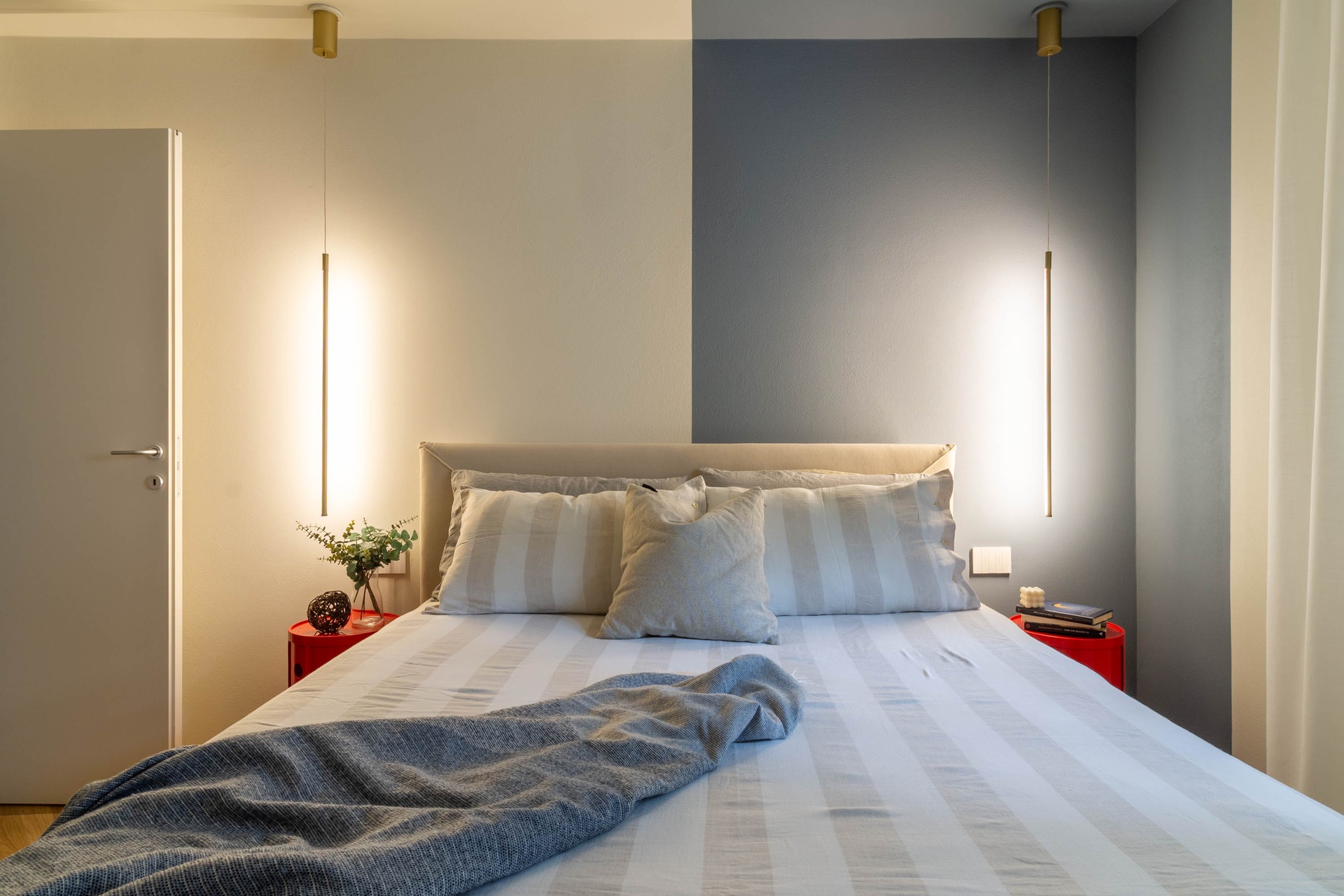 Compact CHIC è il risultato di un anno di lavoro, di cantiere e di immaginazione. Un alloggio in una palazzina di nuova costruzione, dove ho avuto il piacere di seguire ogni fase – dal progetto alla scelta delle finiture, fino all’arredo su misura.In meno di 60 mq trovano posto due camere da letto, due bagni (uno con lavanderia) e una zona giorno con cucina. A completare il tutto, uno spazio esterno trasformato da semplice terrazza in un giardino pensile con pergolato, un piccolo rifugio verde sospeso tra cielo e città.La pianta è stata studiata con estrema cura per ottimizzare ogni centimetro: ogni arredo è pensato su misura, ogni spazio dialoga con il successivo per garantire comfort e leggerezza visiva. L’obiettivo era quello di creare un ambiente che fosse al tempo stesso funzionale, accogliente e trasformabile.Gli interni giocano con il colore come elemento identitario.Le finiture, scelte tra capitolato ed extra, compongono un insieme contemporaneo e vivace, in cui la luce e i materiali dialogano armoniosamente. La carta da parati del soggiorno diventa il fulcro visivo: nasconde la TV tra i suoi riquadri e introduce una palette cromatica che si ripete con coerenza in tutti gli ambienti, legando tra loro pareti, arredi e complementi.Ogni elemento è stato pensato per moltiplicare le possibilità: il tavolo/penisola, realizzato su disegno, si estende grazie a una consolle allungabile e permette di accogliere fino a dieci persone semplicemente spostando il divano; nella camera ¾, un divano si trasforma in letto matrimoniale per gli ospiti, mantenendo intatta la pulizia formale dello spazio.Il risultato è una casa che sorprende per equilibrio e carattere: piccola nelle dimensioni, ma grande nello stile.