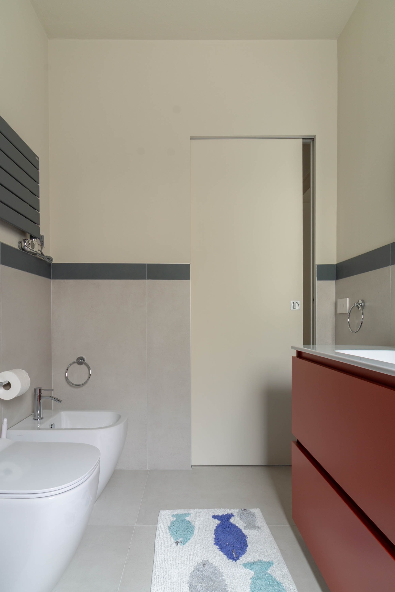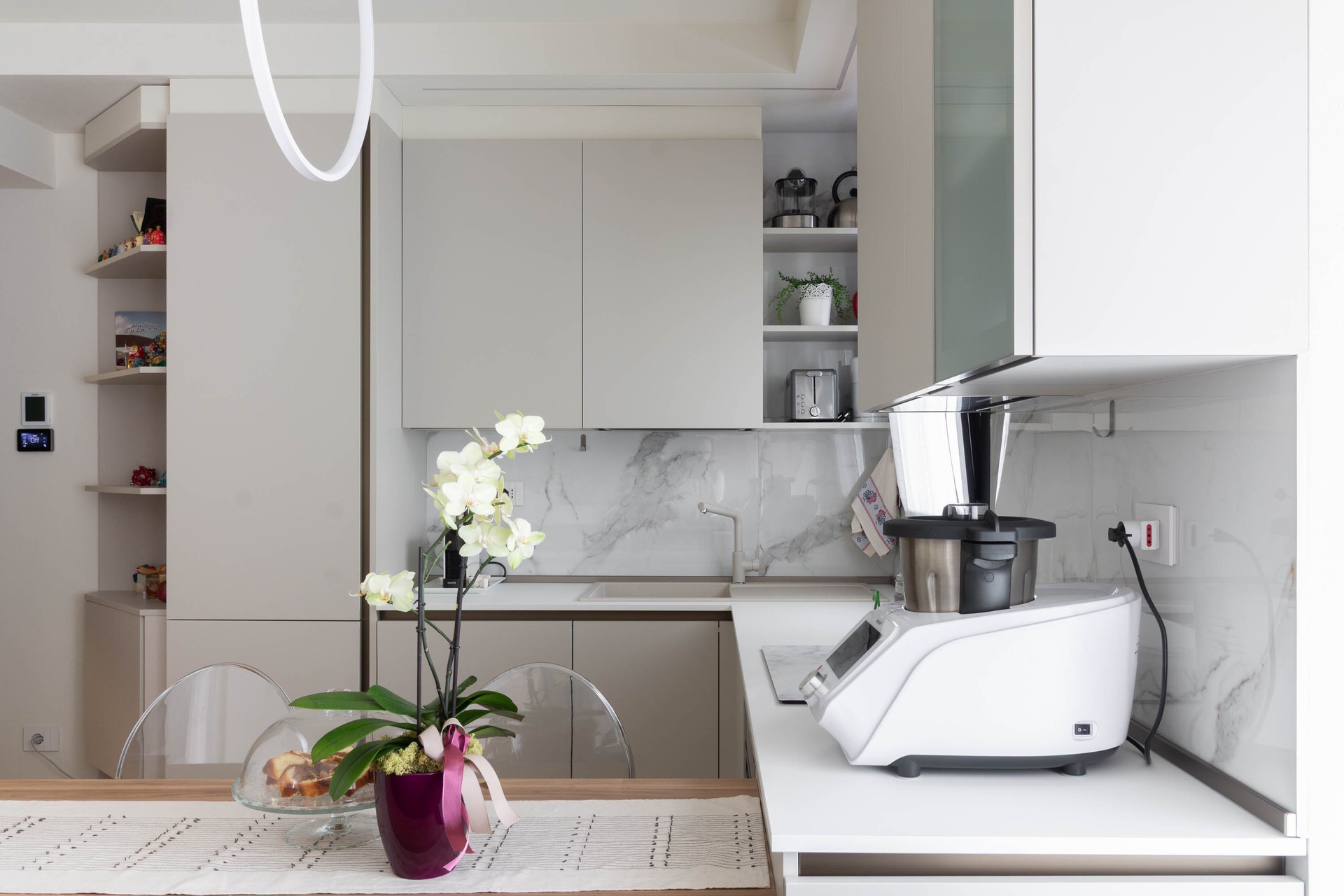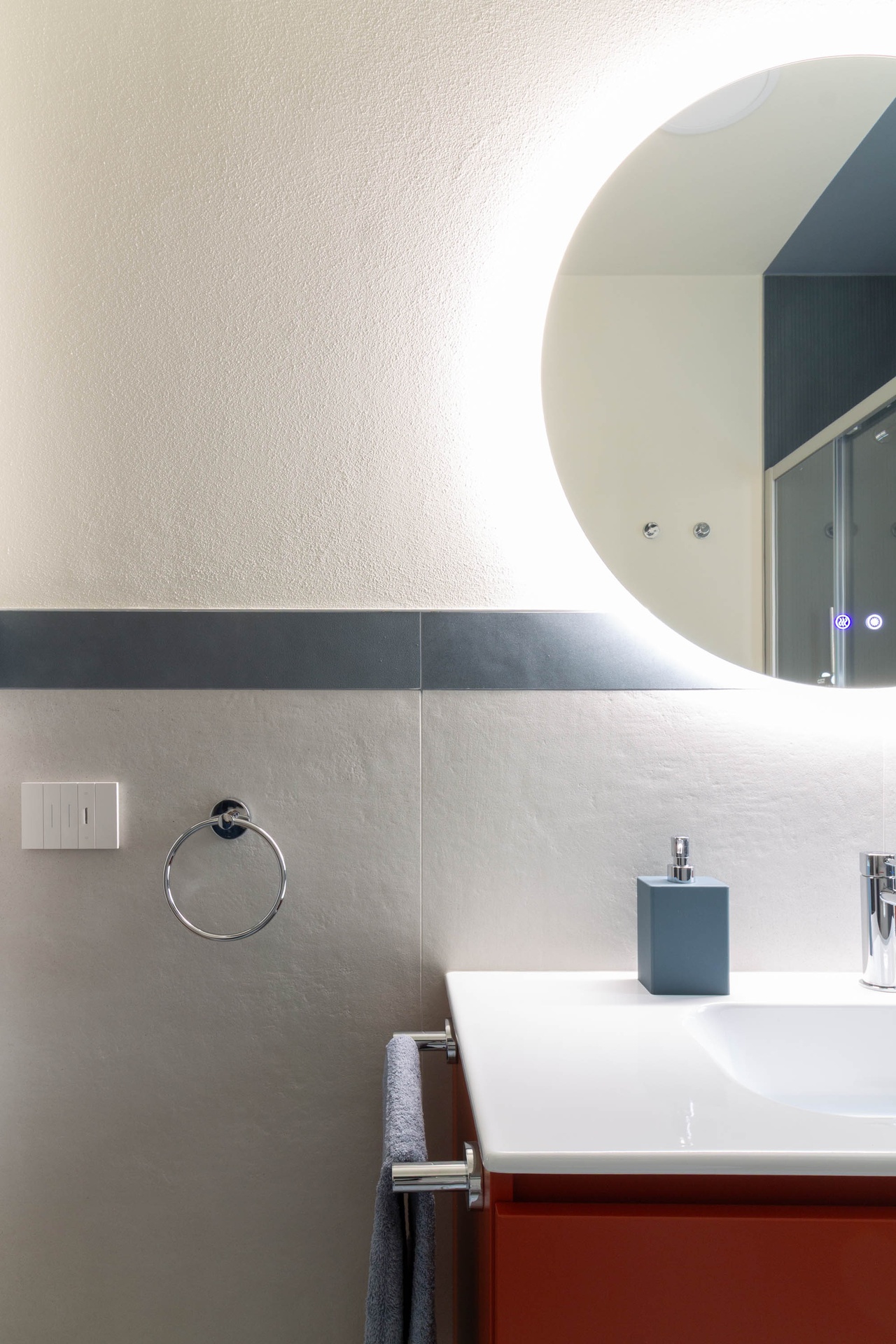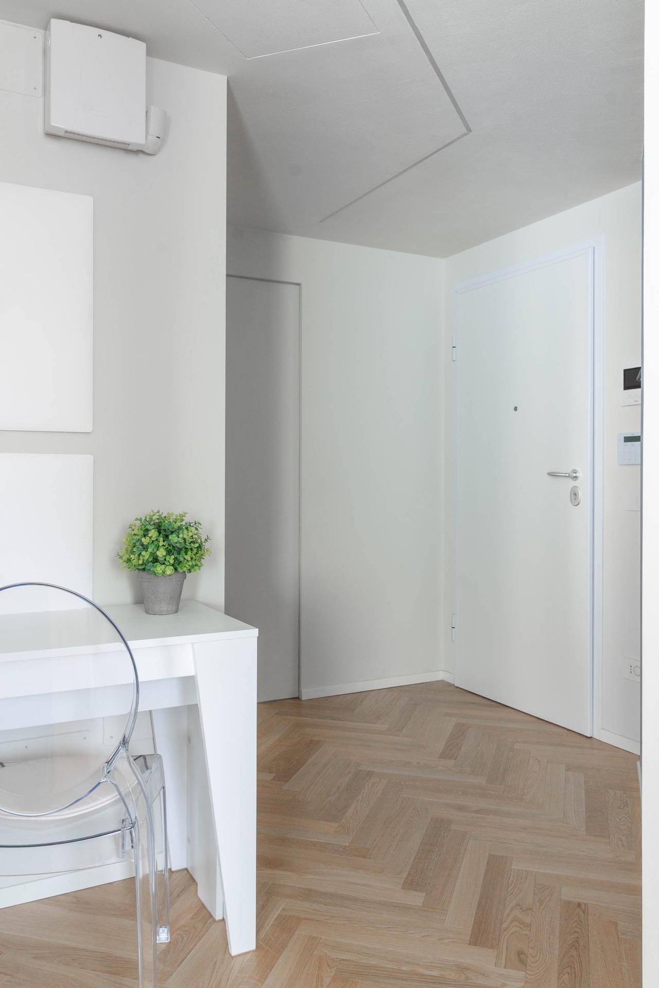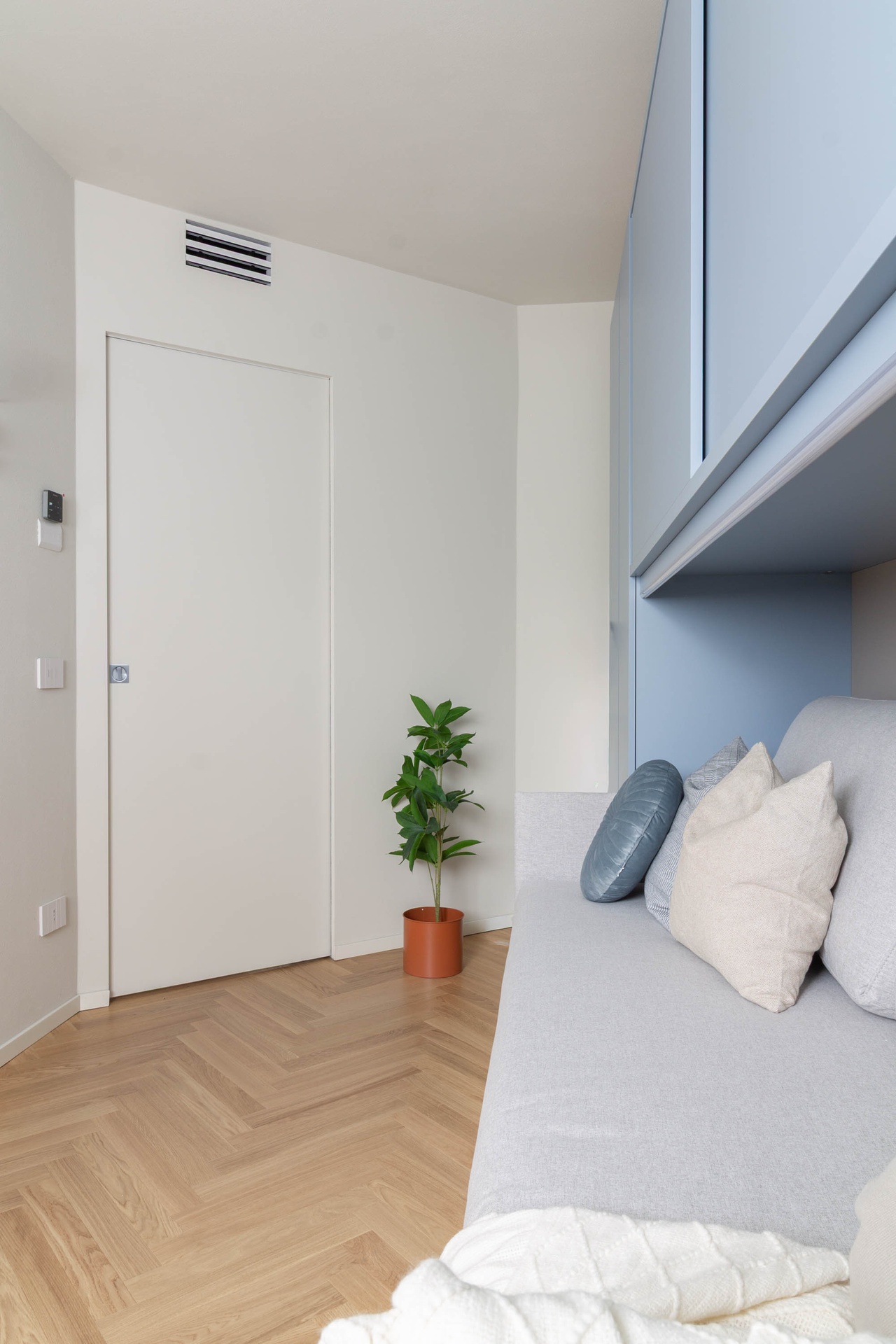 Compact CHIC è il risultato di un anno di lavoro, di cantiere e di immaginazione. Un alloggio in una palazzina di nuova costruzione, dove ho avuto il piacere di seguire ogni fase – dal progetto alla scelta delle finiture, fino all’arredo su misura.In meno di 60 mq trovano posto due camere da letto, due bagni (uno con lavanderia) e una zona giorno con cucina. A completare il tutto, uno spazio esterno trasformato da semplice terrazza in un giardino pensile con pergolato, un piccolo rifugio verde sospeso tra cielo e città.La pianta è stata studiata con estrema cura per ottimizzare ogni centimetro: ogni arredo è pensato su misura, ogni spazio dialoga con il successivo per garantire comfort e leggerezza visiva. L’obiettivo era quello di creare un ambiente che fosse al tempo stesso funzionale, accogliente e trasformabile.Gli interni giocano con il colore come elemento identitario.Le finiture, scelte tra capitolato ed extra, compongono un insieme contemporaneo e vivace, in cui la luce e i materiali dialogano armoniosamente. La carta da parati del soggiorno diventa il fulcro visivo: nasconde la TV tra i suoi riquadri e introduce una palette cromatica che si ripete con coerenza in tutti gli ambienti, legando tra loro pareti, arredi e complementi.Ogni elemento è stato pensato per moltiplicare le possibilità: il tavolo/penisola, realizzato su disegno, si estende grazie a una consolle allungabile e permette di accogliere fino a dieci persone semplicemente spostando il divano; nella camera ¾, un divano si trasforma in letto matrimoniale per gli ospiti, mantenendo intatta la pulizia formale dello spazio.Il risultato è una casa che sorprende per equilibrio e carattere: piccola nelle dimensioni, ma grande nello stile.