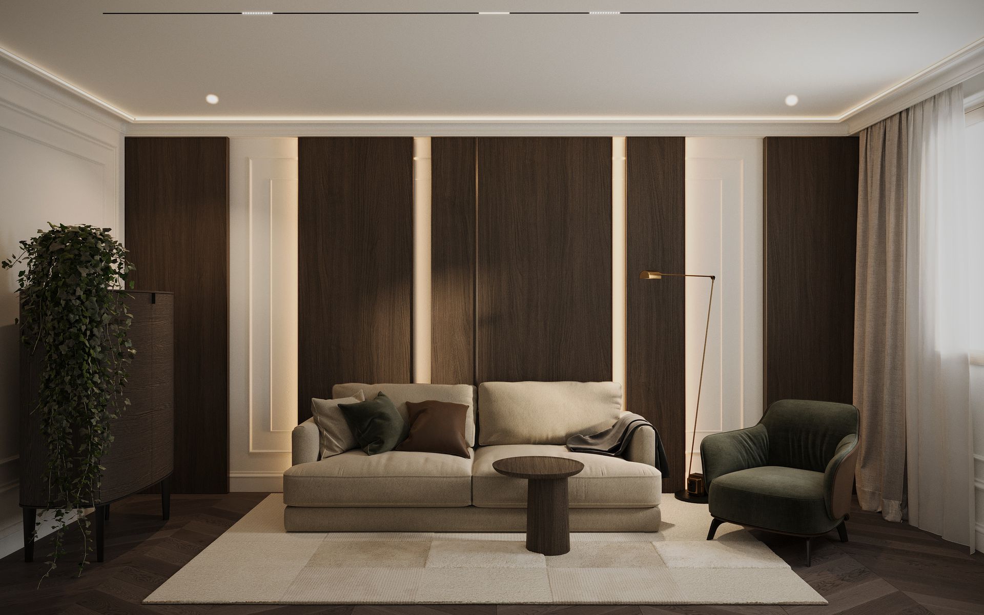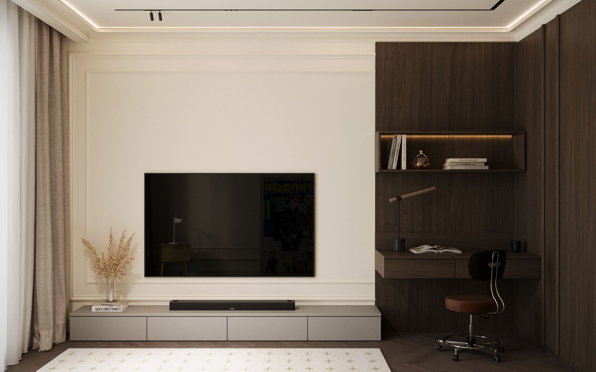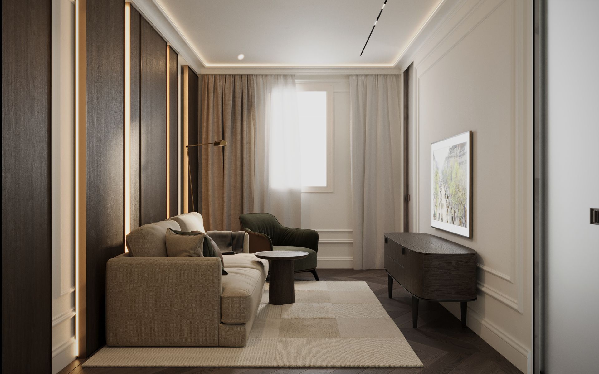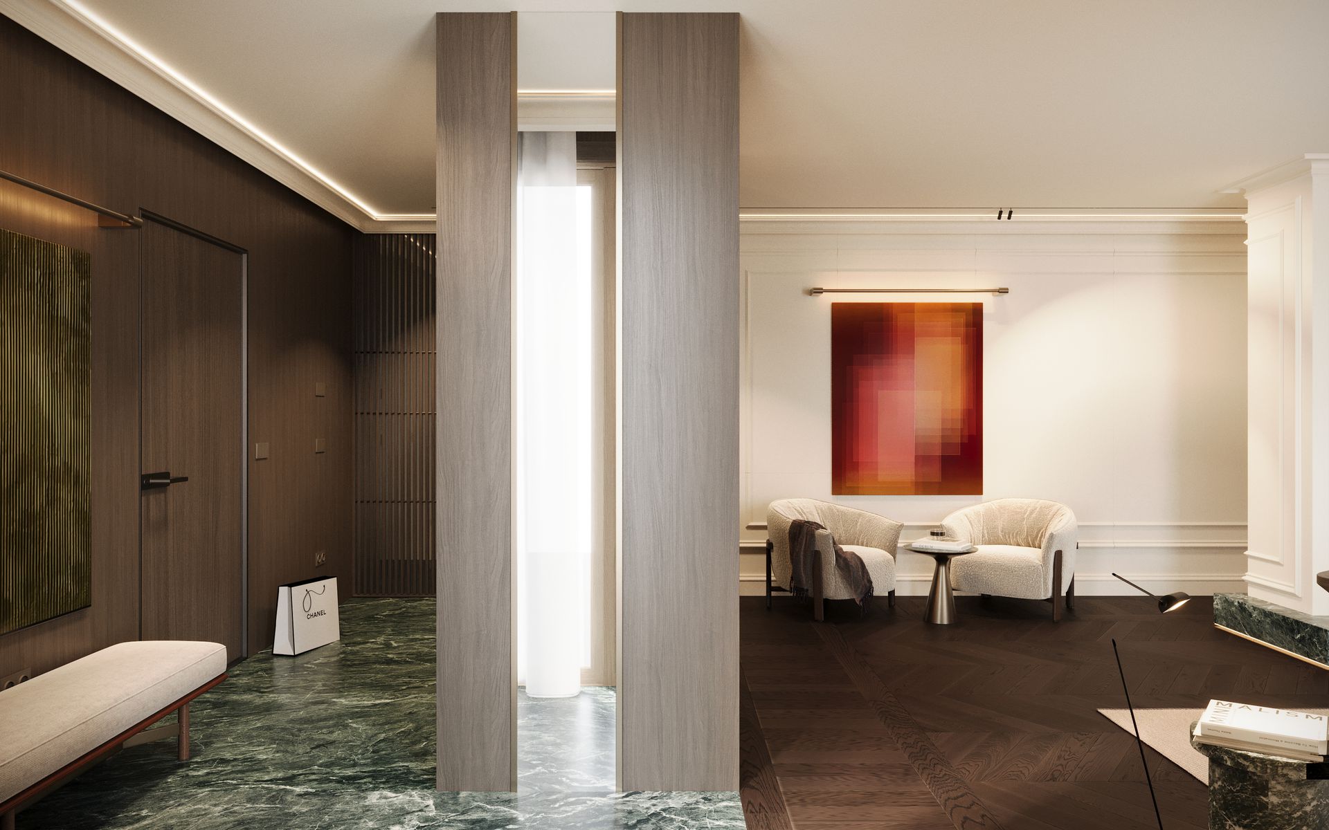 Un progetto che esplora un linguaggio classico reinterpretato attraverso una sensibilità contemporanea, dove equilibrio, proporzione e materia diventano i veri protagonisti dello spazio. Gli ambienti si sviluppano attorno a una palette calda e naturale, in cui le tonalità del beige, del tortora e del legno dialogano con superfici più profonde, generando un contrasto elegante e misurato.