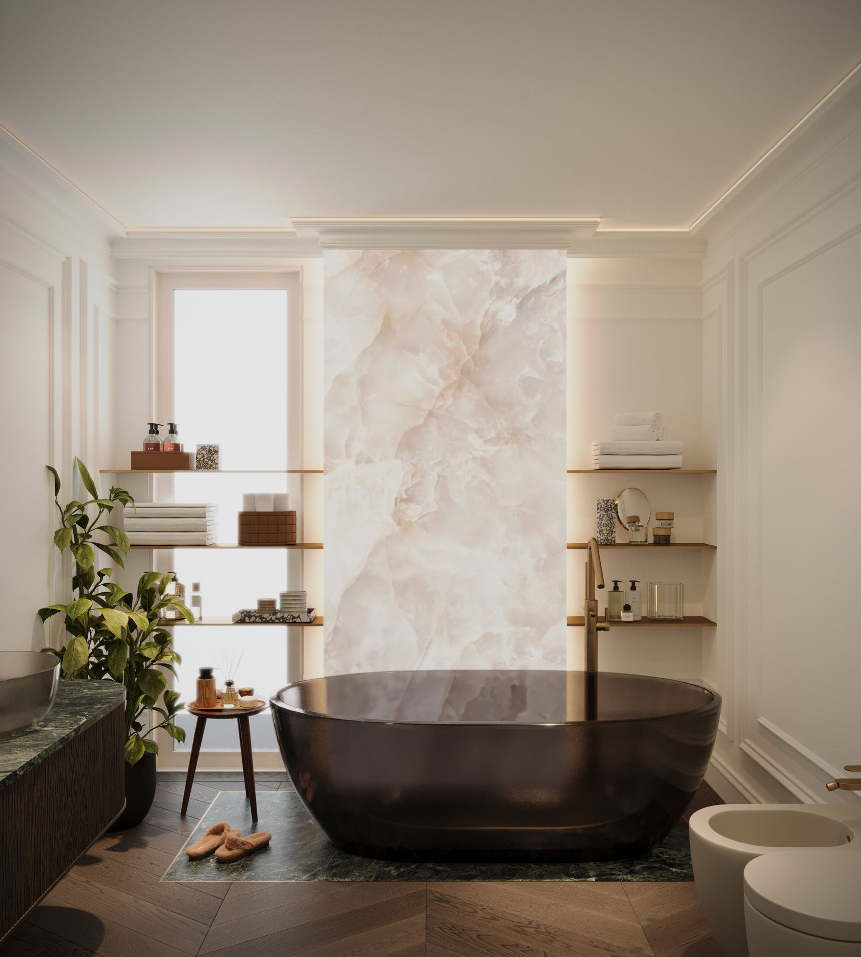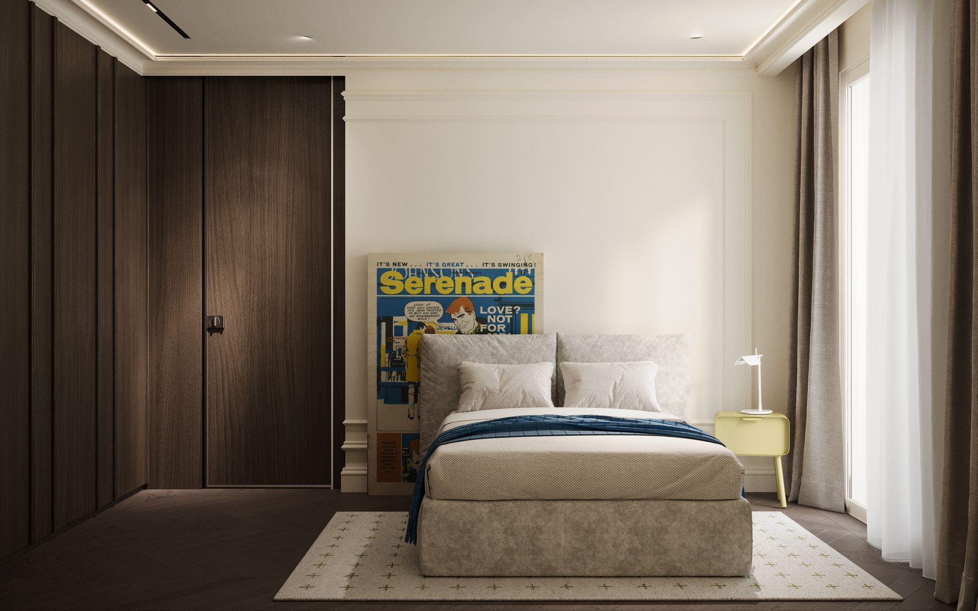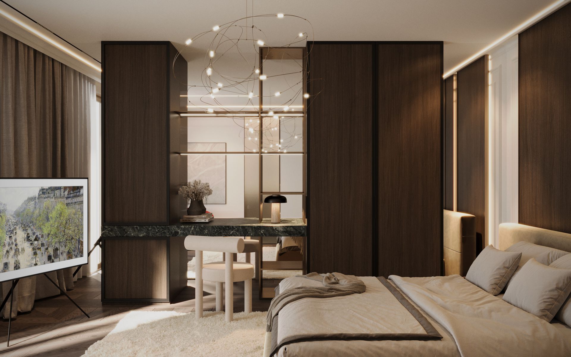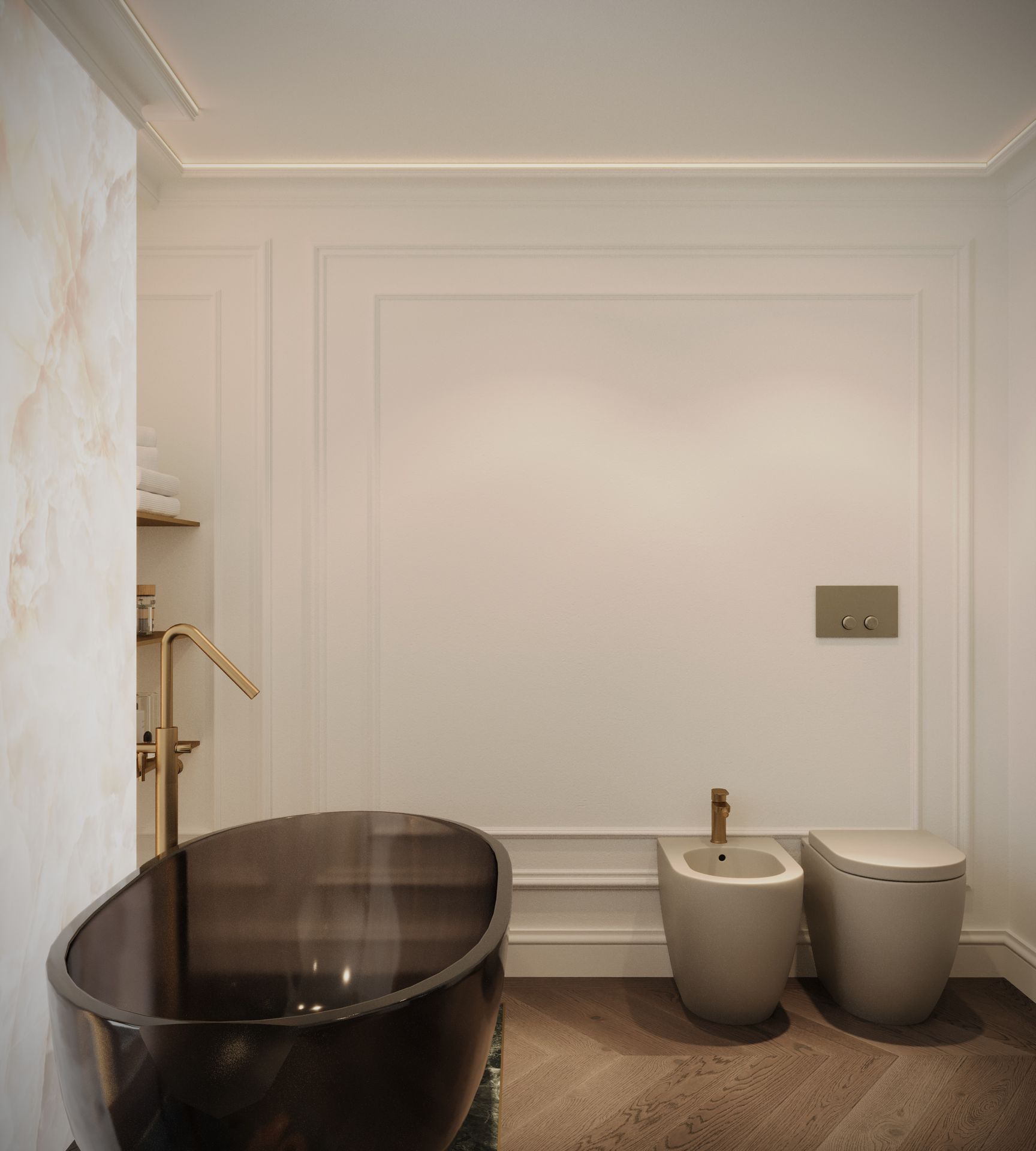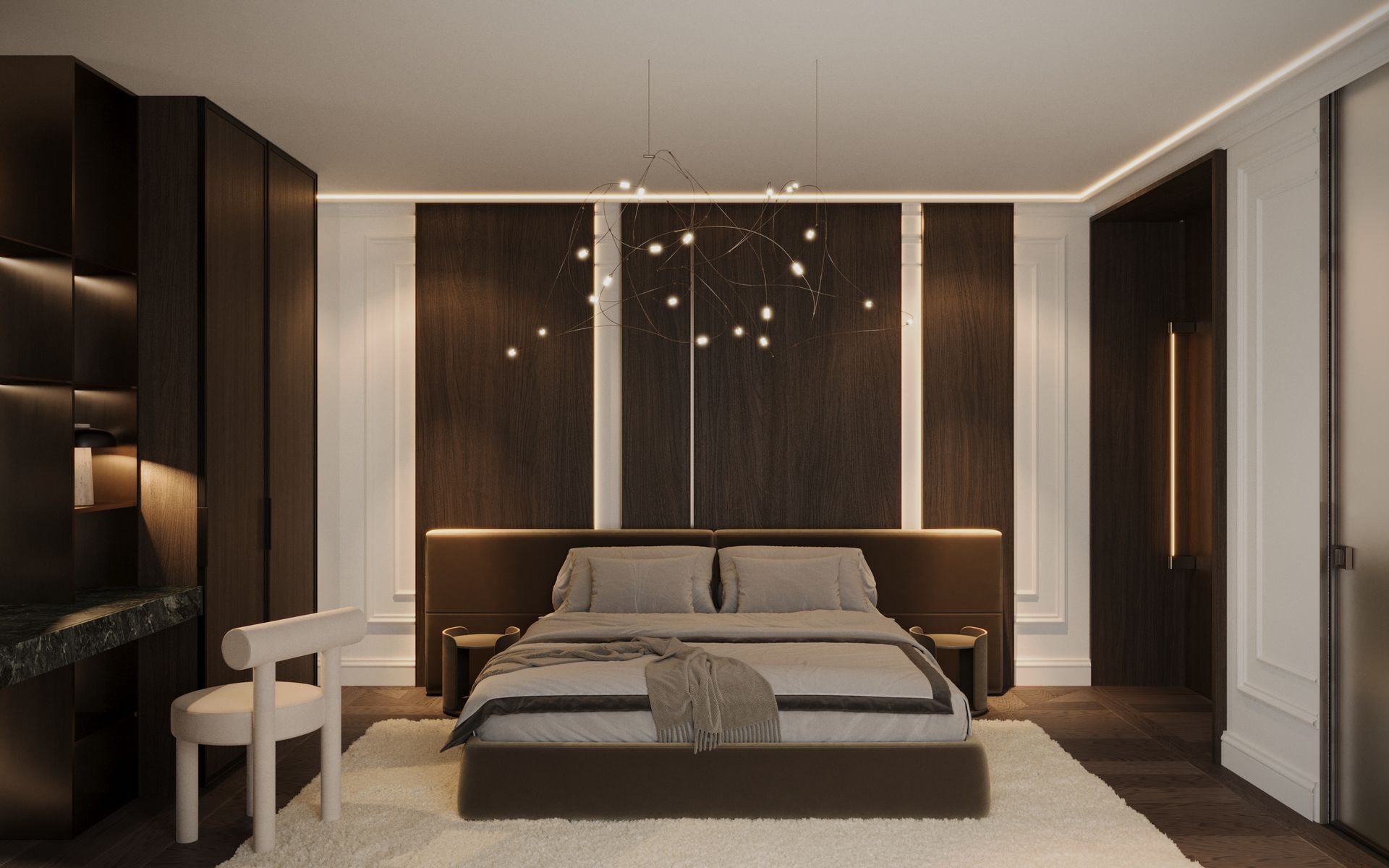 Un progetto che esplora un linguaggio classico reinterpretato attraverso una sensibilità contemporanea, dove equilibrio, proporzione e materia diventano i veri protagonisti dello spazio. Gli ambienti si sviluppano attorno a una palette calda e naturale, in cui le tonalità del beige, del tortora e del legno dialogano con superfici più profonde, generando un contrasto elegante e misurato.