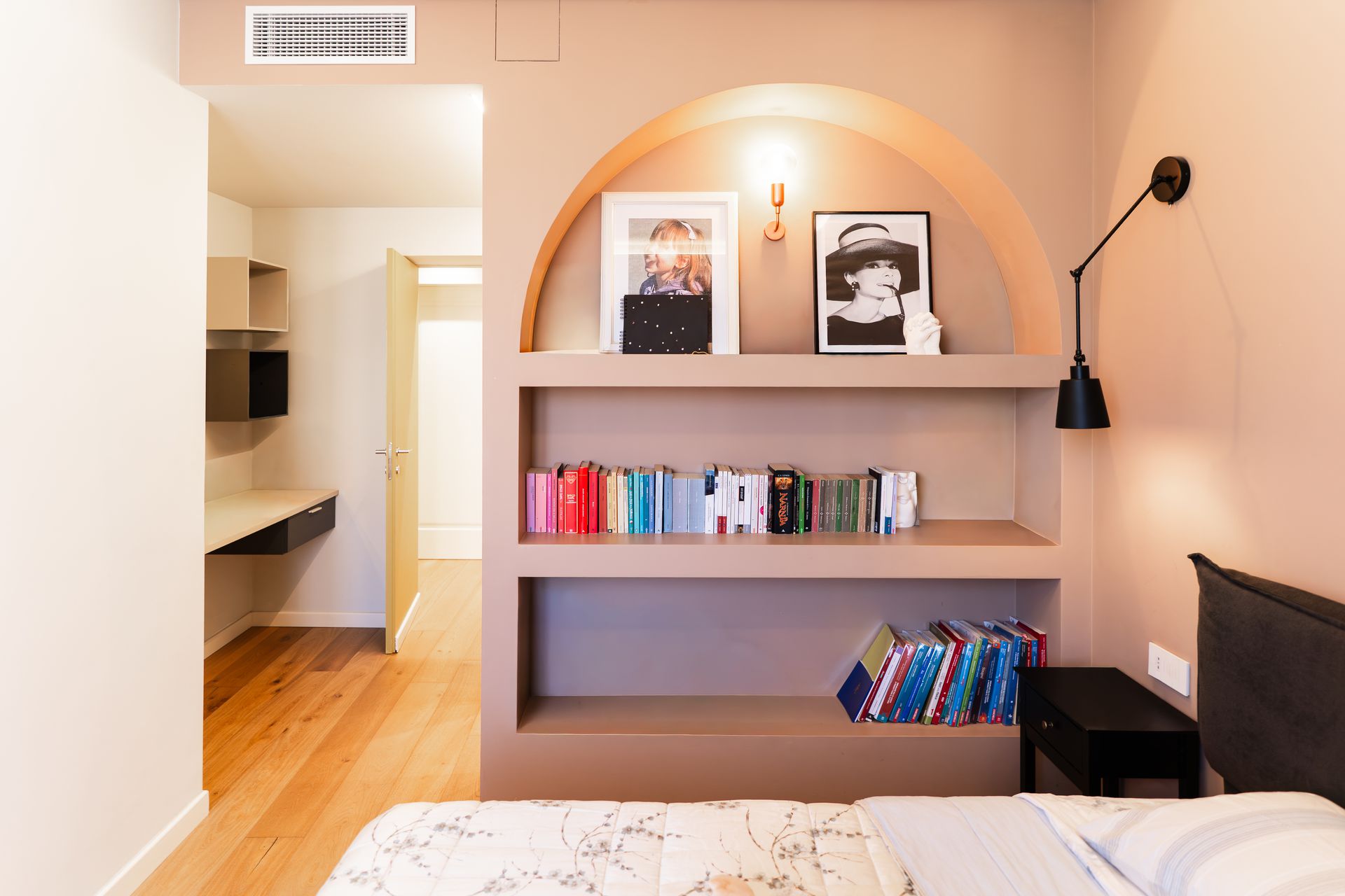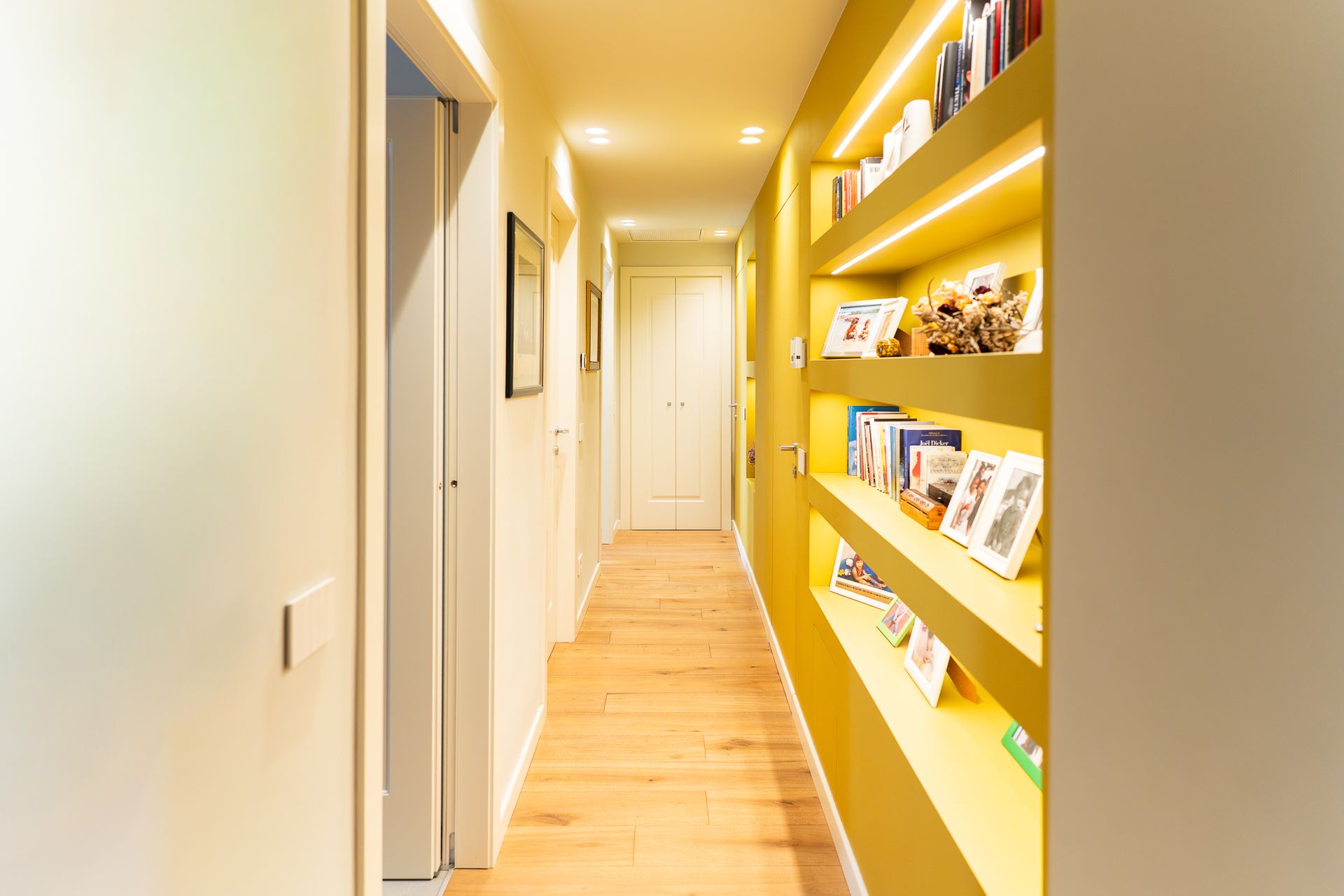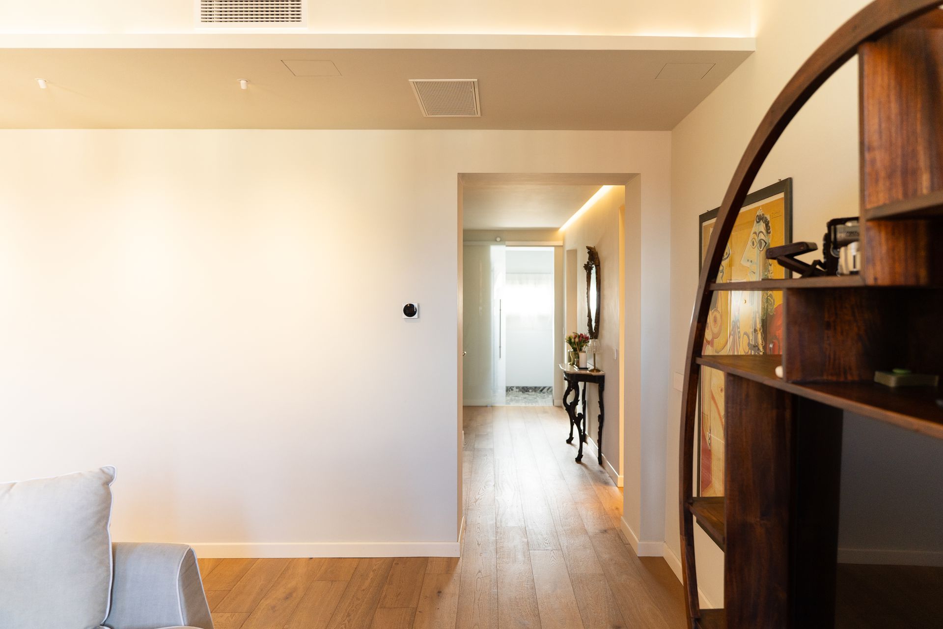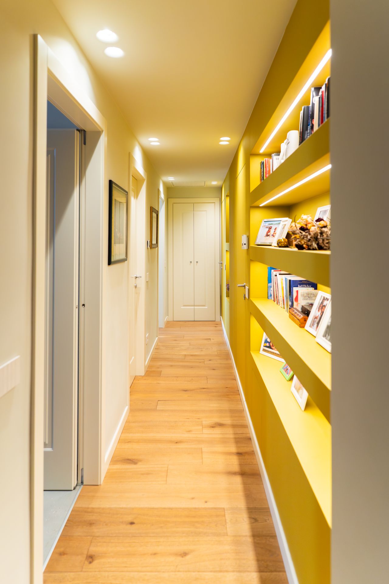 Nel cuore del centro storico, questo appartamento occupa l’intero piano di un edificio d’epoca e si distingue per la sua particolare forma trapezoidale, una configurazione planimetrica tutt’altro che convenzionale. Finestre e muri portanti hanno rappresentato vincoli progettuali precisi, trasformati in opportunità per dare vita a uno spazio fluido, funzionale e ricco di carattere.L’ingresso esistente si articola su un doppio accesso, uno diretto dall’ascensore che conduce all’interno dell’abitazione e uno dalla porta blindata, introducendo a uno spazio distributivo dove, da un lato, il bagno di servizio con porta in vetro lascia filtrare la luce naturale, accompagnando lo sguardo verso la zona giorno e il corridoio.L’ampia zona living accoglie l’arredo etnico già in possesso della famiglia, integrandolo armoniosamente nel nuovo progetto.Nella parte finale del trapezio è stato ricavato uno studio, separato da una struttura che genera nicchie espositive verso il soggiorno e spazi contenitivi verso l’ufficio. Un elemento architettonico che organizza e caratterizza lo spazio, mantenendo un dialogo visivo tra le funzioni.Elemento tipico delle case storiche, il corridoio è stato valorizzato e reinterpretato diventando parte attiva del progetto. Lungo il suo sviluppo prende forma una libreria in nicchia realizzata su misura in muratura, dipinta in un intenso giallo senape. Le mensole illuminate ne enfatizzano la profondità, trasformandolo in un percorso scenografico che accompagna e connette gli ambienti.La vera chicca del progetto è il bagno in suite: uno spazio completamente rivestito in resina color terracotta, dove pareti, soffitto e pavimento creano un sofisticato effetto “scatola” avvolgente.La doccia bifacciale, delimitata da un vetro cannettato, si apre verso la camera matrimoniale permettendo alla luce naturale di filtrare all’interno e amplificando la percezione dello spazio. Un ambiente intimo e sensoriale, pensato come un piccolo rifugio domestico. All’interno della camera padronale trova spazio una cabina armadio, ricavata riducendo la seconda matrimoniale, chiusa da eleganti porte scorrevoli in vetro con profili neri.Particolare attenzione è stata dedicata alle esigenze delle donne di casa, madre e figlia, per le quali è stato ricavato un angolo vanity personale nella divisione tra le due camere. La figlia dispone inoltre di una piccola cabina armadio privata, pensata per garantire autonomia e funzionalità in uno spazio contenuto.La cucina rimane volutamente separata dalla zona giorno, come richiesto dalla committenza. Il carattere è “senza tempo”: cementine a pavimento e come rivestimento del paraschizzi dialogano con una cucina rustica in legno dai dettagli bianchi, creando un equilibrio tra tradizione e contemporaneità.Completano l’appartamento la camera del figlio, volutamente semplice ed essenziale, due ripostigli, un bagno rivestito in piastrelle stile terrazzo con grande doccia walk-in e un bagno ospiti con porta in vetro, rivestito anch’esso in cementine, ma declinate in una raffinata tonalità nera.Un caldo parquet accompagna l’intero sviluppo dell’abitazione, contribuendo a creare un’atmosfera accogliente e coerente.Illuminazione e abbassamenti in cartongesso sono stati studiati per definire percorsi, volumi e gerarchie spaziali, dando vita ad ambienti dalle atmosfere uniche, capaci di cambiare percezione nel corso della giornata.Un progetto complesso, nato da vincoli precisi e desideri ambiziosi, che ha trovato la sua forma attraverso un dialogo costante e autentico tra Cliente e Architetto, trasformando ogni limite in opportunità e ogni richiesta in spazio vissuto.