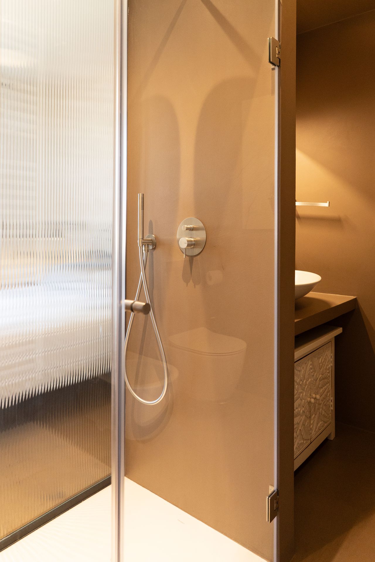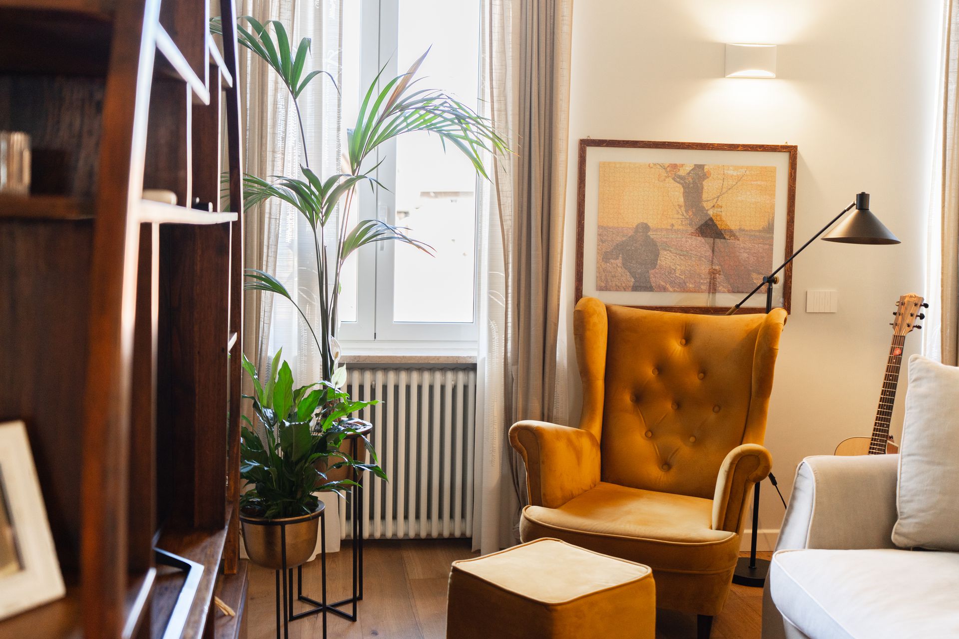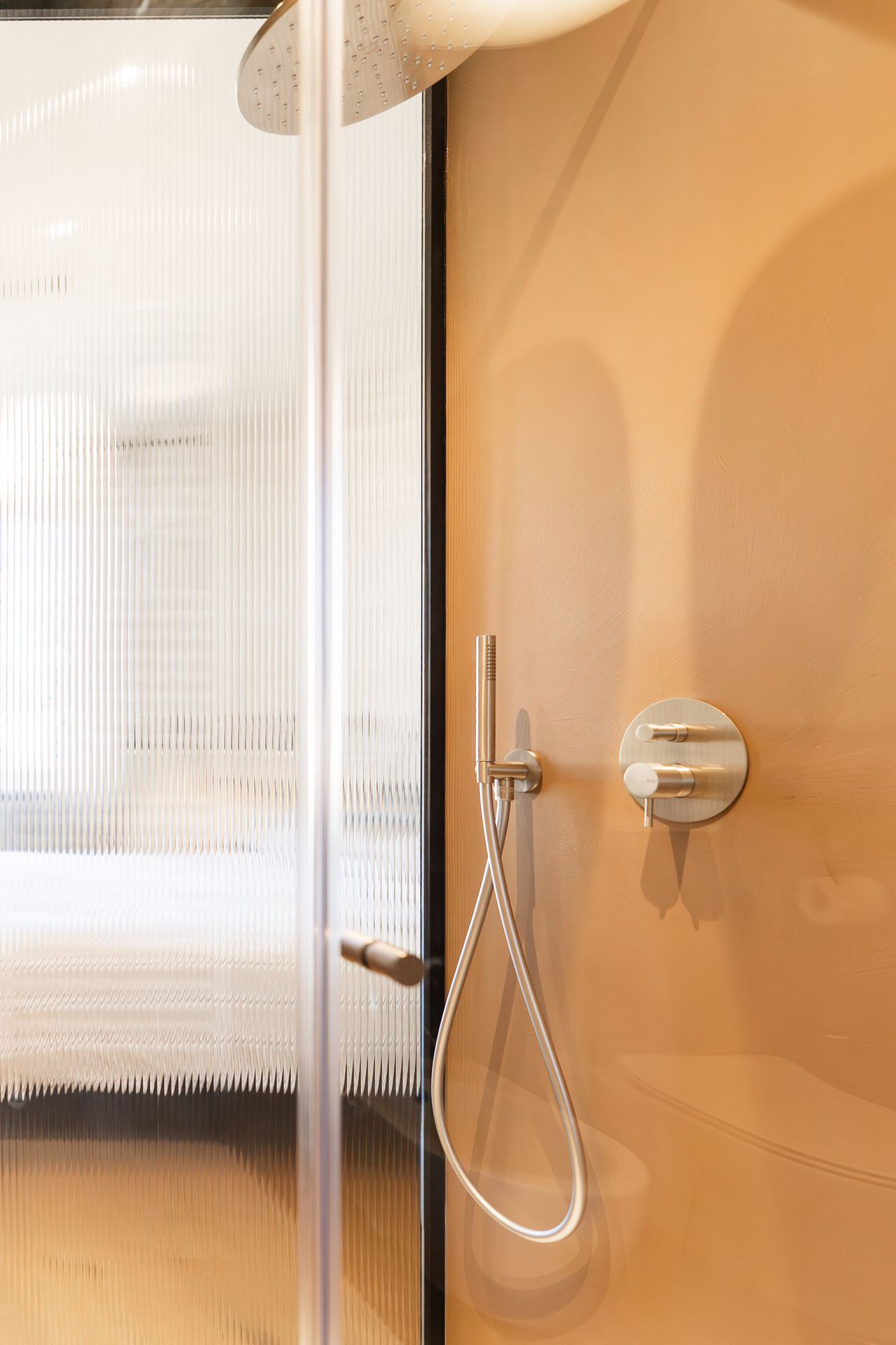 Nel cuore del centro storico, questo appartamento occupa l’intero piano di un edificio d’epoca e si distingue per la sua particolare forma trapezoidale, una configurazione planimetrica tutt’altro che convenzionale. Finestre e muri portanti hanno rappresentato vincoli progettuali precisi, trasformati in opportunità per dare vita a uno spazio fluido, funzionale e ricco di carattere.L’ingresso esistente si articola su un doppio accesso, uno diretto dall’ascensore che conduce all’interno dell’abitazione e uno dalla porta blindata, introducendo a uno spazio distributivo dove, da un lato, il bagno di servizio con porta in vetro lascia filtrare la luce naturale, accompagnando lo sguardo verso la zona giorno e il corridoio.L’ampia zona living accoglie l’arredo etnico già in possesso della famiglia, integrandolo armoniosamente nel nuovo progetto.Nella parte finale del trapezio è stato ricavato uno studio, separato da una struttura che genera nicchie espositive verso il soggiorno e spazi contenitivi verso l’ufficio. Un elemento architettonico che organizza e caratterizza lo spazio, mantenendo un dialogo visivo tra le funzioni.Elemento tipico delle case storiche, il corridoio è stato valorizzato e reinterpretato diventando parte attiva del progetto. Lungo il suo sviluppo prende forma una libreria in nicchia realizzata su misura in muratura, dipinta in un intenso giallo senape. Le mensole illuminate ne enfatizzano la profondità, trasformandolo in un percorso scenografico che accompagna e connette gli ambienti.La vera chicca del progetto è il bagno in suite: uno spazio completamente rivestito in resina color terracotta, dove pareti, soffitto e pavimento creano un sofisticato effetto “scatola” avvolgente.La doccia bifacciale, delimitata da un vetro cannettato, si apre verso la camera matrimoniale permettendo alla luce naturale di filtrare all’interno e amplificando la percezione dello spazio. Un ambiente intimo e sensoriale, pensato come un piccolo rifugio domestico. All’interno della camera padronale trova spazio una cabina armadio, ricavata riducendo la seconda matrimoniale, chiusa da eleganti porte scorrevoli in vetro con profili neri.Particolare attenzione è stata dedicata alle esigenze delle donne di casa, madre e figlia, per le quali è stato ricavato un angolo vanity personale nella divisione tra le due camere. La figlia dispone inoltre di una piccola cabina armadio privata, pensata per garantire autonomia e funzionalità in uno spazio contenuto.La cucina rimane volutamente separata dalla zona giorno, come richiesto dalla committenza. Il carattere è “senza tempo”: cementine a pavimento e come rivestimento del paraschizzi dialogano con una cucina rustica in legno dai dettagli bianchi, creando un equilibrio tra tradizione e contemporaneità.Completano l’appartamento la camera del figlio, volutamente semplice ed essenziale, due ripostigli, un bagno rivestito in piastrelle stile terrazzo con grande doccia walk-in e un bagno ospiti con porta in vetro, rivestito anch’esso in cementine, ma declinate in una raffinata tonalità nera.Un caldo parquet accompagna l’intero sviluppo dell’abitazione, contribuendo a creare un’atmosfera accogliente e coerente.Illuminazione e abbassamenti in cartongesso sono stati studiati per definire percorsi, volumi e gerarchie spaziali, dando vita ad ambienti dalle atmosfere uniche, capaci di cambiare percezione nel corso della giornata.Un progetto complesso, nato da vincoli precisi e desideri ambiziosi, che ha trovato la sua forma attraverso un dialogo costante e autentico tra Cliente e Architetto, trasformando ogni limite in opportunità e ogni richiesta in spazio vissuto.