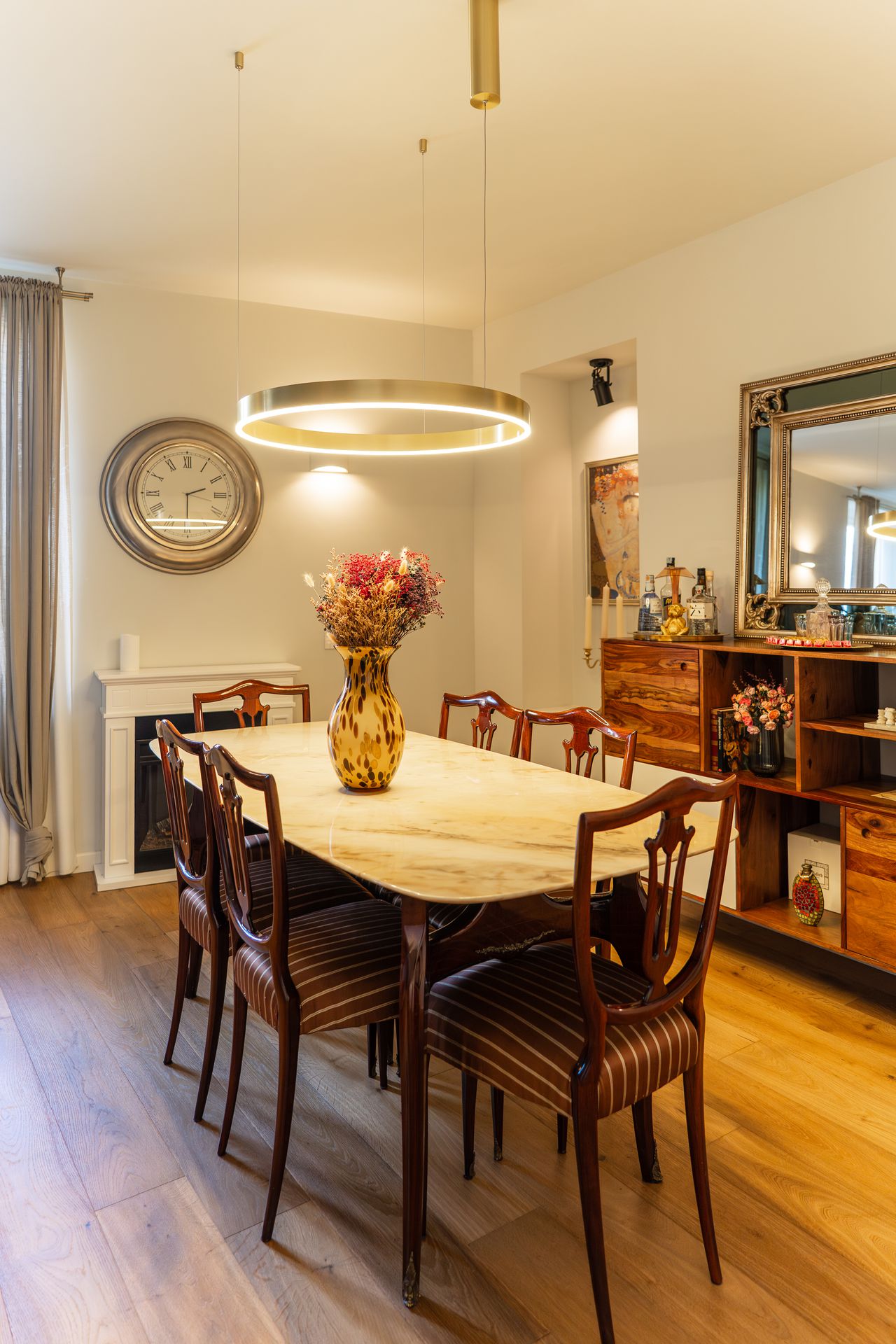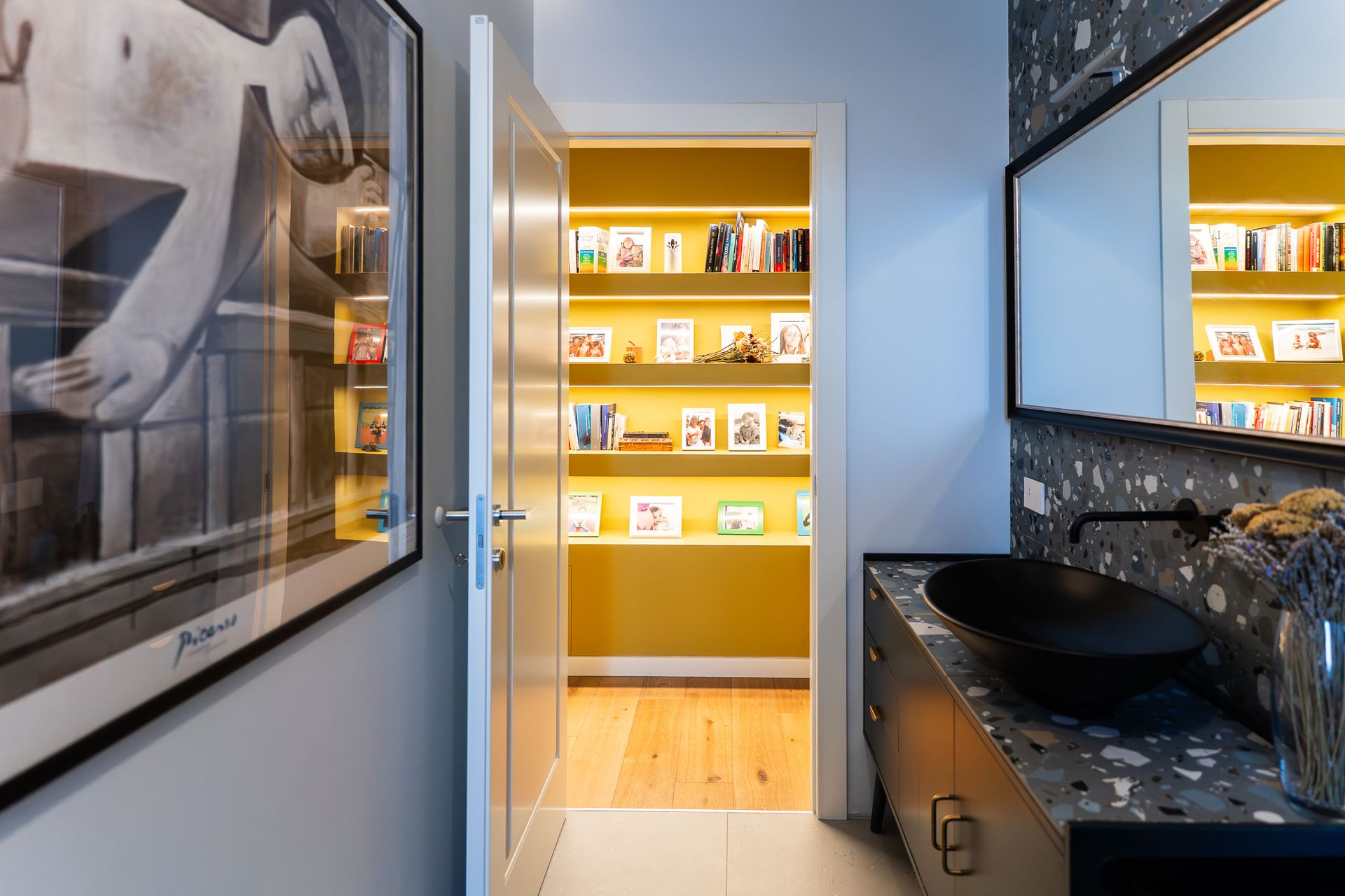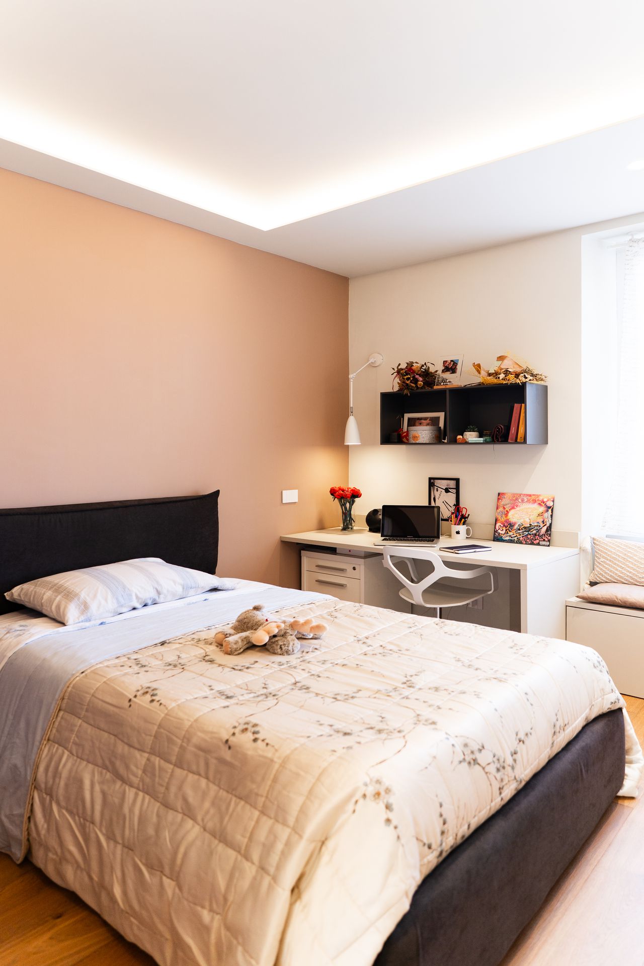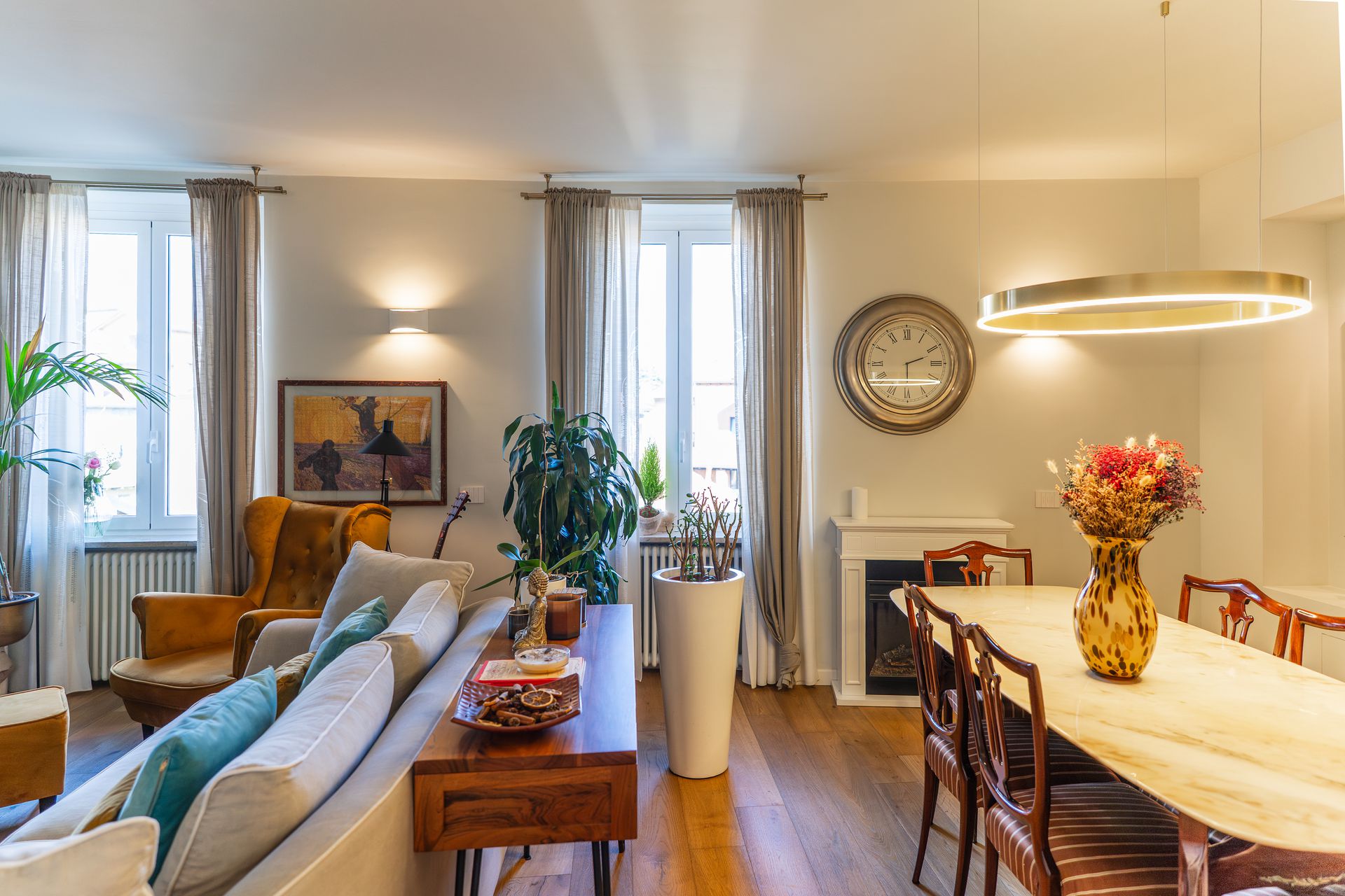 Nel cuore del centro storico, questo appartamento occupa l’intero piano di un edificio d’epoca e si distingue per la sua particolare forma trapezoidale, una configurazione planimetrica tutt’altro che convenzionale. Finestre e muri portanti hanno rappresentato vincoli progettuali precisi, trasformati in opportunità per dare vita a uno spazio fluido, funzionale e ricco di carattere.L’ingresso esistente si articola su un doppio accesso, uno diretto dall’ascensore che conduce all’interno dell’abitazione e uno dalla porta blindata, introducendo a uno spazio distributivo dove, da un lato, il bagno di servizio con porta in vetro lascia filtrare la luce naturale, accompagnando lo sguardo verso la zona giorno e il corridoio.L’ampia zona living accoglie l’arredo etnico già in possesso della famiglia, integrandolo armoniosamente nel nuovo progetto.Nella parte finale del trapezio è stato ricavato uno studio, separato da una struttura che genera nicchie espositive verso il soggiorno e spazi contenitivi verso l’ufficio. Un elemento architettonico che organizza e caratterizza lo spazio, mantenendo un dialogo visivo tra le funzioni.Elemento tipico delle case storiche, il corridoio è stato valorizzato e reinterpretato diventando parte attiva del progetto. Lungo il suo sviluppo prende forma una libreria in nicchia realizzata su misura in muratura, dipinta in un intenso giallo senape. Le mensole illuminate ne enfatizzano la profondità, trasformandolo in un percorso scenografico che accompagna e connette gli ambienti.La vera chicca del progetto è il bagno in suite: uno spazio completamente rivestito in resina color terracotta, dove pareti, soffitto e pavimento creano un sofisticato effetto “scatola” avvolgente.La doccia bifacciale, delimitata da un vetro cannettato, si apre verso la camera matrimoniale permettendo alla luce naturale di filtrare all’interno e amplificando la percezione dello spazio. Un ambiente intimo e sensoriale, pensato come un piccolo rifugio domestico. All’interno della camera padronale trova spazio una cabina armadio, ricavata riducendo la seconda matrimoniale, chiusa da eleganti porte scorrevoli in vetro con profili neri.Particolare attenzione è stata dedicata alle esigenze delle donne di casa, madre e figlia, per le quali è stato ricavato un angolo vanity personale nella divisione tra le due camere. La figlia dispone inoltre di una piccola cabina armadio privata, pensata per garantire autonomia e funzionalità in uno spazio contenuto.La cucina rimane volutamente separata dalla zona giorno, come richiesto dalla committenza. Il carattere è “senza tempo”: cementine a pavimento e come rivestimento del paraschizzi dialogano con una cucina rustica in legno dai dettagli bianchi, creando un equilibrio tra tradizione e contemporaneità.Completano l’appartamento la camera del figlio, volutamente semplice ed essenziale, due ripostigli, un bagno rivestito in piastrelle stile terrazzo con grande doccia walk-in e un bagno ospiti con porta in vetro, rivestito anch’esso in cementine, ma declinate in una raffinata tonalità nera.Un caldo parquet accompagna l’intero sviluppo dell’abitazione, contribuendo a creare un’atmosfera accogliente e coerente.Illuminazione e abbassamenti in cartongesso sono stati studiati per definire percorsi, volumi e gerarchie spaziali, dando vita ad ambienti dalle atmosfere uniche, capaci di cambiare percezione nel corso della giornata.Un progetto complesso, nato da vincoli precisi e desideri ambiziosi, che ha trovato la sua forma attraverso un dialogo costante e autentico tra Cliente e Architetto, trasformando ogni limite in opportunità e ogni richiesta in spazio vissuto.