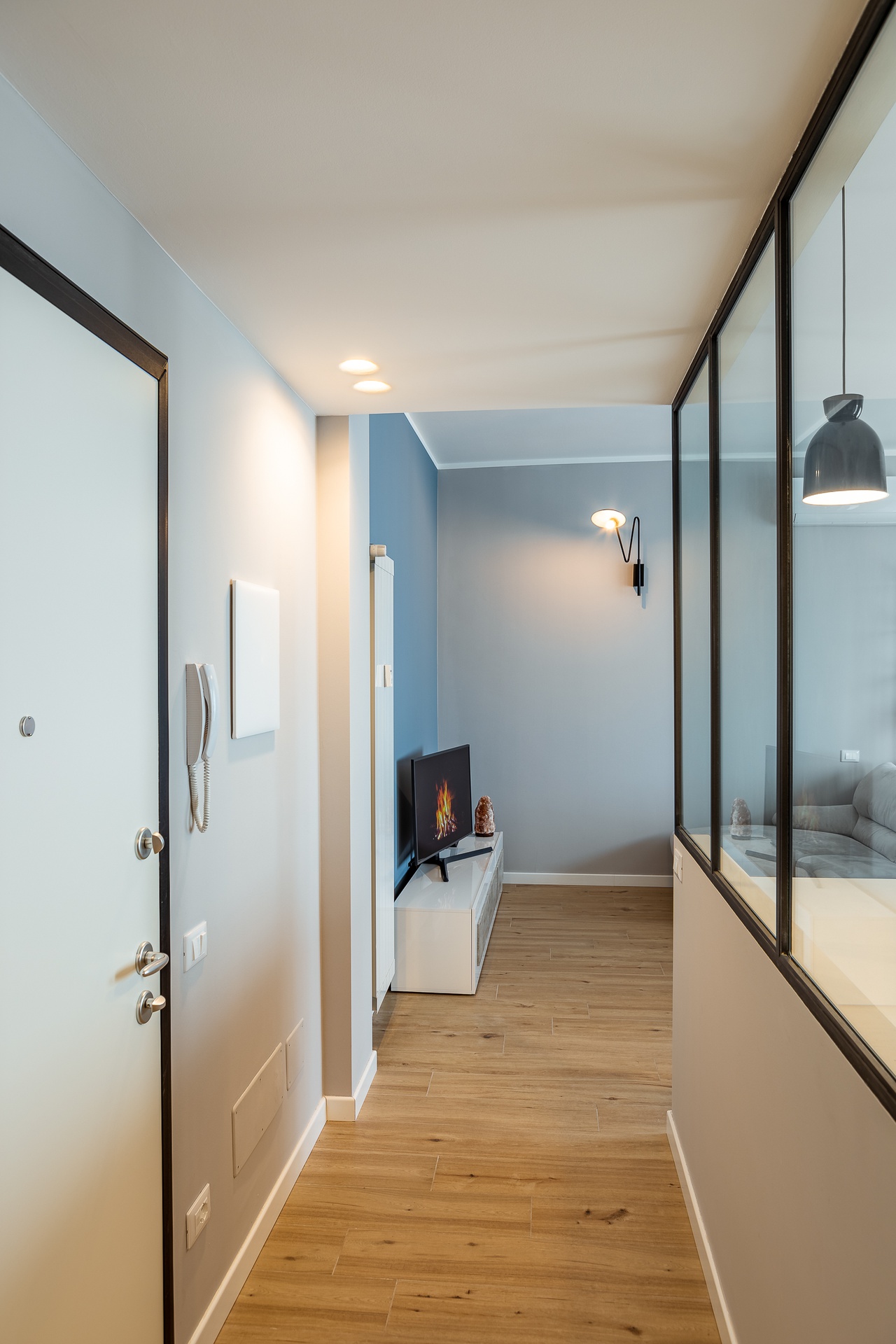 CSH è un progetto sartoriale, cucito su misura sulle esigenze della cliente, dove tutti i dettagli sono stati curati con attenzione, dall’arredo alle luci, in un perfetto connubio tra estetica e funzionalità.CONCEPT - l’idea è quella di cambiare veste a un classico appartamento con un taglio anni 70, andando ad unificare gli spazi di soggiorno e cucina, creando una zona living luminosa e funzionale, e dividendo lo spazio della camera da letto con una cabina armadio ed armadiature fisse.Punto focale del progetto è la finestra interna che si presenta davanti a noi appena varcata la soglia di ingresso. Essa va a dividere spazialmente ma non visivamente l’ingresso dalla zona living, e la parte bassa dal lato opposto dell’ingresso funge come spalla al grande piano lavoro della cucina.LIVING - Caratterizzato da una grande finestra e due portefinestre che danno accesso al balcone esterno, la zona Living gode di un ottima luce naturale durante tutto l’arco della giornata. La cucina su misura in laccato opaco grigio e bianco con top in quarzo definisce la parete di fondo con colonne alte e pensili; mentre il piano lavoro, illuminato da due luci a sospensione, corre al di sotto della finestra interna in ferro. L’isola diventa il punto focale di collegamento tra lo spazio di lavoro e la zona relax, con un piano profondo che permette di creare una piccola zona colazione di fronte ai fuochi. Lo spazio prospiciente alla cucina viene suddiviso tra zona TV e zona pranzo. Qui la libreria su misura in stile industriale si rende protagonista dello spazio in quanto visibile da tutte le angolazioni della zona Living.BAGNO - Lo spazio interno alla stanza da bagno non è stato modificato dalle sue precedenti dimensioni, ma viene cambiata la disposizione e la tipologia degli elementi al suo interno. La parete di destra accoglie uno spazio tecnico per lavatrice ed asciugatrice, successivamente si susseguono la doccia e sanitari, mentre di fronte il lavabo a ciotola appoggiato su mobile, la rubinetteria a muro, lo specchio e la luce tecnica appesa a plafone creano uno spazio funzionale e minimale. Il gioco delle altezze delle piastrelle differente tra le diverse pareti e la creazione di nicchie movimentano uno spazio piccolo ma curato in ogni dettaglio.CAMERA - La zona notte rappresenta la personalità della cliente, viaggiatrice e precisa. Si accede scostando la porta scorrevole posta in controcampo rispetto alla zona living, evidenziata dai faretti rasomuro incassati nel ribassamento. La carta da parati che occupa tutta la testata letto riprende i toni freddi delle pareti grigie della zona Living, che si ammorbidiscono grazie all’inserimento di luci calde dallo stile industriale ma raffinato. All’ingresso della stanza si presenta un’armadio salva-spazio su misura che funge da zona filtro per arrivare al letto, mentre la cabina armadio lascia lo spazio libero da ingombranti armadi a tutta altezza.
