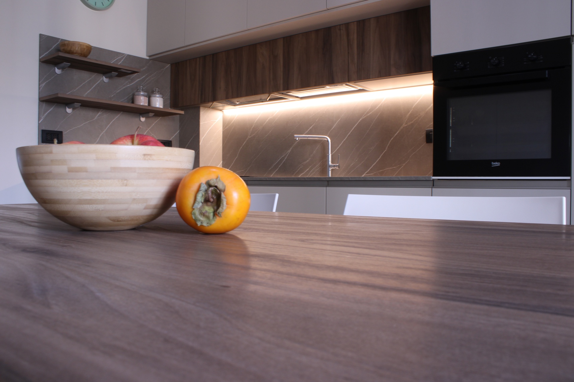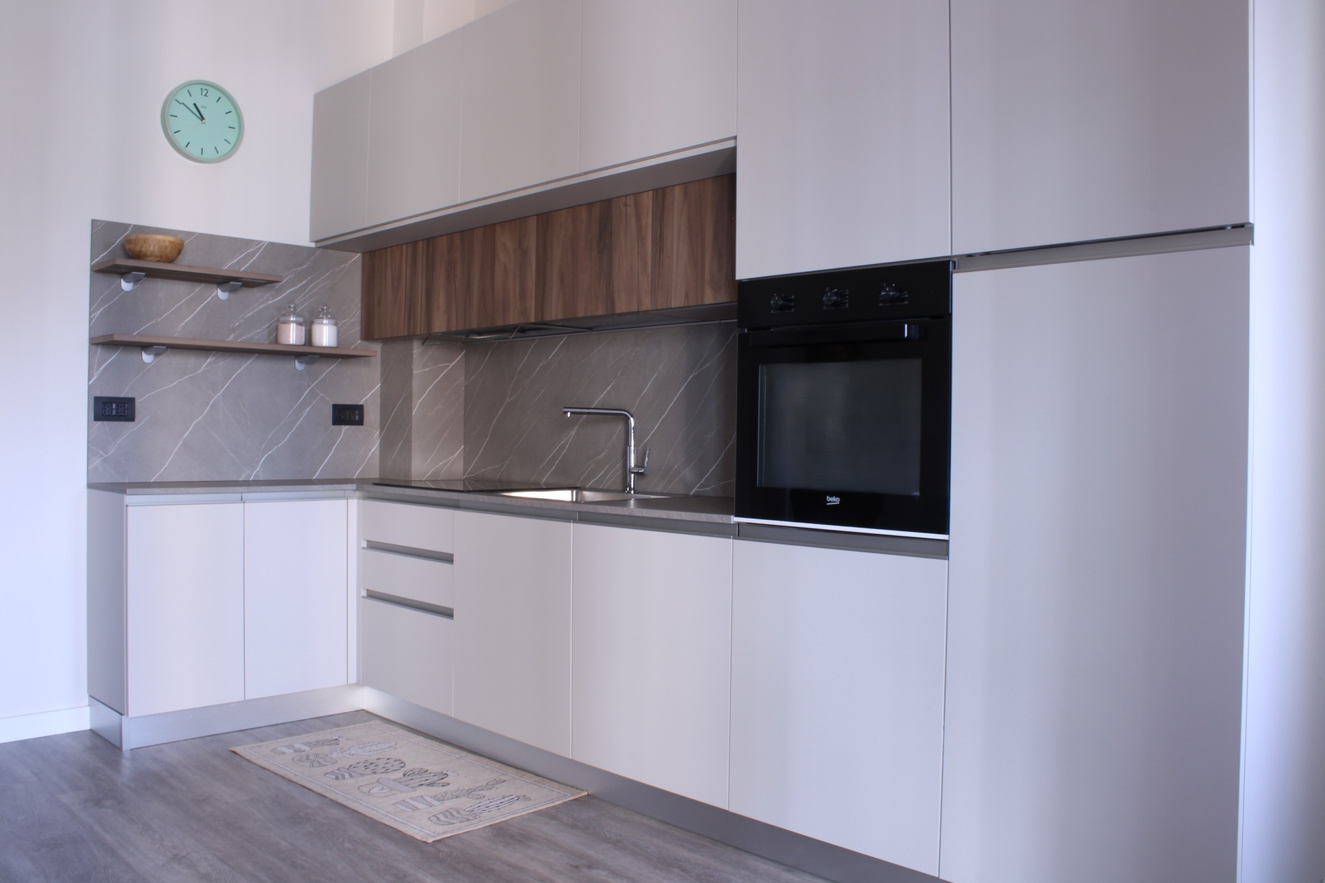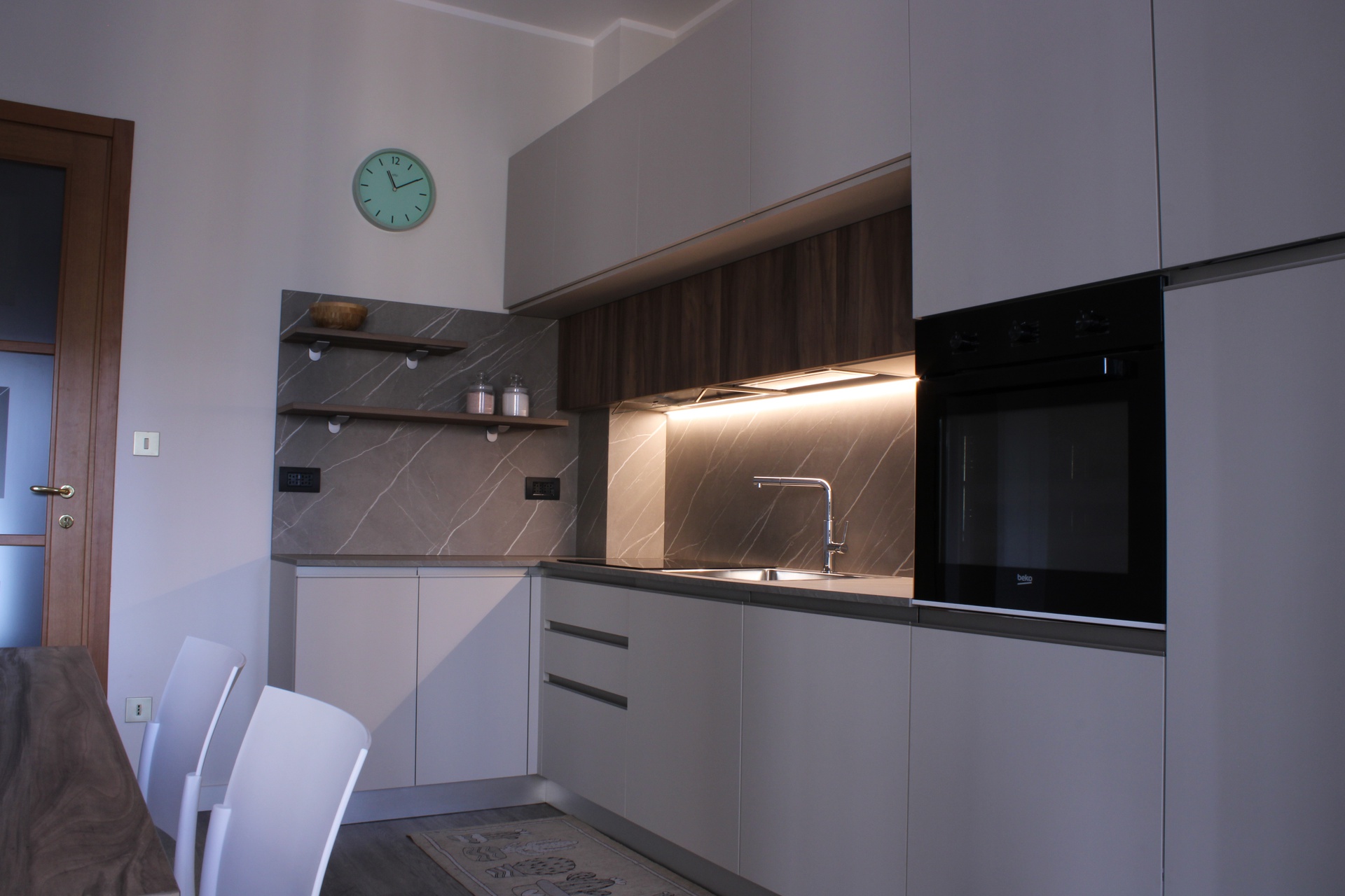 Realizzazione di una cucina moderna in un appartamento da ristrutturare senza opere invasive. L'ambiente era una tipologia di tinello con cucinino. Il cucinino è stato modificato a lavanderia mentre il tinello è diventato cucina abitabile. Il pavimento è stato rivestivo con vinilico ad incastro resistente all'umidità in tutto l'appartamento, mentre le porte sono rimaste quelle esistenti. La cucina è spaziosa, luminosa ed ospita tutta la famiglia.... anche i componenti a quattro zampe!