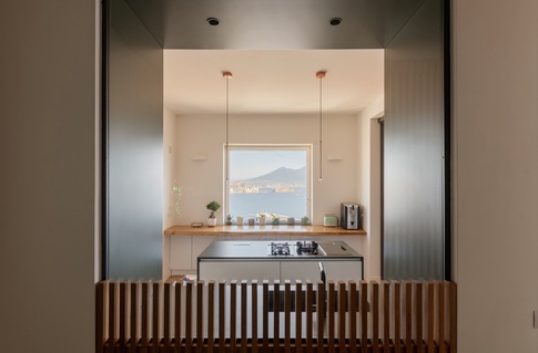Un ampio appartamento in zona centrale di Bergamo per una famiglia di cinque persone è stato trasformato dalla conformazione degli anni 70 ad una disposizione moderna e adatta alle necessità dei committenti. L'intento è stato quello di sfruttare al meglio gli spazi pensando ad un forte utilizzo quotidiano degli stessi: ognuno ha un proprio spazio ma le zone comuni e di convivialità hanno prevalso in termini spaziali non rinunciando a scelte progettuali che sono riuscite a dare eleganza e stile.Lo zona giorno, ampia e aperta si distingue per le varie zone funzionali.Un ingresso con un'armadiatura su misura dello stesso colore delle pareti.Una zona cucina, con colori, materiali e forme che si inseriscono nell'ambiente con determinazione nobilitandone il ruolo. Il blocco colonne, nero, incassato trasmette un forte impatto. Il blocco isola listellato di legno e con un piano con effetto marmo bianco si pone in contrasto cromatico.La zona tv che con un semplice mobile nero su misura ne delimita i confini, con un sistema di mensole nei lati opposti.Infine la zona pranzo con il taraxacum di Flos che ne enfatizza la presenza e la funzione.Pareti di colore grigio chiaro, led incassati, parquet a spina, pulizia formale contraddistinguono questa ampia zona giorno.La zona notte viene distribuita da un corridoio che con il minimo ingombro riesce a gestire tre camere e due bagni.La camera matrimoniale, che riprende le tonalità del soggiorno, è semplice e collegata con un generoso spazio adibito a cabina armadio.Il bagno di servizio, caratterizzato da un rivestimento colore verde smeraldo che impreziosisce lo spazio rendendolo luminoso e vibrante. Qui un mobile disegnato su misura in ferro riprende il colore della rubinetteria e sul lato opposto si trova un armadio che contiene la zona lavanderia.Il bagno principale invece è impreziosito dal rivestimento in effetto marmo e presenta una scansione di zone ben distinte. Da segnalare il lavandino in appoggio, un modello generoso e particolare per i suoi spazi contenitivi.Completano il tutto due camere per i figli adattate da quanto già in possesso.