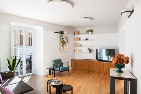 “Il quartiere che mi piace più di tutti”, così Nanni Moretti nel film “Caro Diario”, a bordo della sua vespa, descriveva il quartiere Garbatella in Roma. E proprio in Garbatella, abbiamo curato la ristrutturazione dell’appartamento descritto qui di seguito.Genera sempre un certo stupore, il fermarsi ad osservare un cantiere ultimato e pensare al punto da cui si era partiti: il primo sopralluogo, seguito poi dal rilievo degli ambienti, procedimento grazie al quale l’architetto entra in contatto con l’architettura, la misura, si lascia impressionare dagli spazi che lo circondano, si pone in ascolto verso le buone o cattive impressioni che l’ambiente dona, sensazioni che saranno poi il terreno fertile, dove piantare i semi della progettazione che verrà.Una casa accoglie al suo interno le persone che la abiteranno, ricambiando così l’amore che da queste persone riceve, ancora prima di essere realmente abitata. L’opera dell’architetto, intercetta, rielabora e realizza un atto di amore che i proprietari nutrono verso la propria futura casa. In questo flusso di emozioni e contenuti, la casa viene segnata dall’avanzare dei tempi, dei gusti, dei modi di abitare propri del nostro tempo e soprattutto dalla personalità di chi andrà a viverci.Entrati nel nuovo appartamento, si è accolti da un ampio e luminoso open space con al suo interno il salotto e la cucina con annessa zona pranzo. Tra i due ambienti, una colonna destinata al passaggio degli impianti condominiali, ora rivestita con una pannellatura in listelli di legno, viene affiancata da una libreria leggera, così da fungere come schermatura visiva tra i due ambienti.Fanno da contrappunto ai colori chiari di muri, soffitti e pavimenti, un elegante color blu notte, steso sia sulle modanature in legno del vano tecnico, che sulla parete che dall’ingresso corre verso gli ambienti della zona notte, e ripreso poi dai tessuti dei divani in salotto.Altrettanto importante è il ruolo del colore all’interno dei due bagni, l’uno caratterizzato da pavimenti e rivestimenti in giallo ocra con motivi geometrici bianchi, l’altro rivestito di piastrelle color grigio cenere impreziosito da una alternanza di superfici lisce ed in rilievo, che incorniciano quest’ultime lo spazio destinato al lavabo ed allo specchio. È il colore rosso a caratterizzare invece la camera da letto padronale, steso sulla parete che funge sia da testiera del letto che da elemento di separazione con la retrostante cabina armadio.La distribuzione degli ambienti interni, l’utilizzo del colore, la scelta attenta di rivestimenti in gres particolarissimi, donano a questo appartamento un gusto squisitamente personale e moderno.