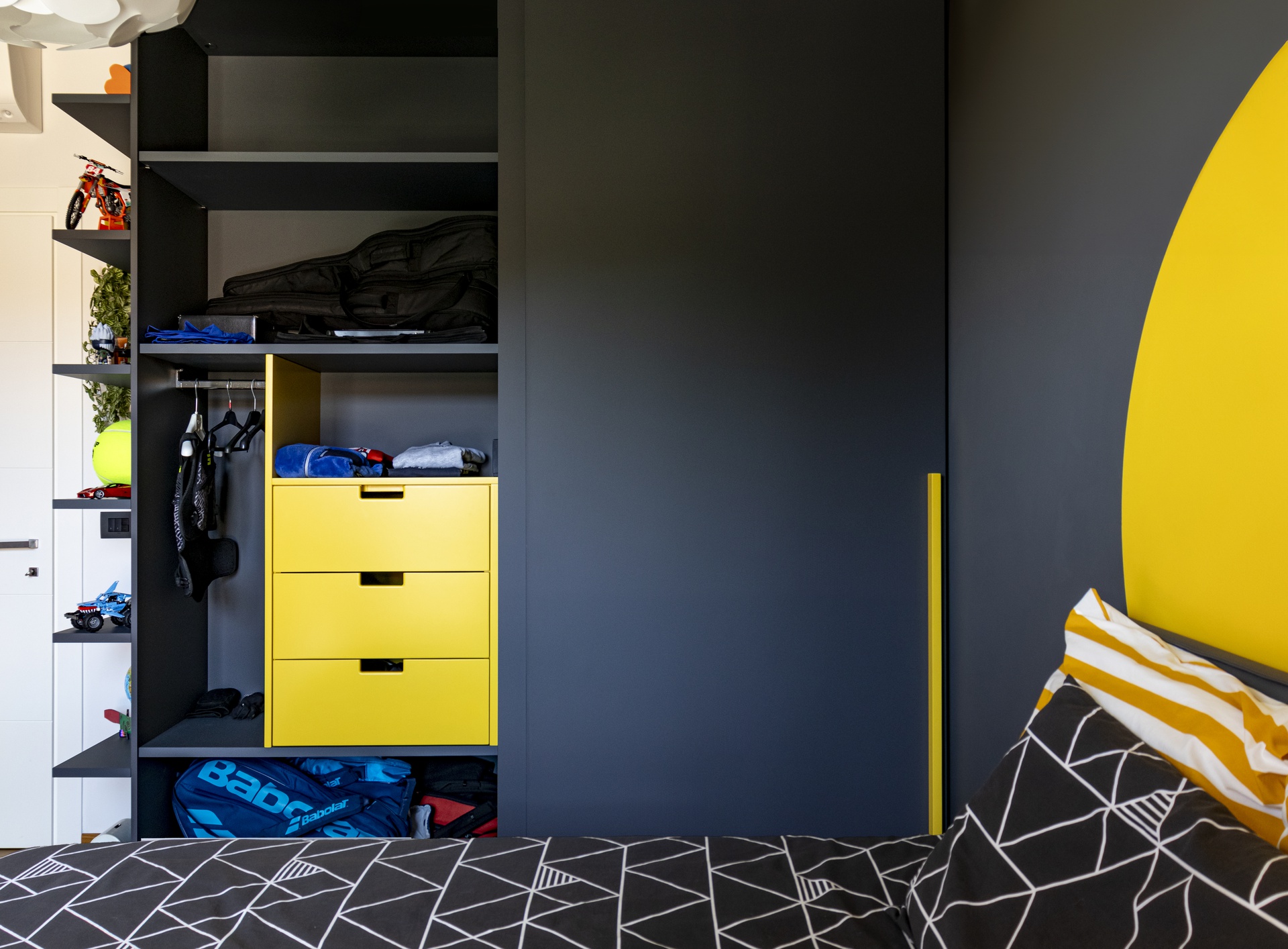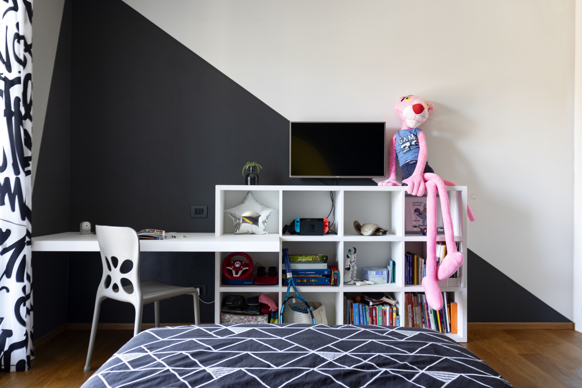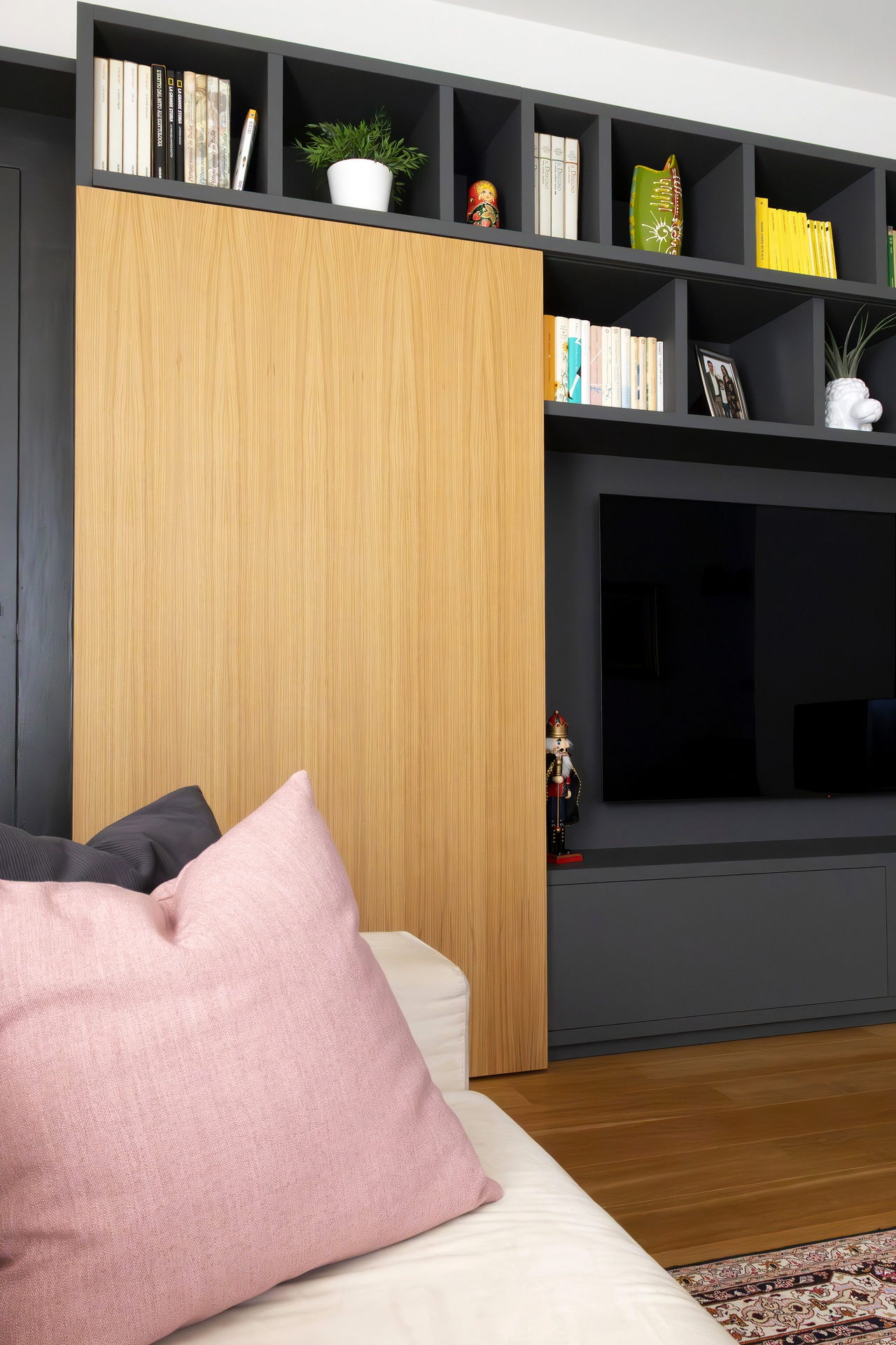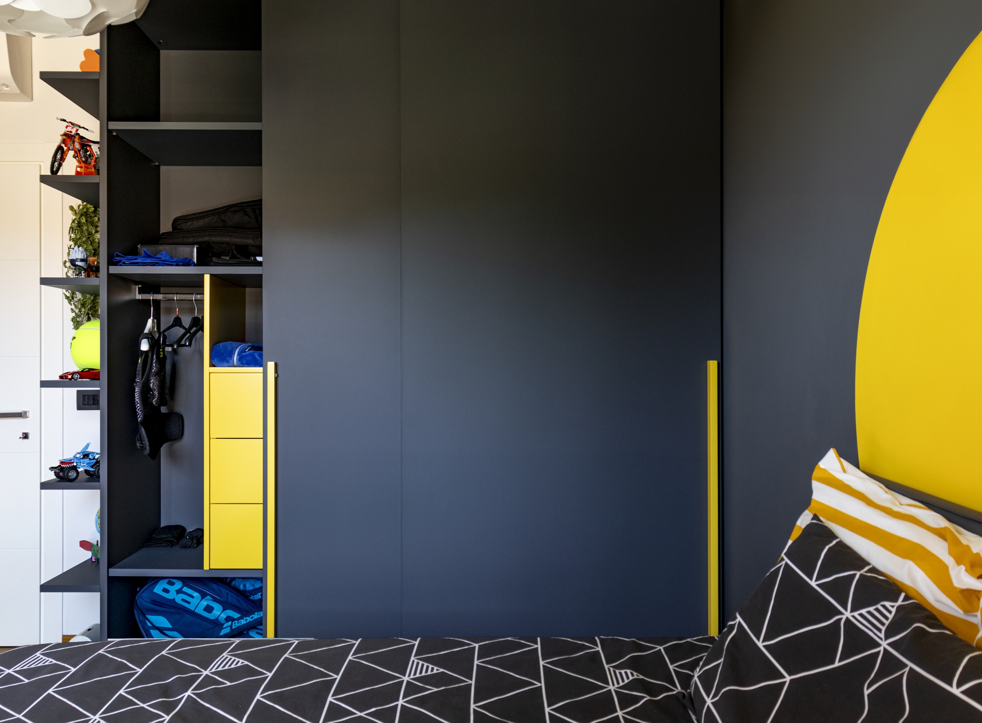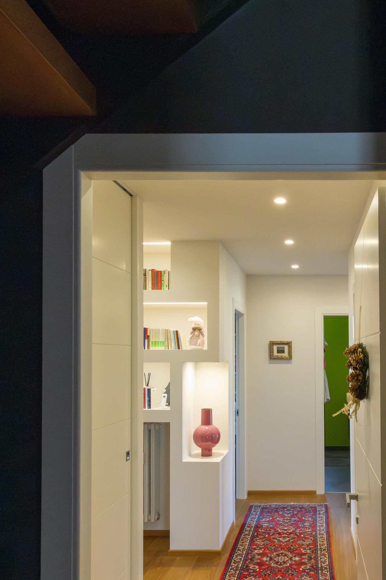 Un Equilibrio tra Forme, Colori e Funzionalità nella Ristrutturazione d’InterniLa ristrutturazione che vi presentiamo è un esempio concreto di come gli spazi abitativi moderni possano trasformarsi radicalmente, mettendo al centro la persona e le sue esigenze quotidiane. Questo progetto nasce dalla volontà di dare nuova vita a un ambiente che, pur tradizionale nelle sue strutture, desiderava un linguaggio contemporaneo, audace e al contempo accogliente.Rinnovare una casa non significa solo cambiare mobili o ridipingere le pareti: è un’opportunità per riscoprire il proprio modo di vivere gli spazi, adattandoli a nuove abitudini, necessità e desideri.Il progetto si sviluppa attorno al bisogno di una giovane famiglia di rendere più accoglienti, pratici e personali alcuni ambienti chiave della propria abitazione — cucina, zona giorno e cameretta — valorizzando senza stravolgere gli elementi esistenti, integrando con cura arredi già presenti come i divani, i tappeti e la consolle all’ingresso, che contribuiscono a mantenere un forte legame con la storia e l’identità della casa.Il concept di base, “Geometrie Familiari”, unisce la precisione delle forme geometriche a un’atmosfera calda e intima, ideale per una casa vissuta e amata. Ogni stanza è stata progettata non solo per rispondere a esigenze funzionali, ma anche per esprimere un’identità estetica forte e riconoscibile.Il progetto si basa su linee pulite e forme essenziali che definiscono gli spazi in modo equilibrato, creando un flusso visivo armonioso tra le diverse aree. L’uso di elementi modulari e il gioco tra linee orizzontali e verticali assicurano flessibilità, perfetta per la vita dinamica di una famiglia moderna.Il colore assume un ruolo centrale: una palette studiata con toni neutri, arricchita da dettagli vivaci — il rosa in cucina e living, il giallo nella cameretta — definisce gli spazi, donando profondità e personalità senza risultare mai stancante alla vista.La scelta dei materiali è studiata per esaltare la tattilità e il comfort: legno, gres porcellanato, metallo e tessuti naturali si combinano per creare un dialogo sensoriale unico, alternando superfici lisce a texture materiche che valorizzano ogni ambiente.L’illuminazione, naturale e artificiale, è progettata per esaltare forme e colori, modulare l’atmosfera e valorizzare i dettagli architettonici, garantendo allo stesso tempo comfort e risparmio energetico.Questa ristrutturazione rappresenta un autentico gesto d’affetto verso la casa e chi la abita, un progetto in cui design, comfort e personalità si fondono in un racconto contemporaneo e distintivo. “Geometrie Familiari” non è solo un nome, ma una filosofia progettuale che si traduce in spazi dove ogni elemento ha una ragion d’essere, contribuendo a creare un ambiente familiare, funzionale e accogliente.
