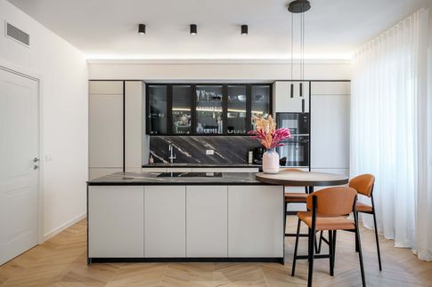 L’appartamento, situato nel quartiere Vomero della città di Napoli, ha visto una completa rilettura degli spazi azzerando la vecchia distribuzione interna per seguire le esigenze del committente.L’ampio spazio soggiorno-pranzo, la suddivisione distinta tra spazio giorno e notte e la personalizzazione degli ambienti sono state le chiavi di lettura della riconversione dell’appartamento.La progettazione ha seguito le richieste di arredo su misura realizzando elementi di falegnameria che si conformano agli spazi. Materiali di pregio quali pavimentazione in doussie d’Africa, pitture decorative a guscio d’uovo e ceramiche a bicottura hanno reso lo spazio abitativo personale e unico.