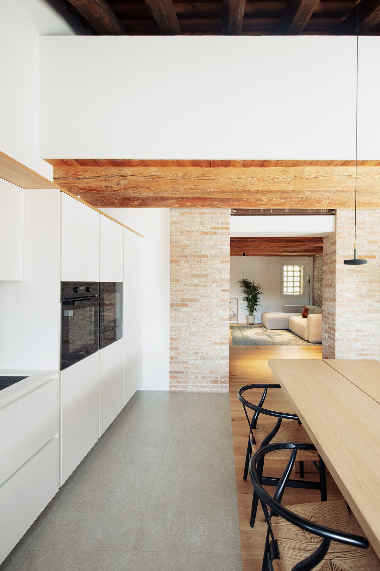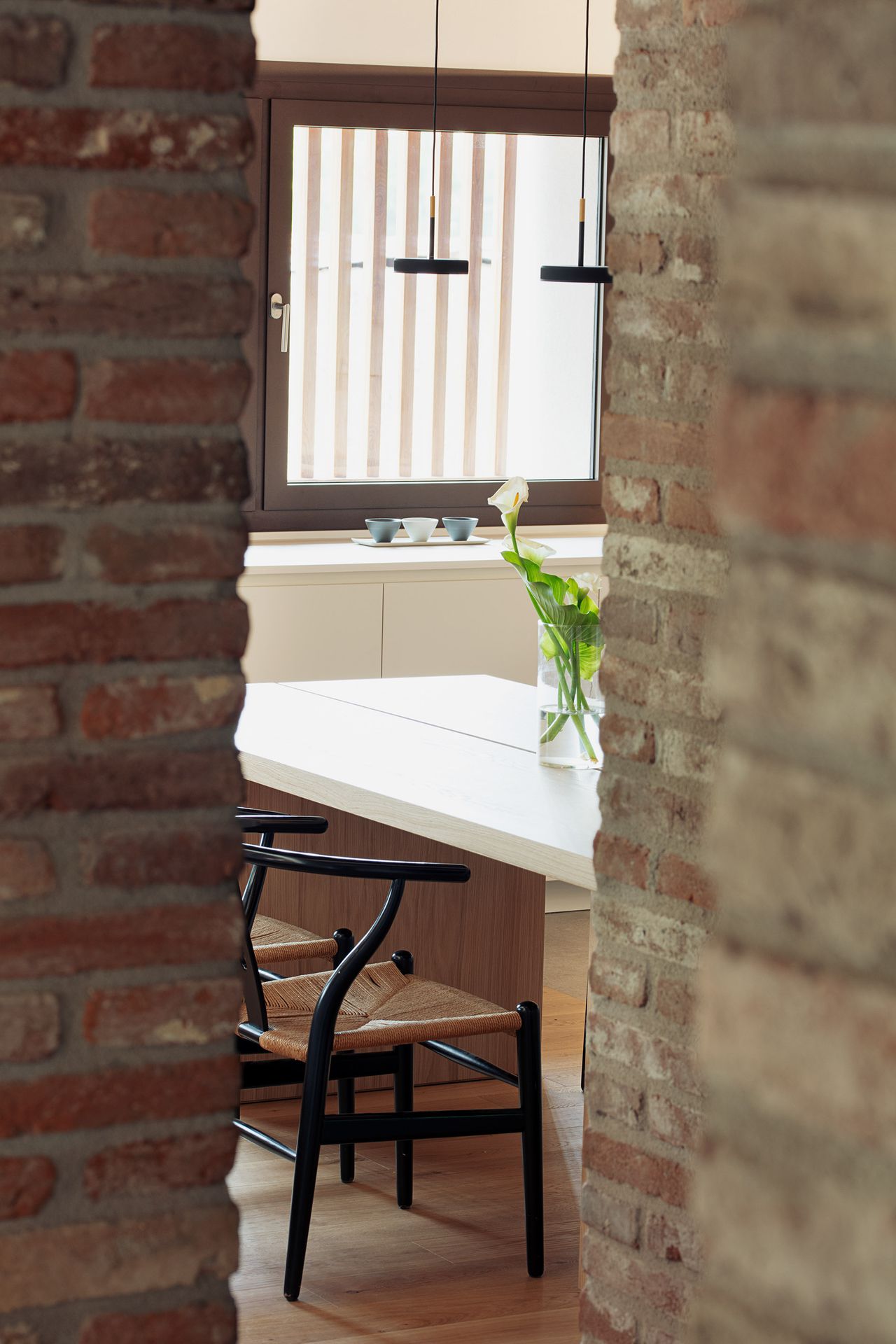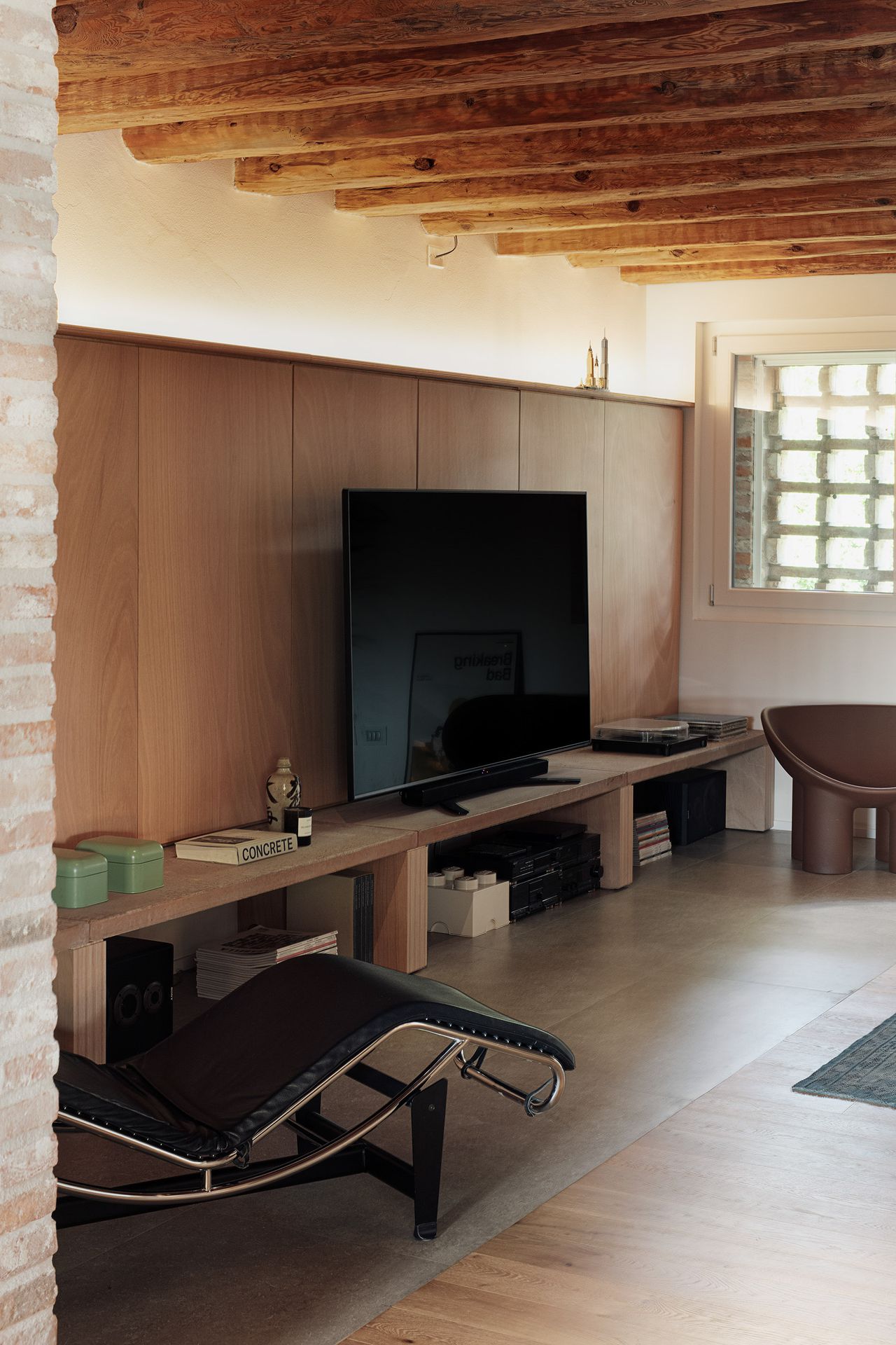 Progetto di restyling per un ex fienile in una abitazione colonica dei primi del 900 nella campagna veneta.Quello che un tempo era un fienile posto al di sopra della stalla diventa ora residenza privata, cercando di mantenere alcuni elementi caratteristici del deposito rurale.L’accesso alla residenza avviene dalla scala in acciaio dal grande portico rivolto a sud. Il ballatoio di arrivo distribuisce sulla grande vetrata protetta da una membrana di lamelle verticali in legno di larice, stessa essenza presente nella copertura. Questa grande membrana a doppia altezza si apre in corrispondenza dell’ingresso e dell’apertura dello studiolo.Gli elementi di distribuzione richiamano la tipologia tipica della casa colonica della campagna veneta.All’interno il ritmo della pianta tripartita viene scandito da grandi muri in sasso e mattone, ripristinanti con materiali originali come le travi che compongono il solaio, valorizzano il passaggio del tempo sulle superfici delle stesse.La distribuzione tra i piani primo e secondo avviene attraverso un scala interna. A piano primo trovano spazio l’ingresso, la zona giorno, uno studiolo e alcuni ambienti di servizio. A piano secondo vi sono la camera padronale, una secondo camera, il bagno e un ripostiglio collegati da un grande spazio distributivo. Tutti gli ambienti del secondo piano hanno copertura a vista in legno.Gli spazi interni hanno un sapore di contemporaneità che valorizza le preesistenze attraverso il contrasto tra le superfici nuove e quelle ruvide, quasi grezze, esistenti. Anche l’illuminazione artificiale lavora in questa direzione, alternando fonti luminose nascoste a corpi illuminanti dal design semplice, in linea con il concept minimale che guida l’intero progetto.