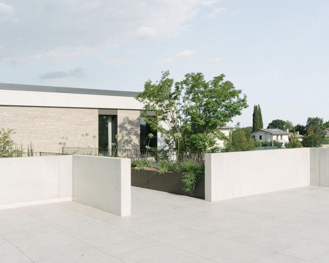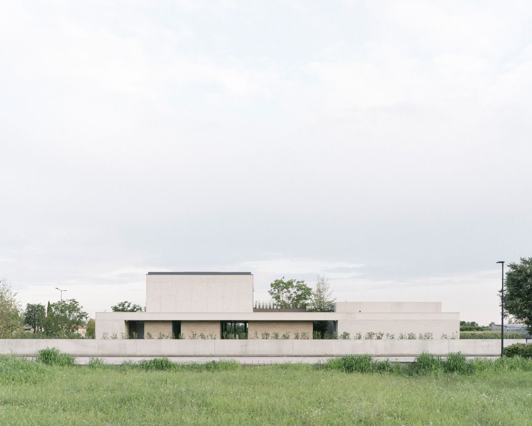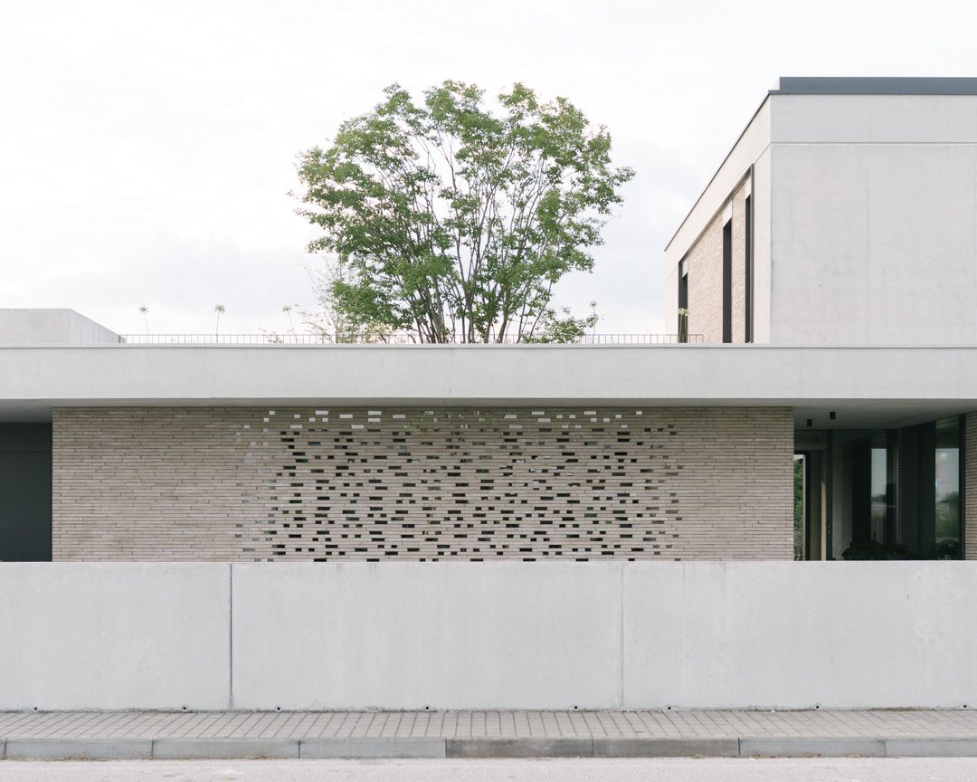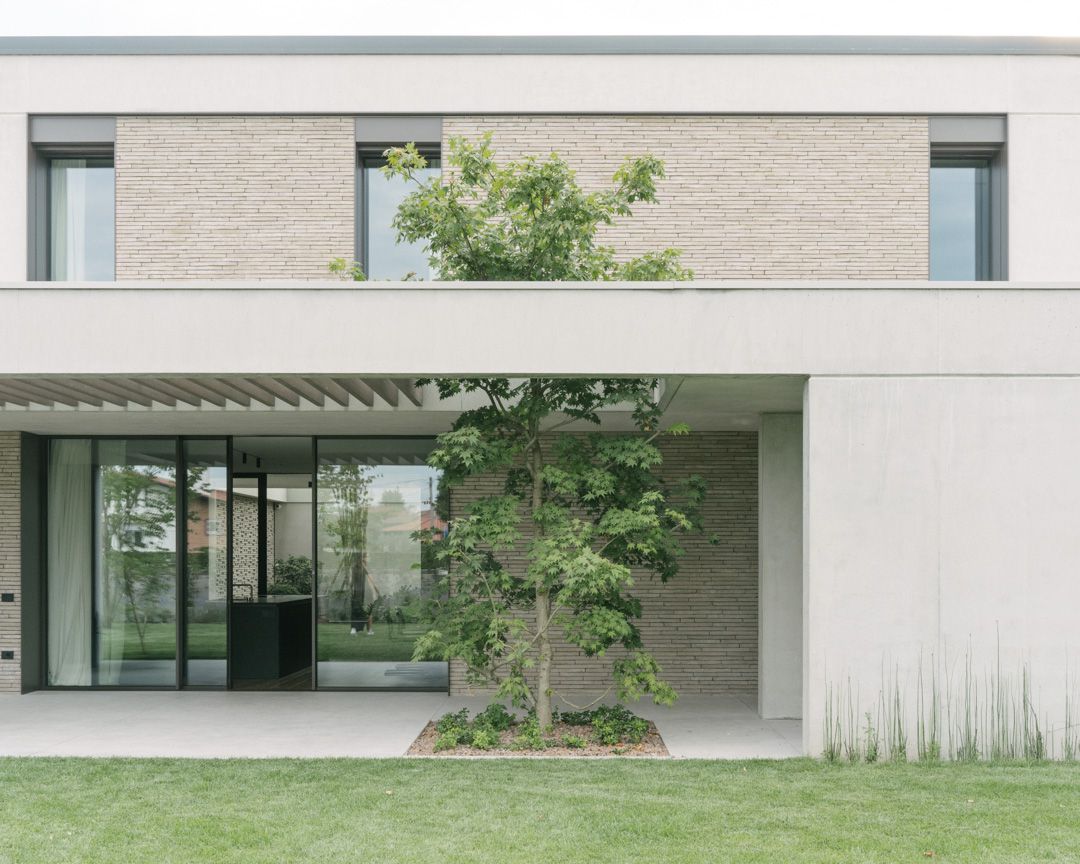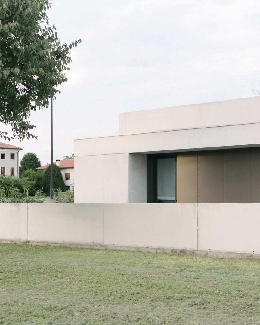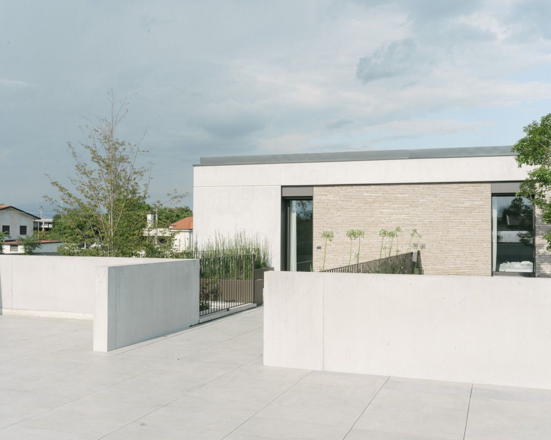 Progetto per una nuova abitazione in un quartiere residenziale nei pressi di Bassano del Grappa. L’edificio è composto da una grande “piastra” che racchiude gli spazi interni e li protegge dagli sguardi con l’utilizzo di patii verdi e membrane più o meno permeabili in laterizio. Al di sopra di essa vi sono due volumi che completano la parte sommitale dell’edificio, quello più grande contiene la zona notte, mentre quello più piccolo cinge una terrazza solarium raggiungibile dalla zona notte.I materiali utilizzati nel progetto sono pochi ma importanti. I corpi principali della casa sono in calcestruzzo grigio liscio. A piano terra, tra gli appoggi, i muri appaiono in mattoni chiari di grande formato, posati quasi a secco e sono interrotti dai fori contornati da imbotti metallici color brun. I serramenti sono stati disegnati per mostrare solo il vetro nelle parti fisse, e lasciare la lettura solo delle porzioni apribili. A piano primo, nei lati est e ovest, viene ripresa questa alternanza di materiali tra le finestre delle camere.Internamente viene ripreso il calcestruzzo nel muro “sospeso” della scala, questa volta però declinato con una finitura levigata, che lascai affiorare delicatamente gli inerti. I pavimenti in noce si legano con ampie boiserie e porte scorrevoli che contrastano con le superfici grigio chiaro delle pareti.In tutto il progetto, vi è la volontà di intravedere oltre l’ambiente stesso in cui si è. Percorrendo gli ambienti si percepisce un tema di transizioni tra gli spazi, come quando dalla cucina si può intravedere il patio a nord, oltrepassando con lo sguardo il soggiorno, o come quando dal portico a est si può vedere il patio centrale della casa passando con la vista dalla cucina.I due patii verdi fungono da macchina di controllo della luce, e portano all’interno degli ambienti una luce calma e controllata, oltre che dare un senso di protezioni visiva senza rinunciare alle ampie vetrate e consolidando il rapporto con il verde.