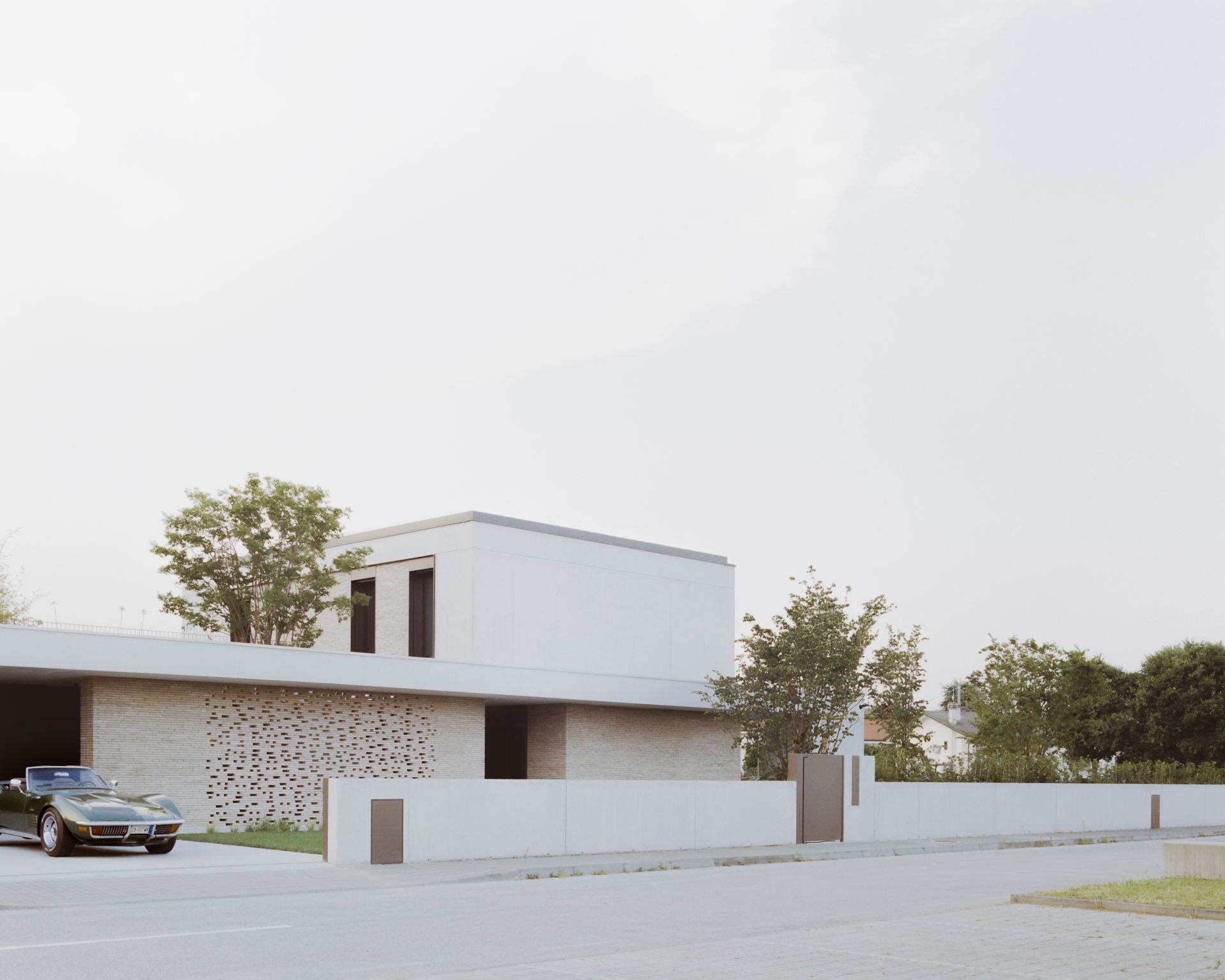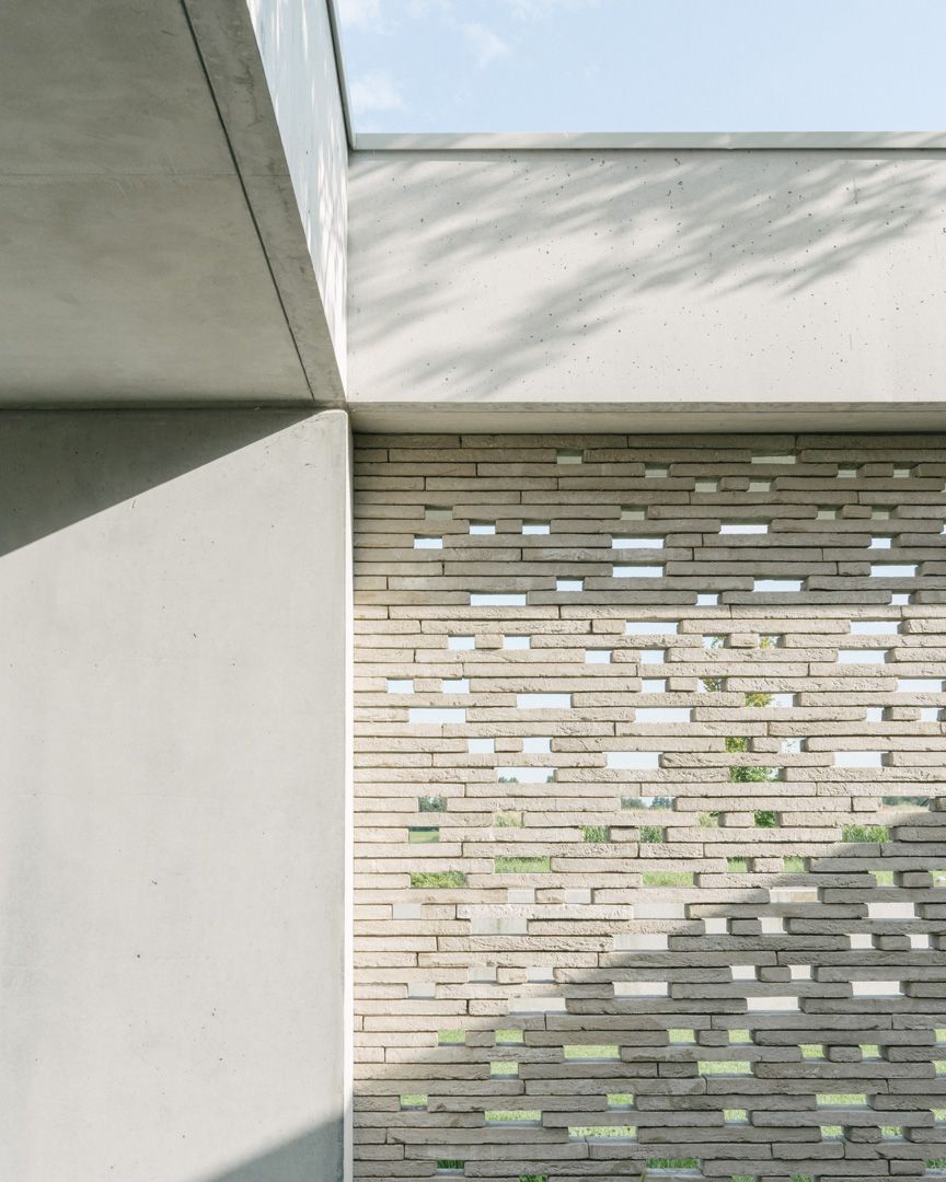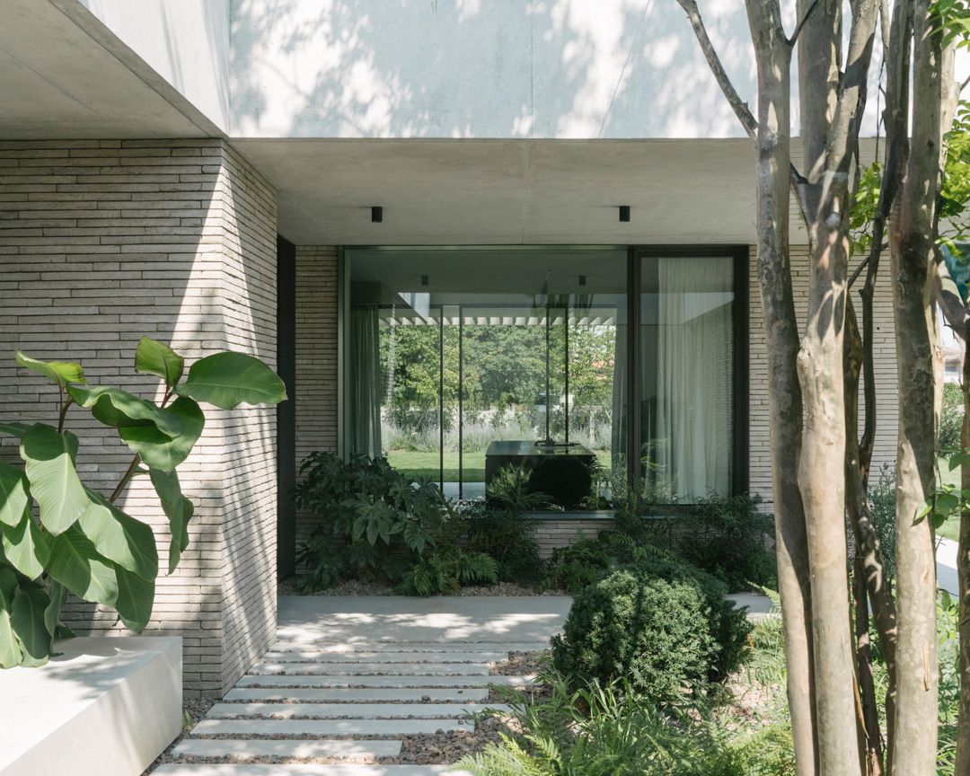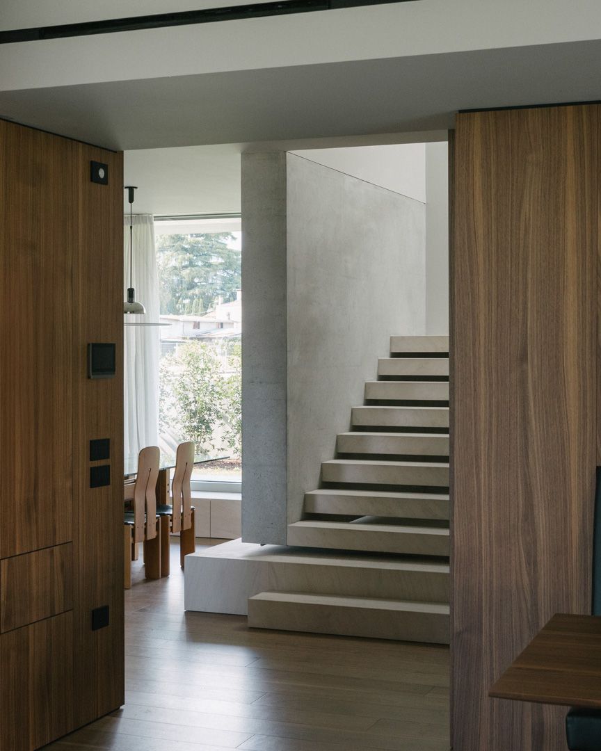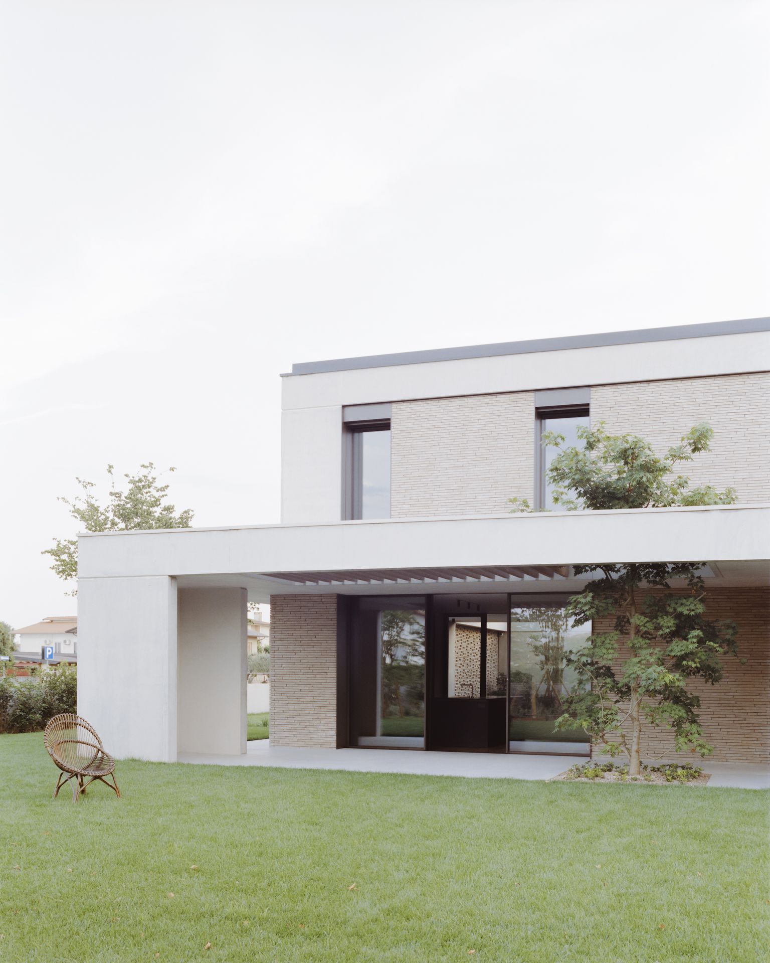 Progetto per una nuova abitazione in un quartiere residenziale nei pressi di Bassano del Grappa. L’edificio è composto da una grande “piastra” che racchiude gli spazi interni e li protegge dagli sguardi con l’utilizzo di patii verdi e membrane più o meno permeabili in laterizio. Al di sopra di essa vi sono due volumi che completano la parte sommitale dell’edificio, quello più grande contiene la zona notte, mentre quello più piccolo cinge una terrazza solarium raggiungibile dalla zona notte.I materiali utilizzati nel progetto sono pochi ma importanti. I corpi principali della casa sono in calcestruzzo grigio liscio. A piano terra, tra gli appoggi, i muri appaiono in mattoni chiari di grande formato, posati quasi a secco e sono interrotti dai fori contornati da imbotti metallici color brun. I serramenti sono stati disegnati per mostrare solo il vetro nelle parti fisse, e lasciare la lettura solo delle porzioni apribili. A piano primo, nei lati est e ovest, viene ripresa questa alternanza di materiali tra le finestre delle camere.Internamente viene ripreso il calcestruzzo nel muro “sospeso” della scala, questa volta però declinato con una finitura levigata, che lascai affiorare delicatamente gli inerti. I pavimenti in noce si legano con ampie boiserie e porte scorrevoli che contrastano con le superfici grigio chiaro delle pareti.In tutto il progetto, vi è la volontà di intravedere oltre l’ambiente stesso in cui si è. Percorrendo gli ambienti si percepisce un tema di transizioni tra gli spazi, come quando dalla cucina si può intravedere il patio a nord, oltrepassando con lo sguardo il soggiorno, o come quando dal portico a est si può vedere il patio centrale della casa passando con la vista dalla cucina.I due patii verdi fungono da macchina di controllo della luce, e portano all’interno degli ambienti una luce calma e controllata, oltre che dare un senso di protezioni visiva senza rinunciare alle ampie vetrate e consolidando il rapporto con il verde.