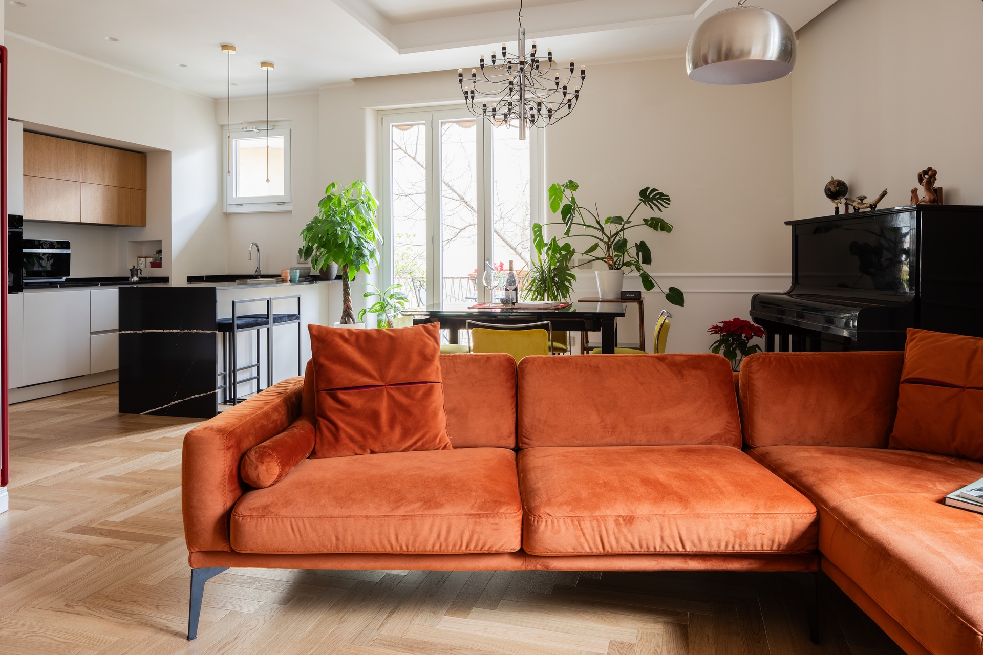 Nel mondo delle ristrutturazioni, ogni nuova sfida porta con sé l'opportunità di creare qualcosa di unico e funzionale. Un recente progetto che ho completato coinvolgeva la ristrutturazione di un appartamento di circa 130 mq, con specifiche richieste da parte del cliente. Trovandosi davanti a un appartamento scarsamente illuminato all'ingresso e con un bagno di servizio piuttosto angusto, sono stata chiamata a immaginare soluzioni pratiche e attraenti per questi spazi. Altresì, il cliente desiderava un open space e una zona lavanderia. Il design finale ha visto la creazione di un ripostiglio lavanderia a fianco al secondo bagno, ottimizzando così lo spazio disponibile. Inoltre, la posizione della cucina e del bagno di servizio sono stati invertiti a scopo di ingrandire il bagno e creare open space. La zona giorno ora si distingue per le sue pareti con effetto boiserie, colorate con un elegante bianco e panna. Questo tema cromatico si estende alle stanze, sebbene in queste ultime l'effetto boiserie sia stato realizzato esclusivamente attraverso l'uso del colore. Per l'ingresso, è stato riuscito a recuperare un secretaire che apparteneva ai vecchi proprietari, creando un affascinante mix di nuovo e antico. E' stato decisamente con il colore bordeaux dei termosifoni, un colore non convenzionale, ma che si mescola splendidamente con le sedie Cassina dalla base in acciaio e il tessuto di velluto giallo. La cucina, o meglio, l'angolo cottura, ha un colore in sintonia con le pareti e il top nero con venature arancioni e bianche, che reintroduce il divano angolare arancio ruggine. Questo progetto rappresenta un delicato equilibrio tra funzionalità e personalizzazione, dimostrando come un attento design di interni possa trasmettere una sensazione di comfort e bellezza.